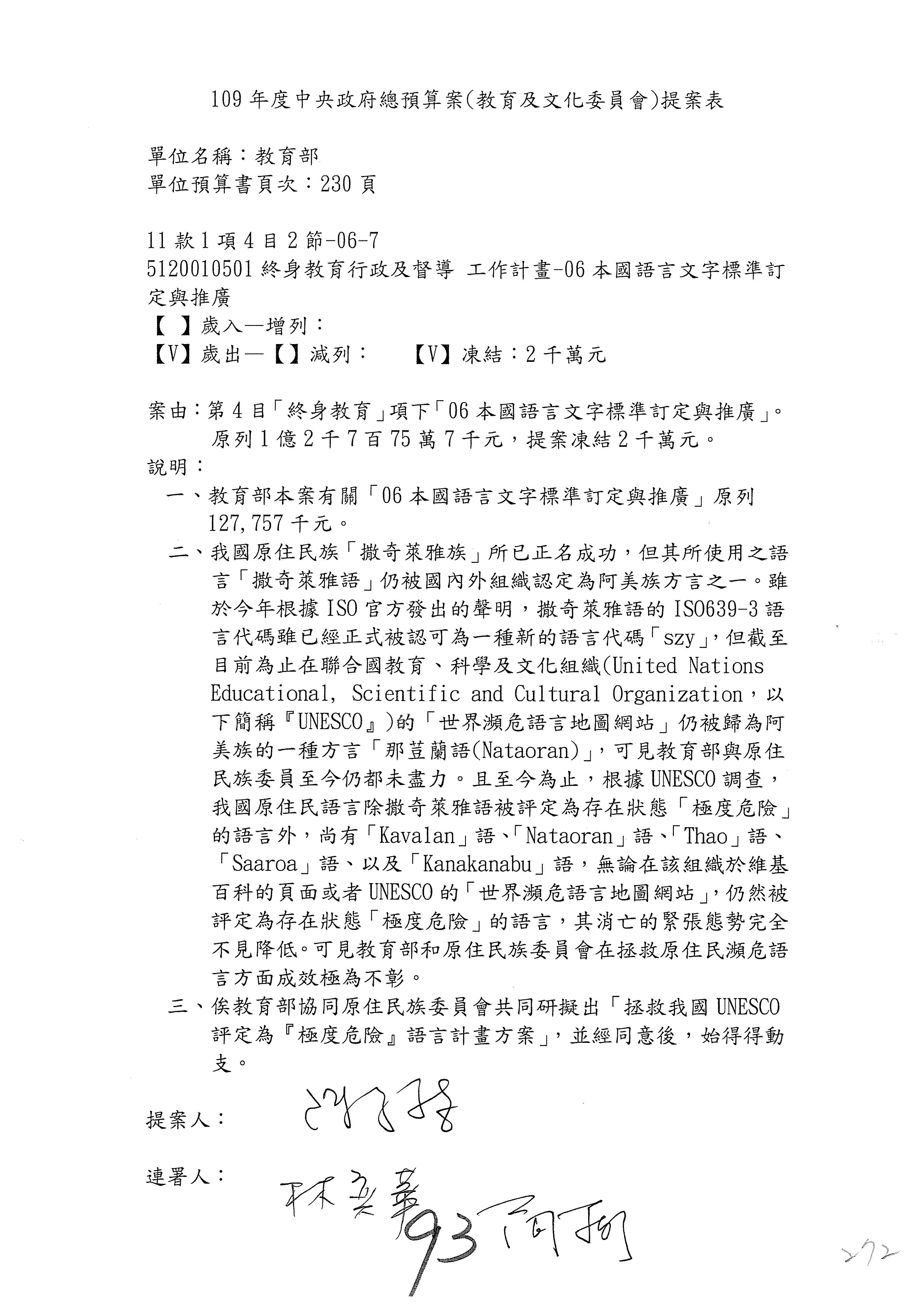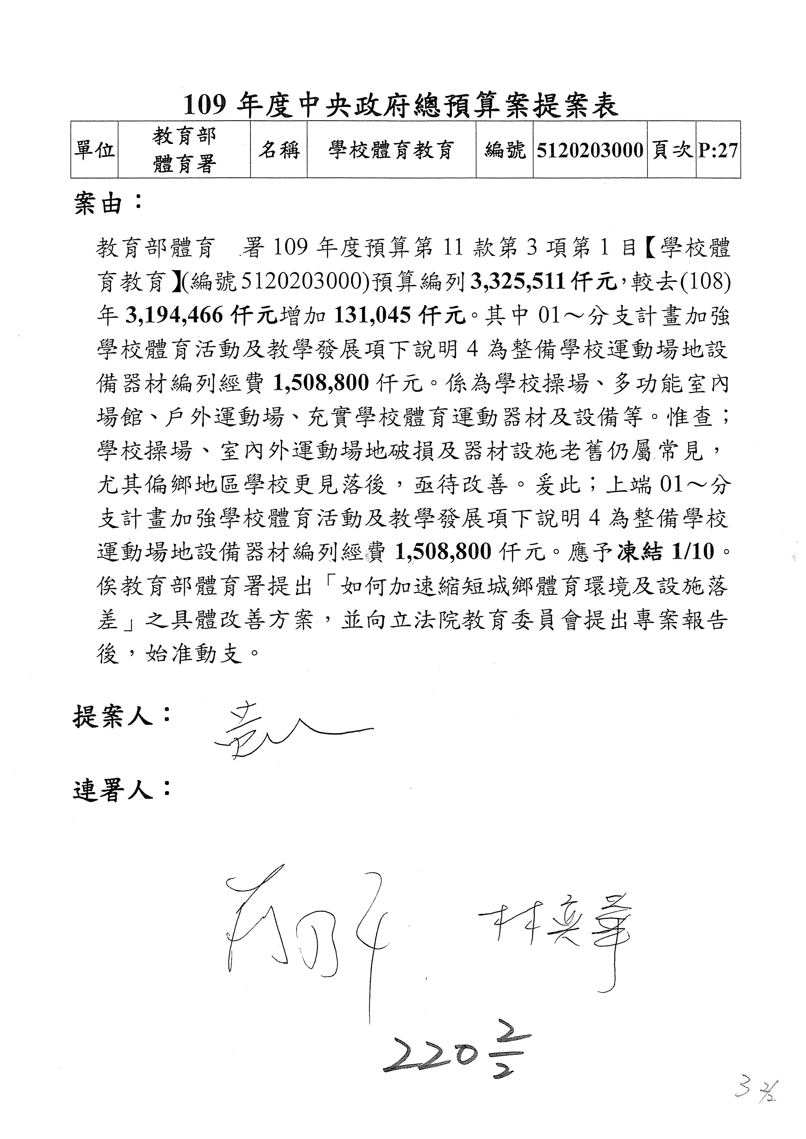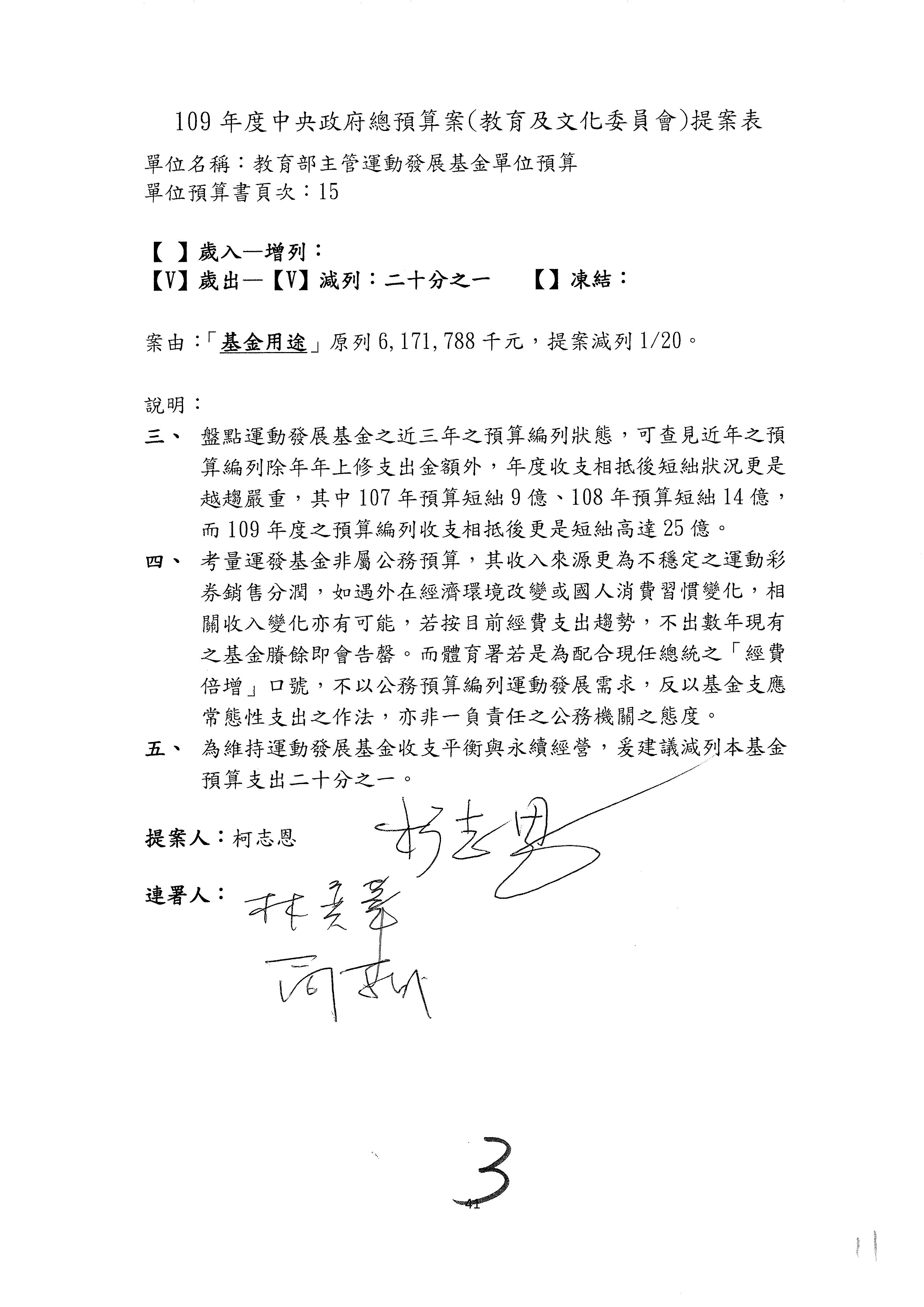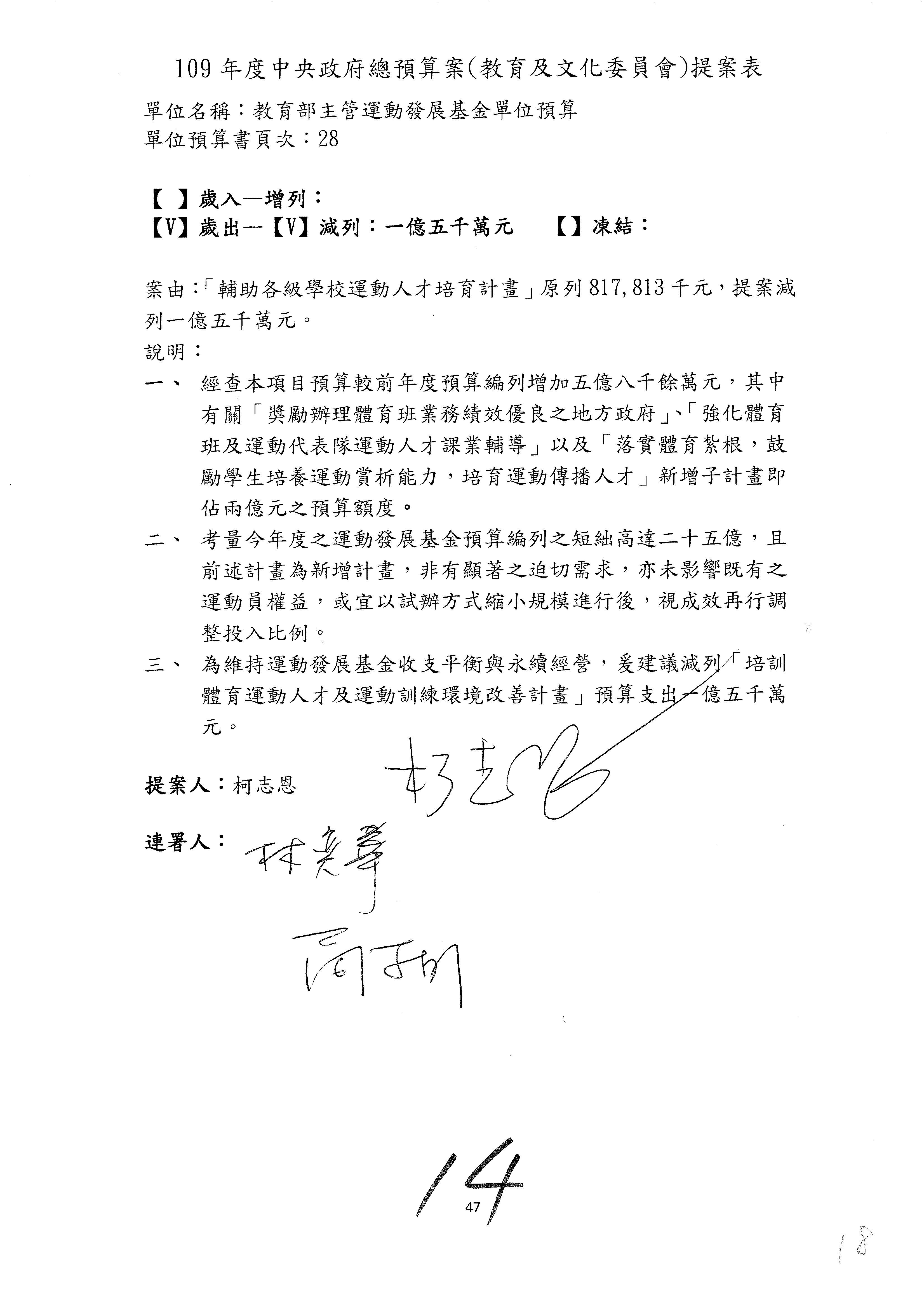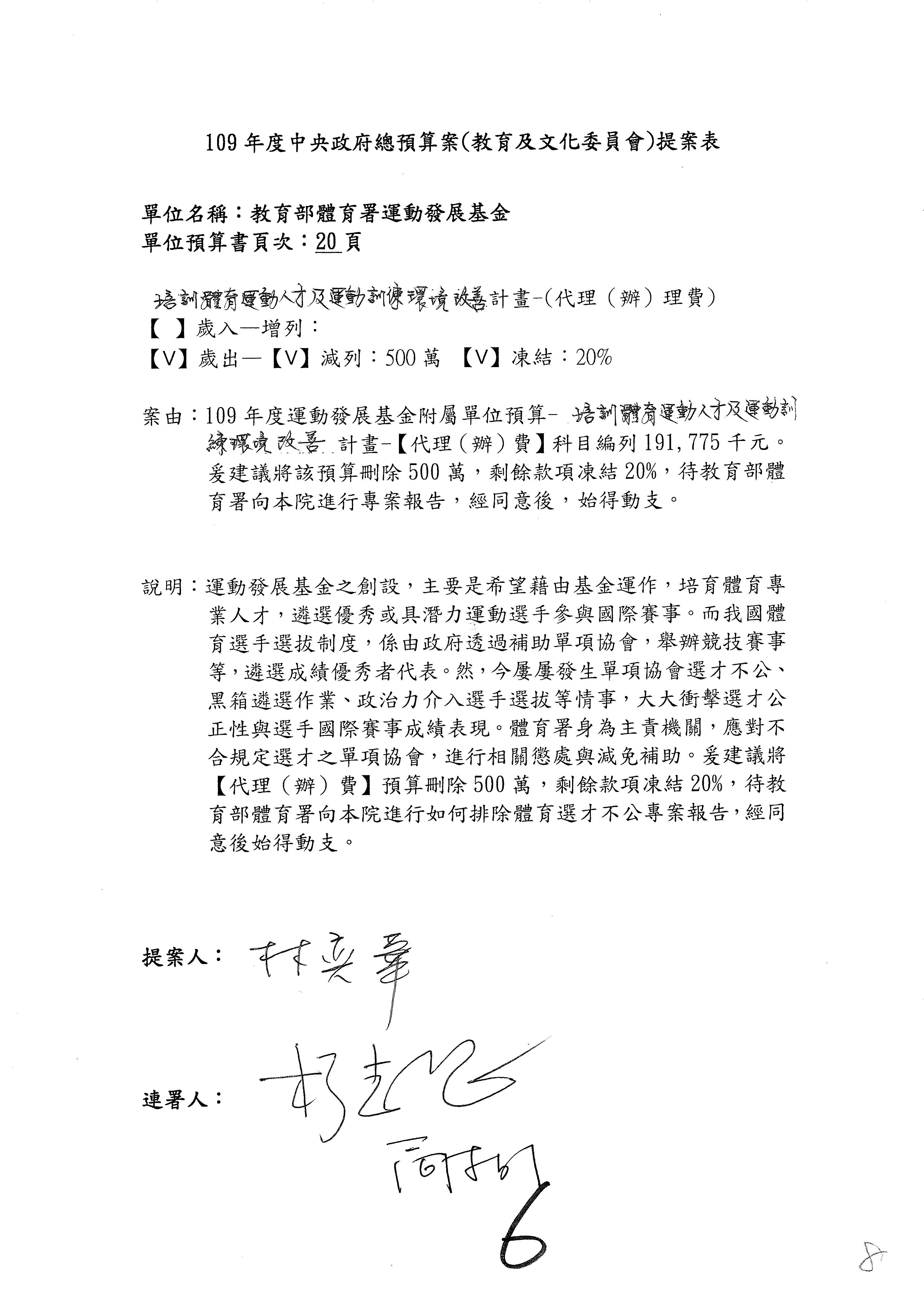早上原本保留第31案,決議減列500萬元,凍結500萬元,提出書面報告後解凍。