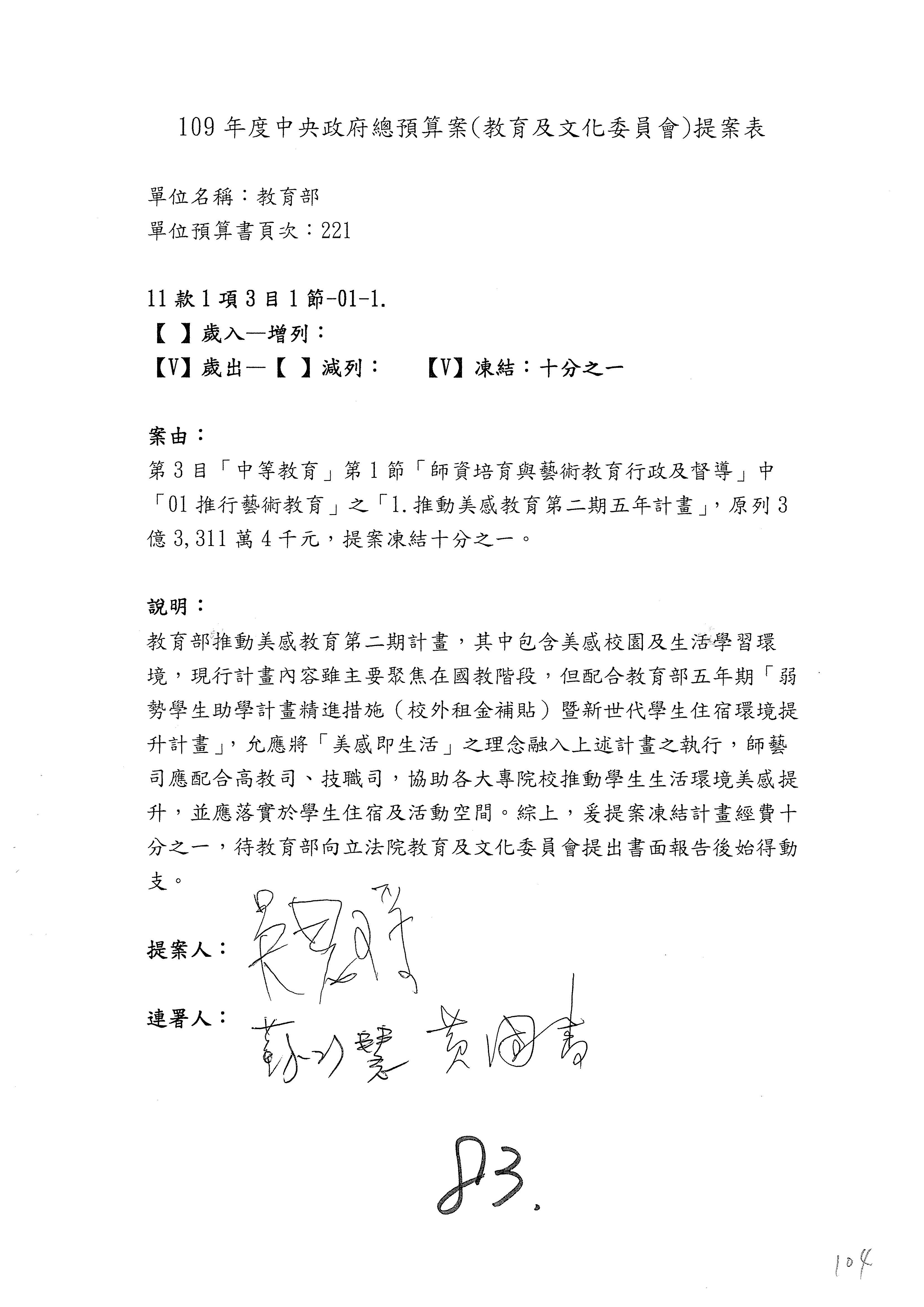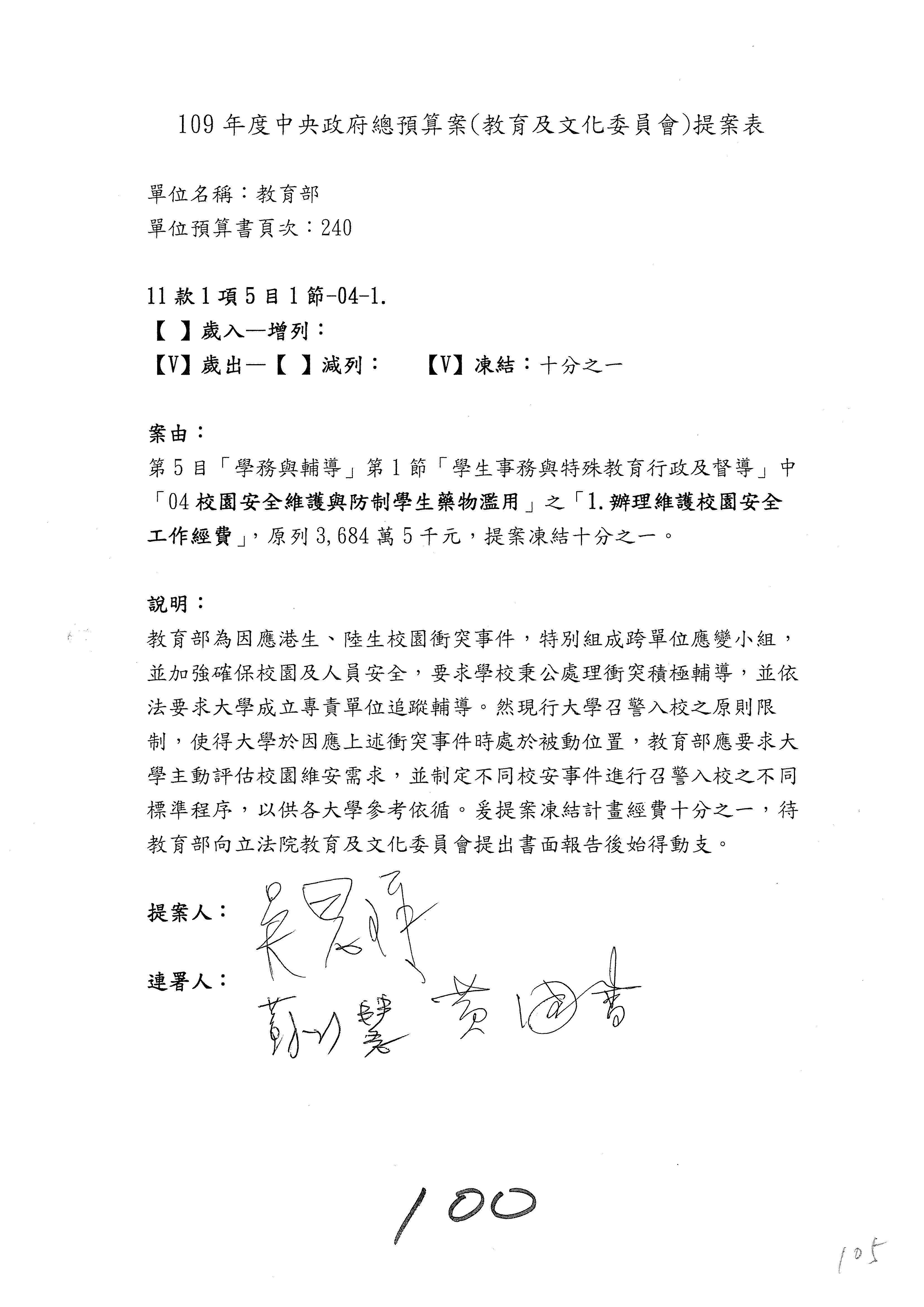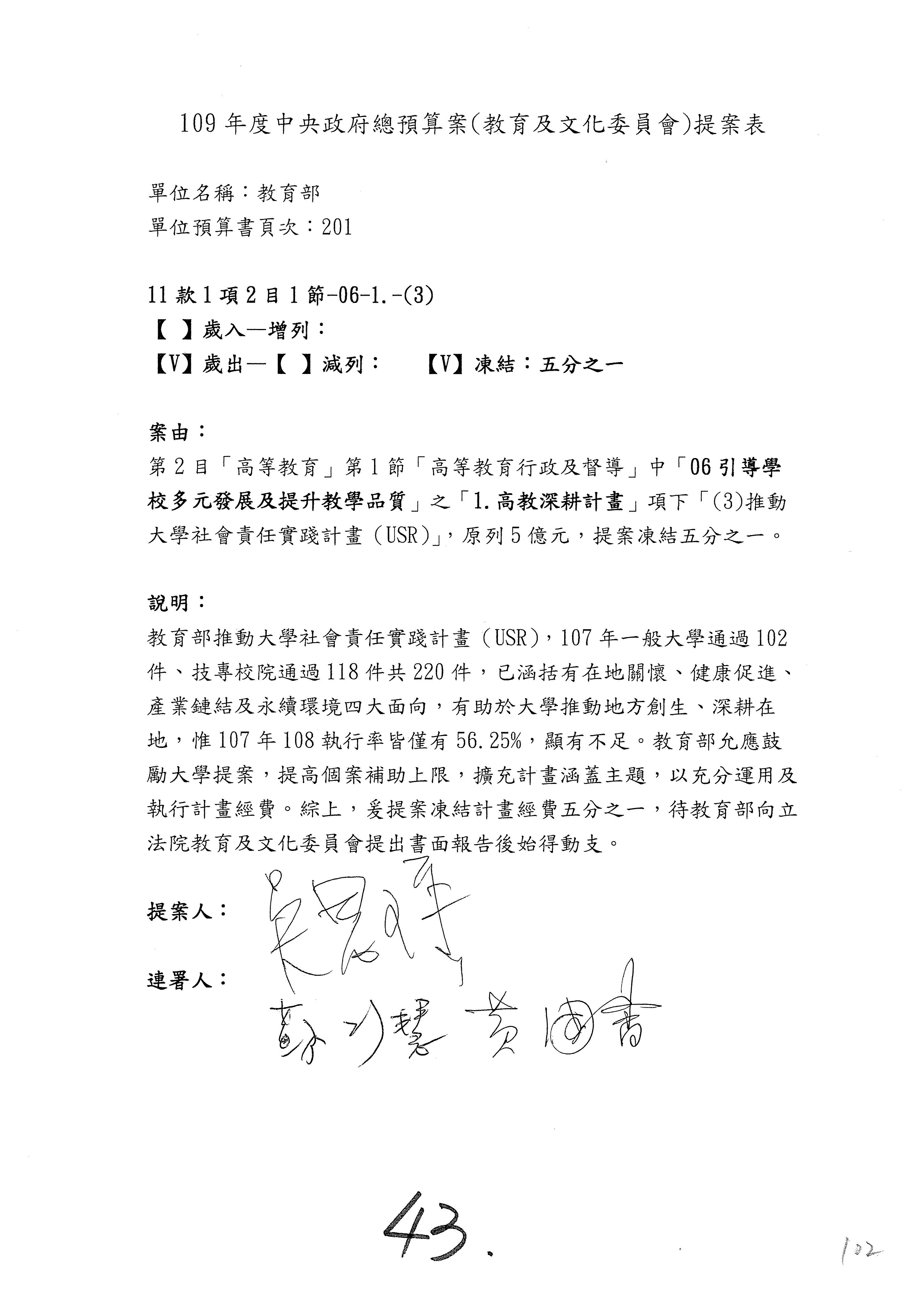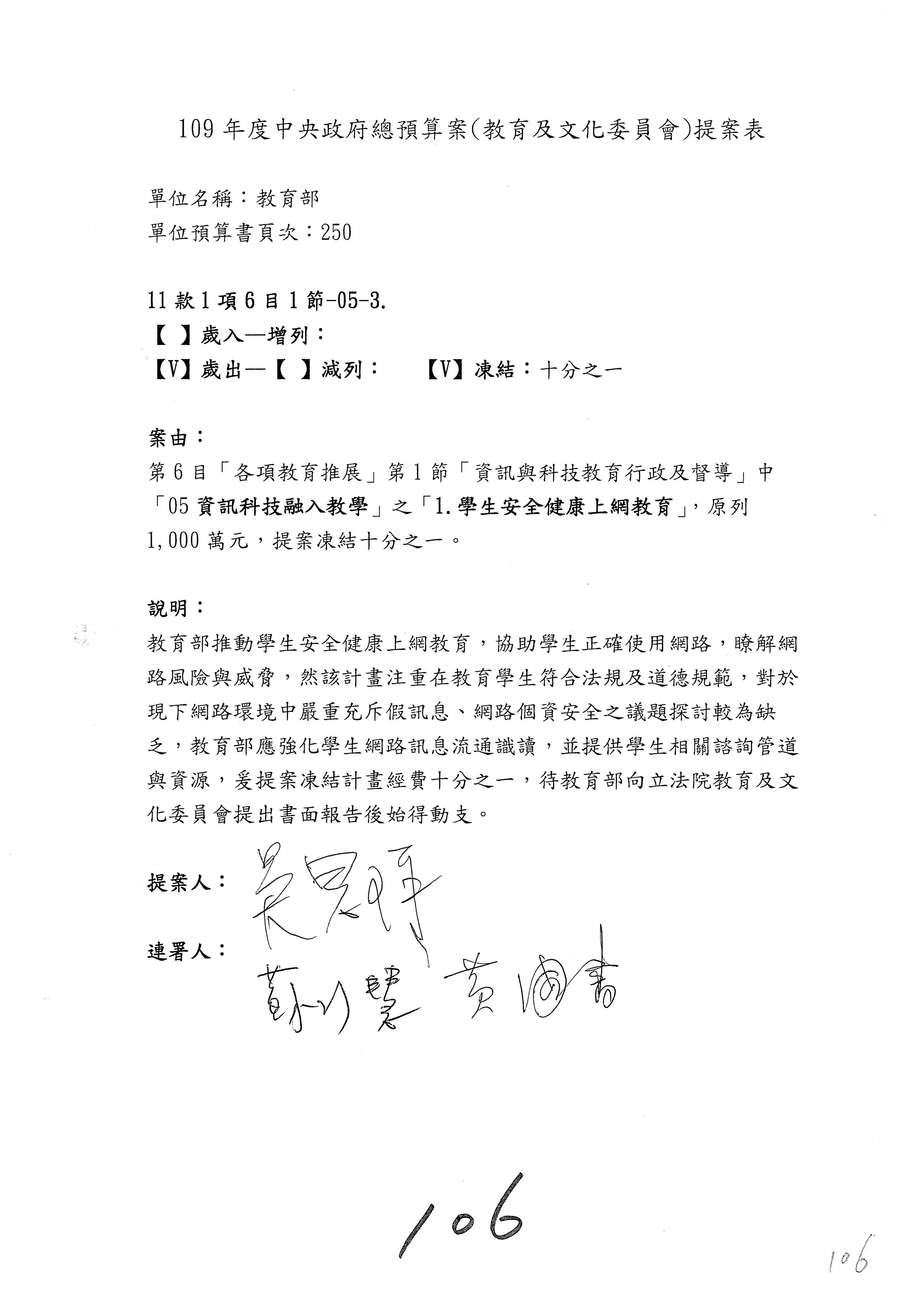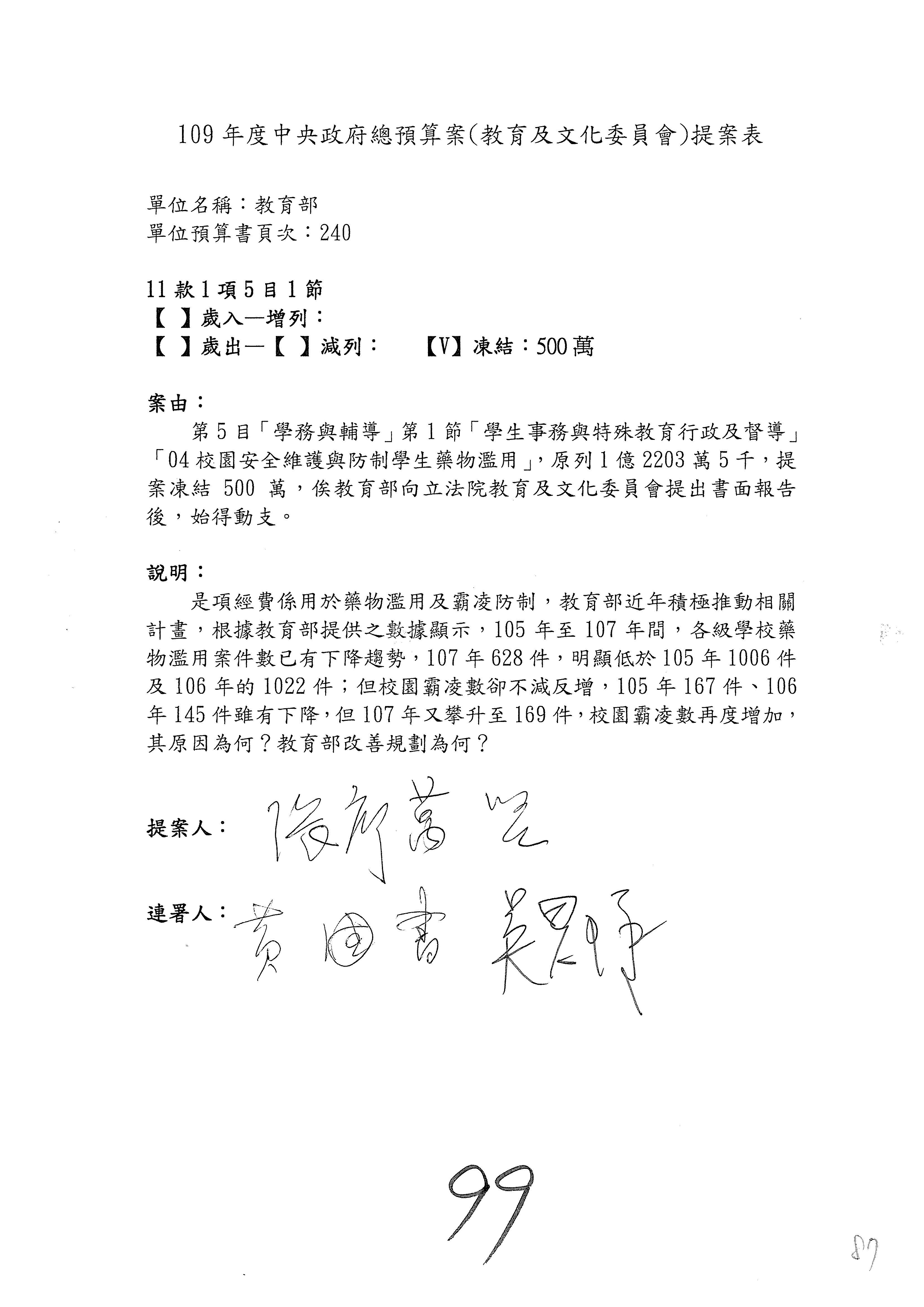 主席:還沒有處理到第106案,現在處理至第101案,這樣就沒問題。第5目預算照列,第99案改為主決議。