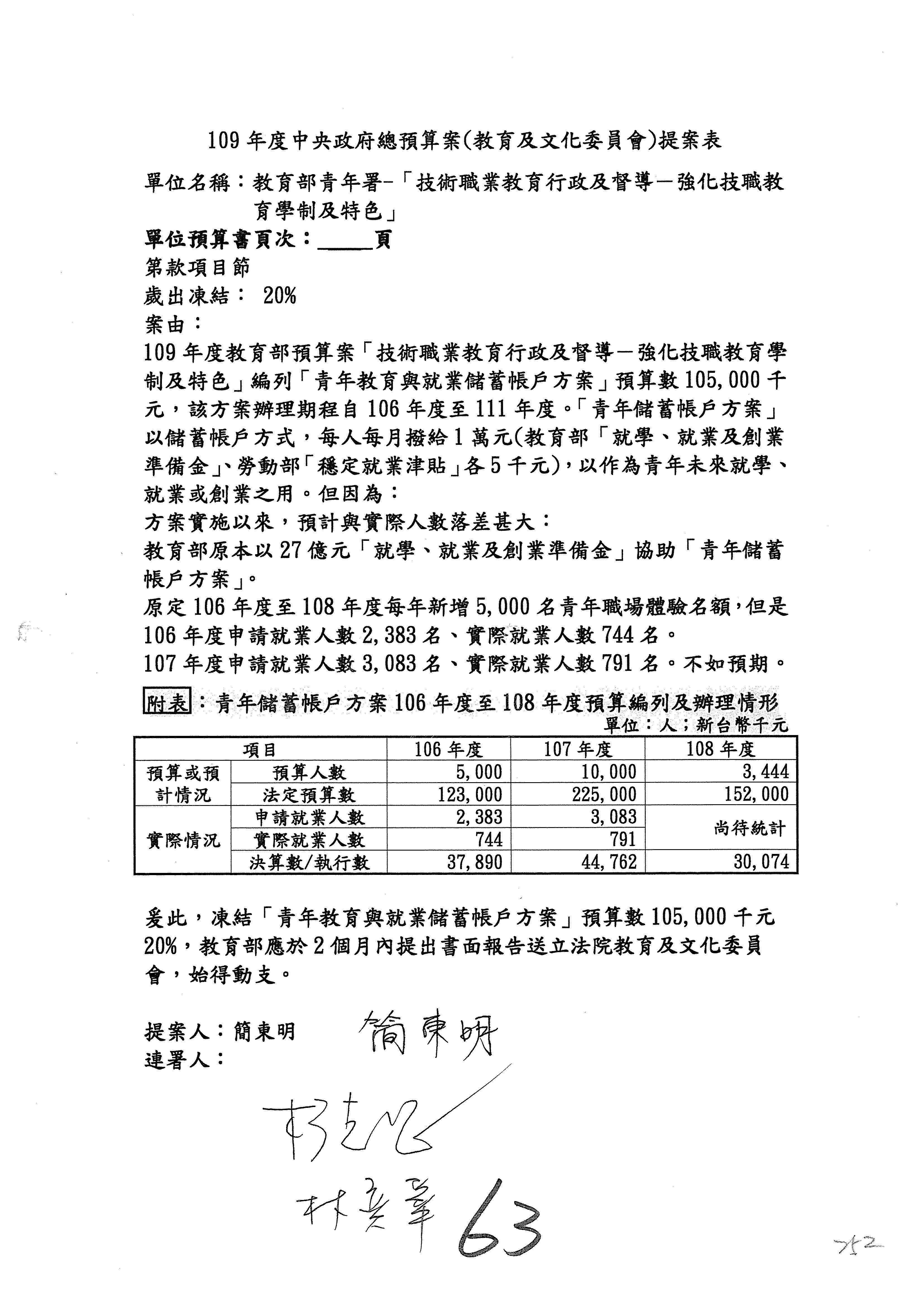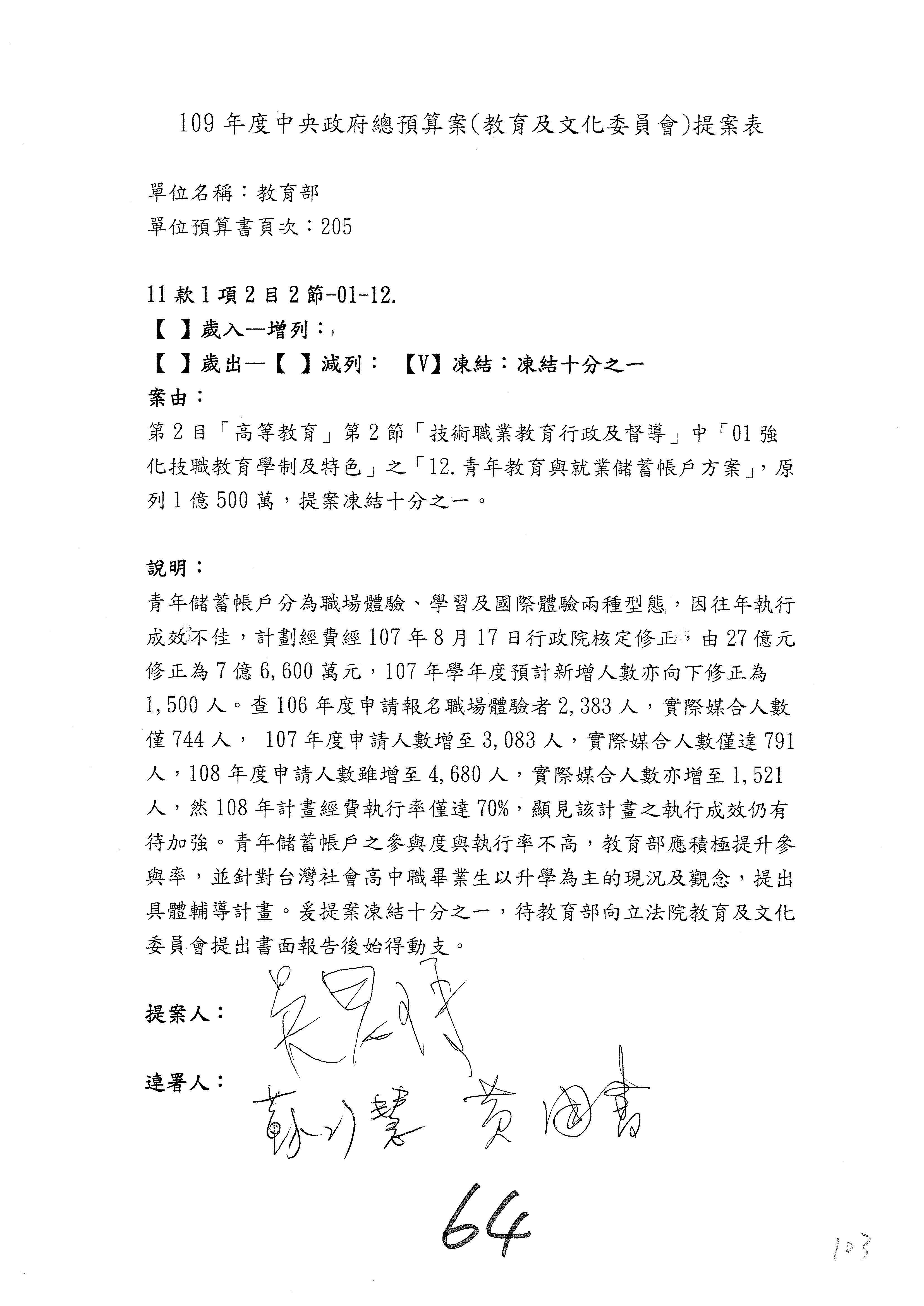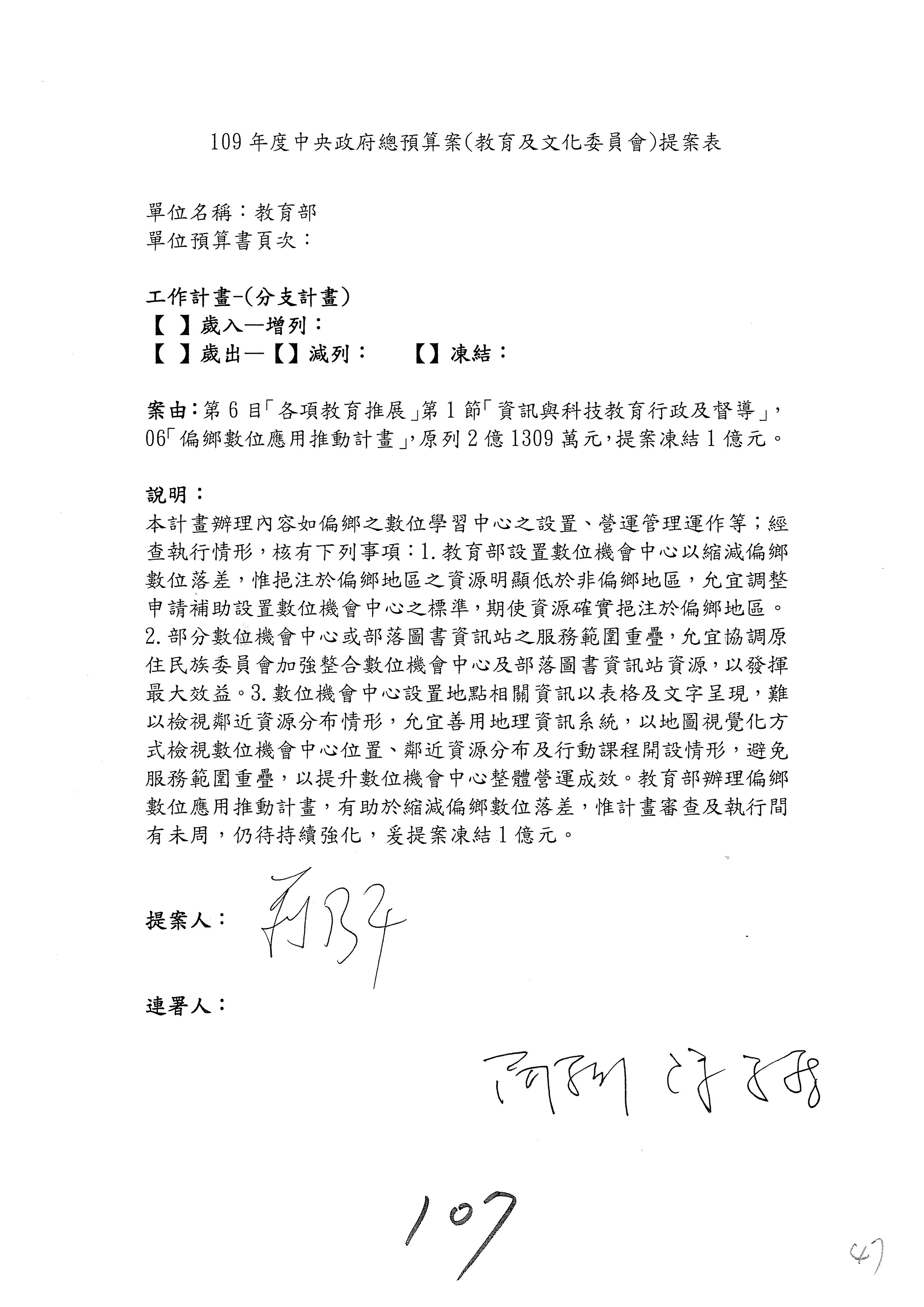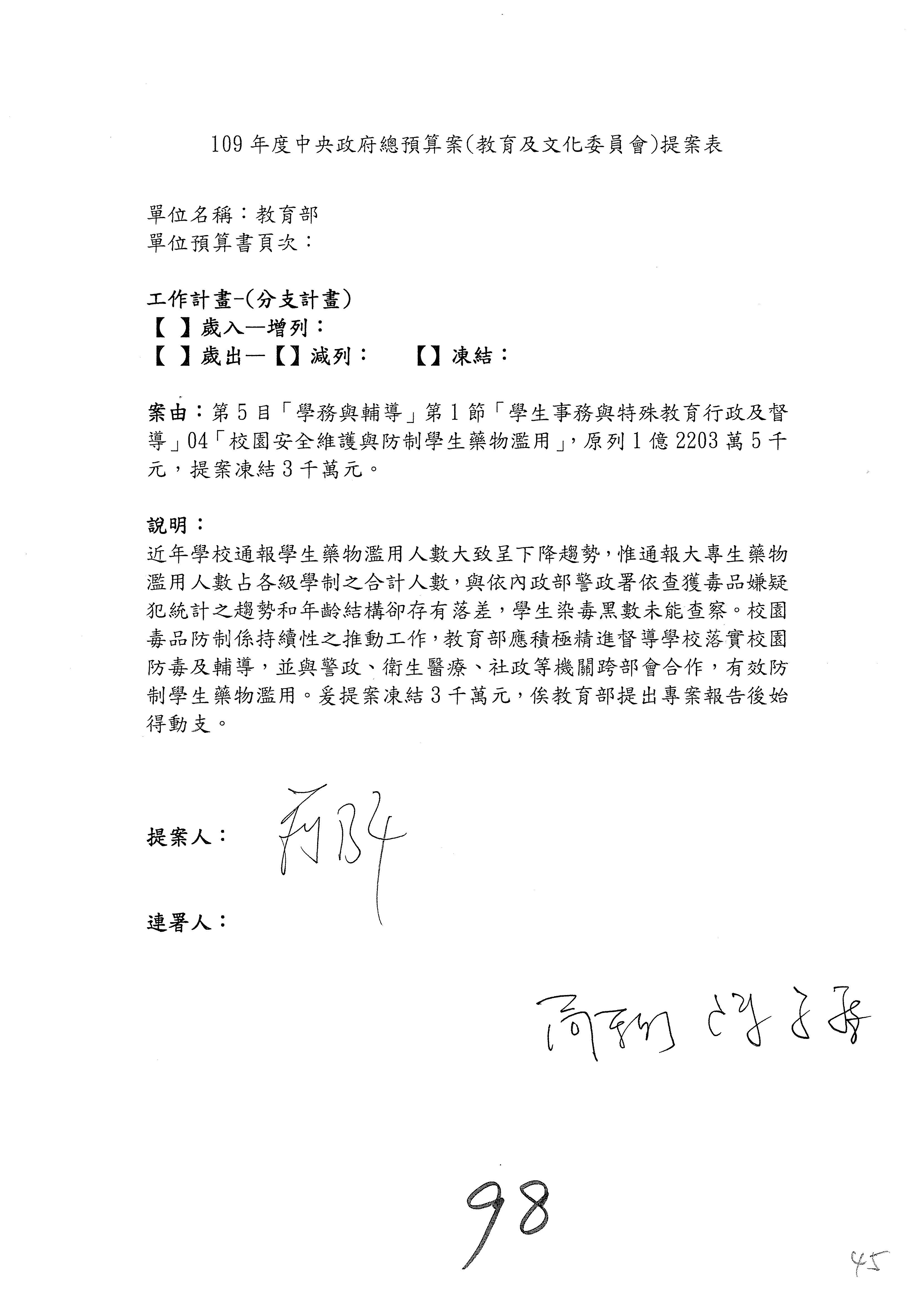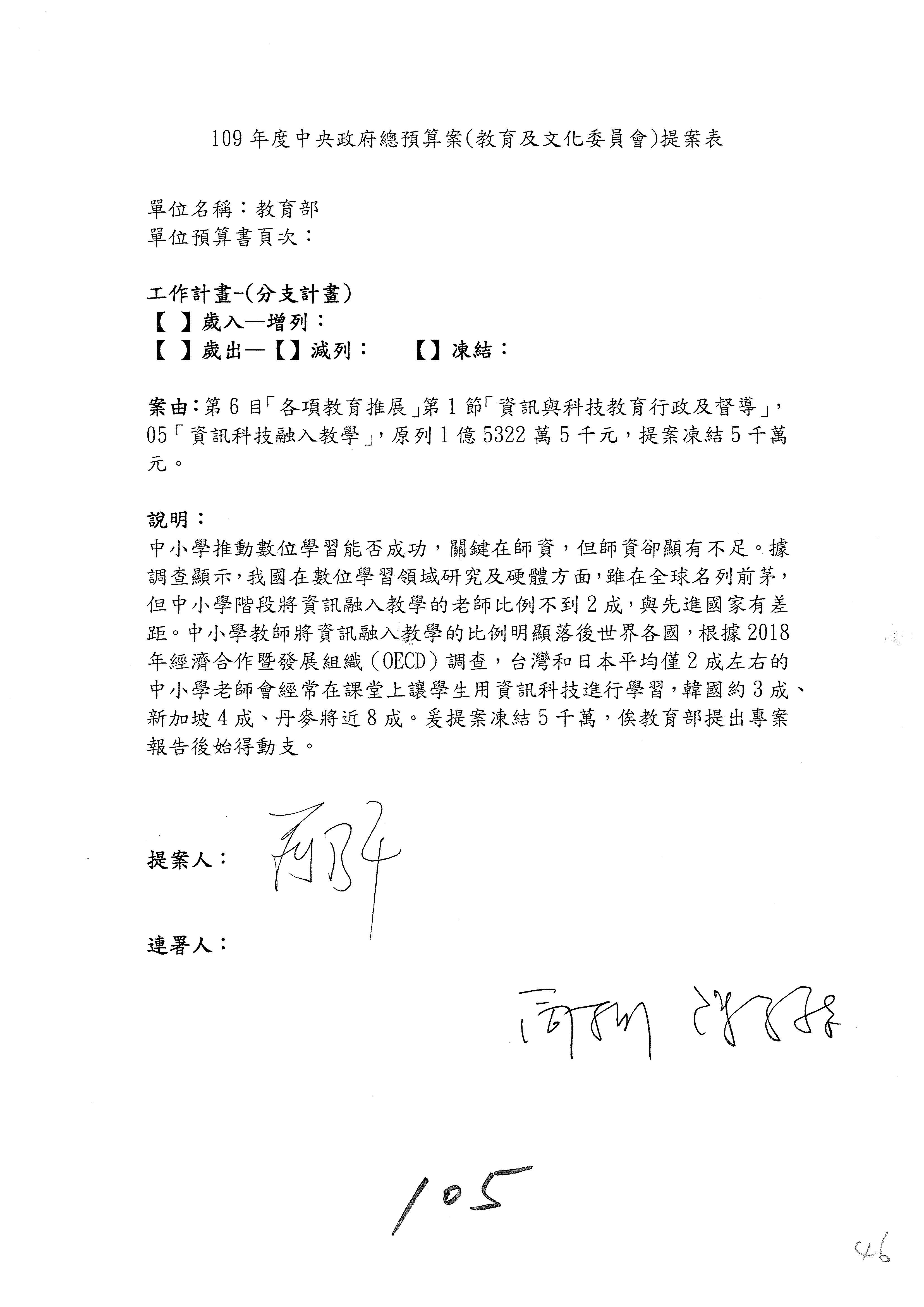 主席:還沒有處理到第106案,現在處理至第101案,這樣就沒問題。第5目預算照列,第99案改為主決議。