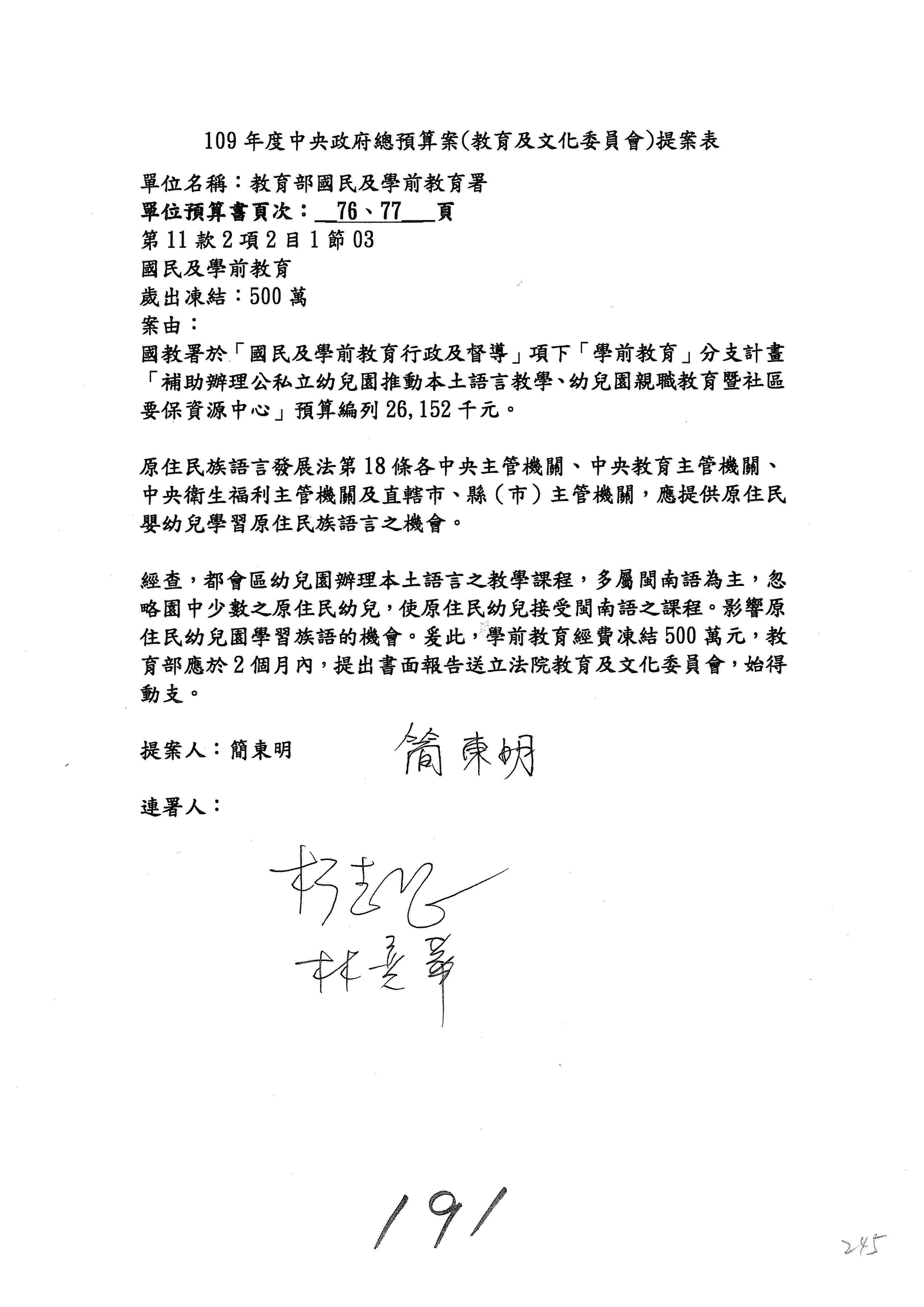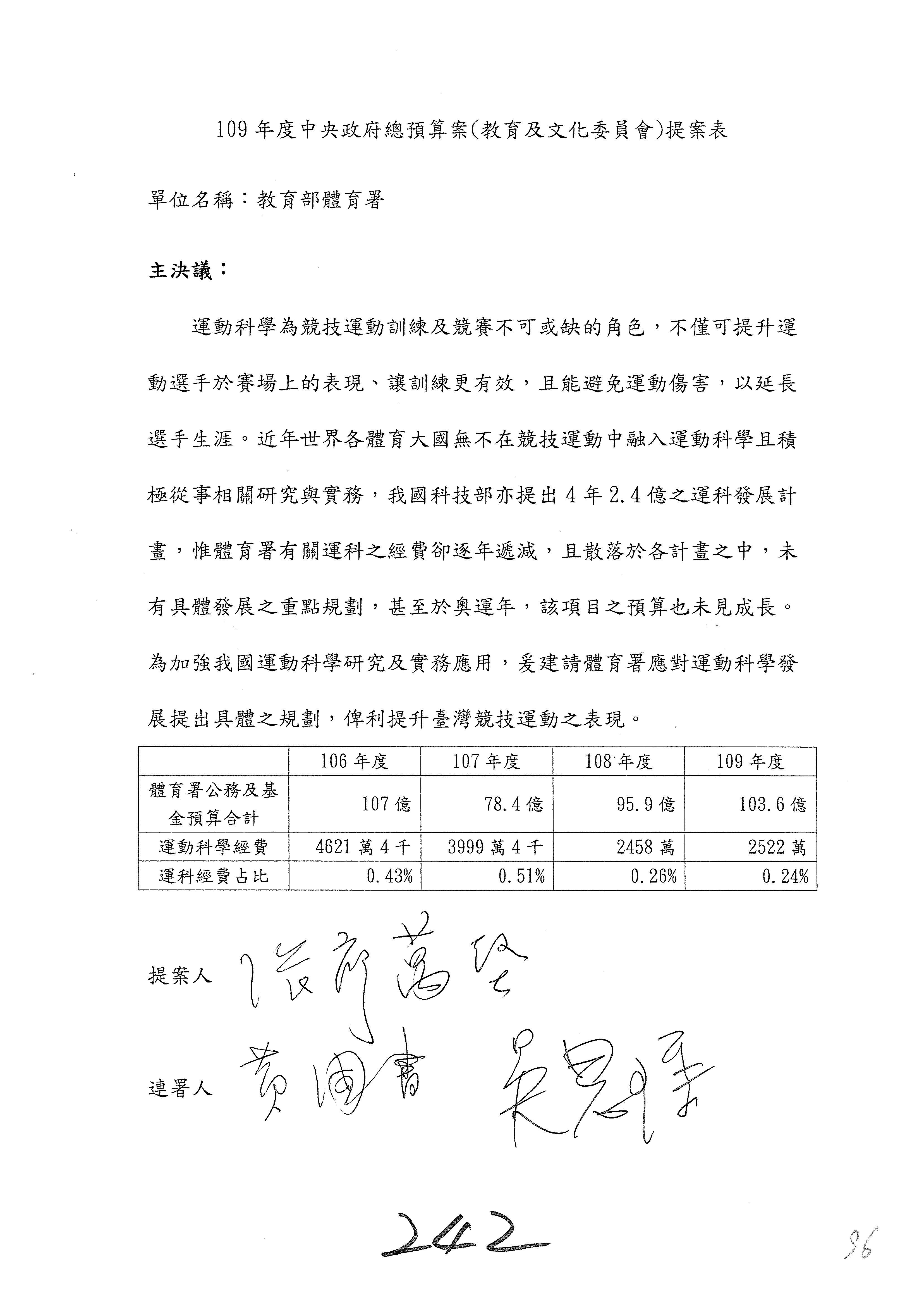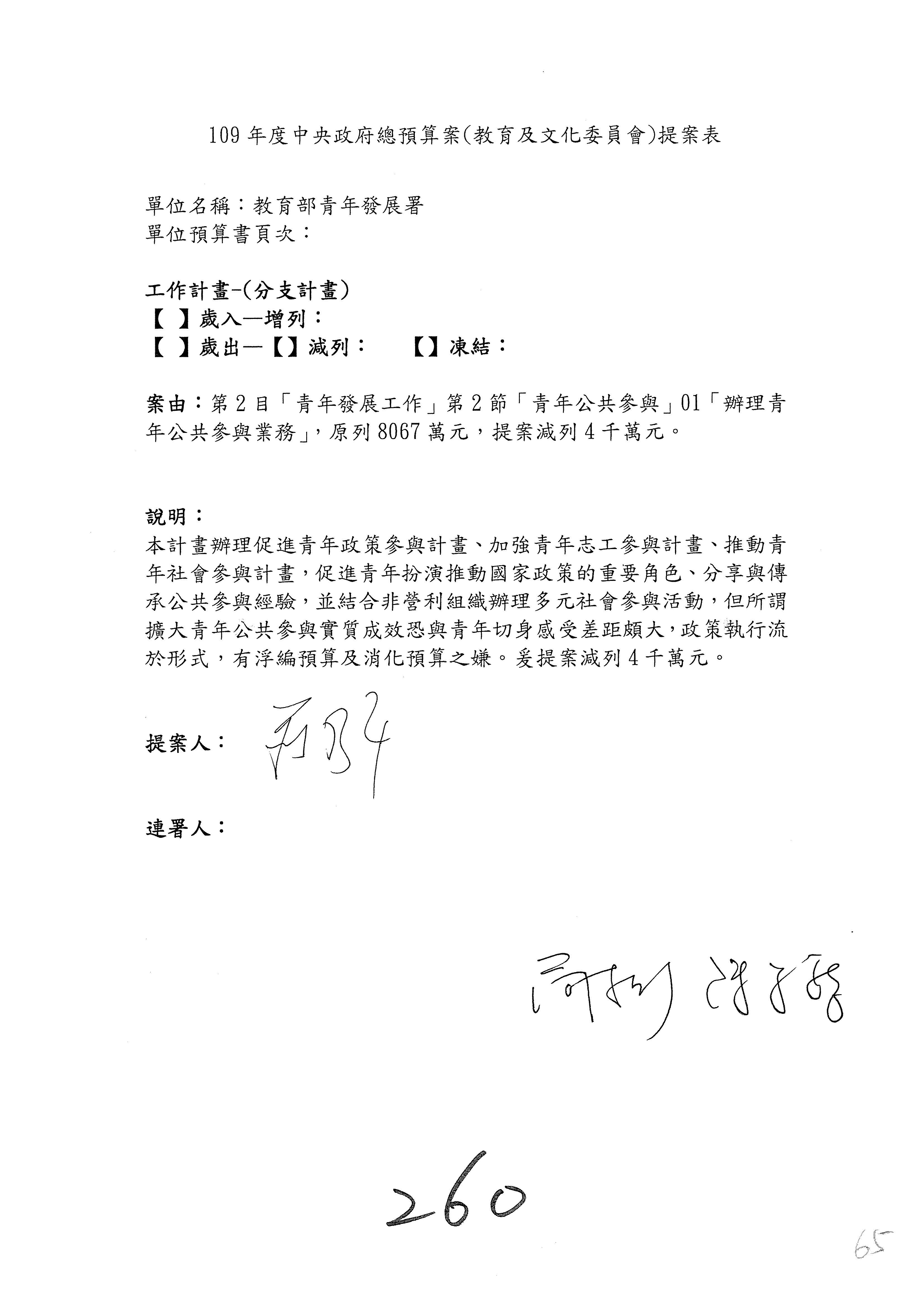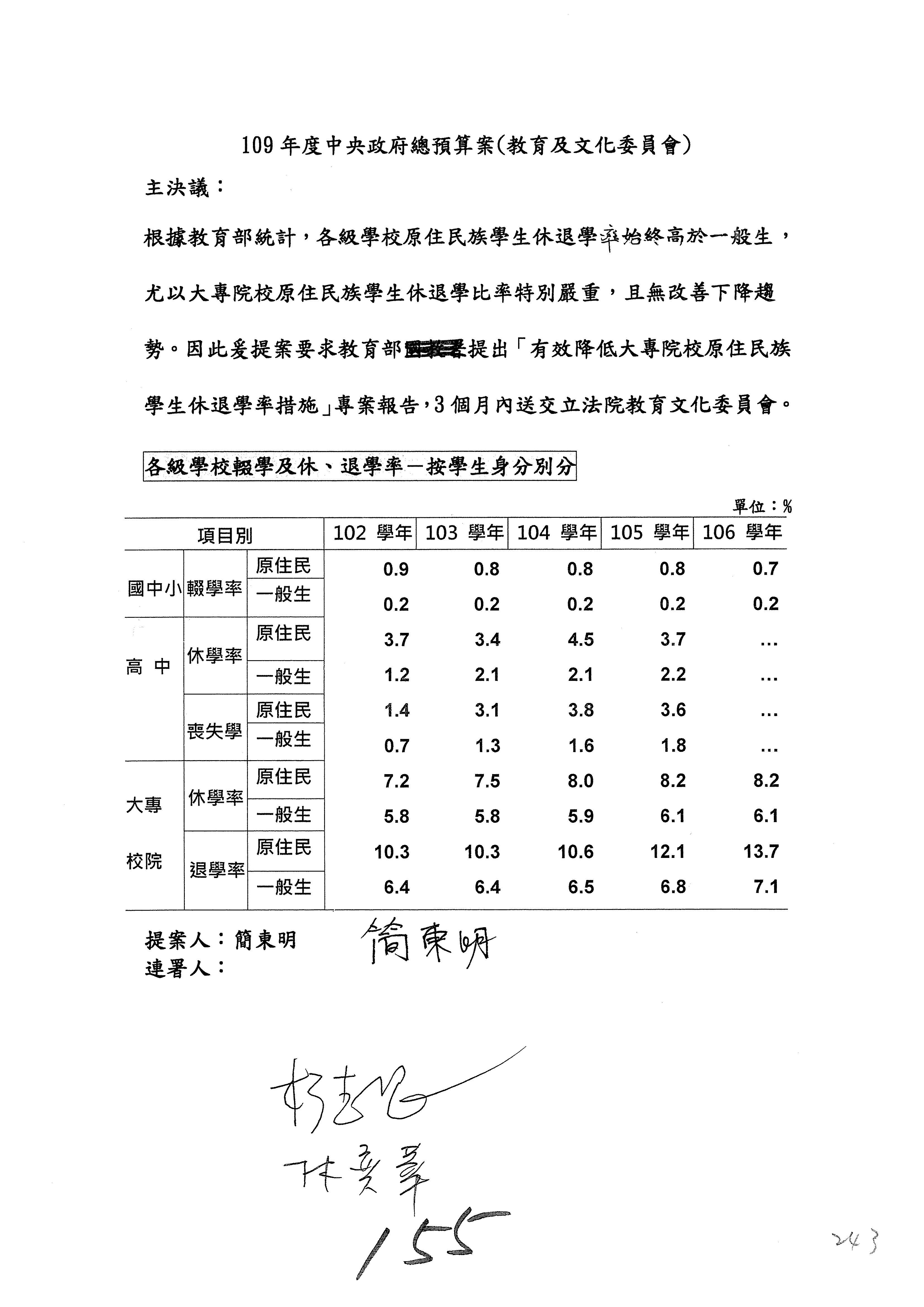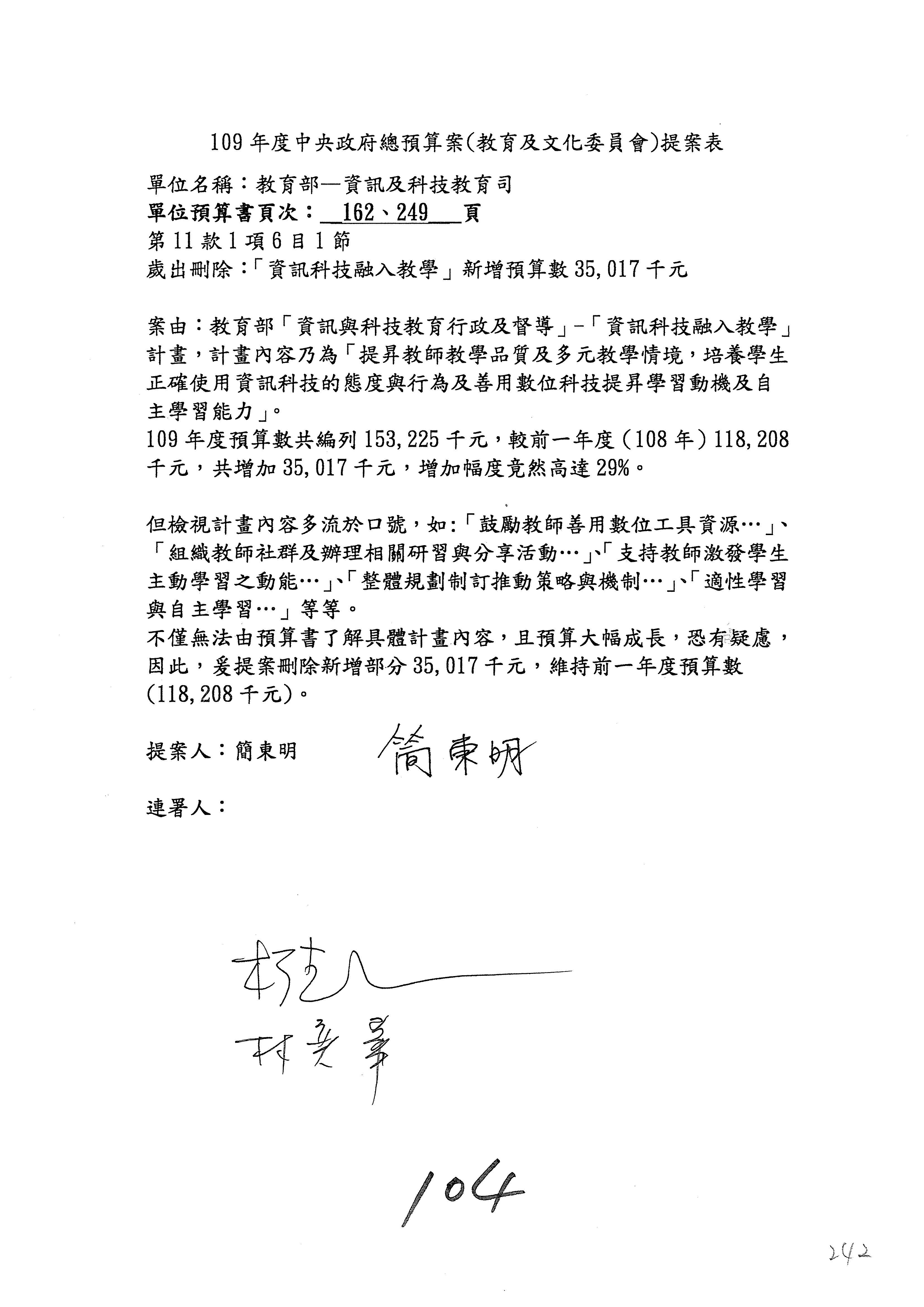 主席:還沒有處理到第106案,現在處理至第101案,這樣就沒問題。第5目預算照列,第99案改為主決議。