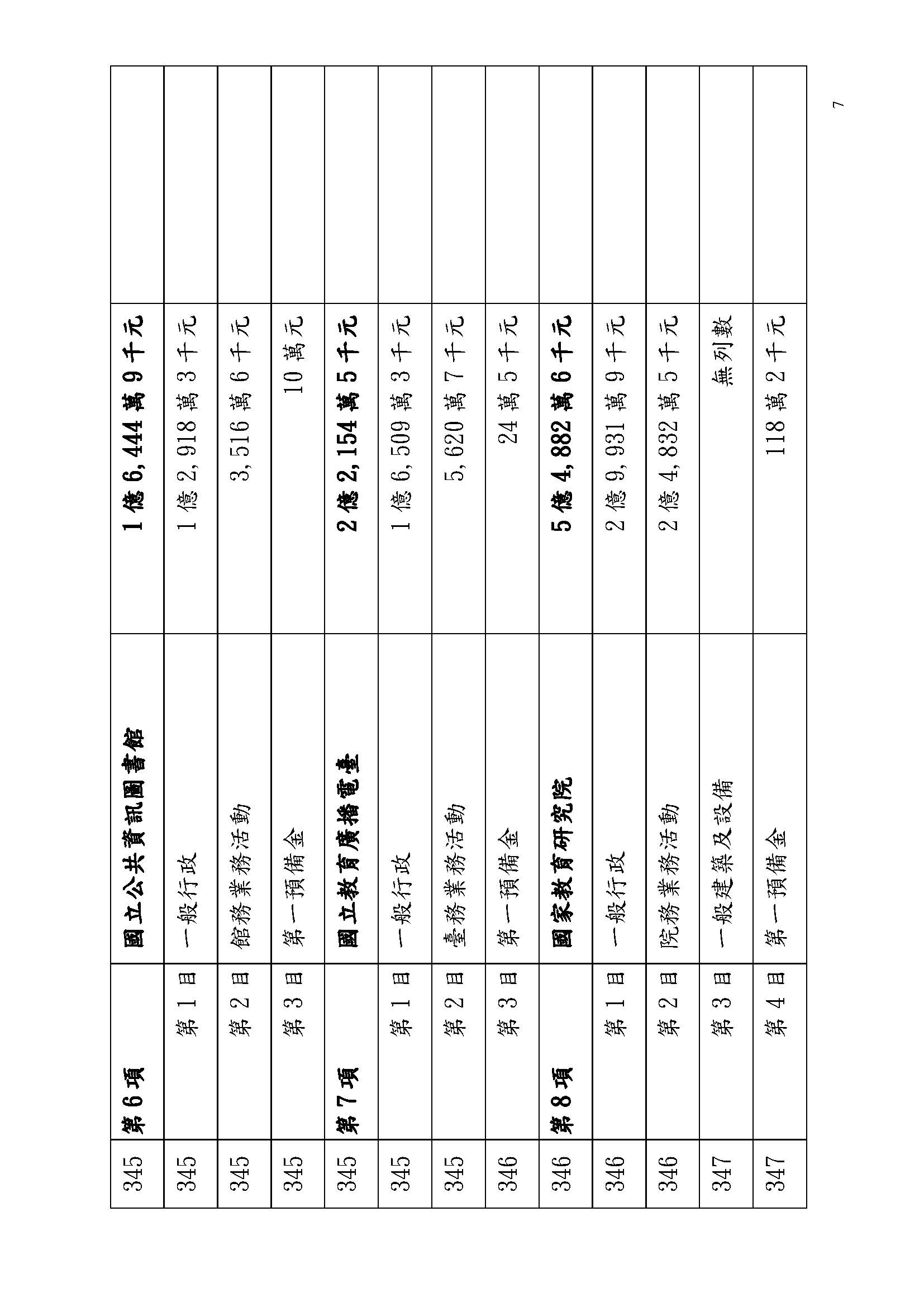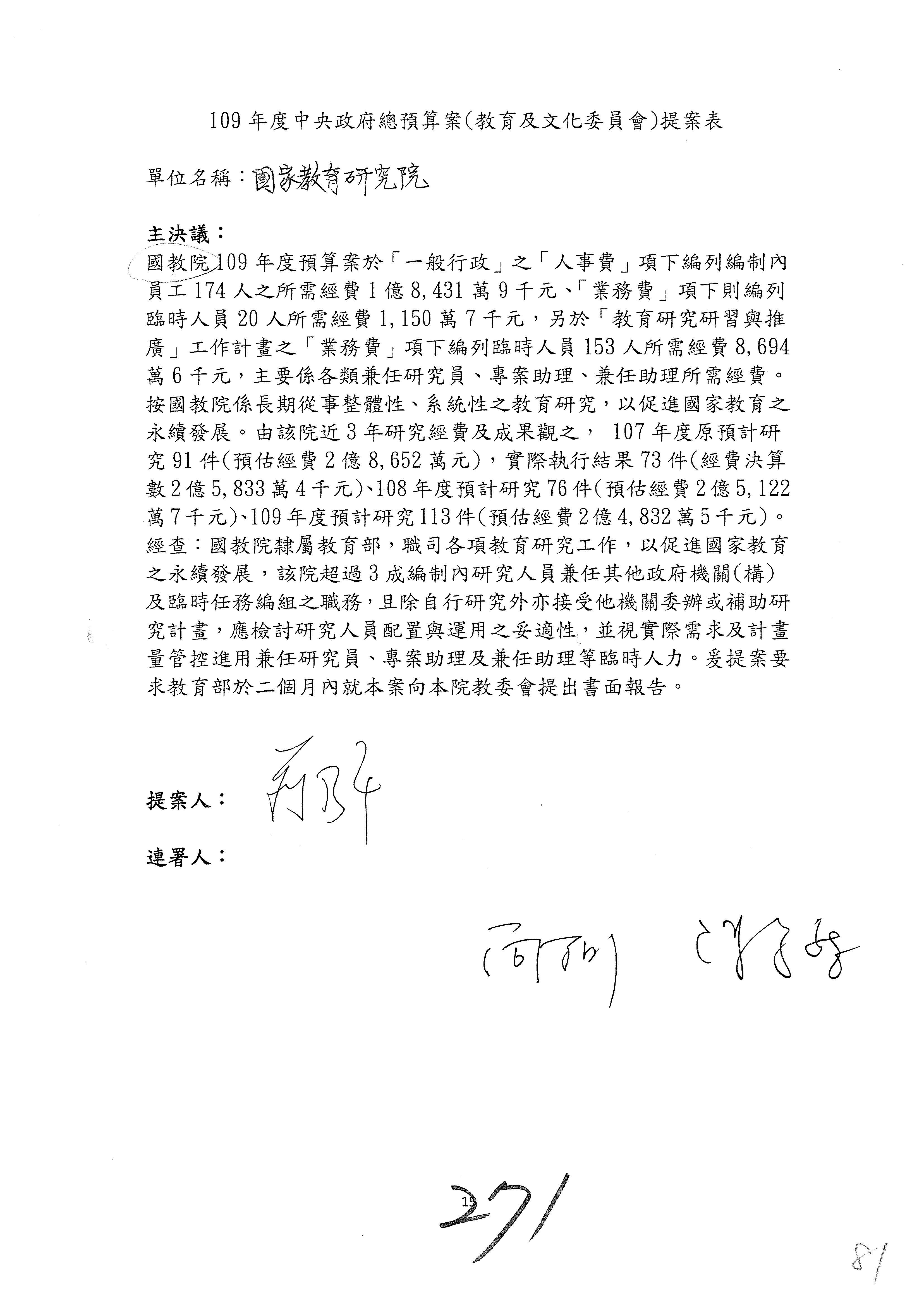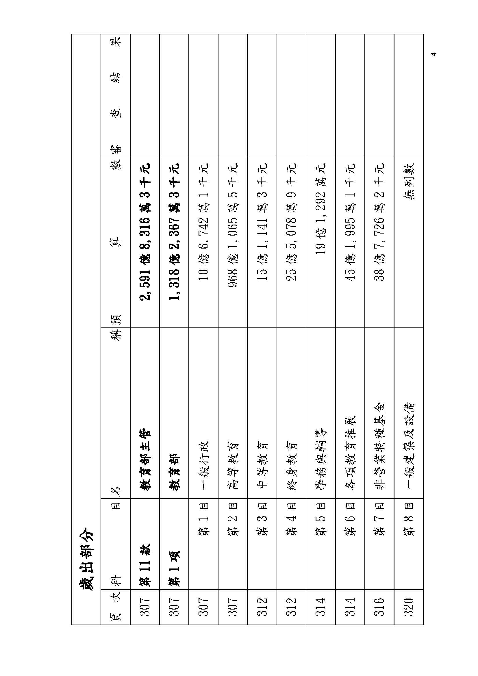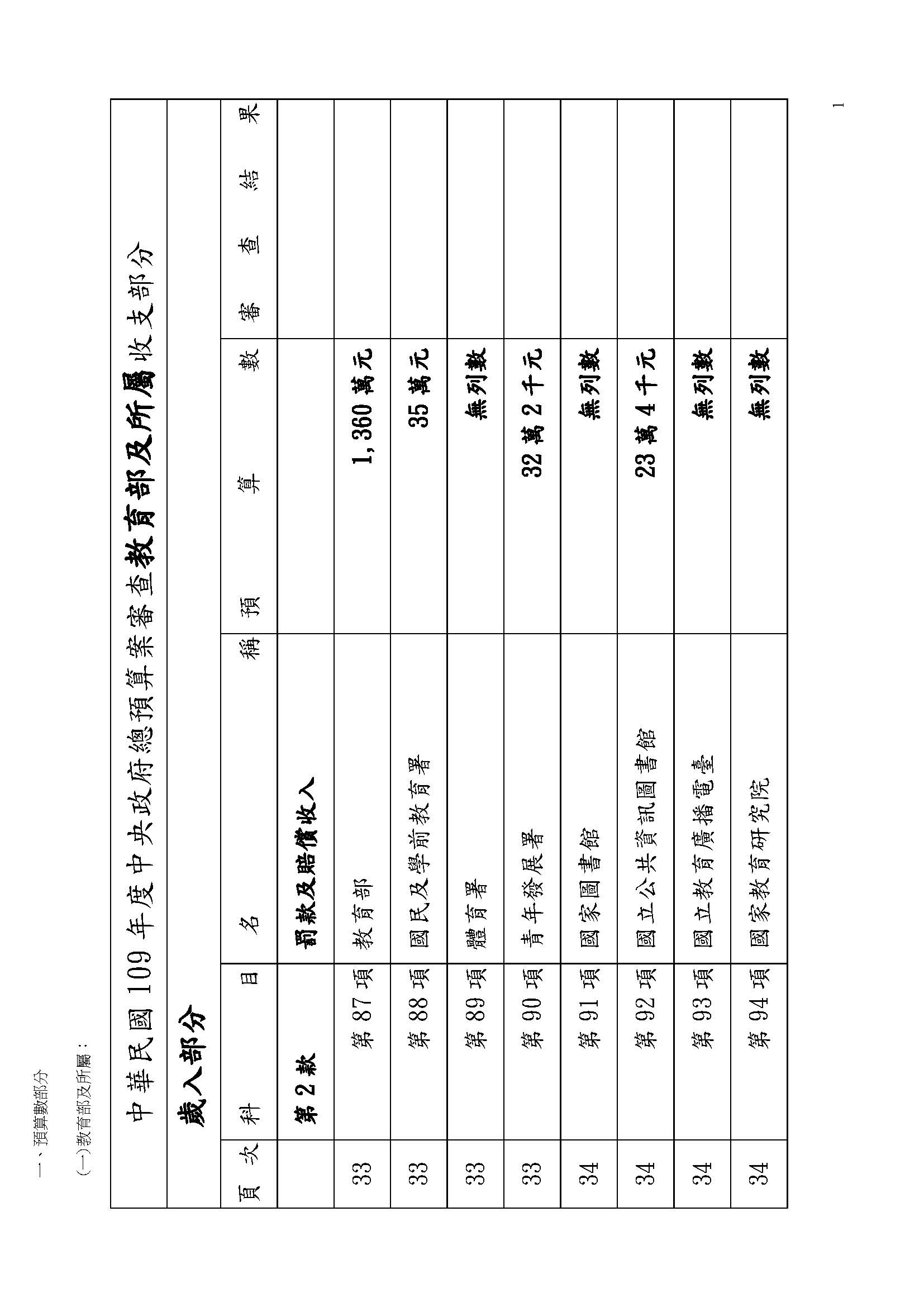主席:現在開始進行預算案審查,請議事人員宣讀預算數及提案內容,教育部及所屬單位預算案計271案;教育部主管各非營業基金預算案計20案,並進行討論與協商。