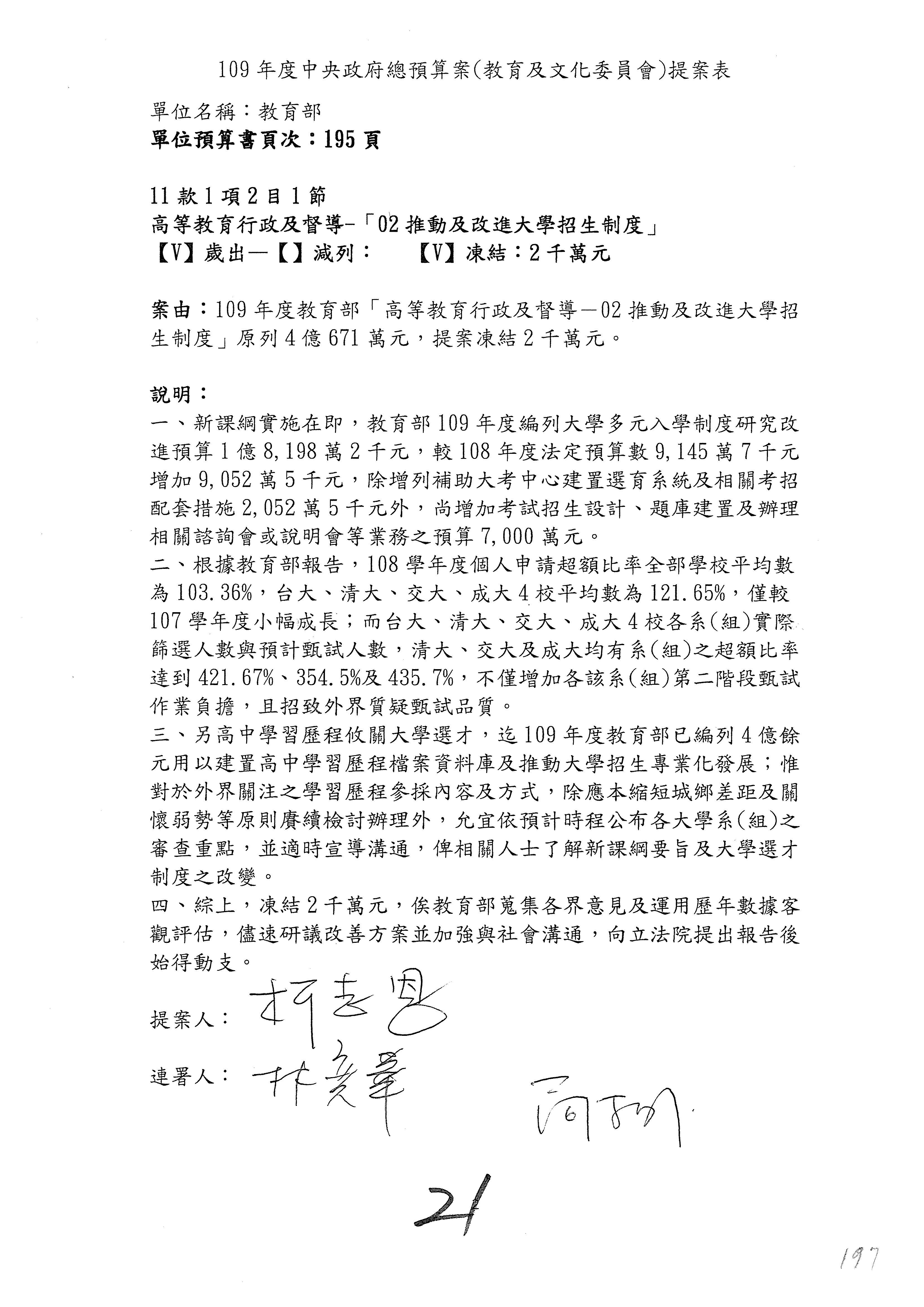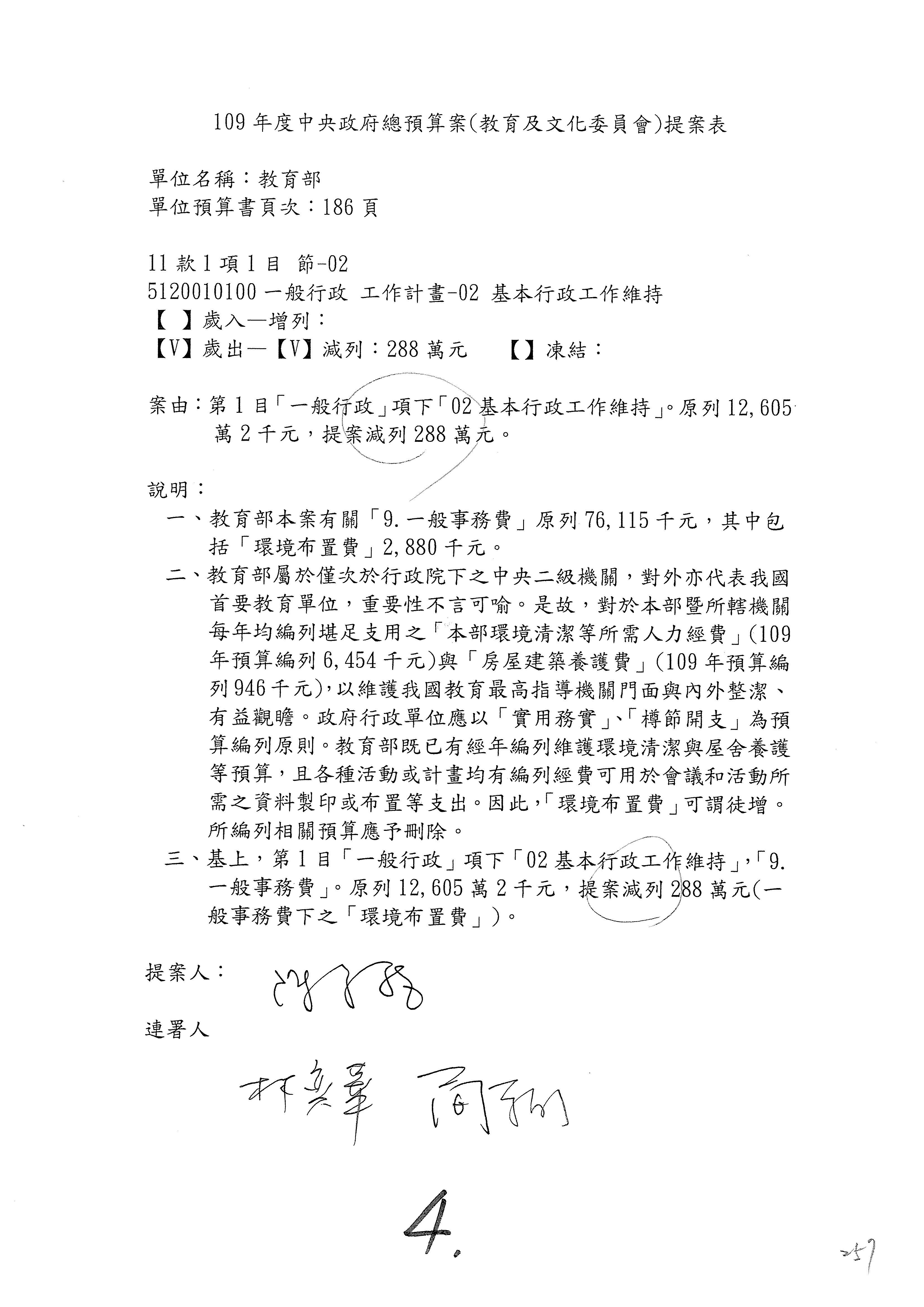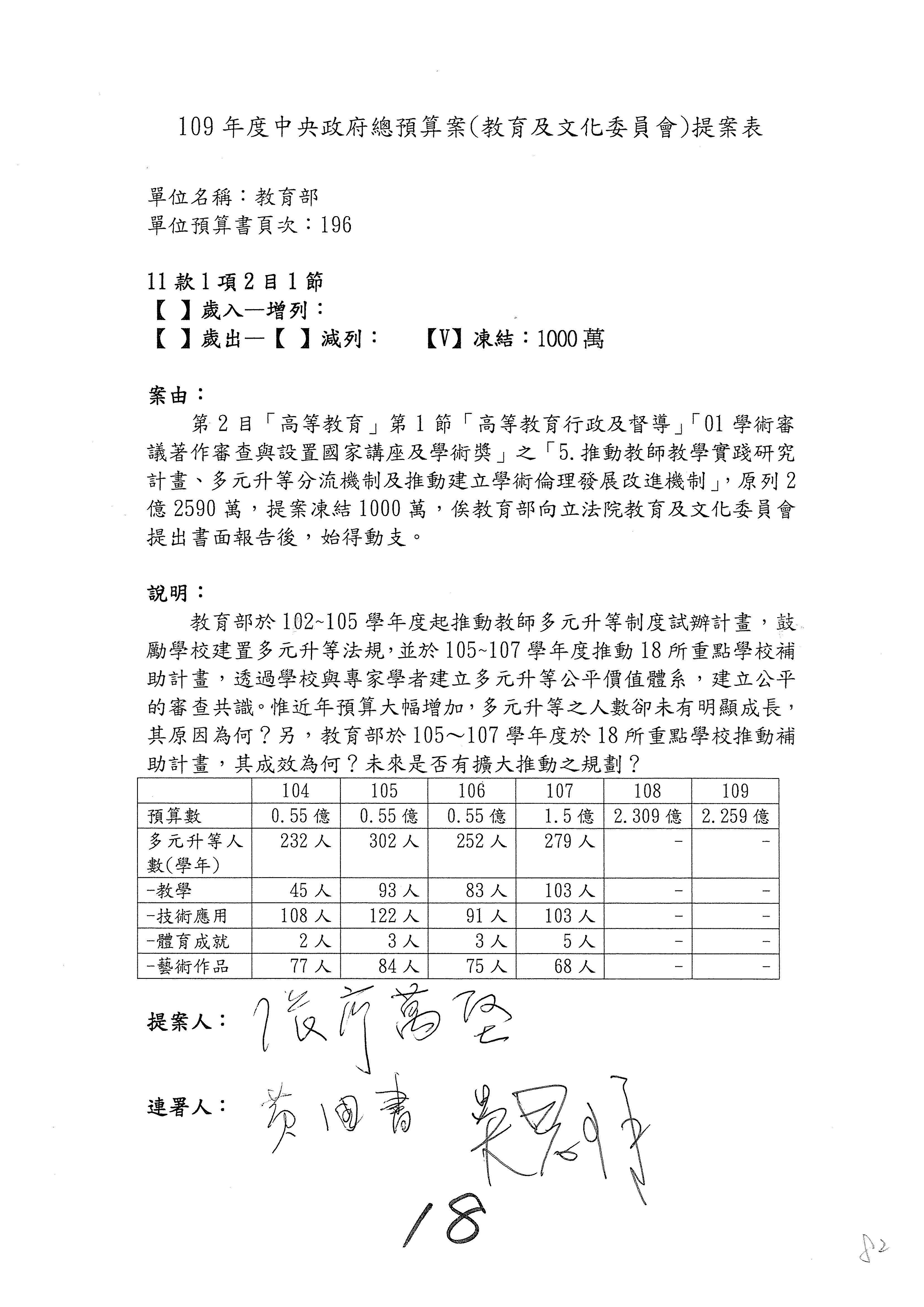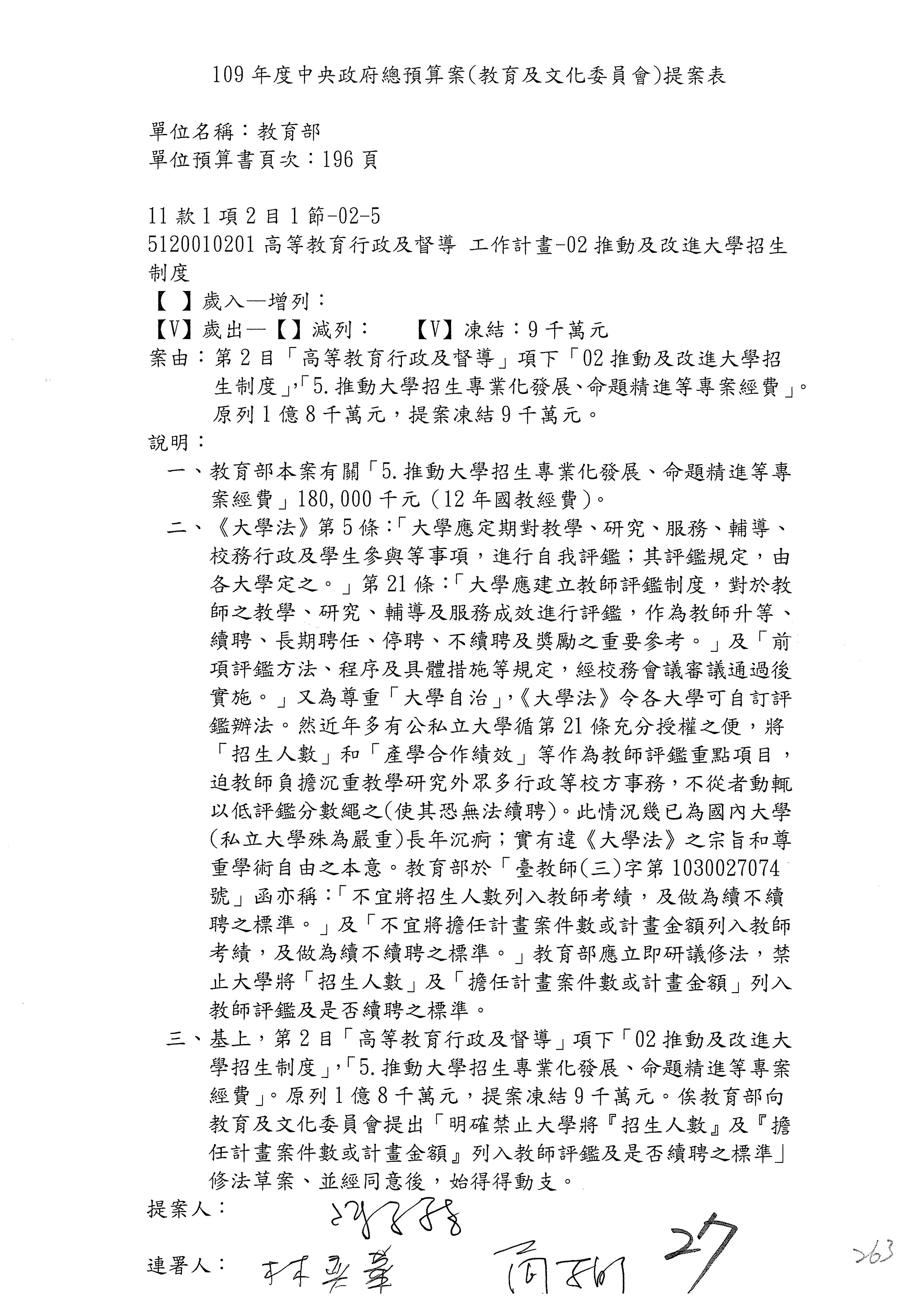主席:現在開始進行預算案審查,請議事人員宣讀預算數及提案內容,教育部及所屬單位預算案計271案;教育部主管各非營業基金預算案計20案,並進行討論與協商。