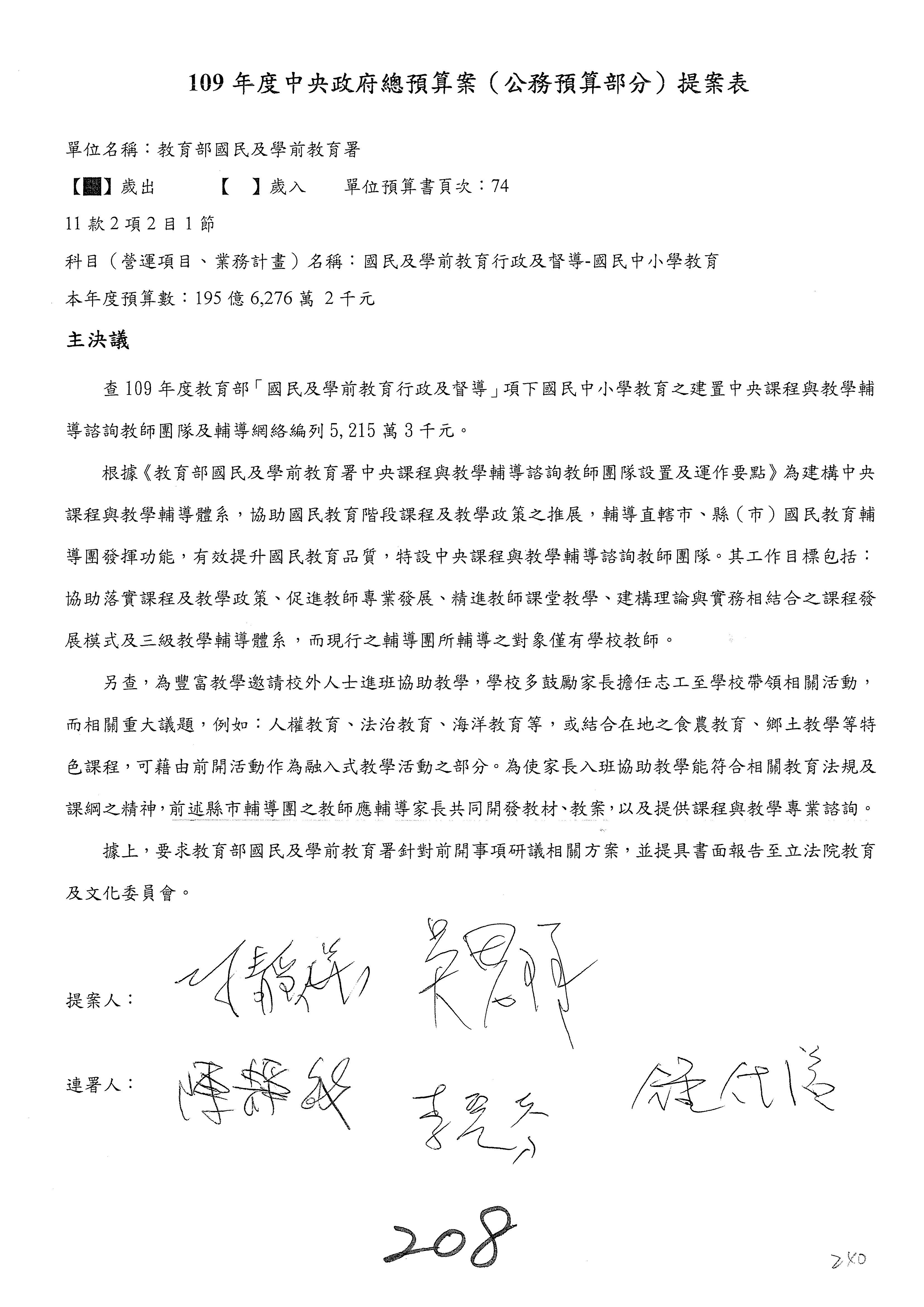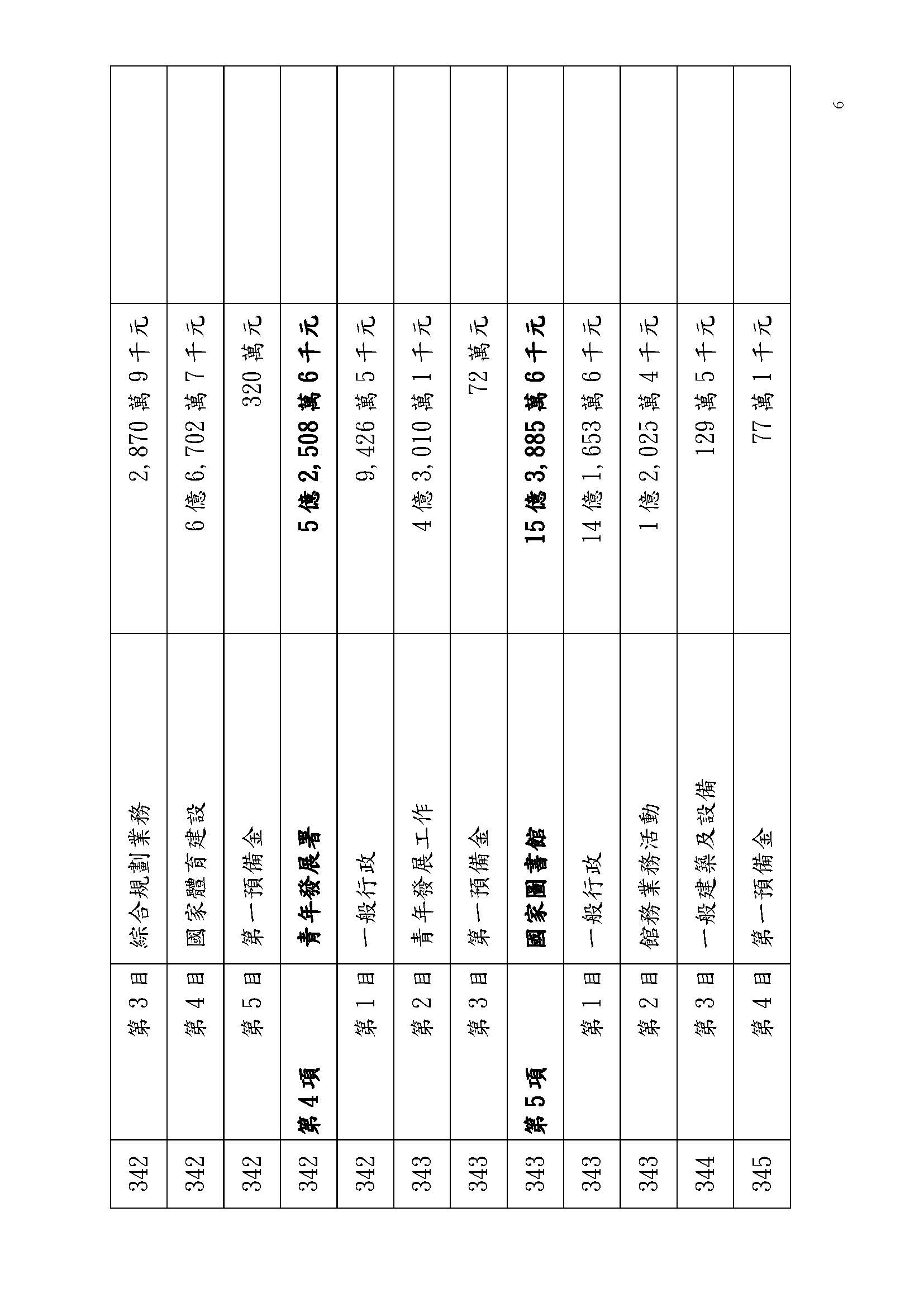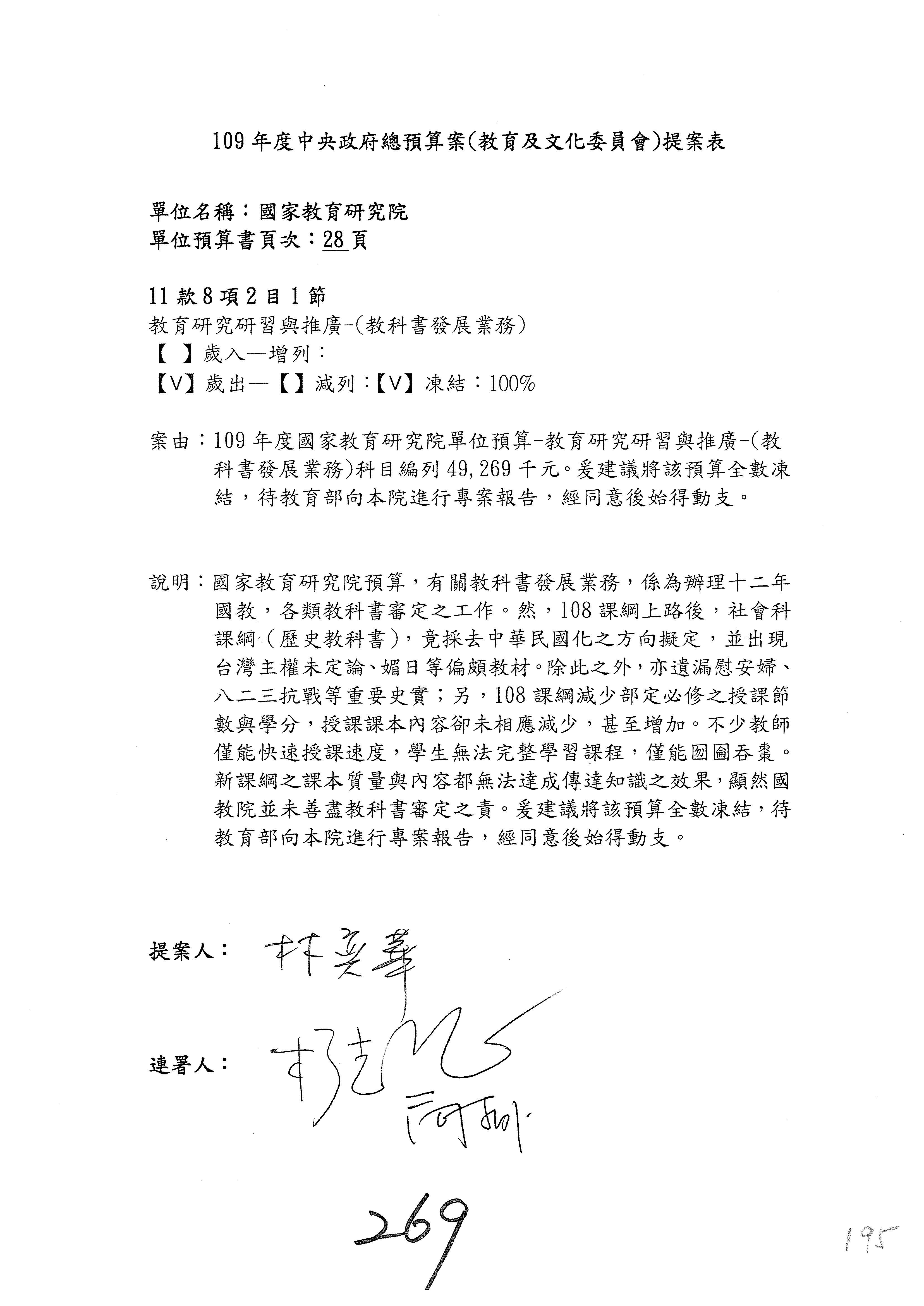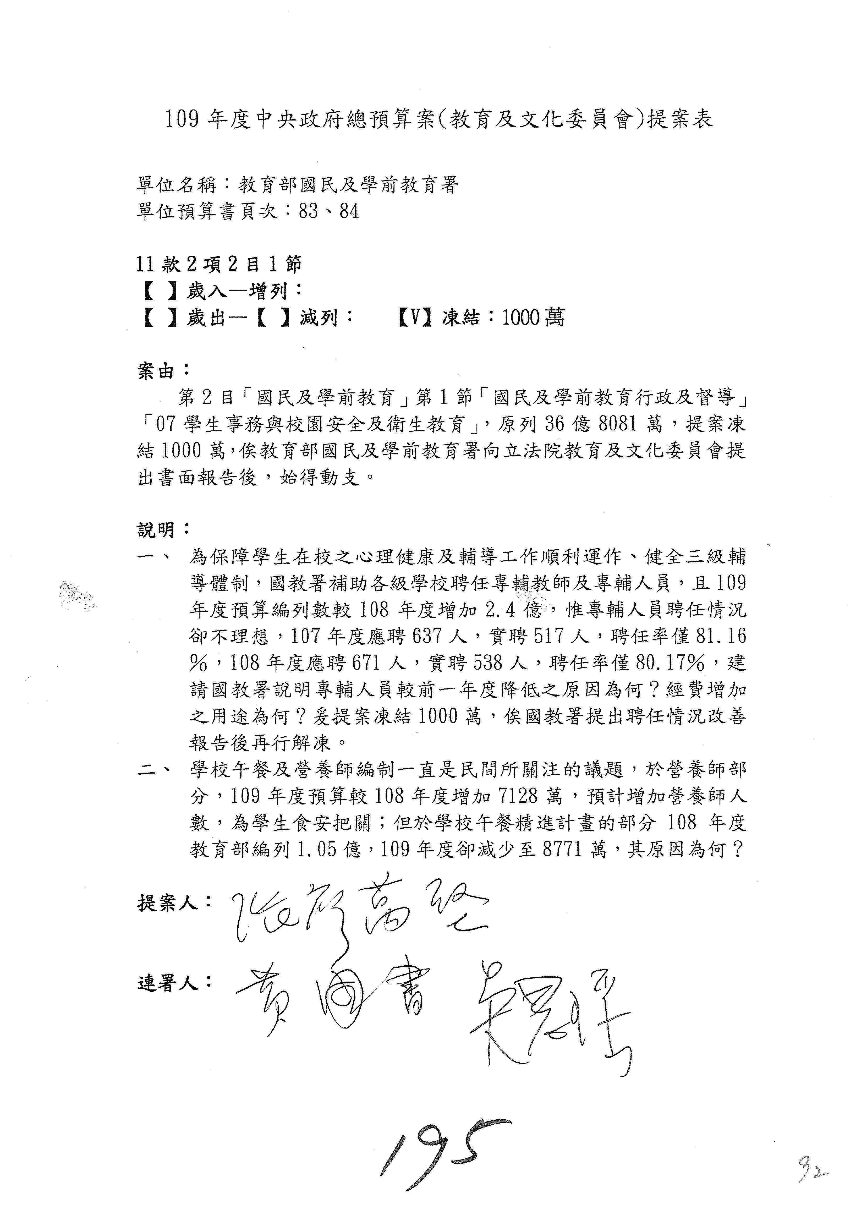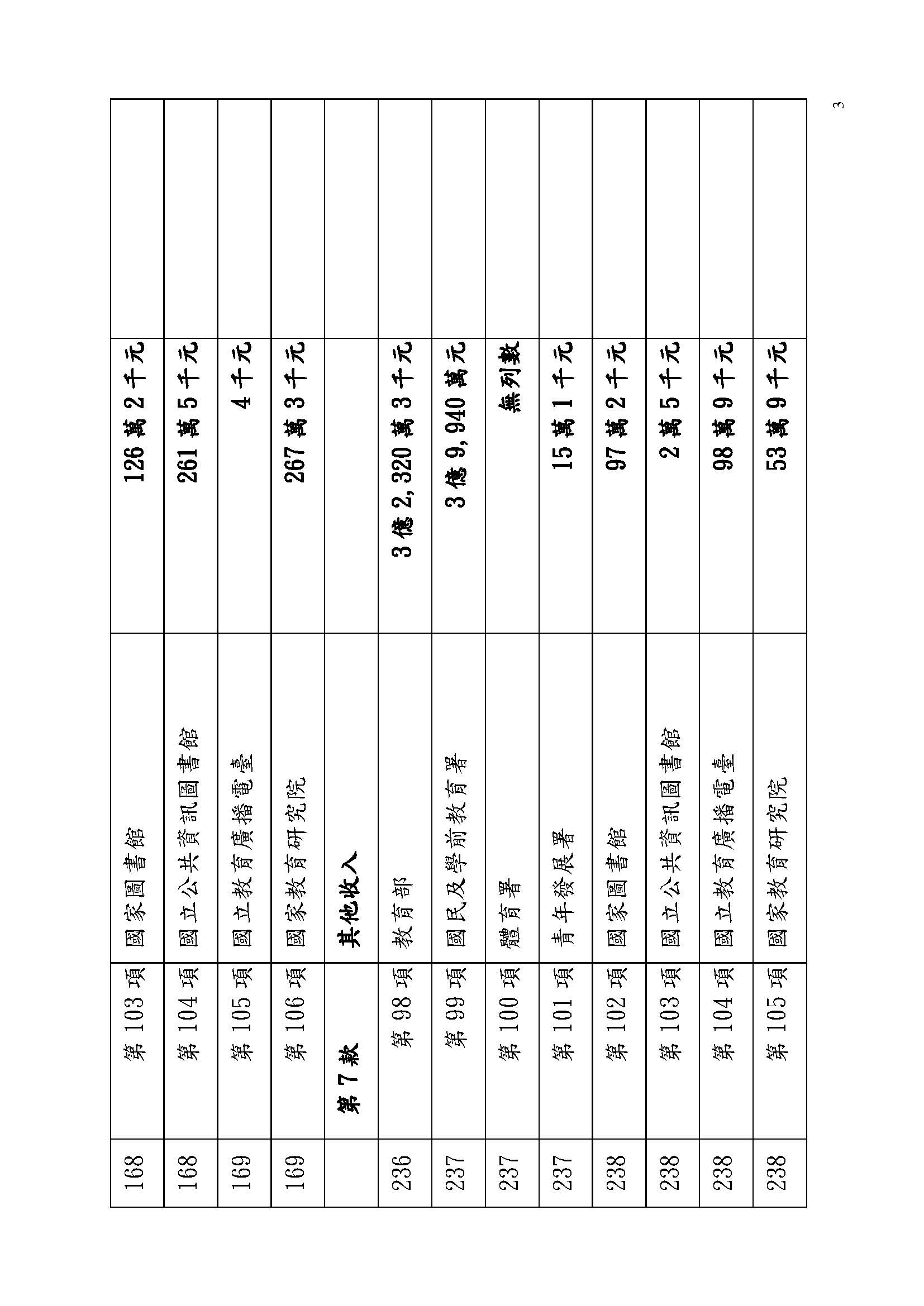 主席:現在開始進行預算案審查,請議事人員宣讀預算數及提案內容,教育部及所屬單位預算案計271案;教育部主管各非營業基金預算案計20案,並進行討論與協商。