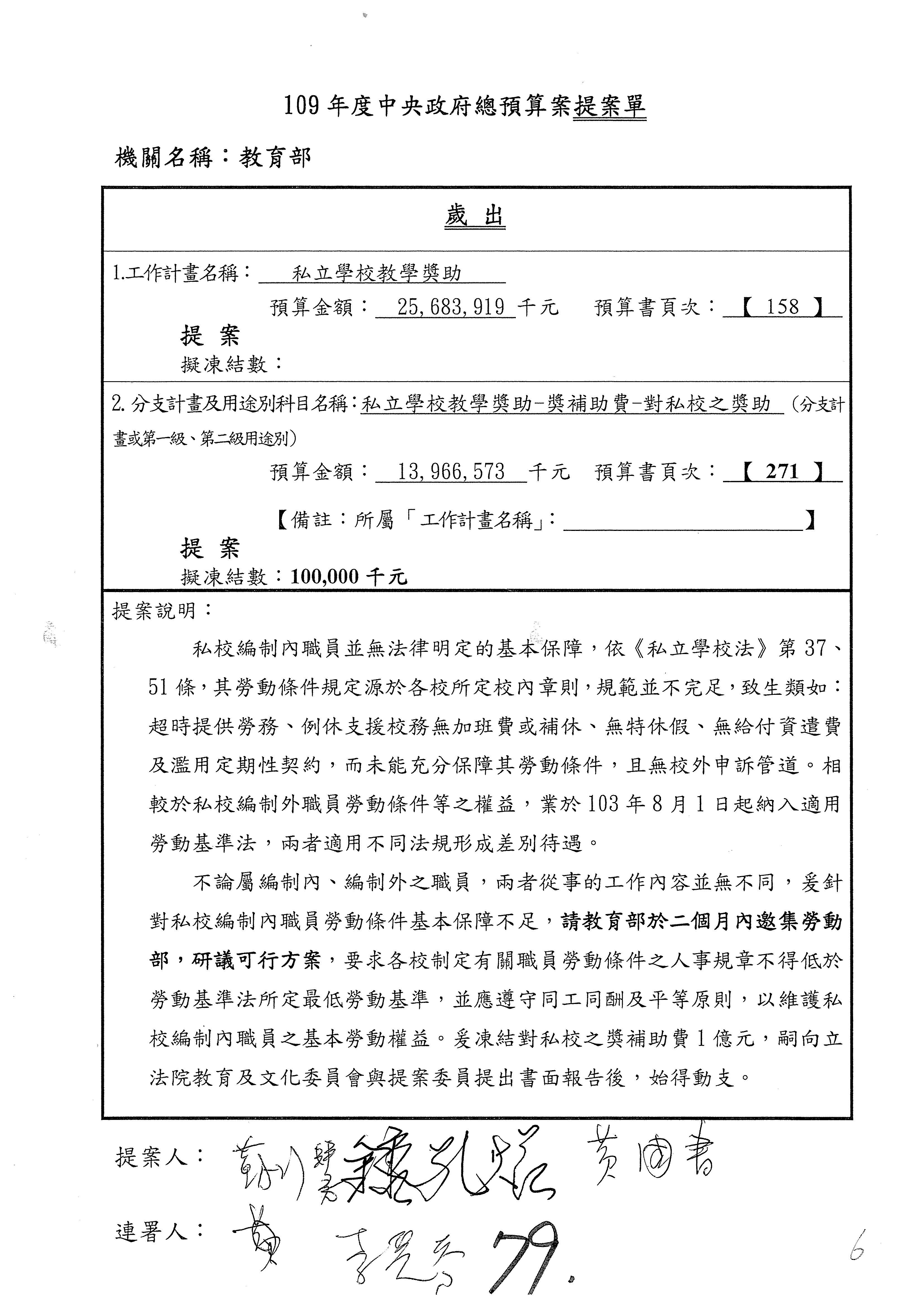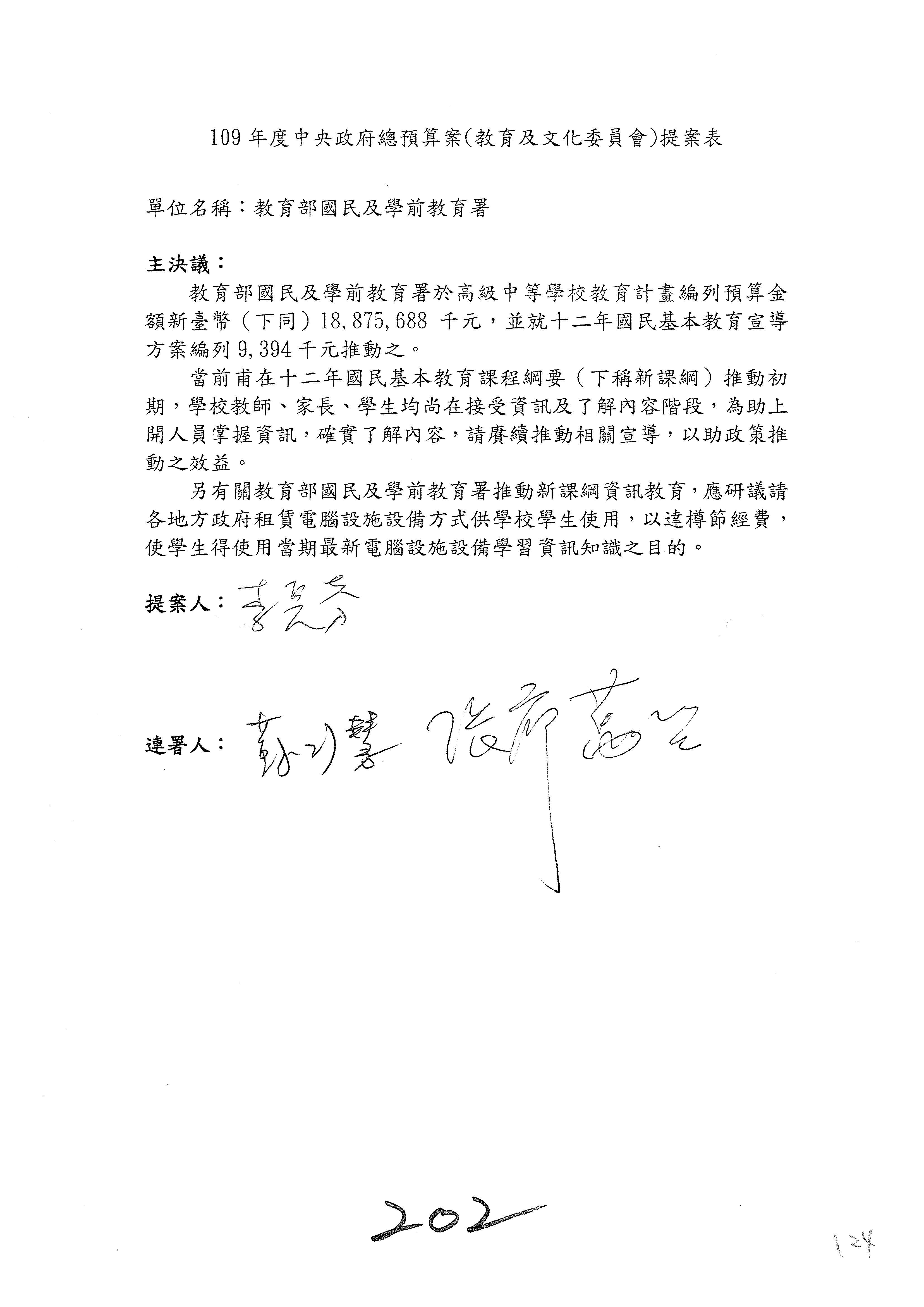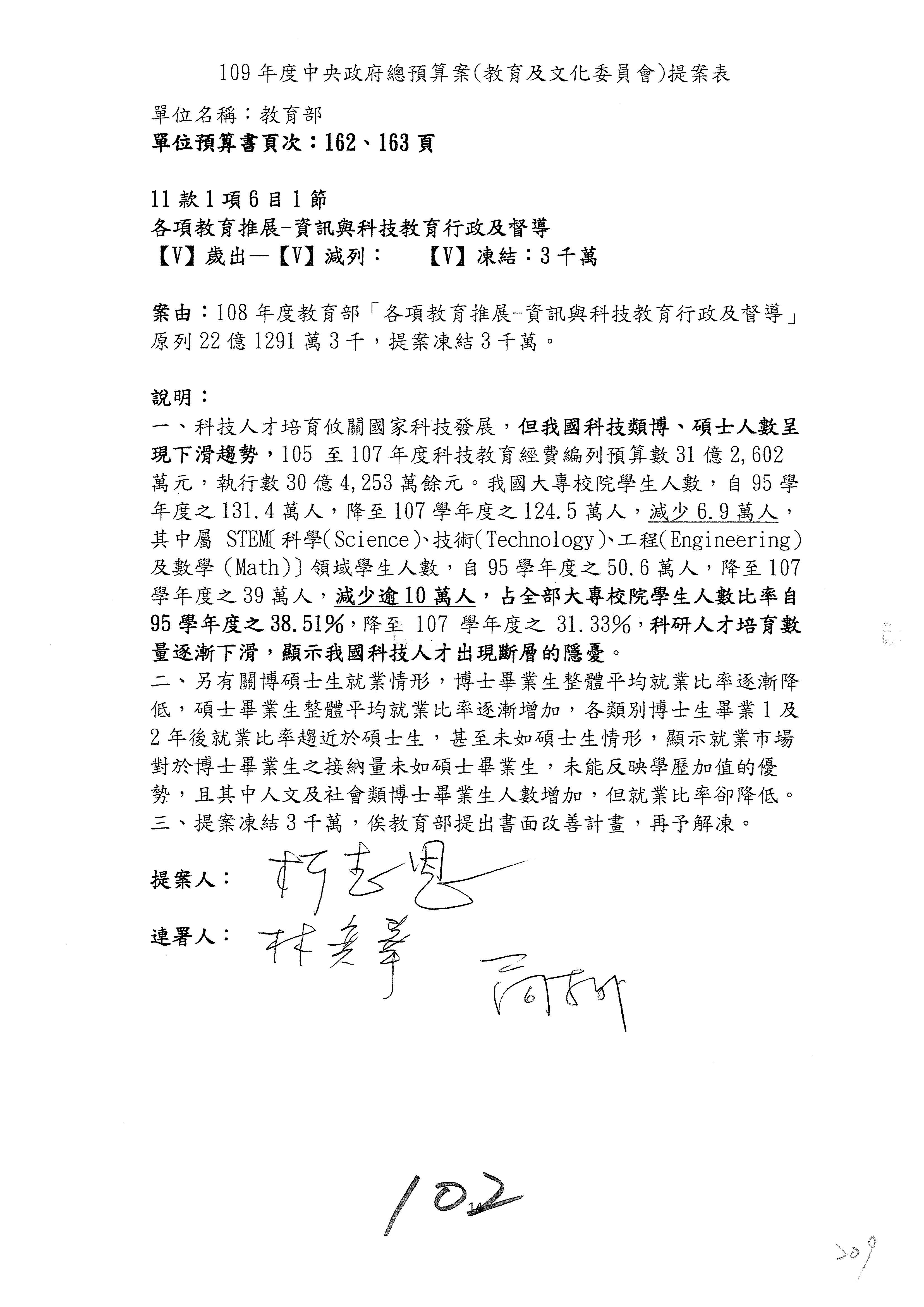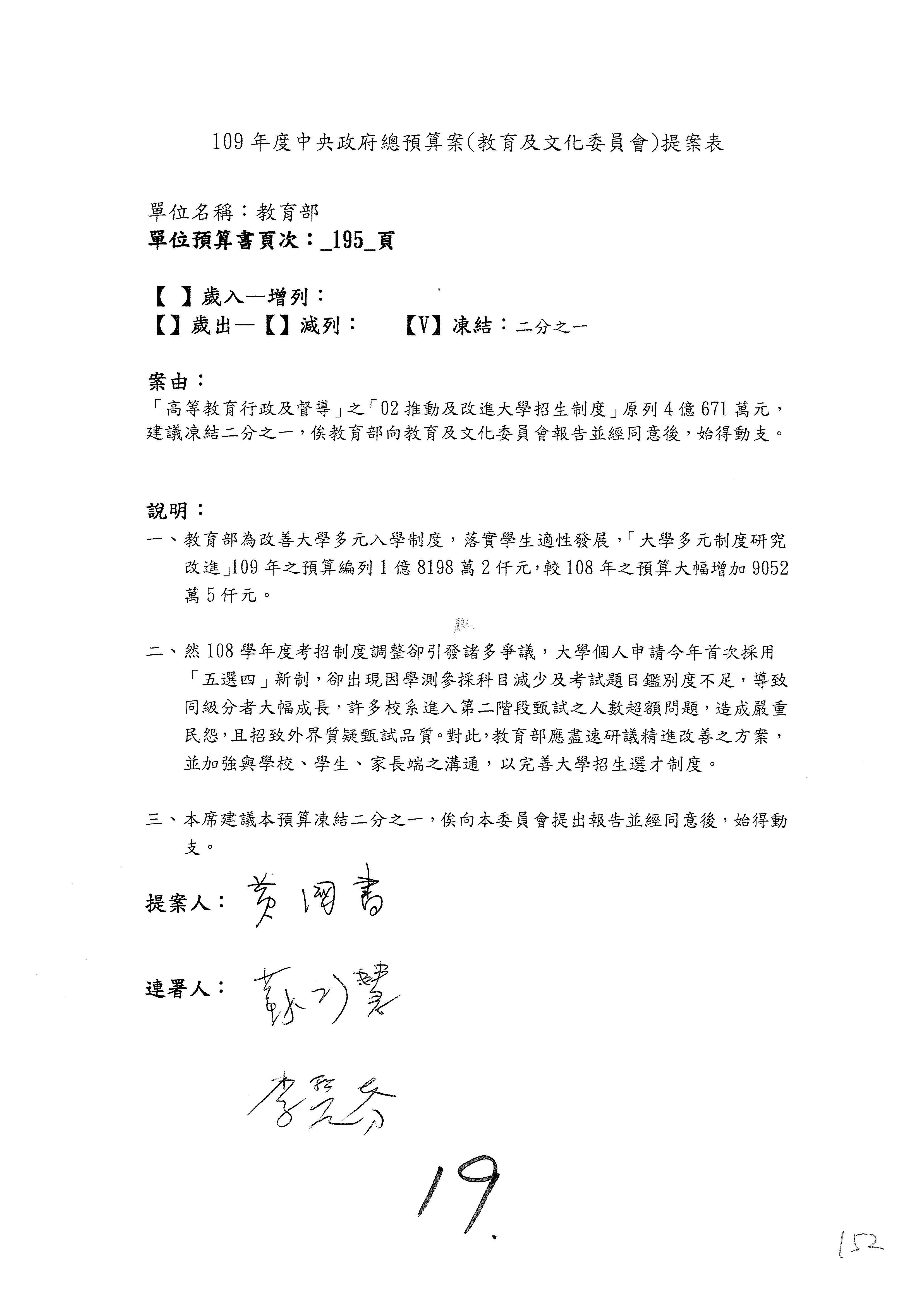主席:現在開始進行預算案審查,請議事人員宣讀預算數及提案內容,教育部及所屬單位預算案計271案;教育部主管各非營業基金預算案計20案,並進行討論與協商。