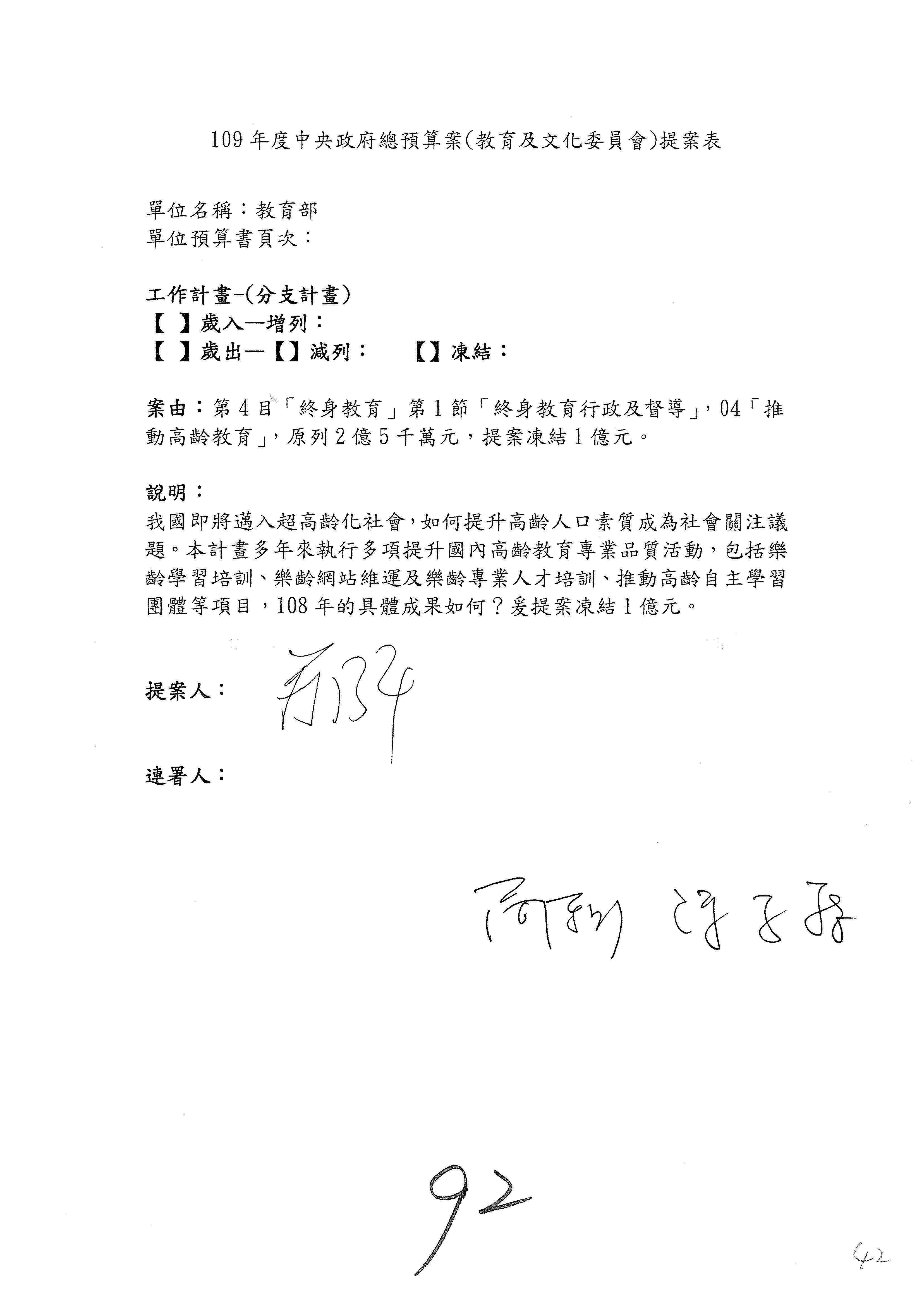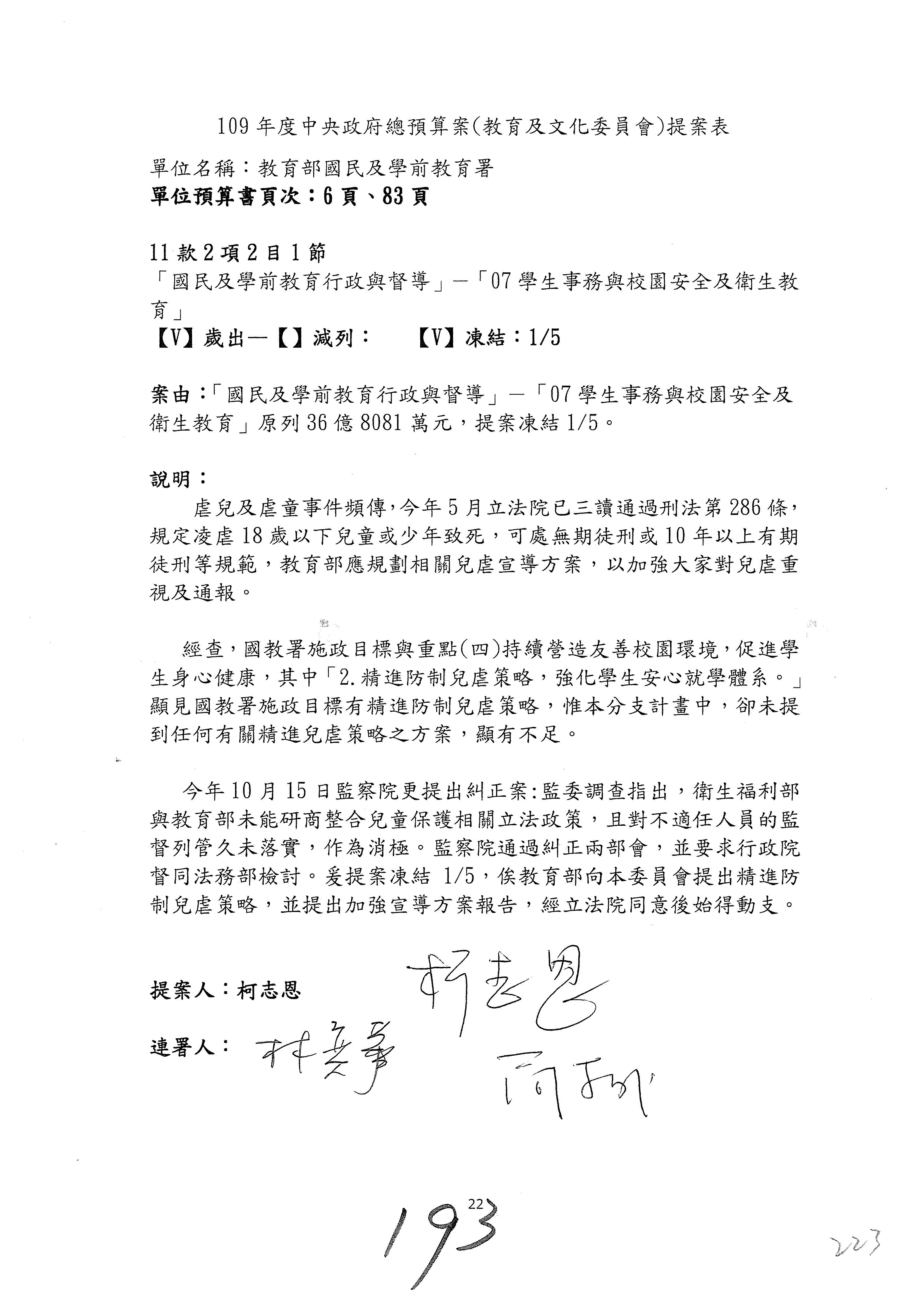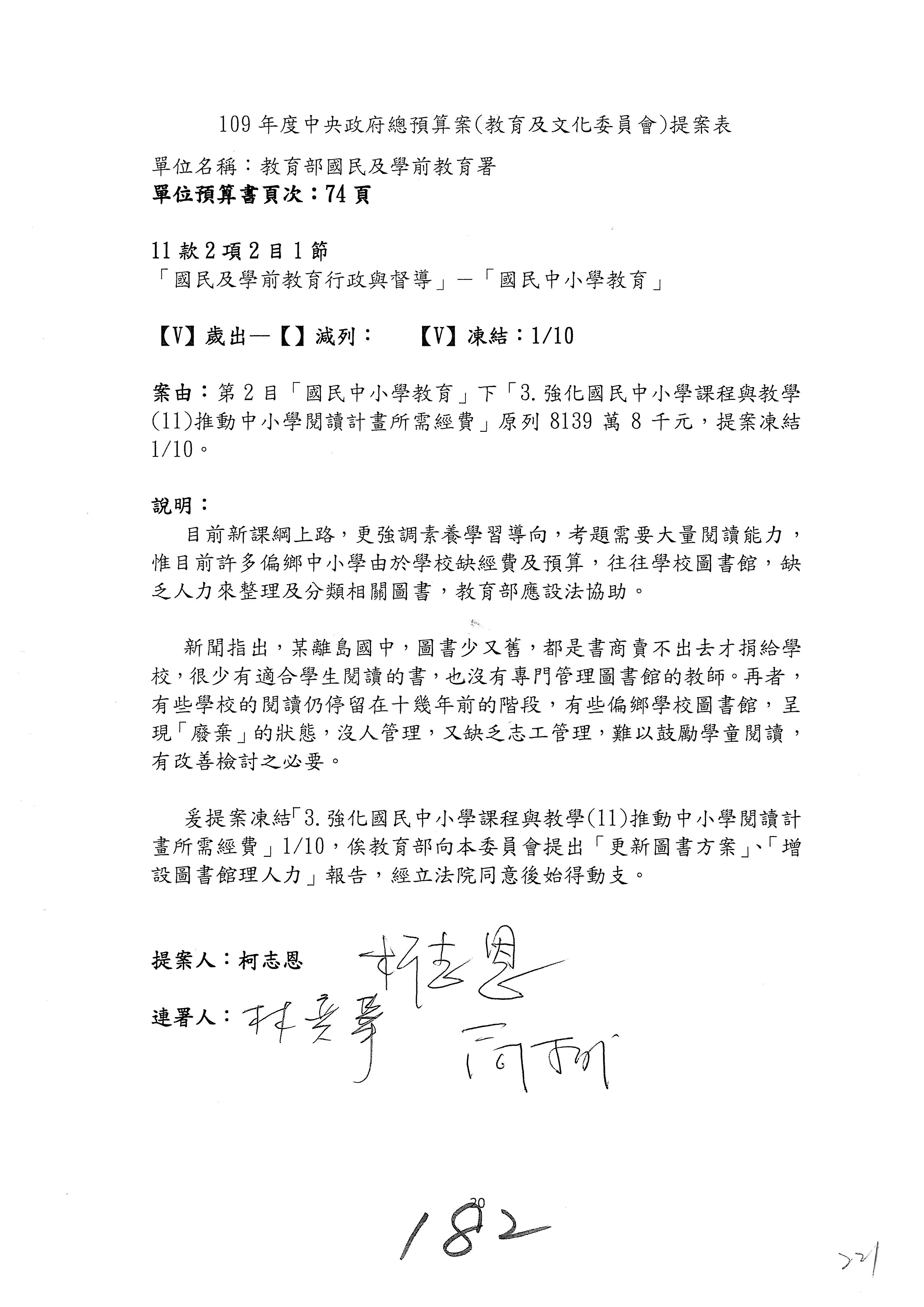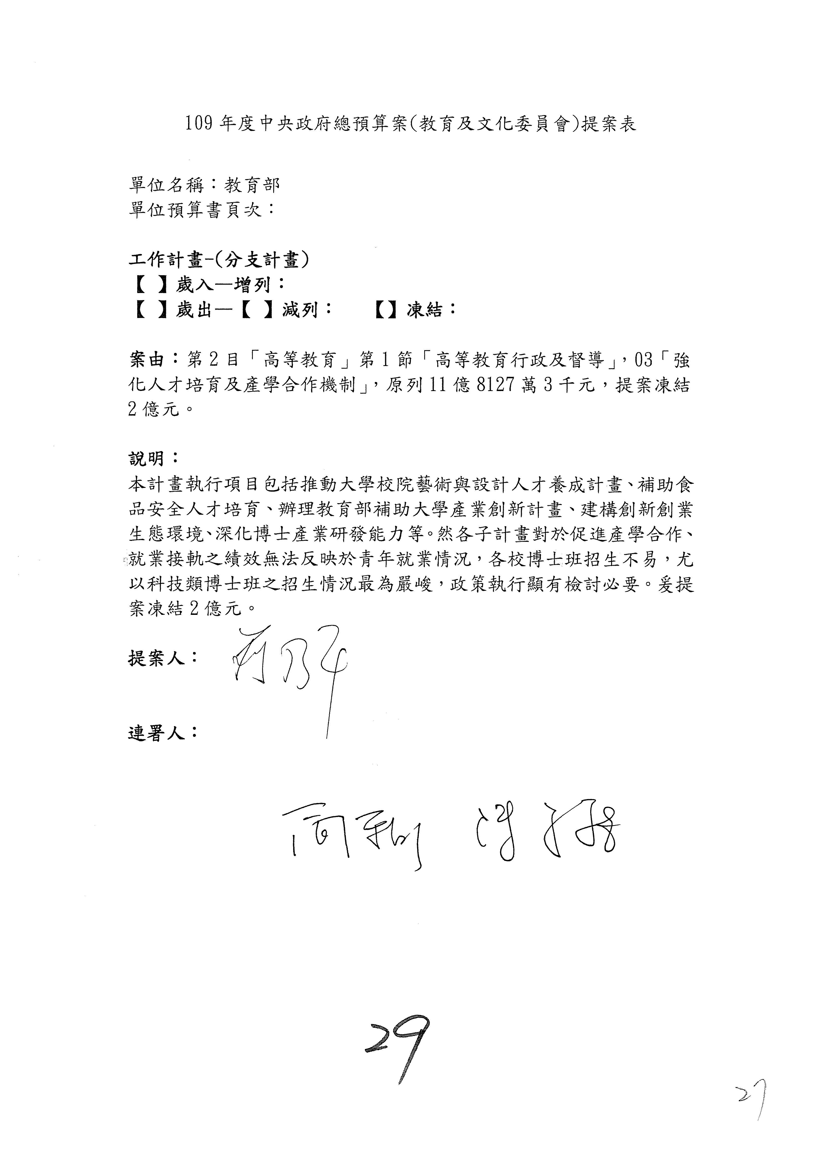 主席:現在開始進行預算案審查,請議事人員宣讀預算數及提案內容,教育部及所屬單位預算案計271案;教育部主管各非營業基金預算案計20案,並進行討論與協商。