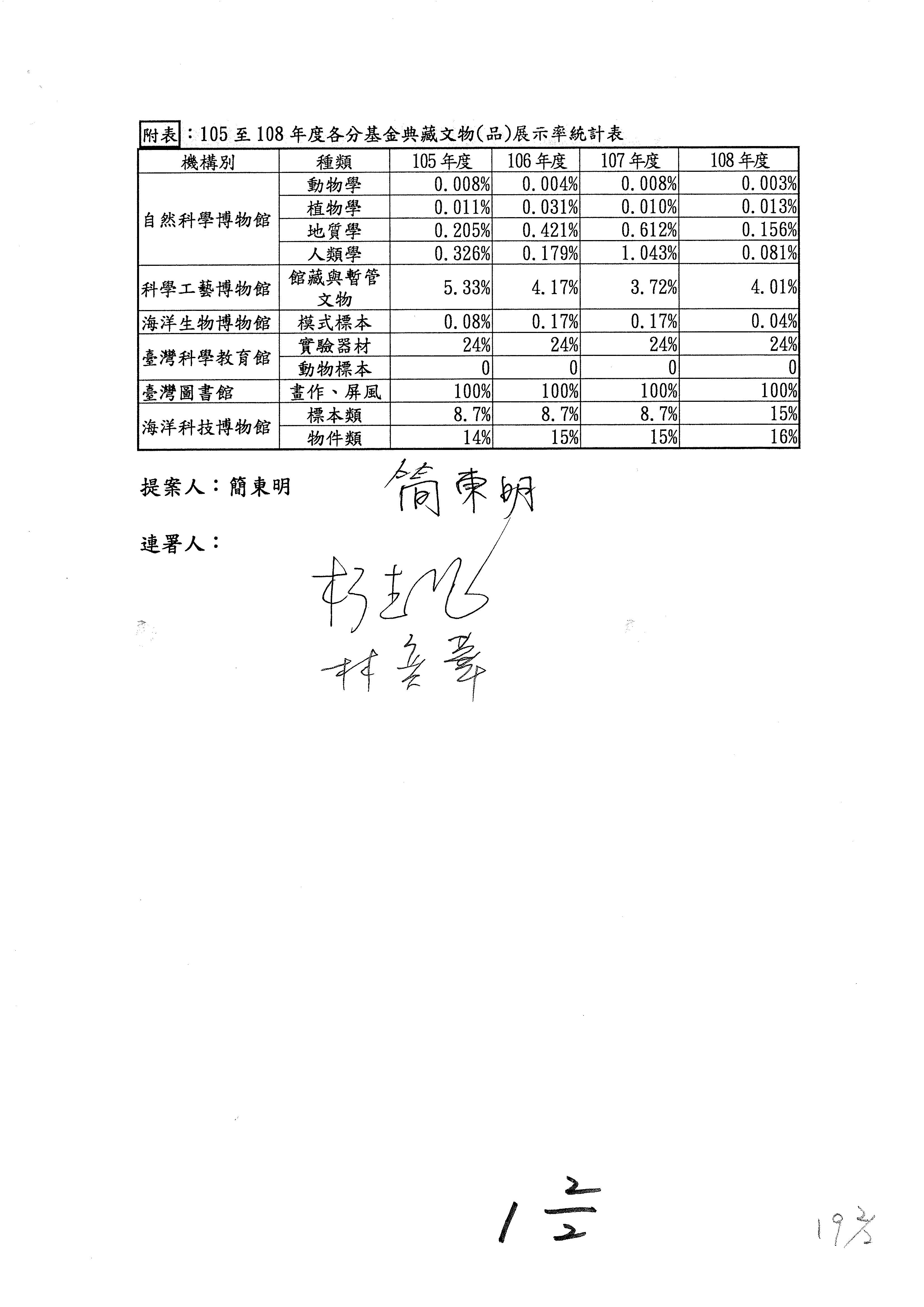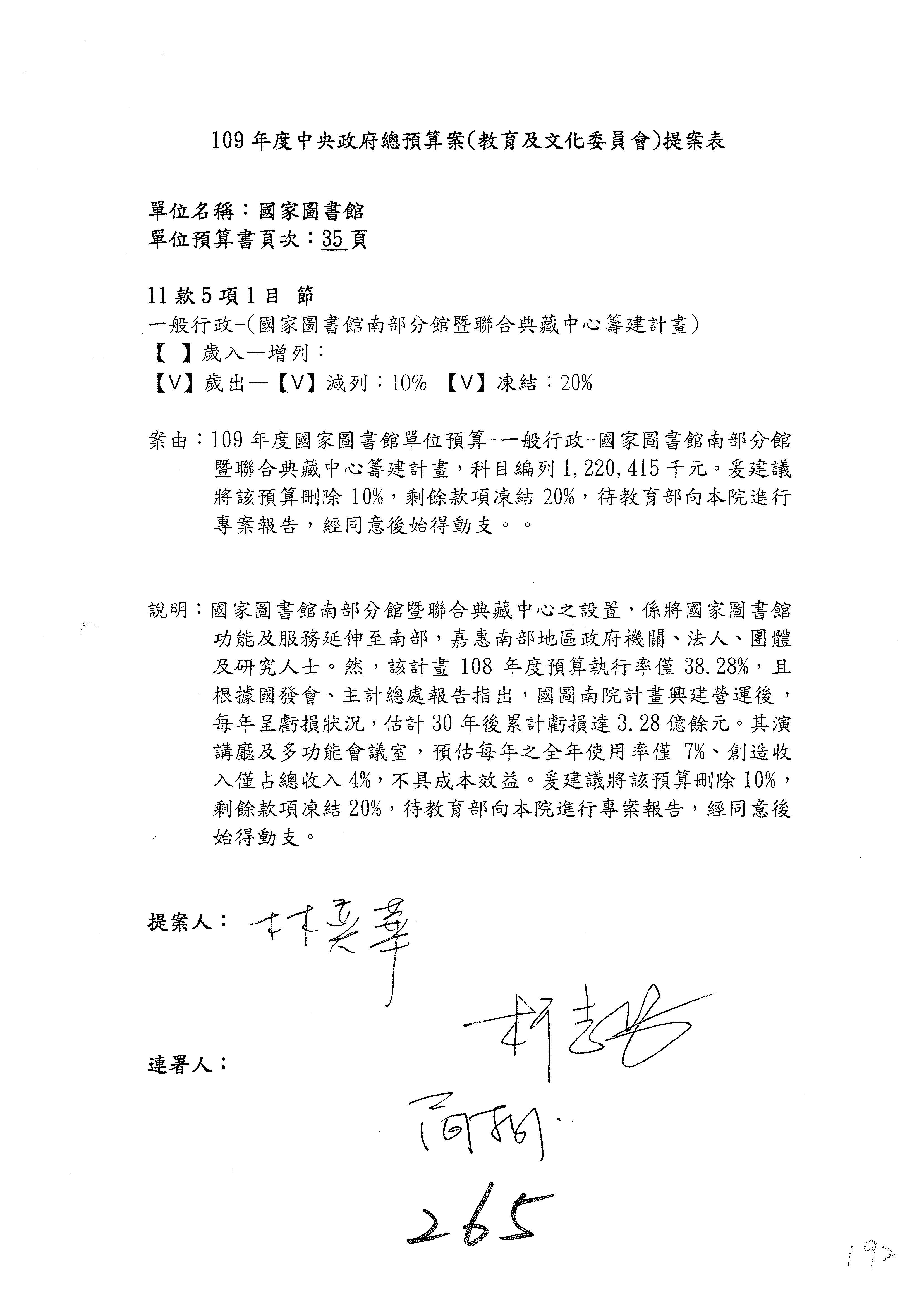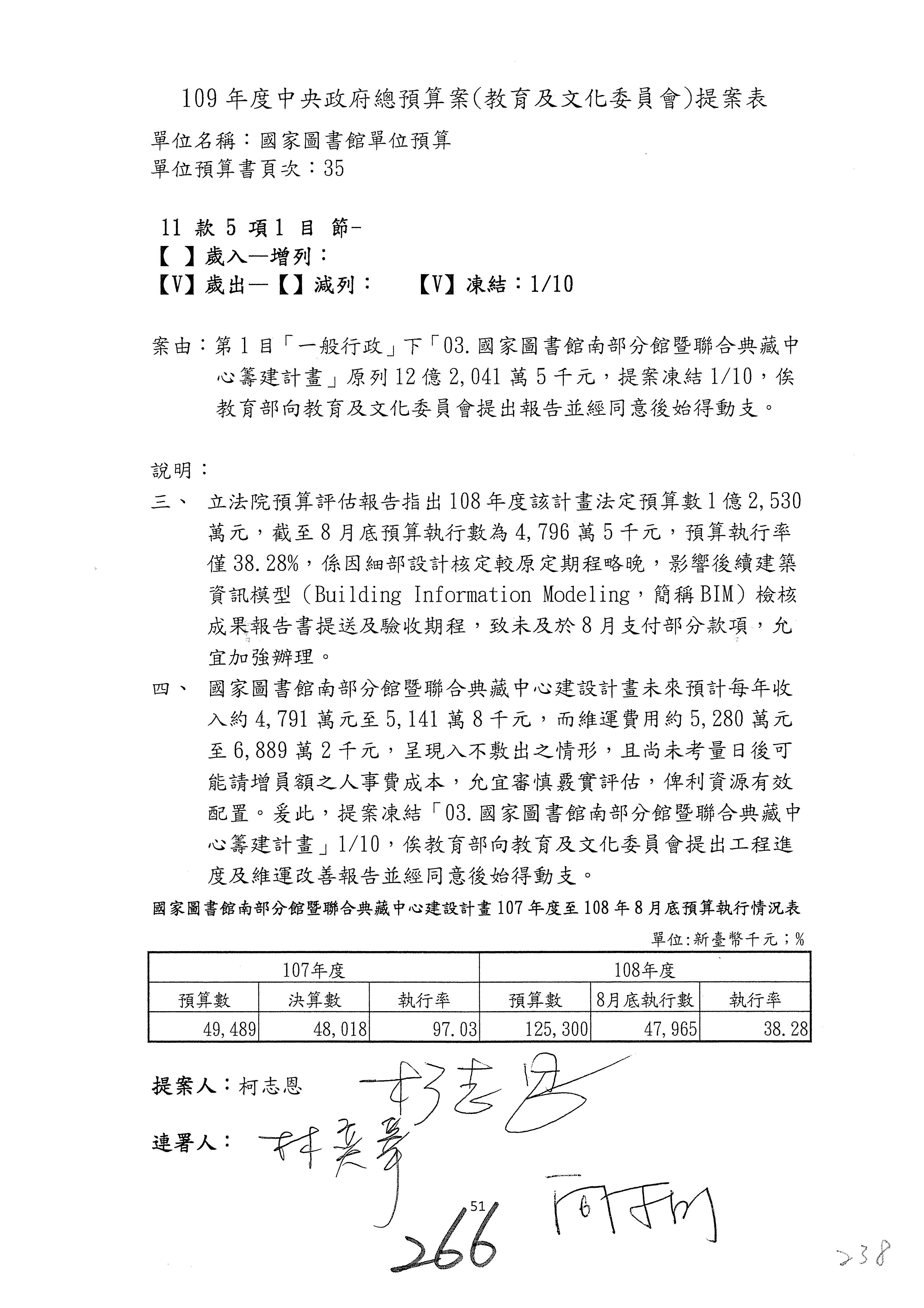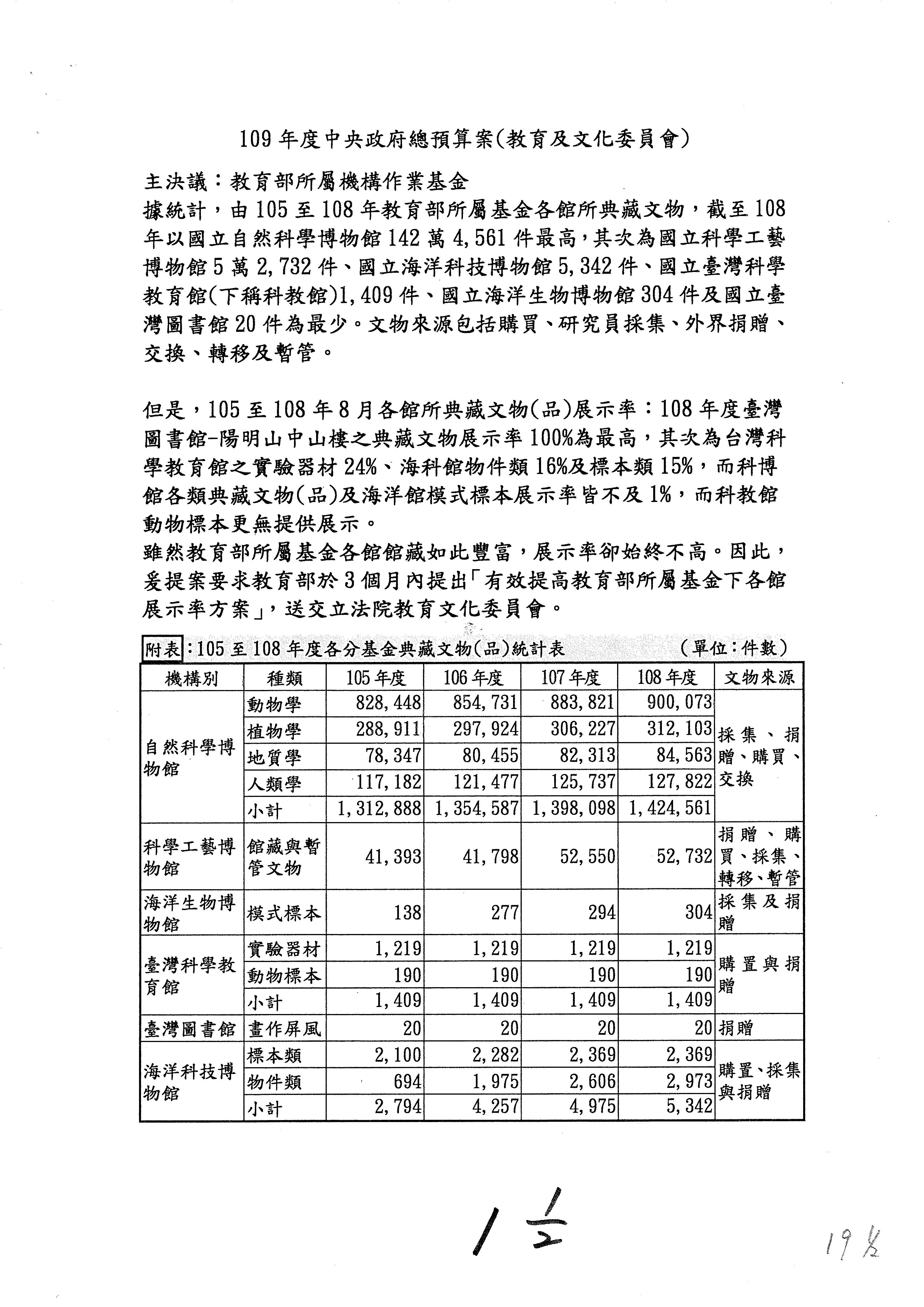一、審查109年度中央政府總預算案有關文化部及所屬單位預算案。