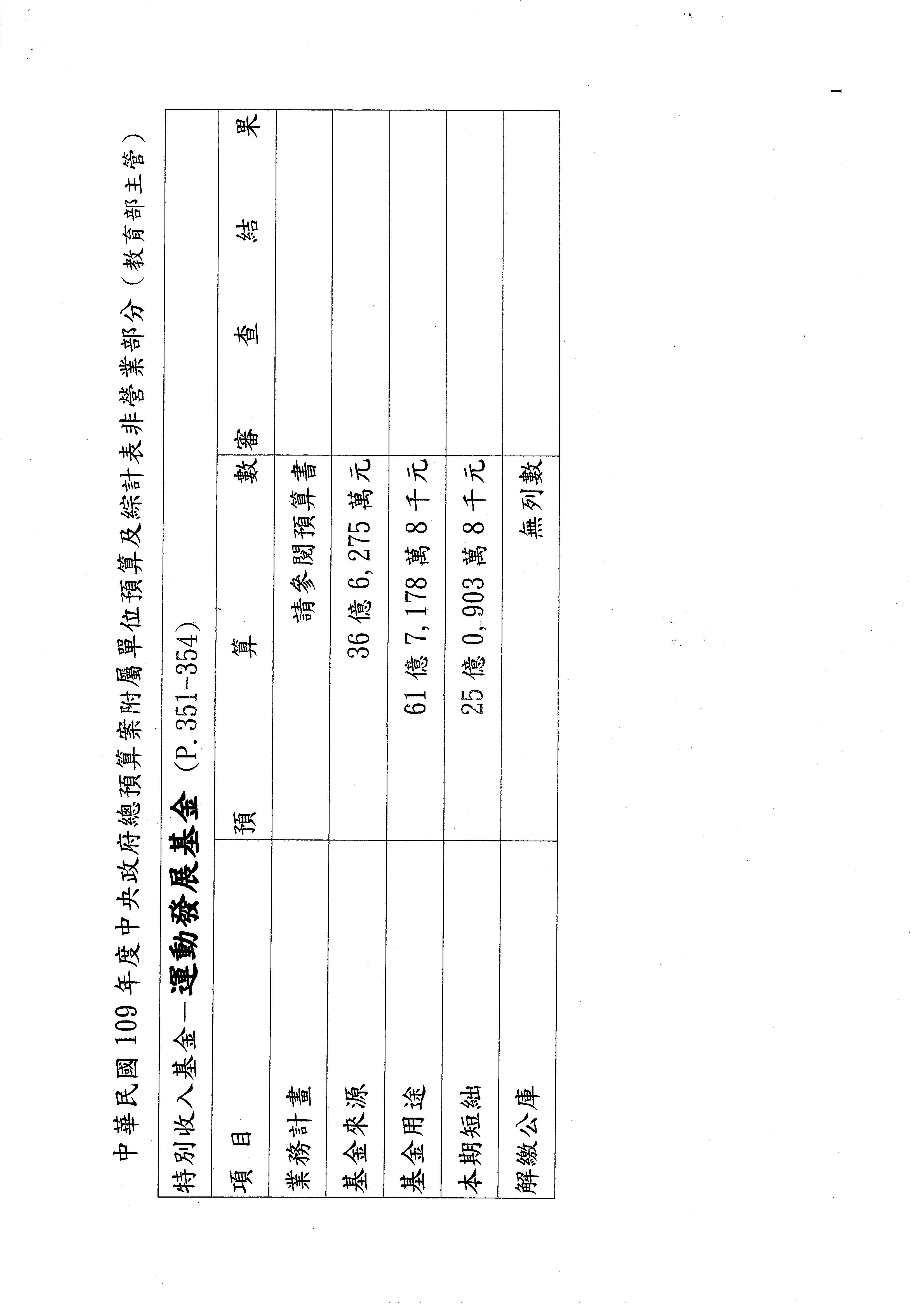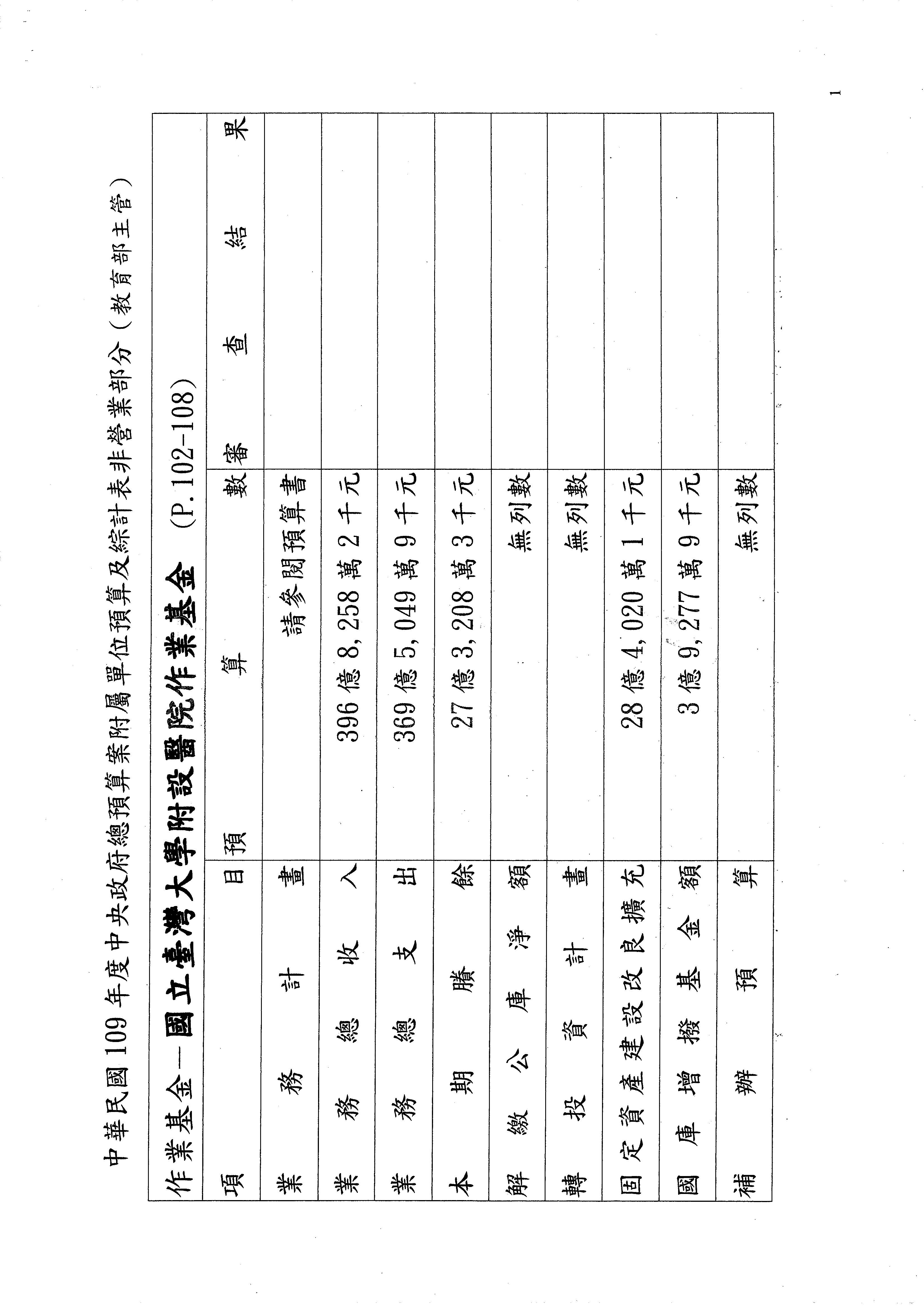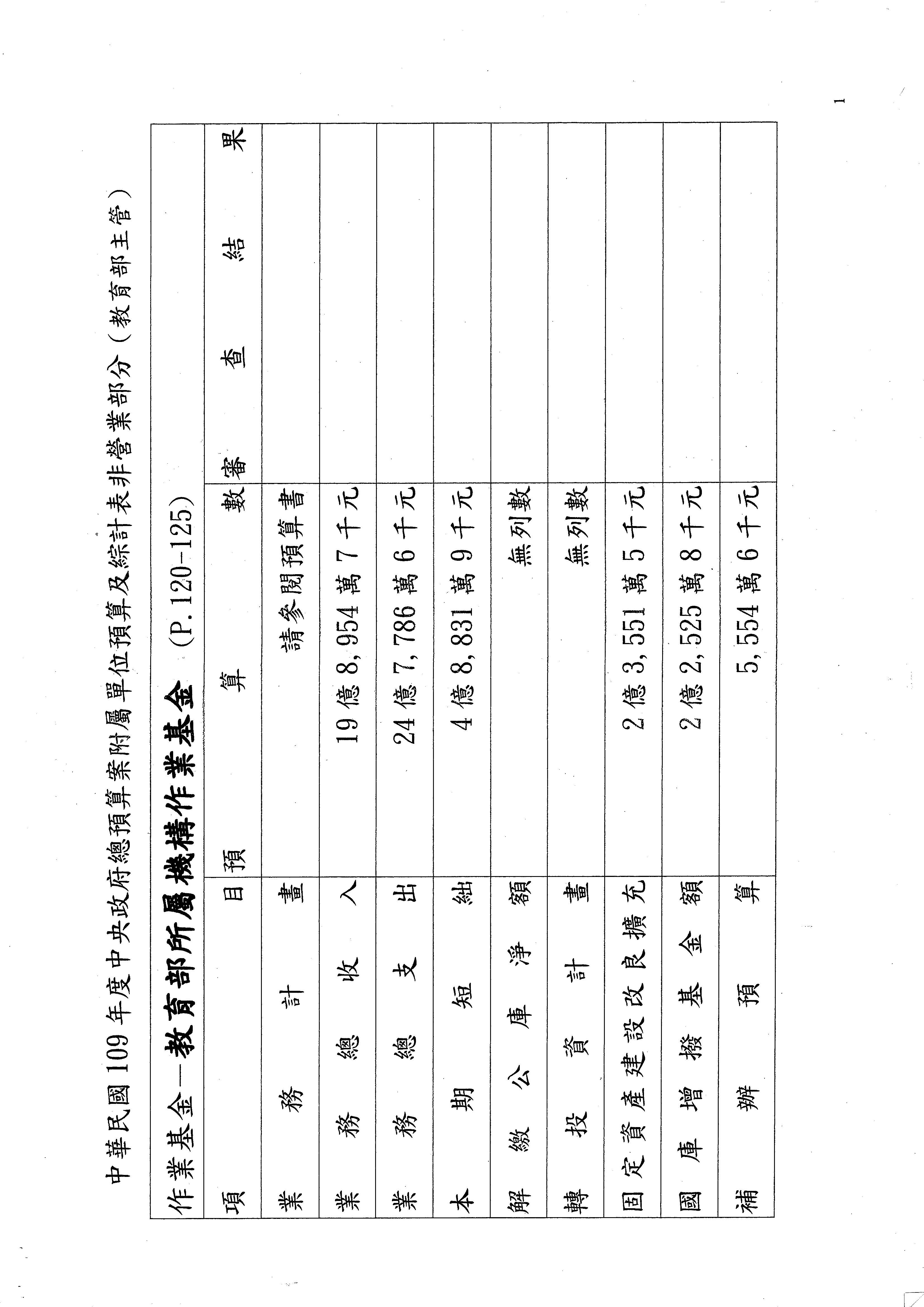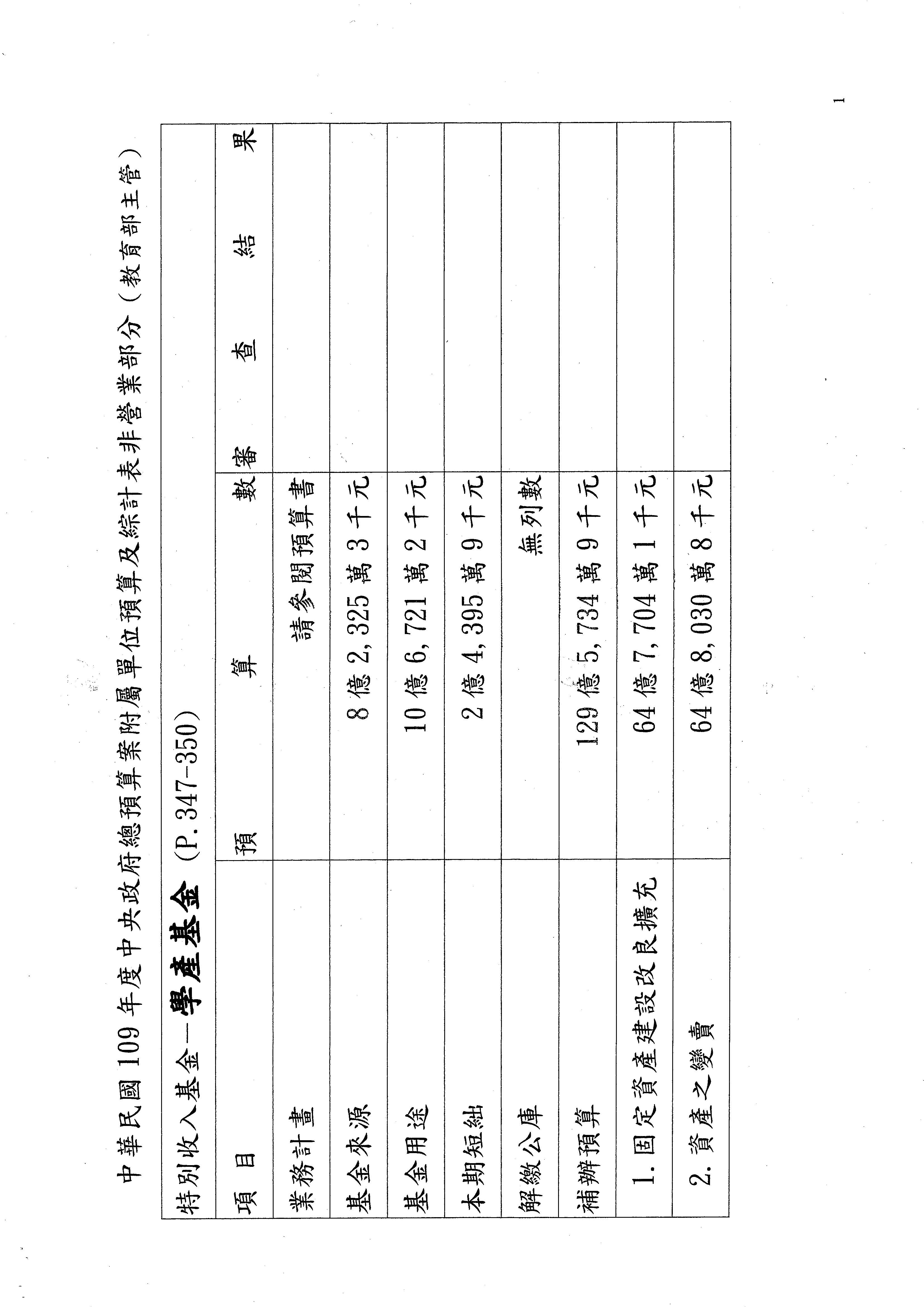 二、繼續審查109年度教育部主管48所國立大學校院校務基金、國立臺灣大學附設醫院作業基金、國立成功大學附設醫院作業基金、國立陽明大學附設醫院作業基金、教育部所屬機構作業基金、國立高級中等學校校務基金、學產基金、運動發展基金、大專校院轉型及退場基金。