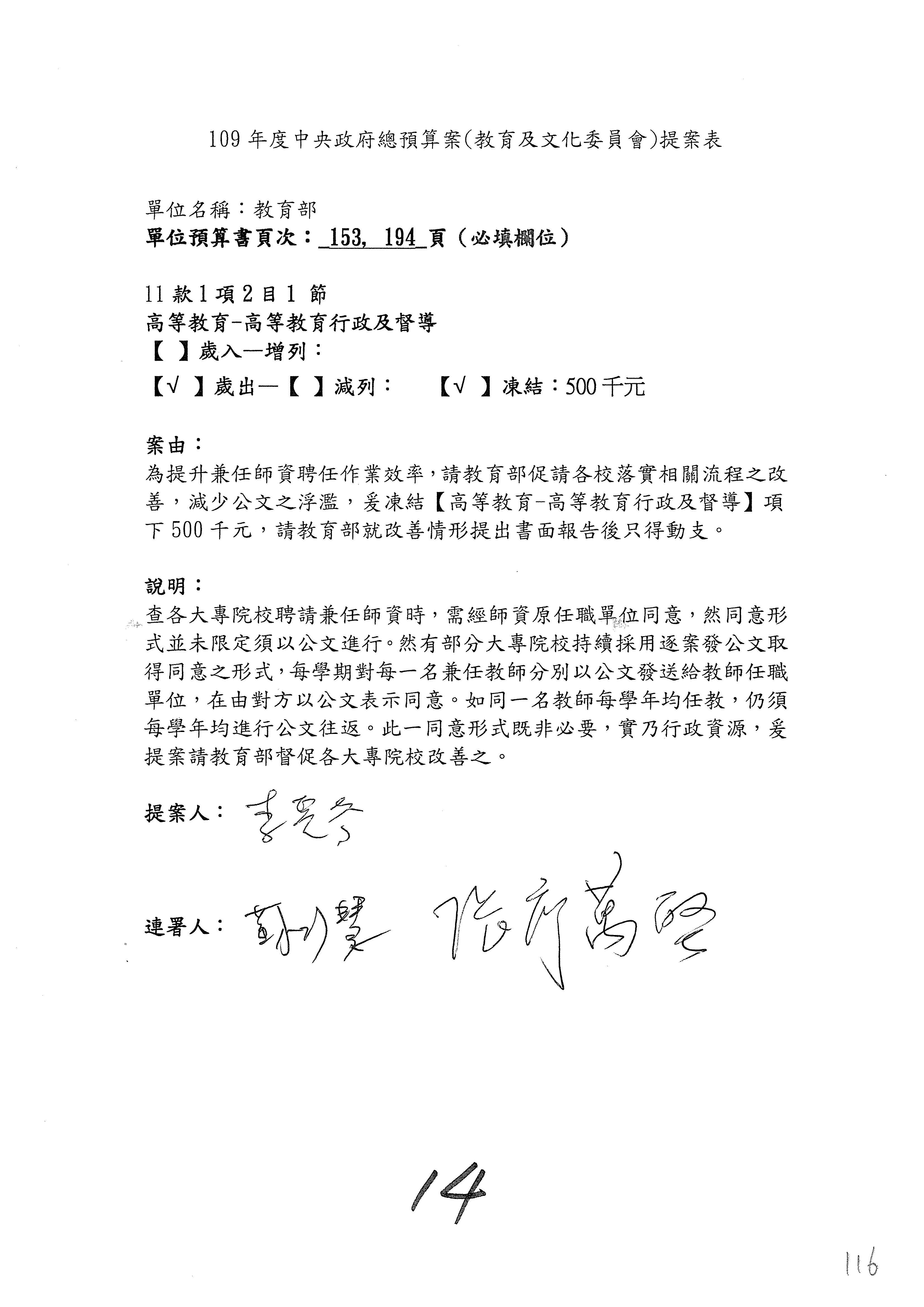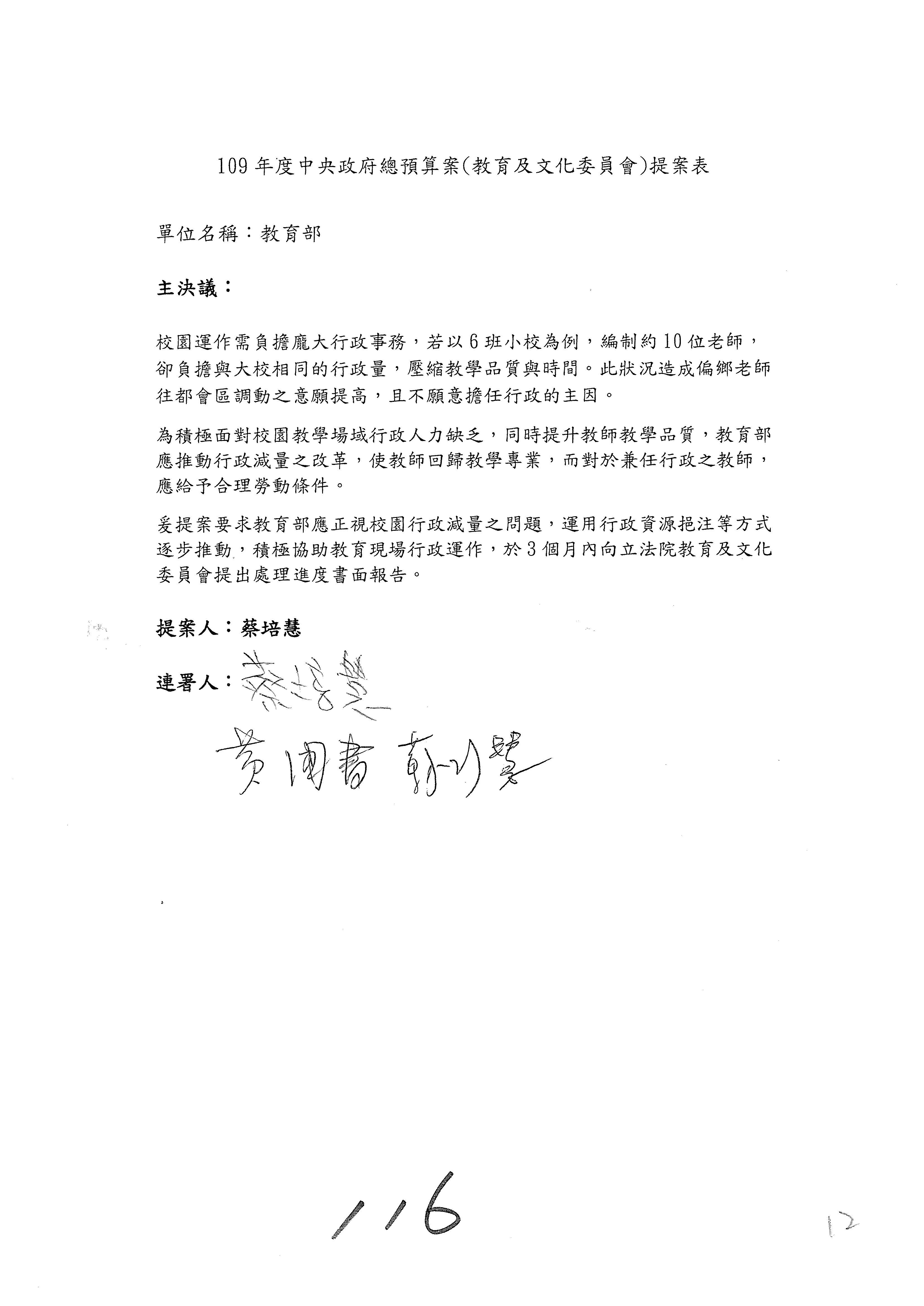 處理第116案。部長回答嗎?好,第116案配合辦理?