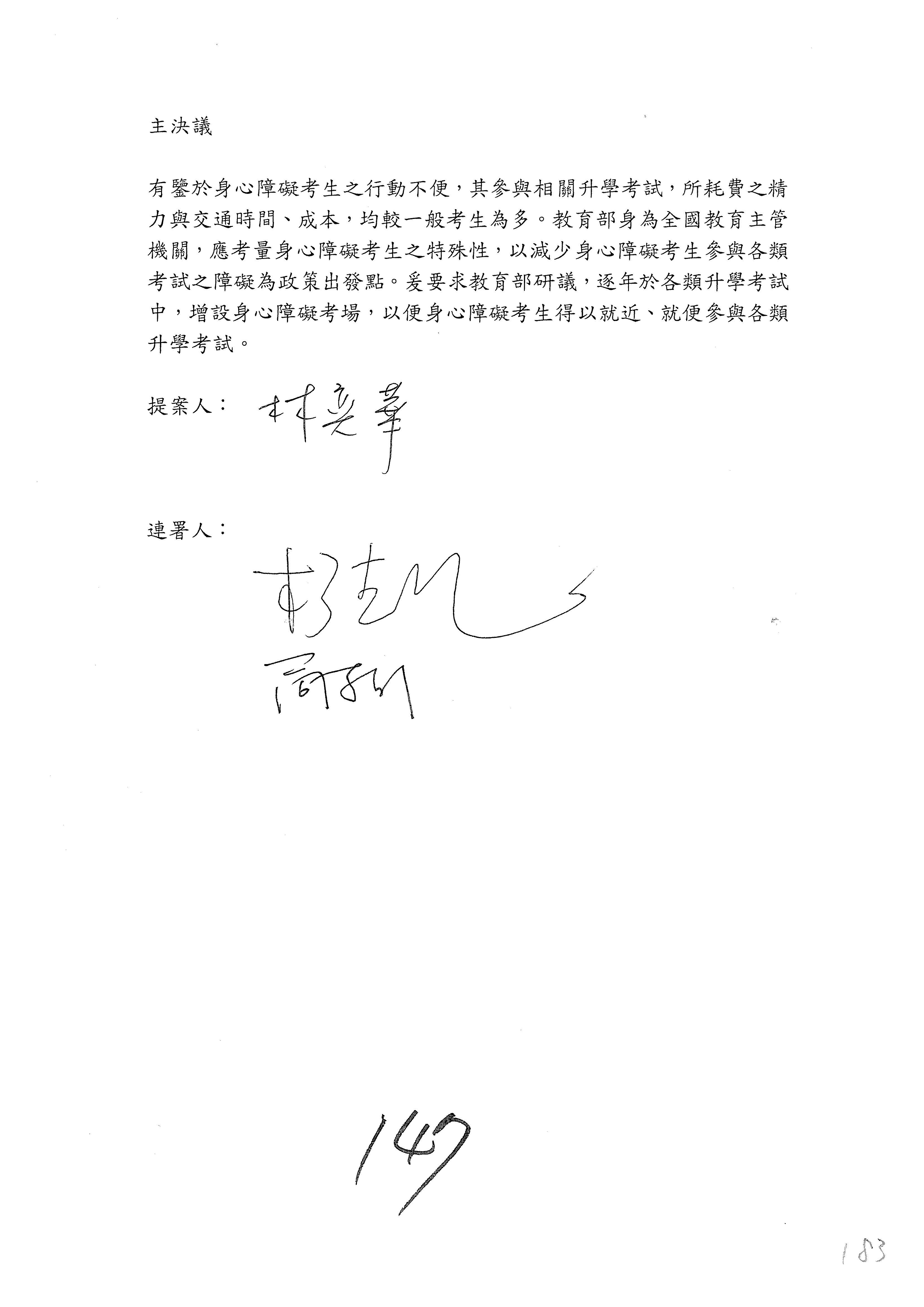 潘部長文忠:有文字修正,主決議倒數第3行的「爰要求教育研議,逐年」建議刪除,改為「除」,並建議刪除「增設身心障礙考場……參與名額升學考試。」,修正為「除於各類升學考試中,依身心障礙考生需求提供考試服務,請教育部研議對參加身障甄試之考生提供交通協助或考前住宿補助,俾利其便於參加考試。」。