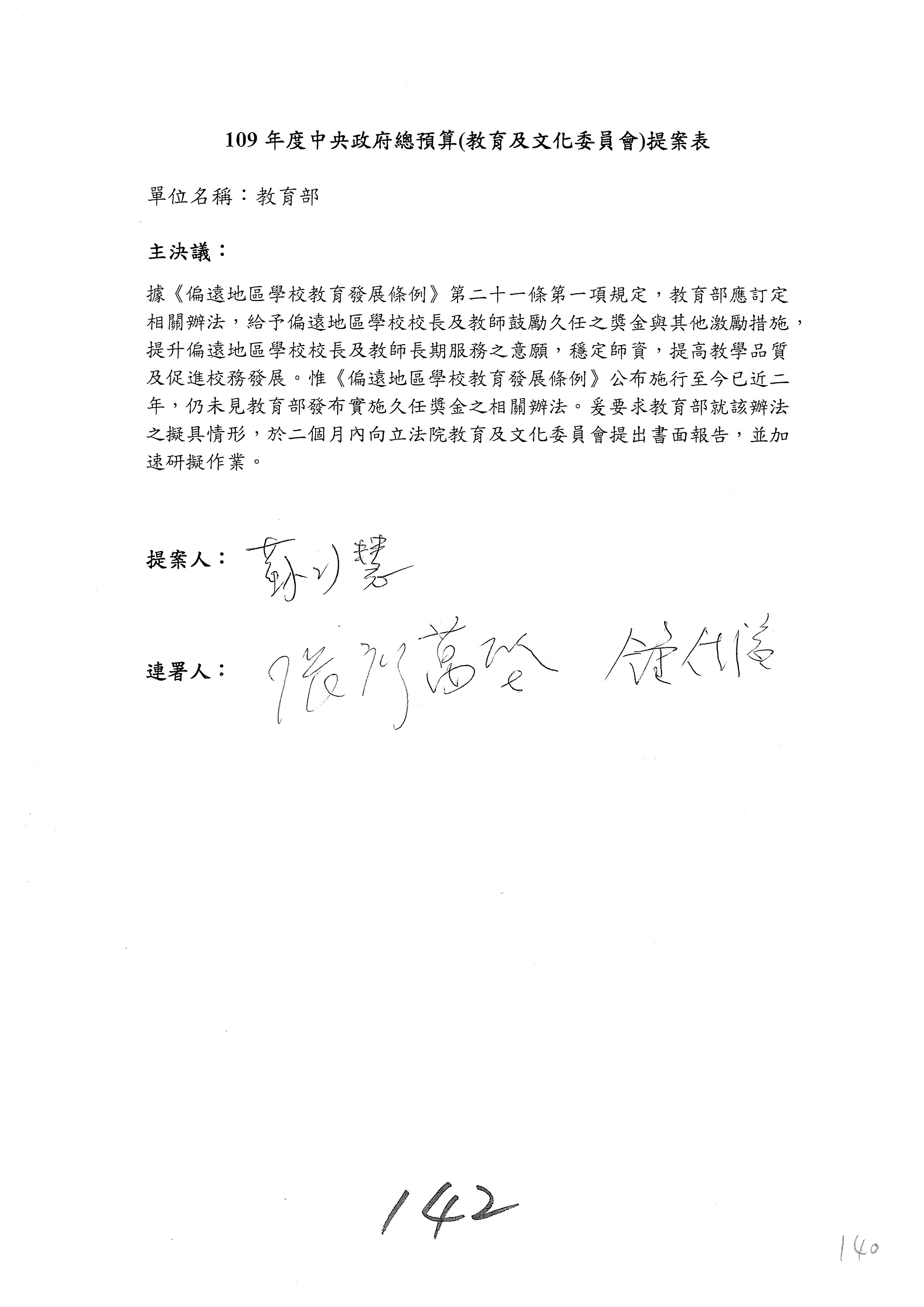 潘部長文忠:有文字修正,提案第2段第2行第2個逗點刪除;之後「教育部應針對凡遇聘任教師困難之學校,全面協助校方比照……」建議修正為「教育部應研議提供誘因,鼓勵偏遠地區學校採……」;另建議刪除倒數第4行的「提供12個薪資……提高教師留職誘因」,以上做文字修正建議。