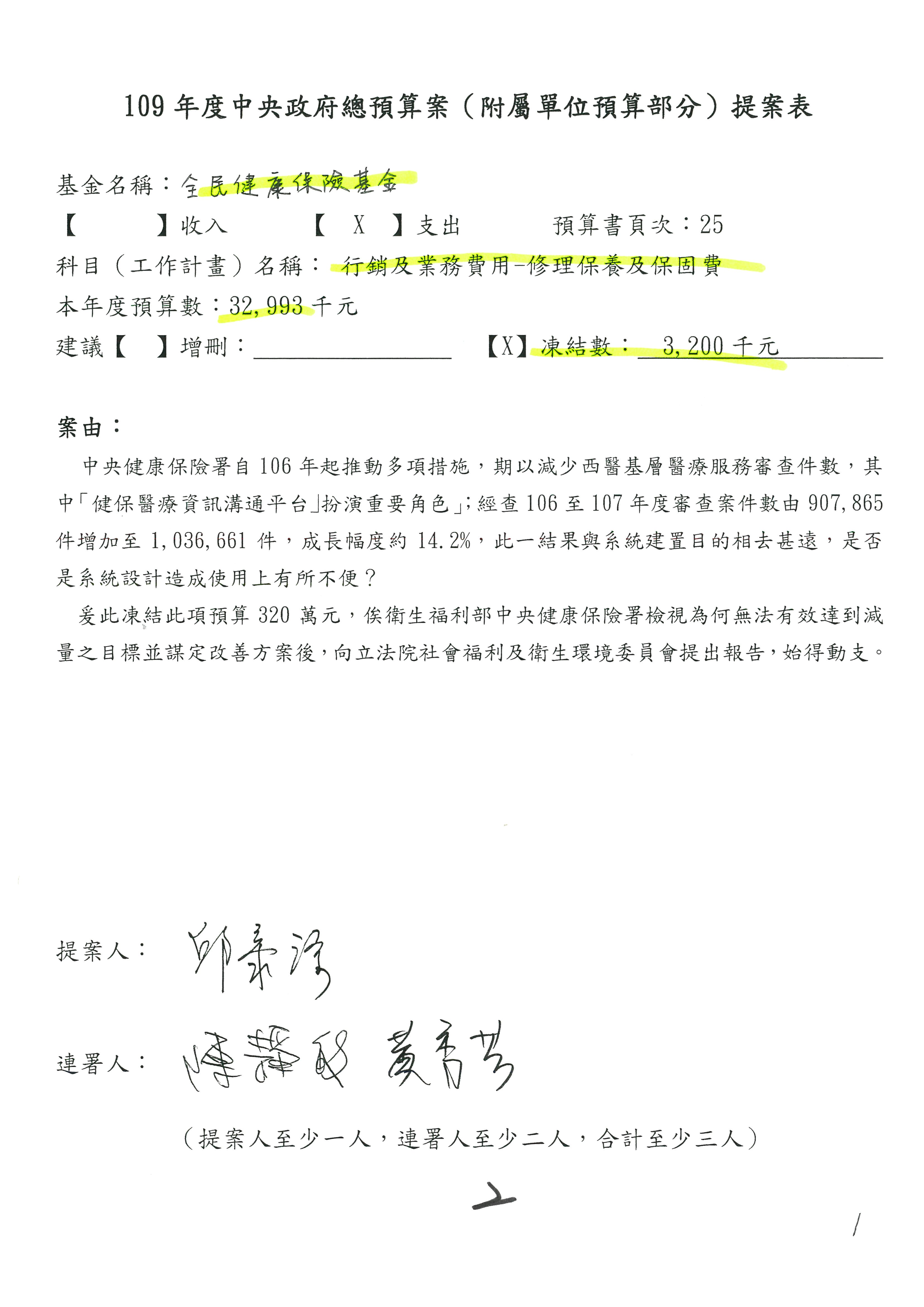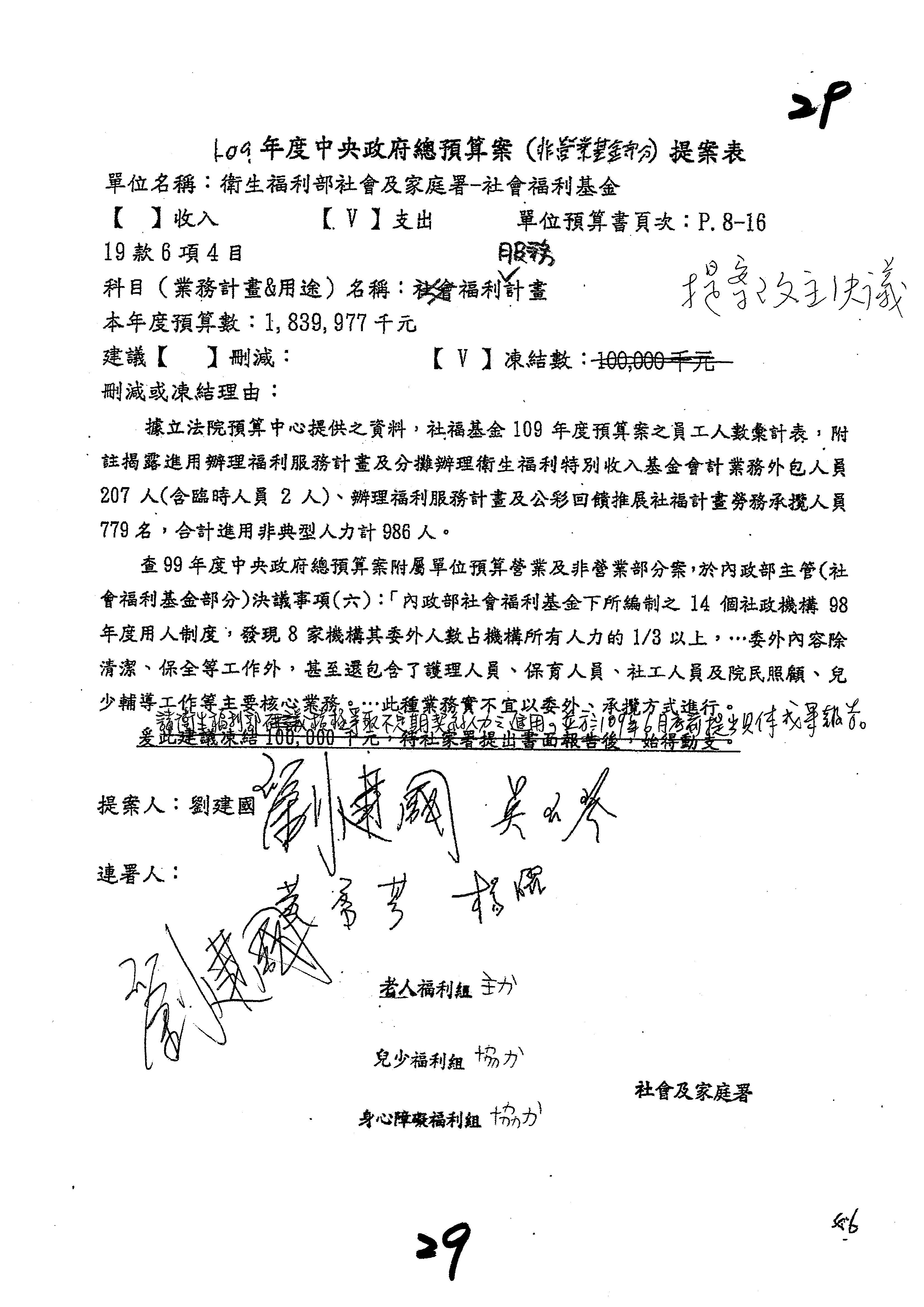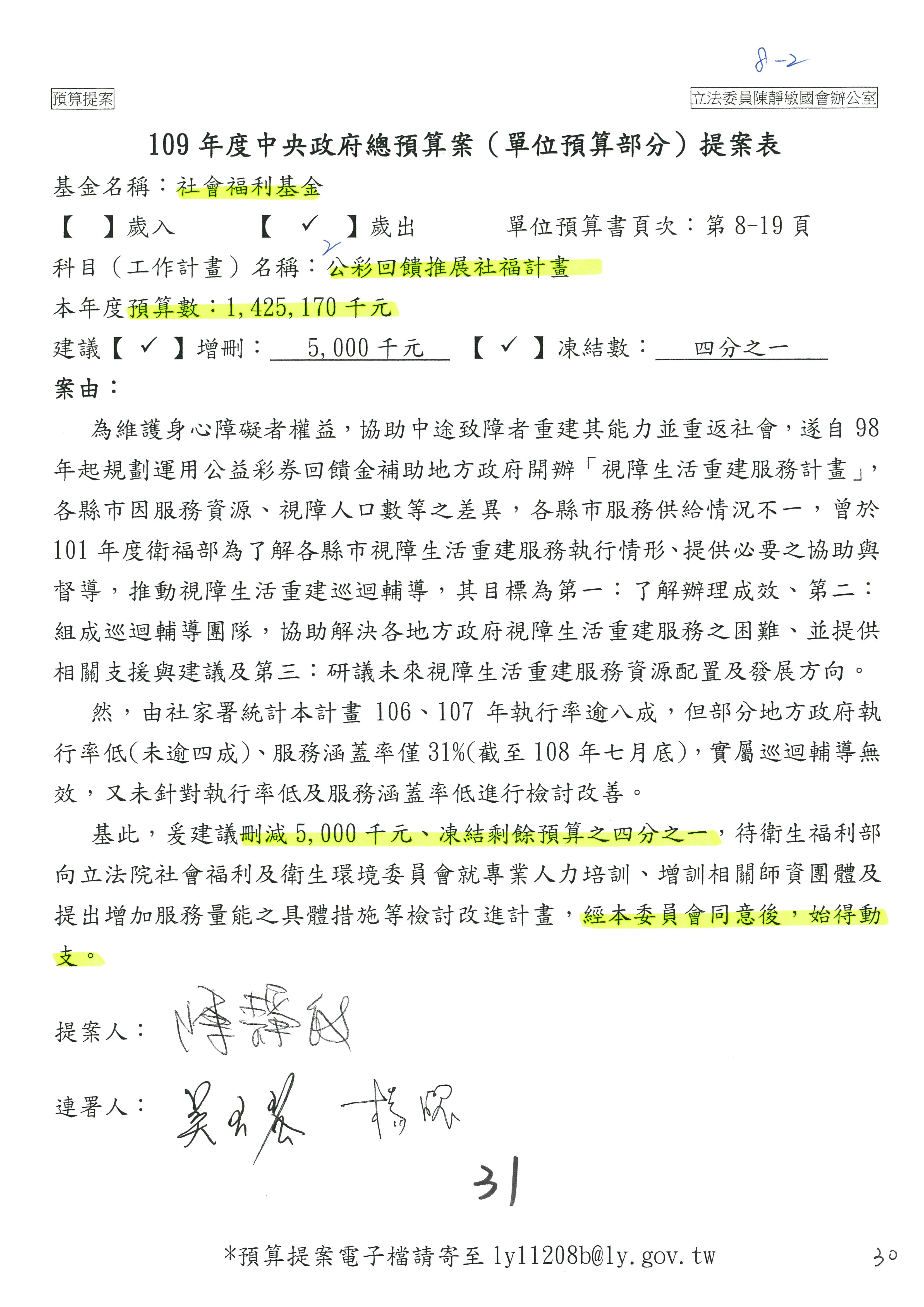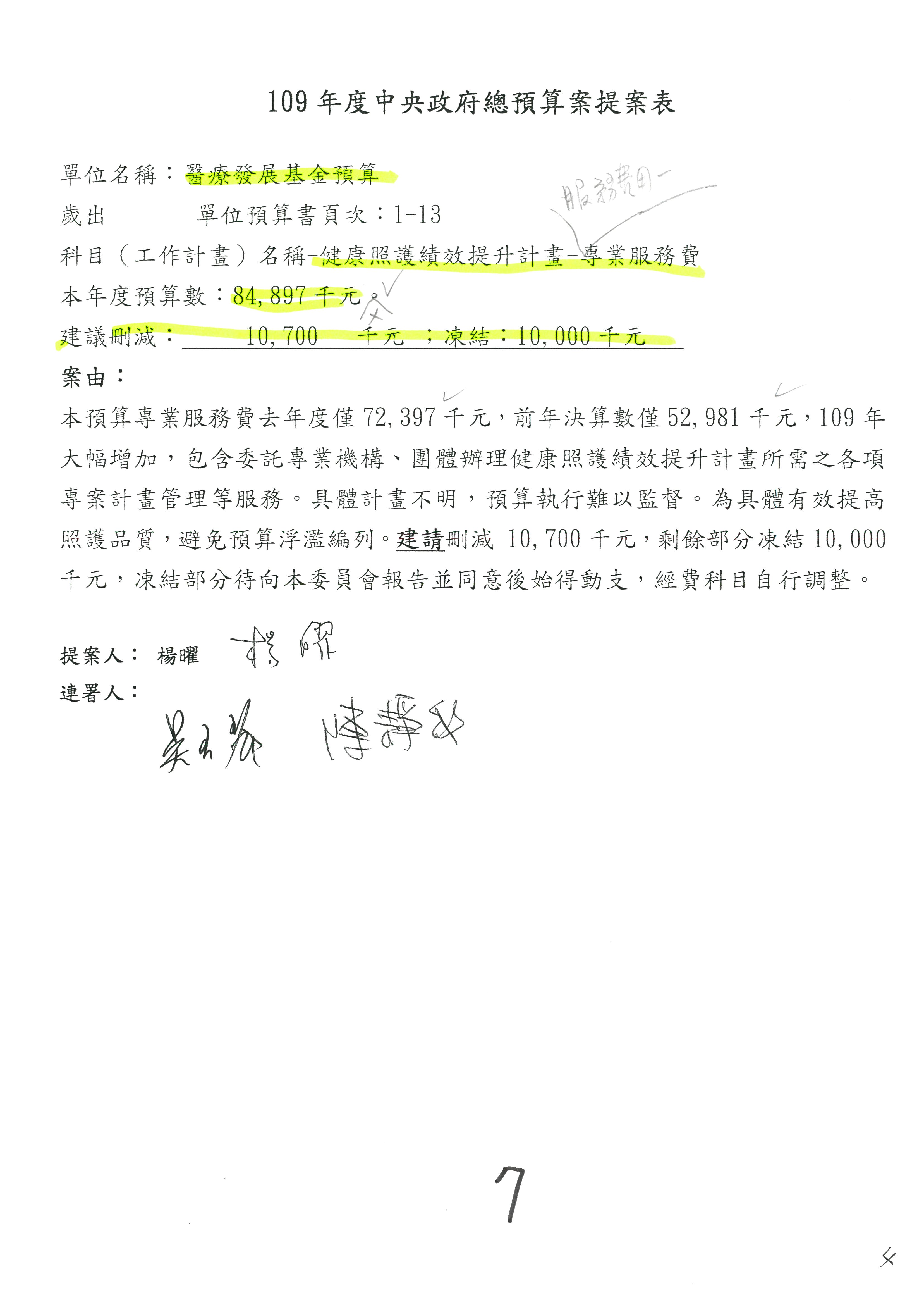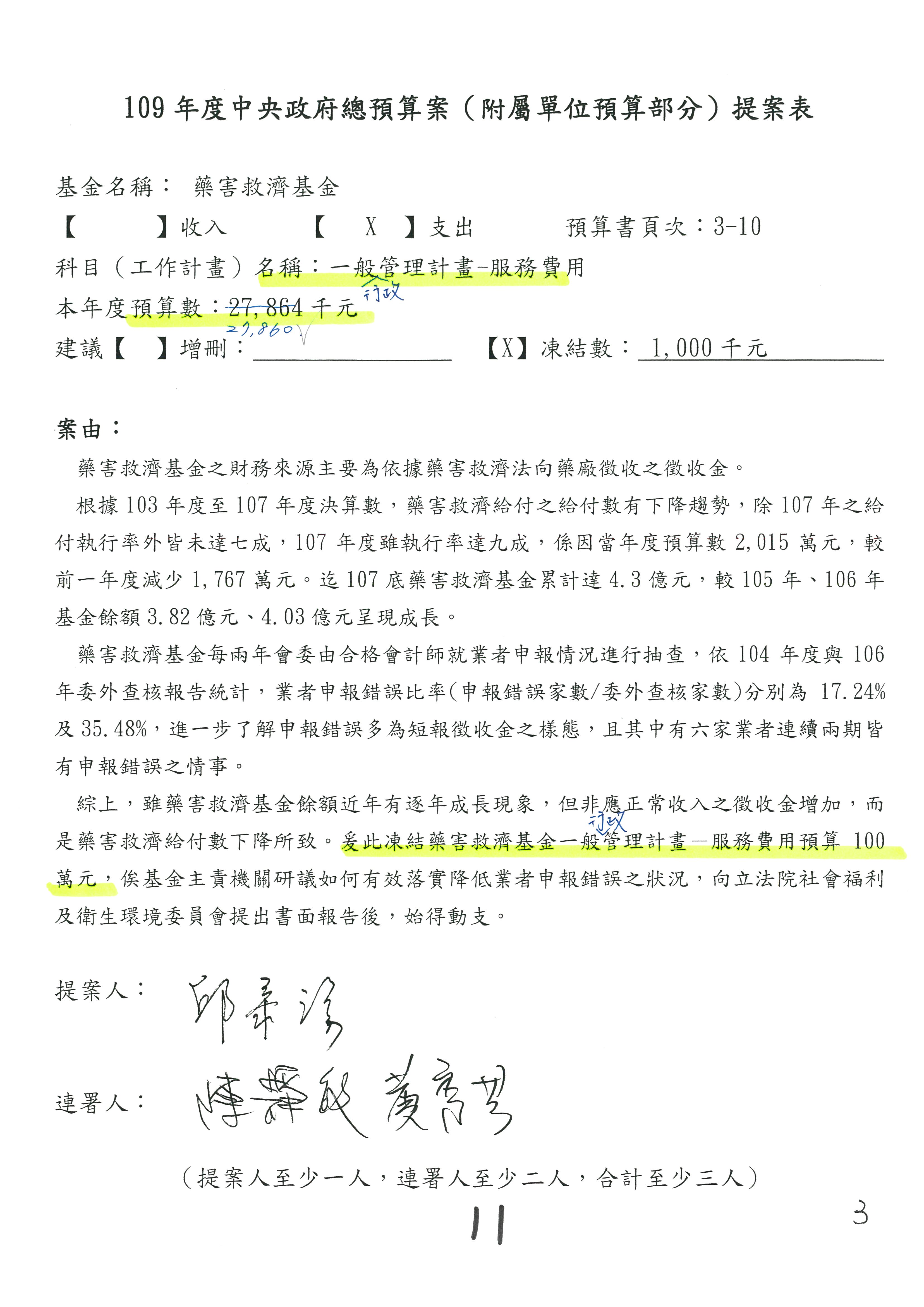祝司長健芳:陳委員已經簽字,同意減列300萬元、凍結100萬元。