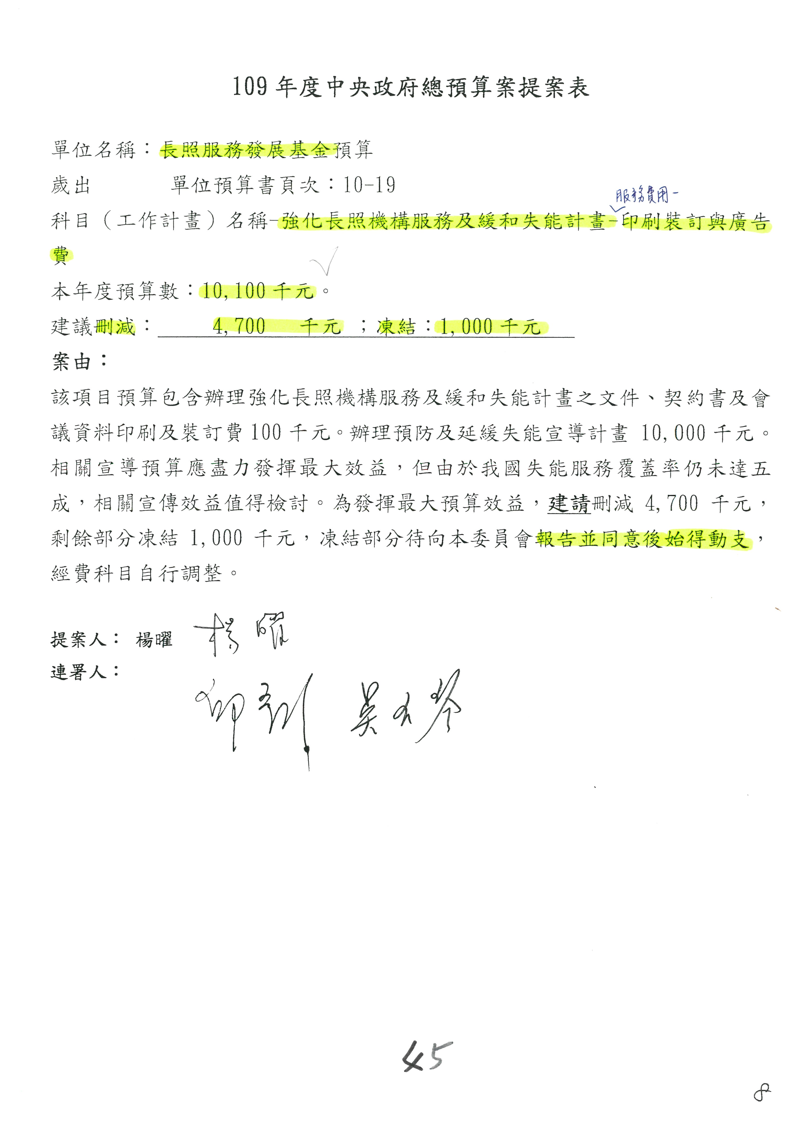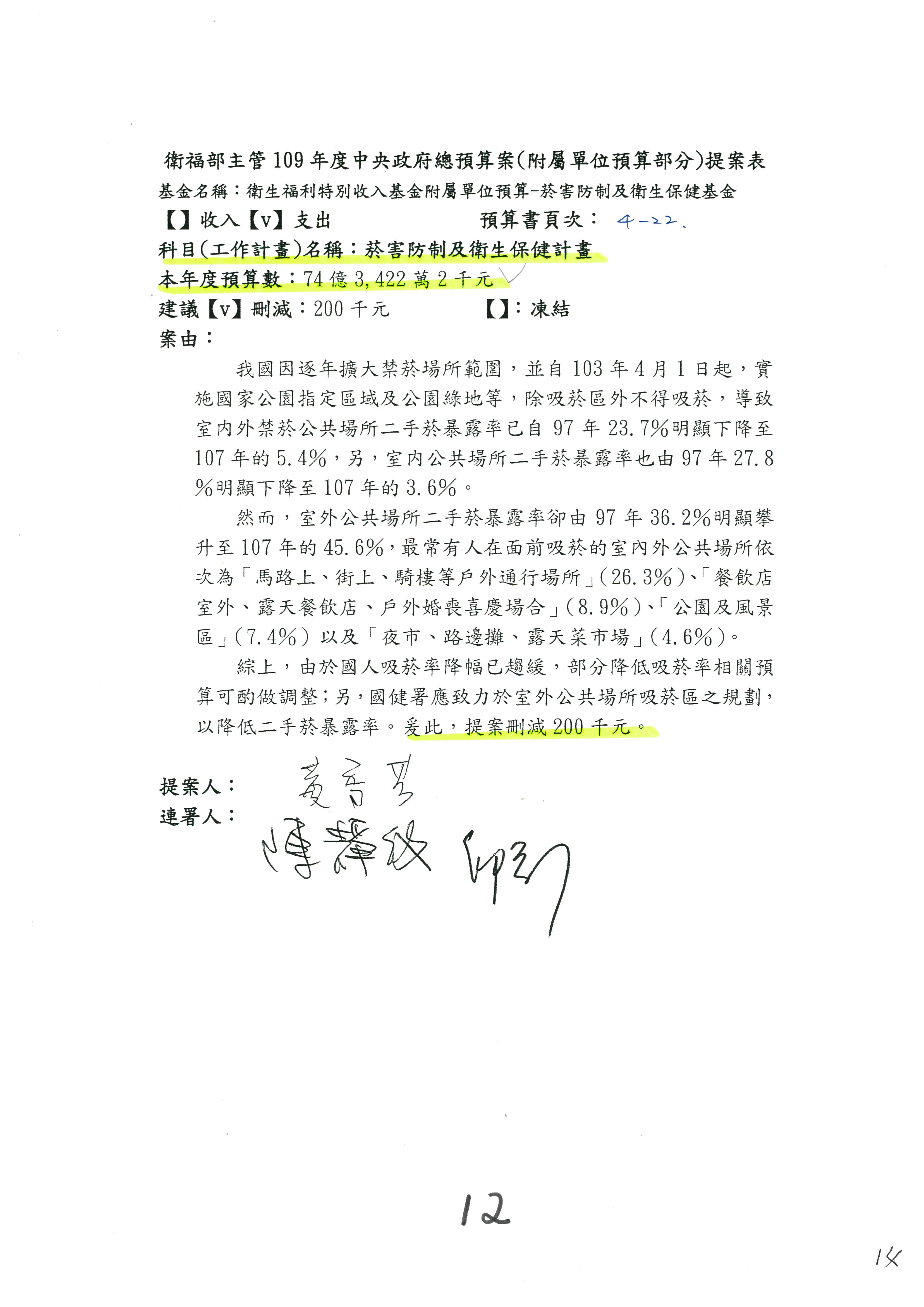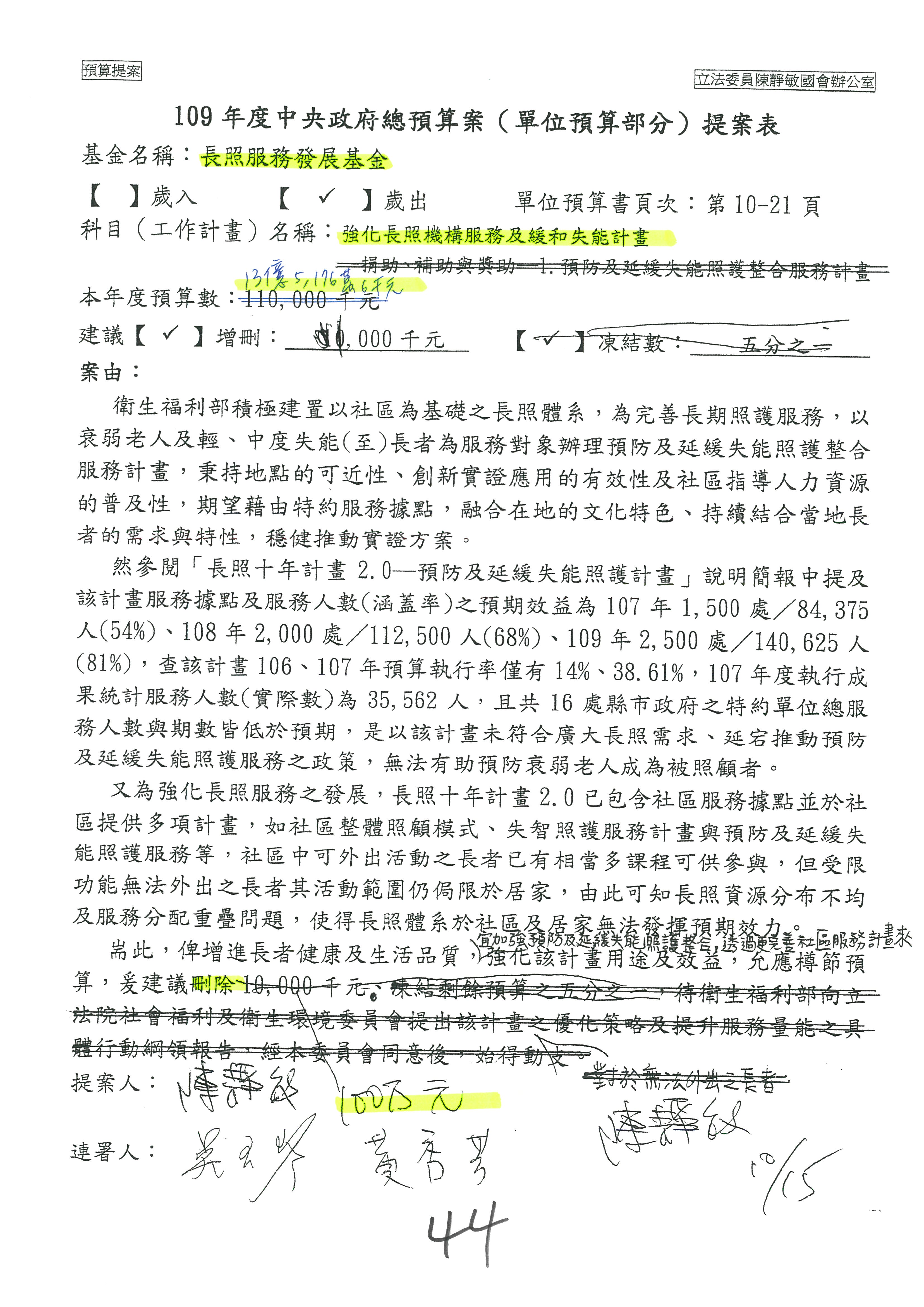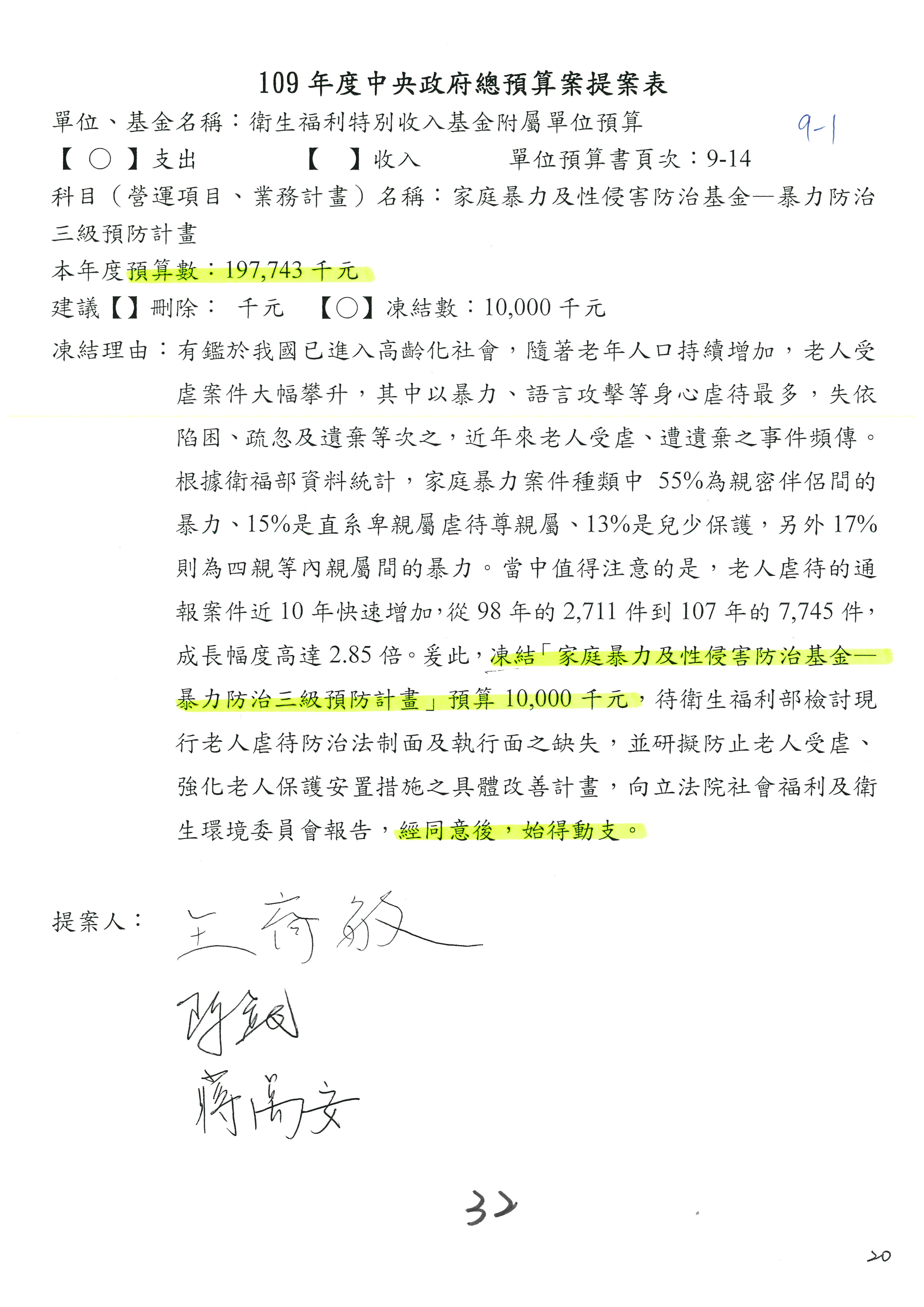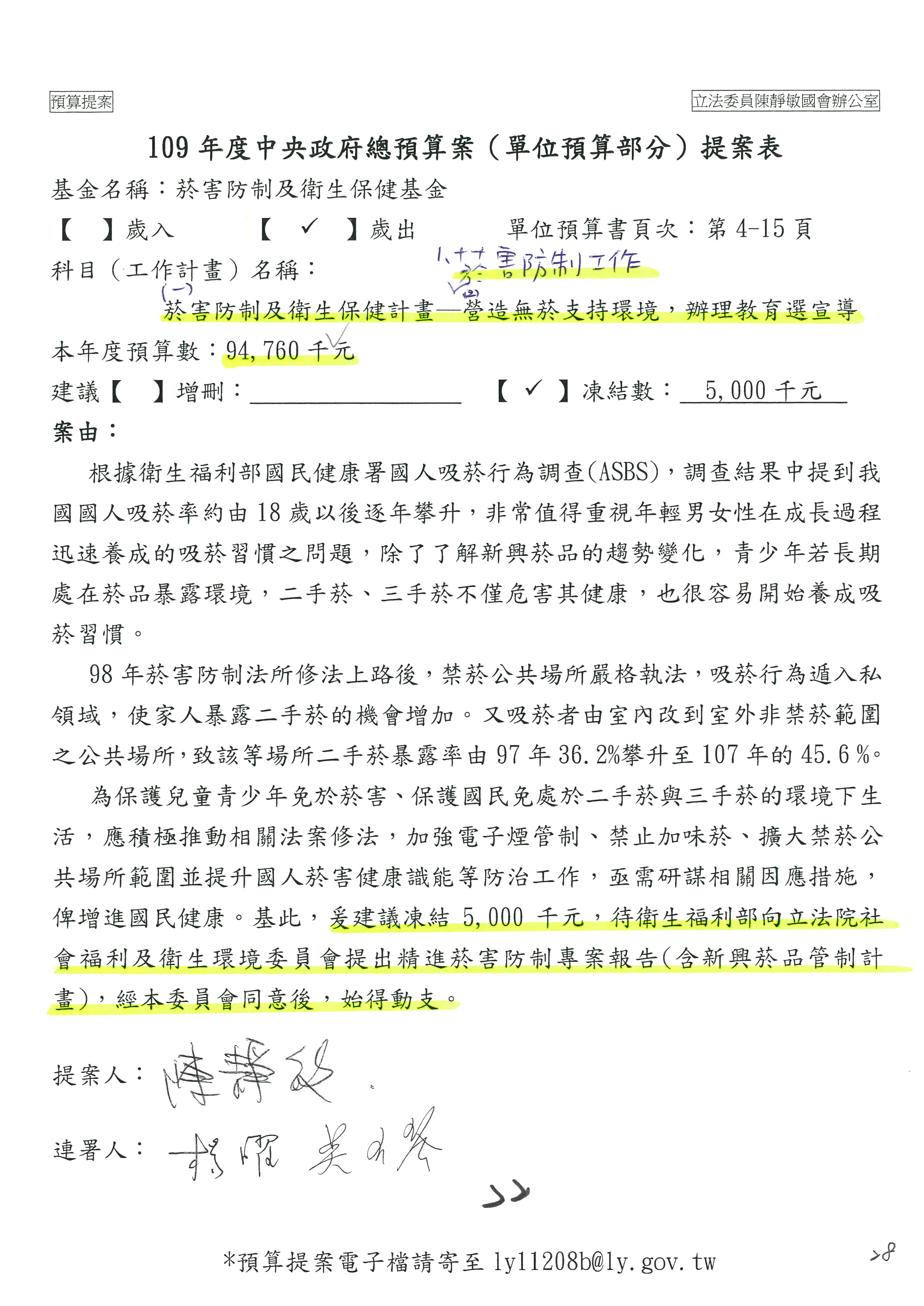 祝司長健芳:陳委員已經簽字,同意減列300萬元、凍結100萬元。