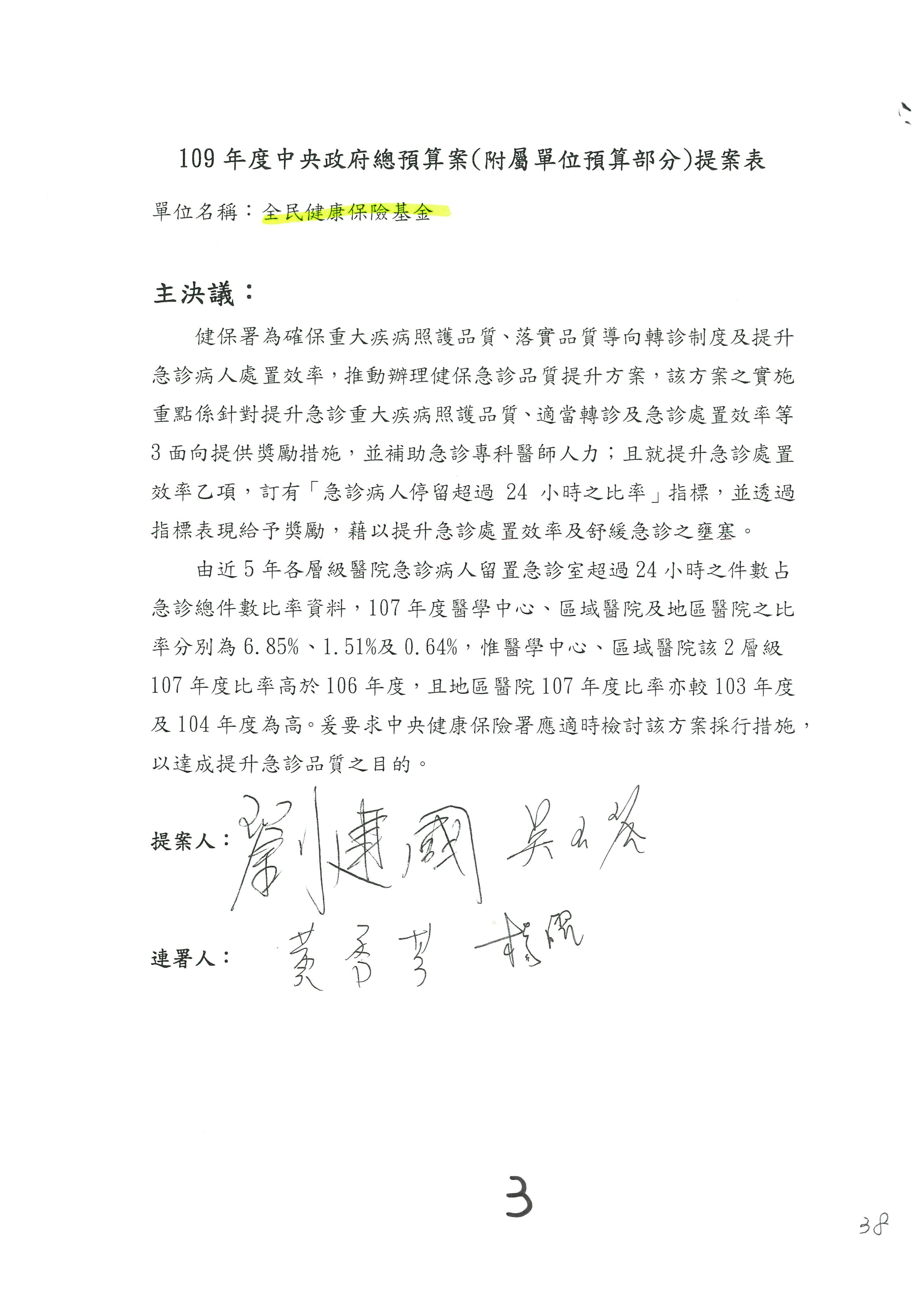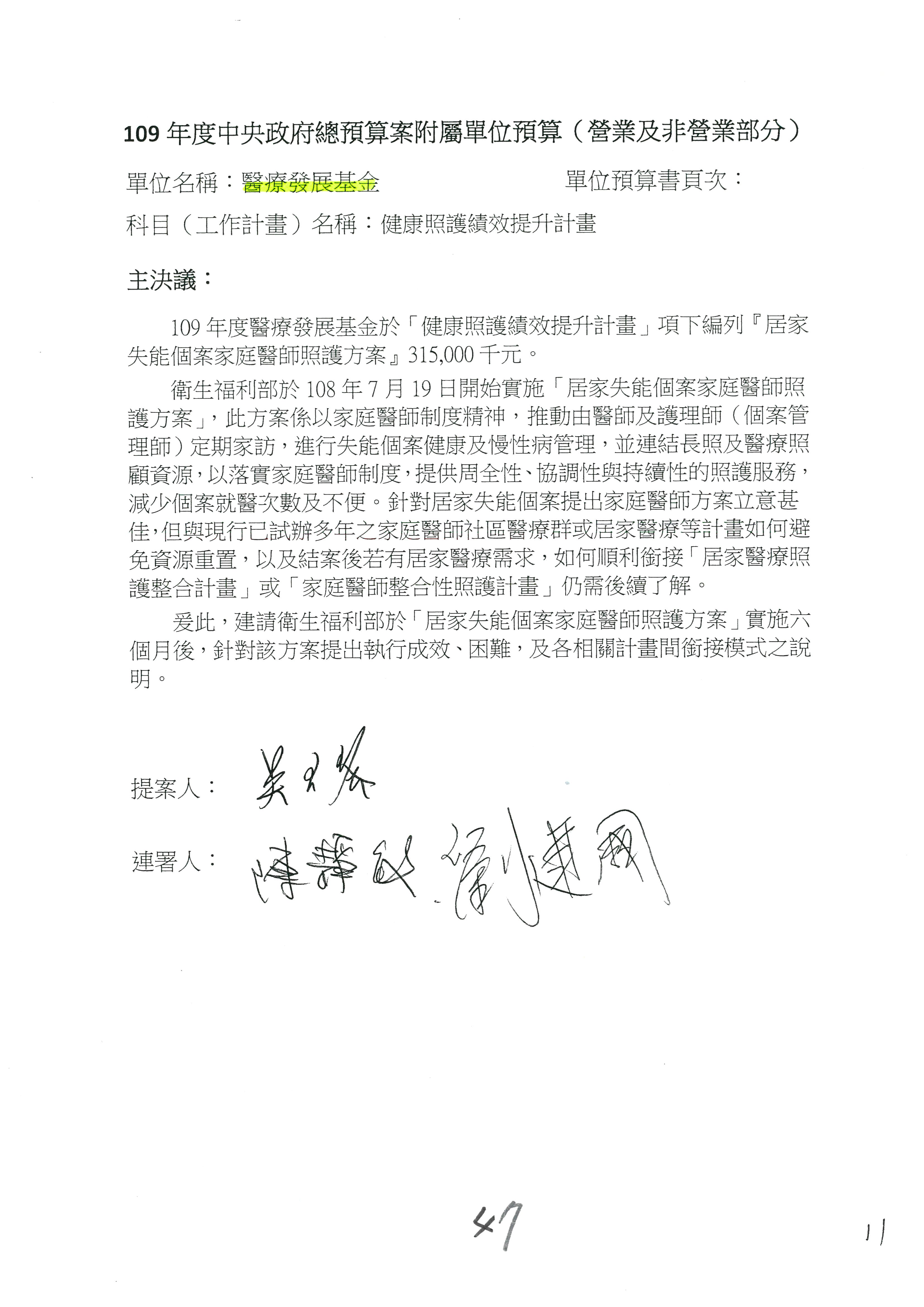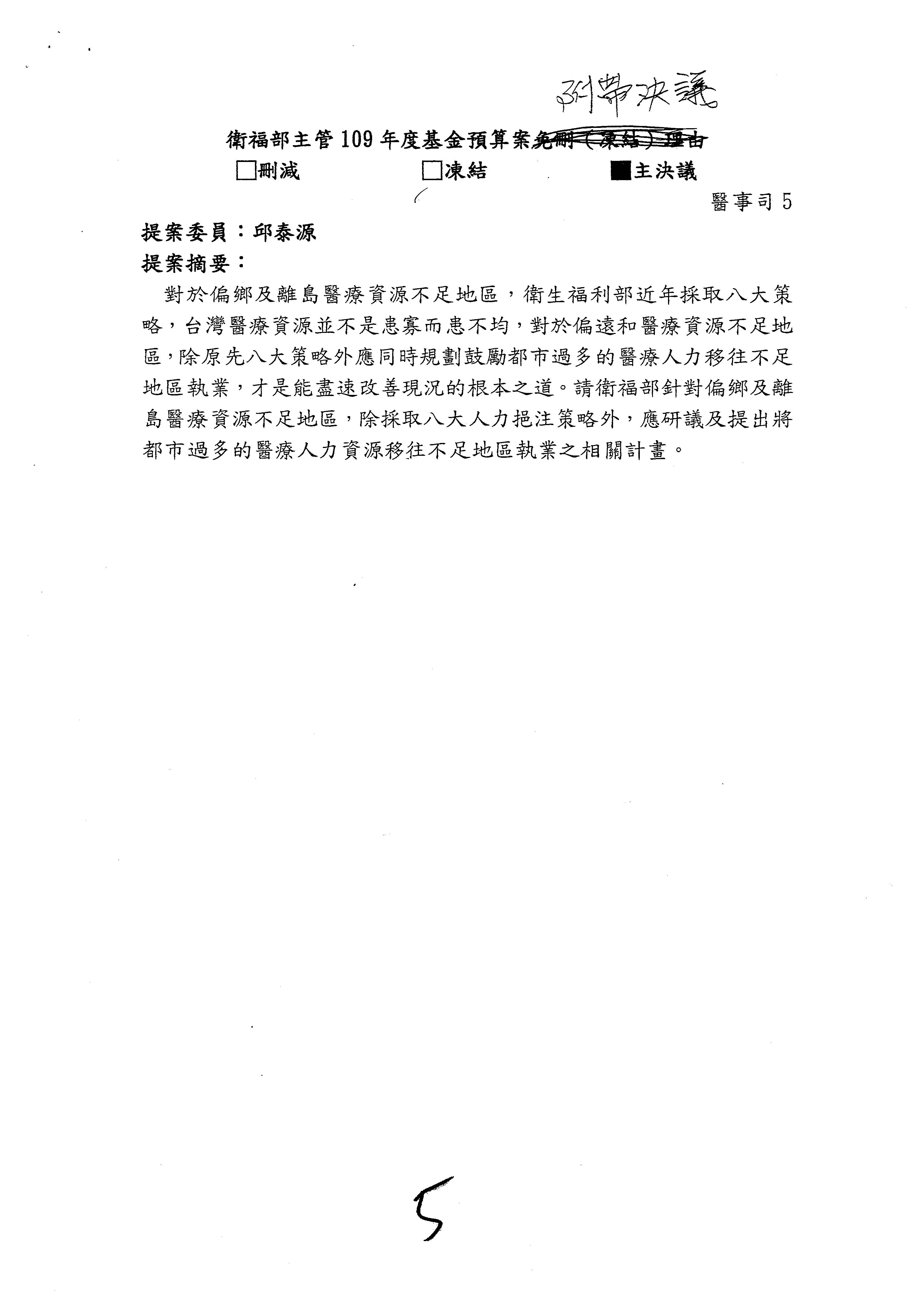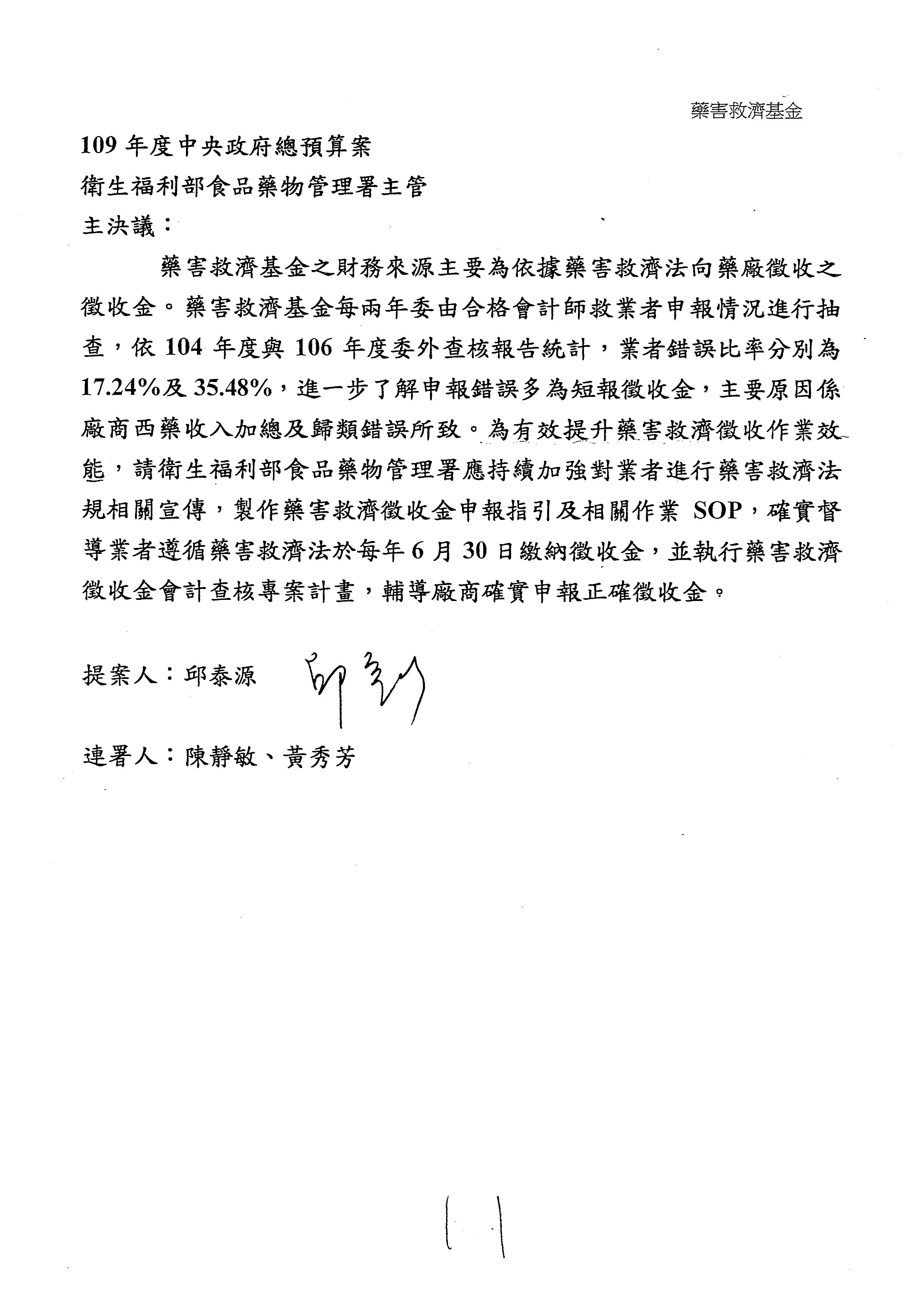 現在作以下決議:中華民國109年度中央政府總預算關於衛生福利部主管基金預算案業已審查完竣,提報院會討論,院會討論前須交黨團協商。