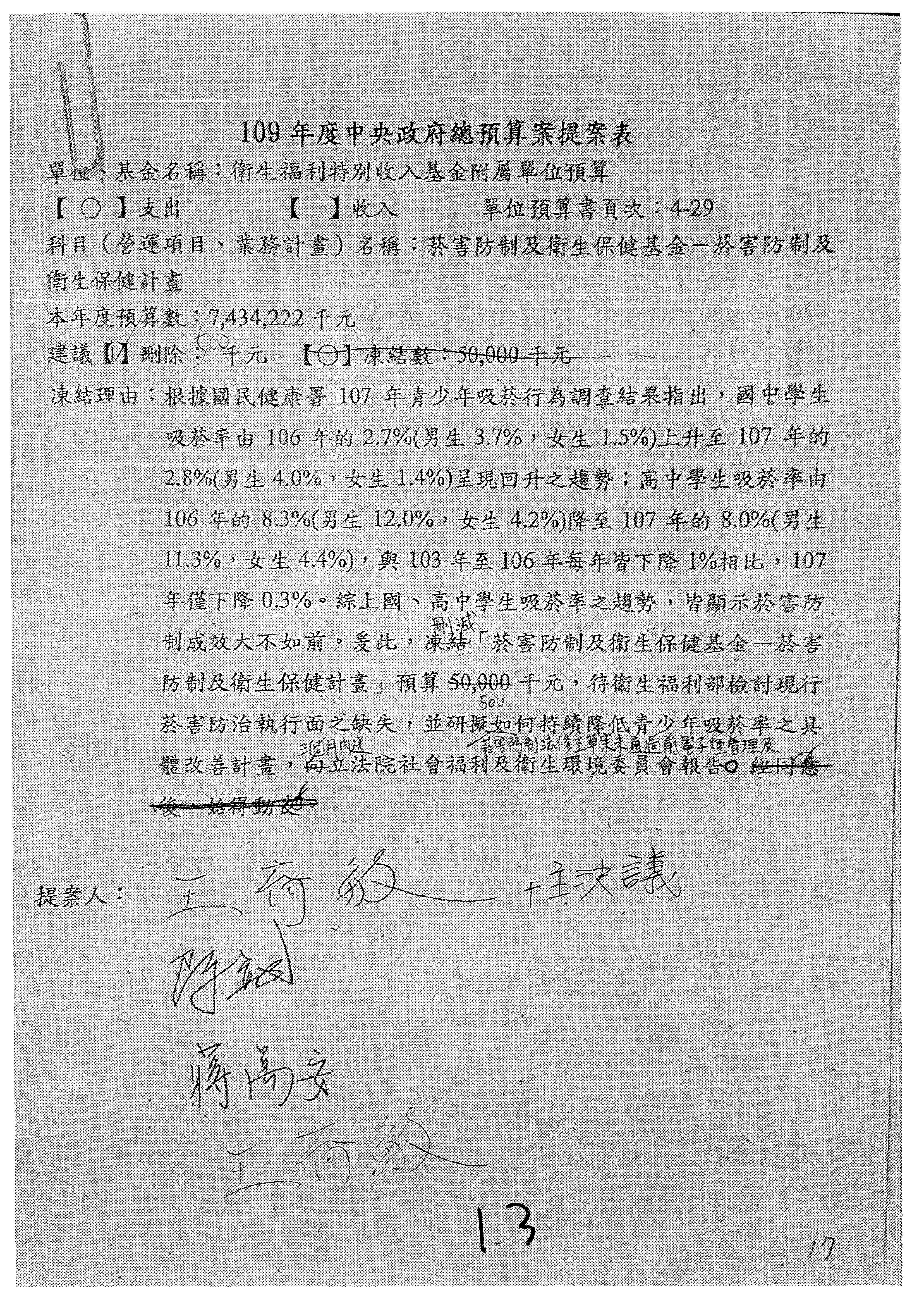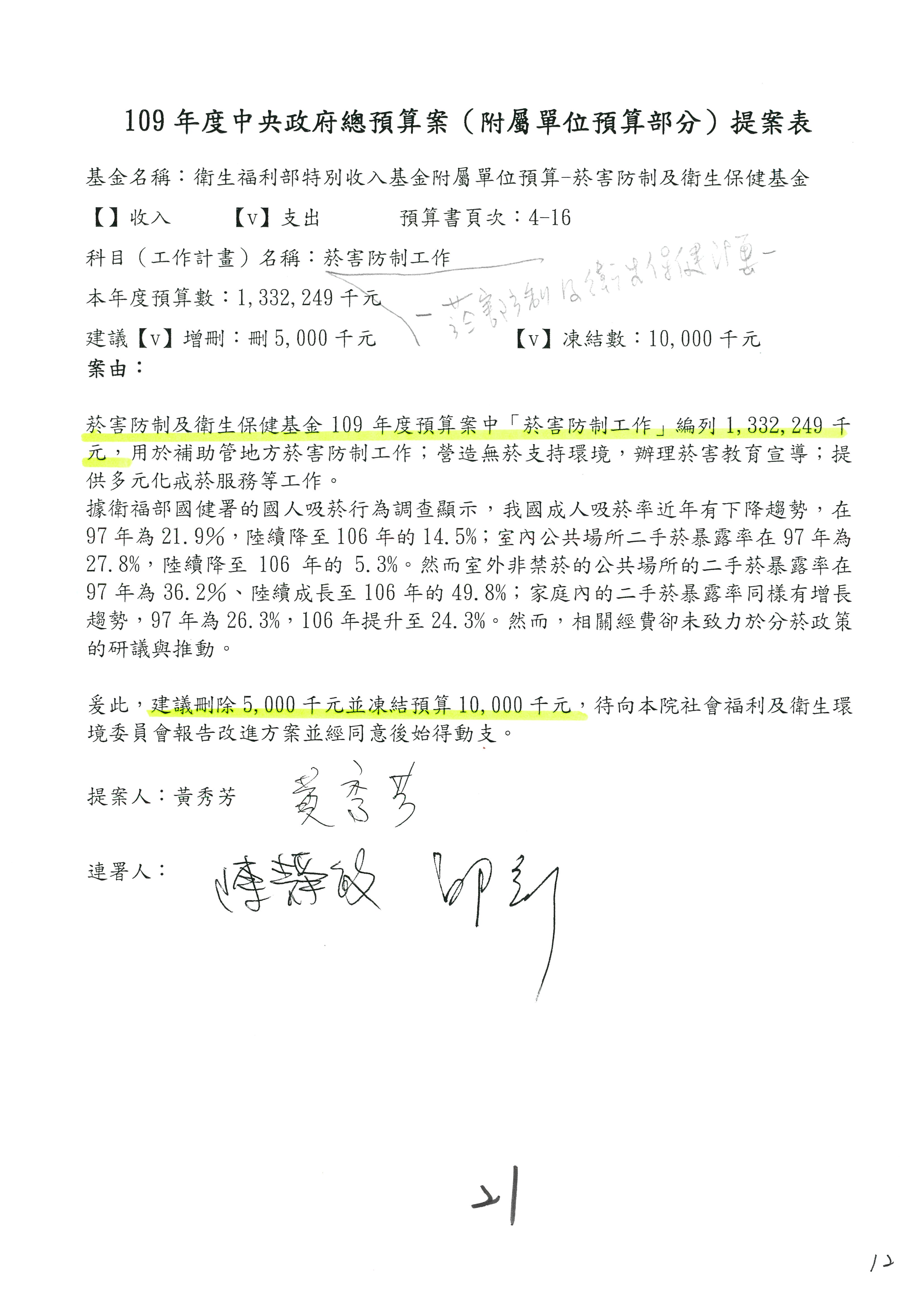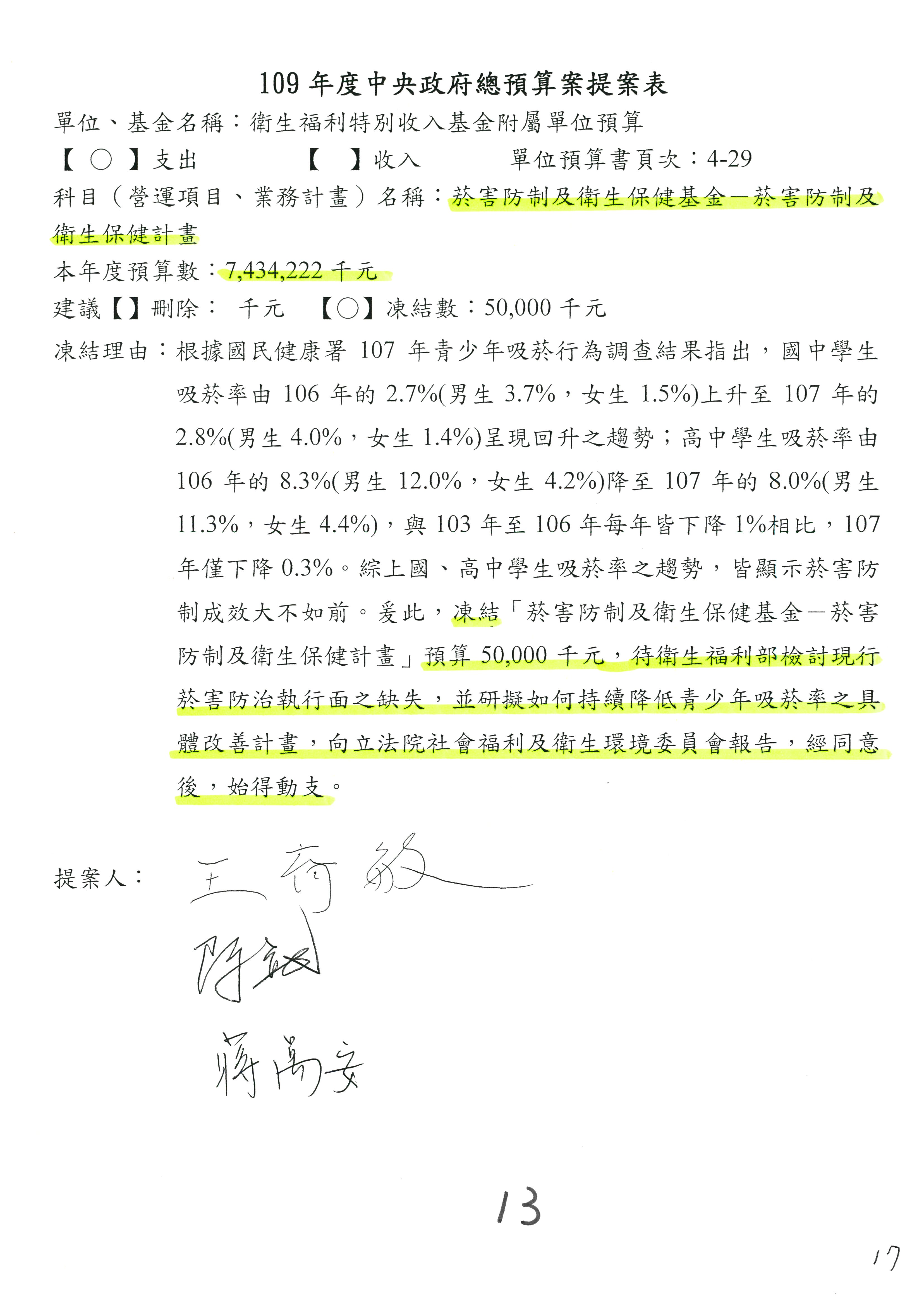 王委員育敏:第13案我講一下。第13案是有關菸害防制的部分,我特別關心電子煙的問題,我在審查衛福部預算時也有提過類似的提案,在這部分我真的覺得主管機關要有一個態度出來。現在我們看到地方政府想要用地方自治條例來做,但是我覺得這件事情不是地方政府的責任,全國的未成年人統統都會受到影響,所以不應該只有地方,中央主管機關應該要加把勁。在此我提出的訴求就是希望衛福部一定要正視電子菸對未成年人健康的危害,要有更積極的作為。
