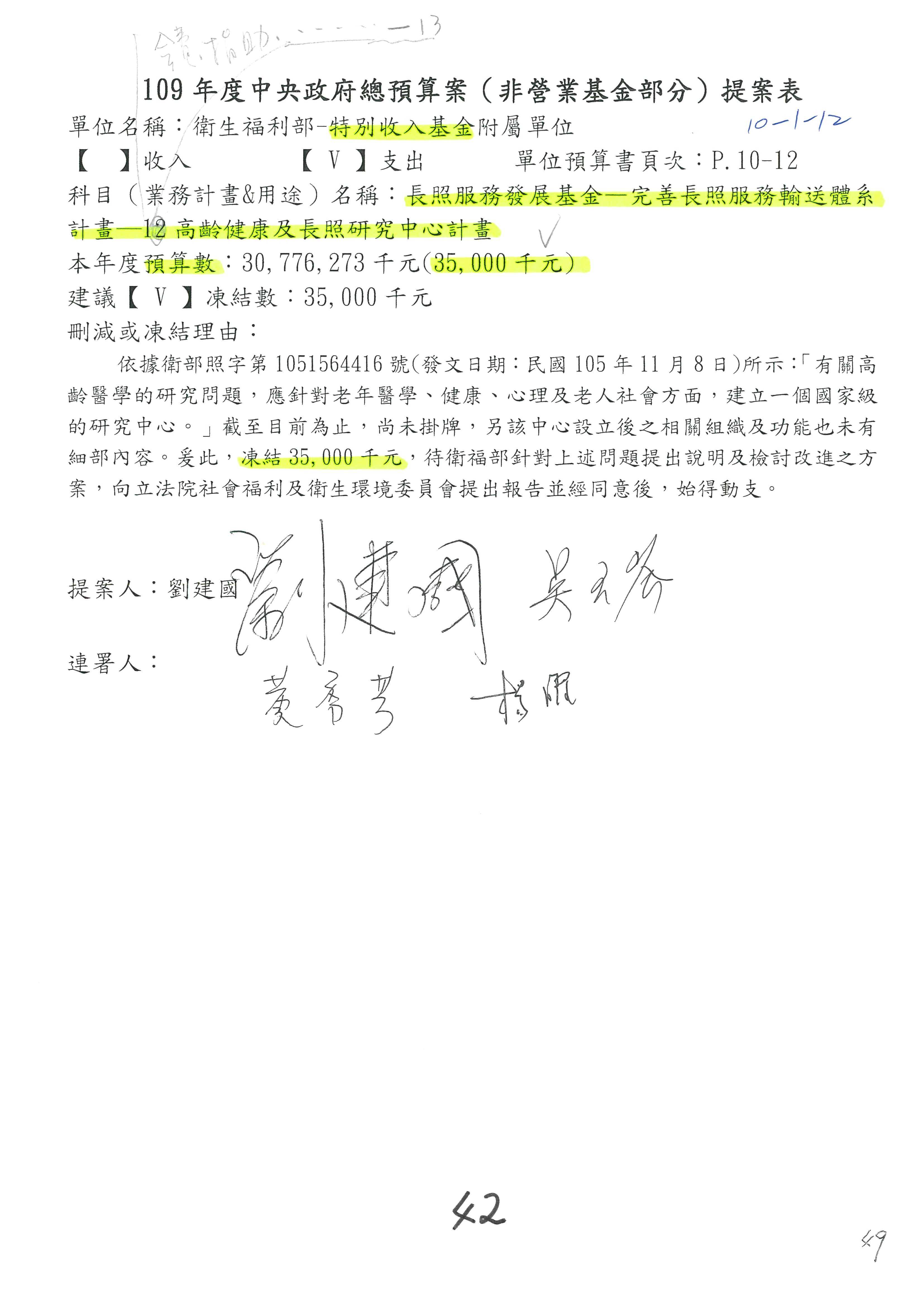 劉委員建國:是啊!從頭到尾我們政府有要成立一個國家級的高齡、長照、醫療等相關的研究中心嗎?