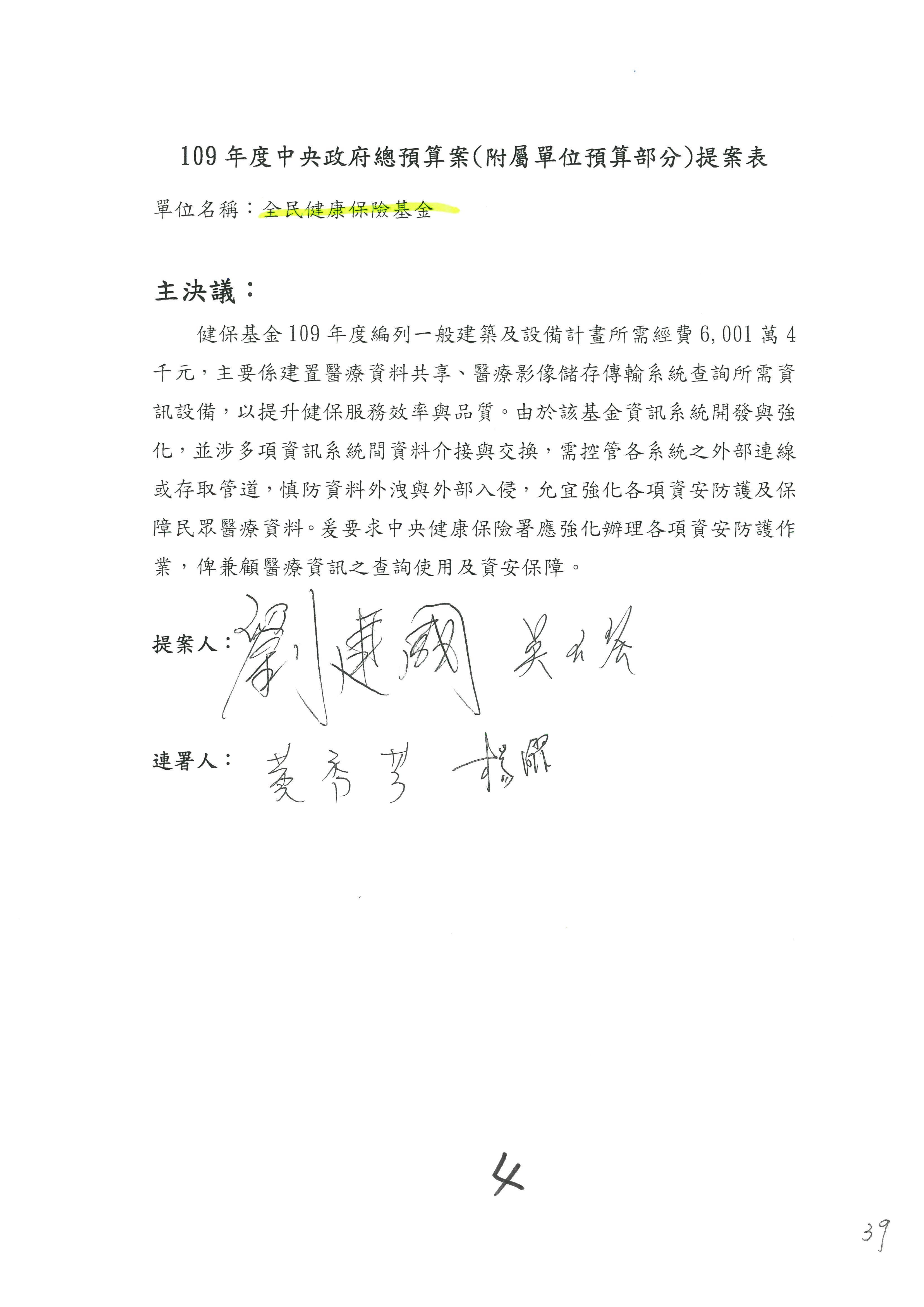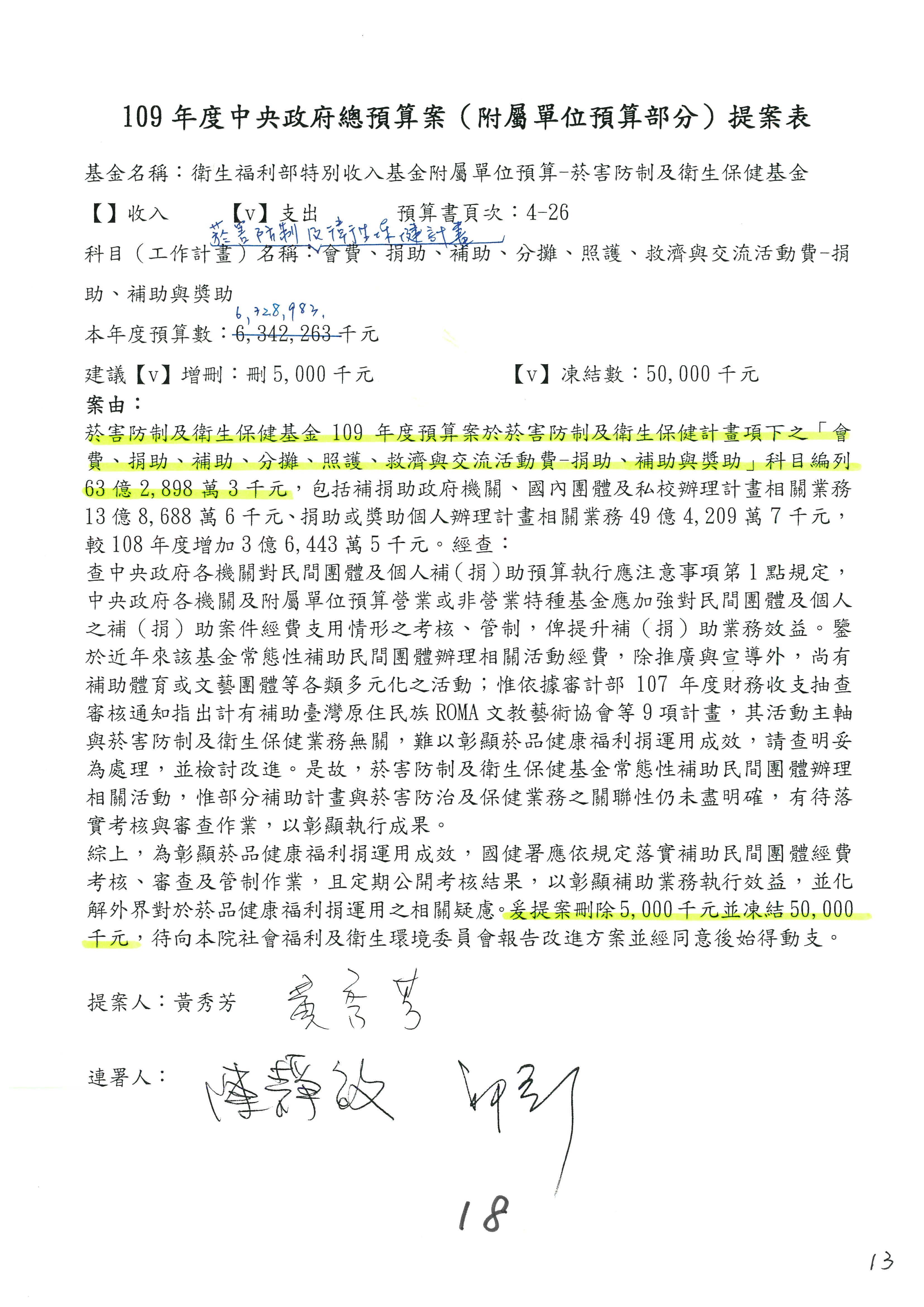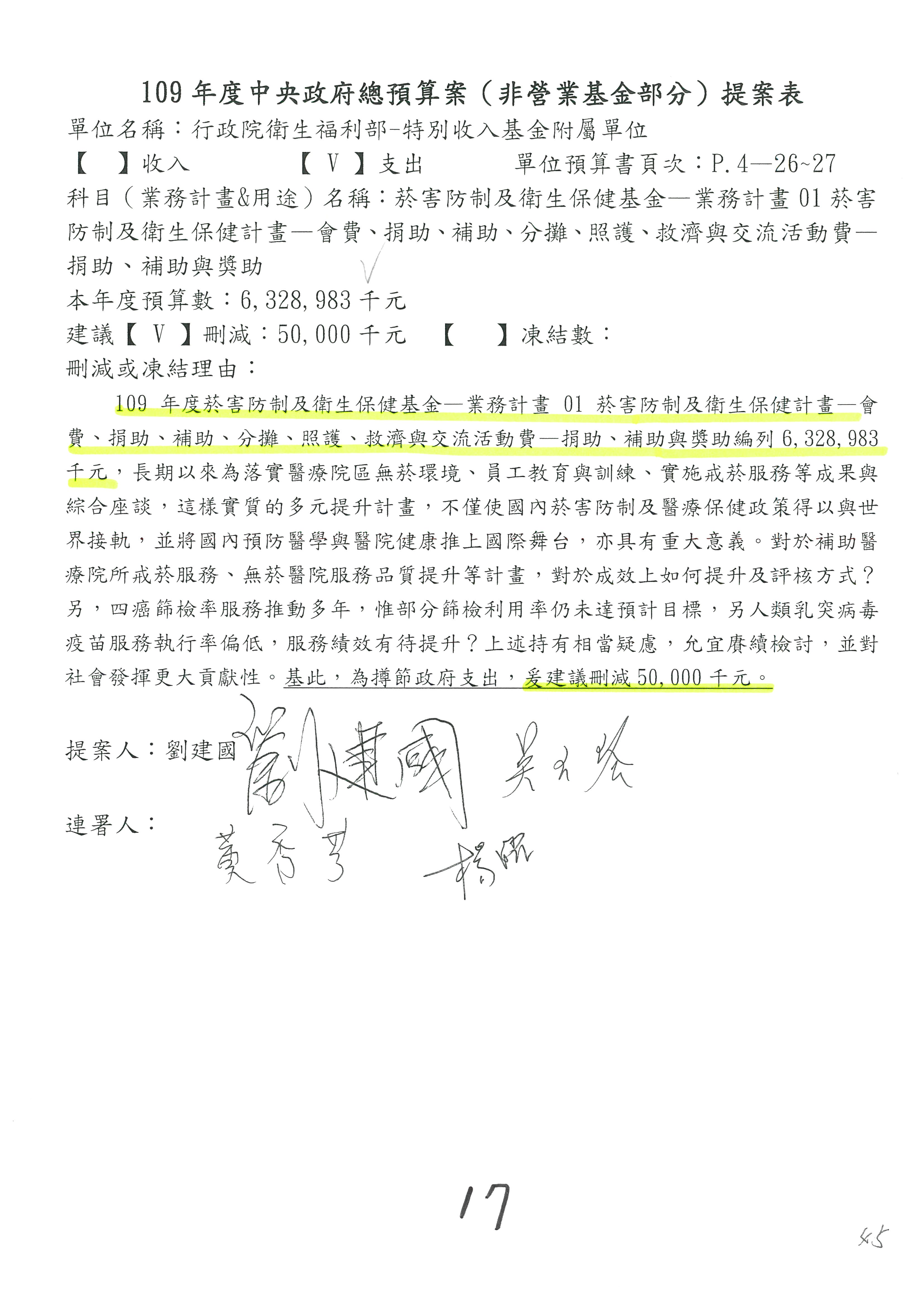 現在開始審查,請議事人員宣讀衛福部主管基金預算之科目、金額及委員提案。