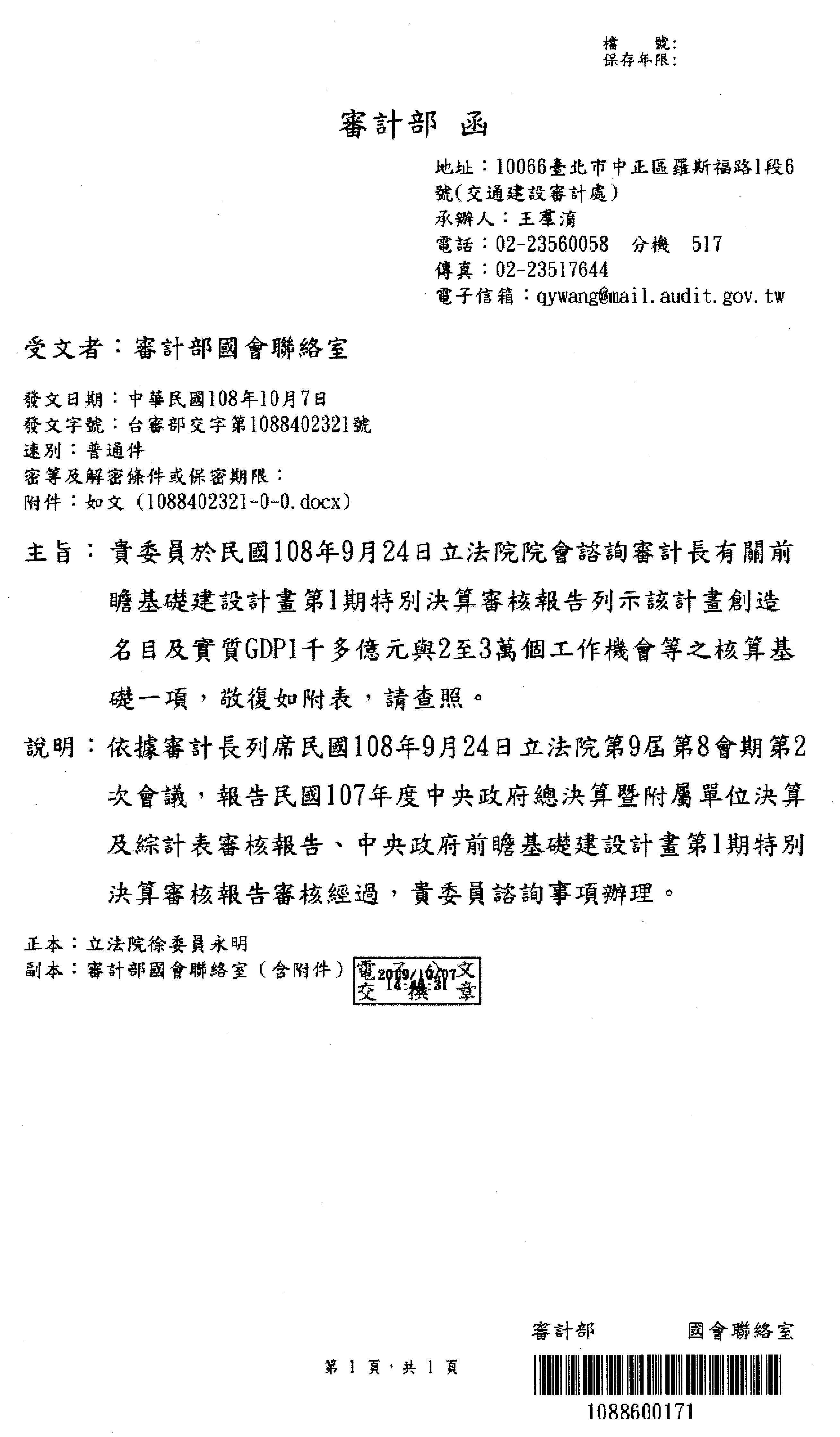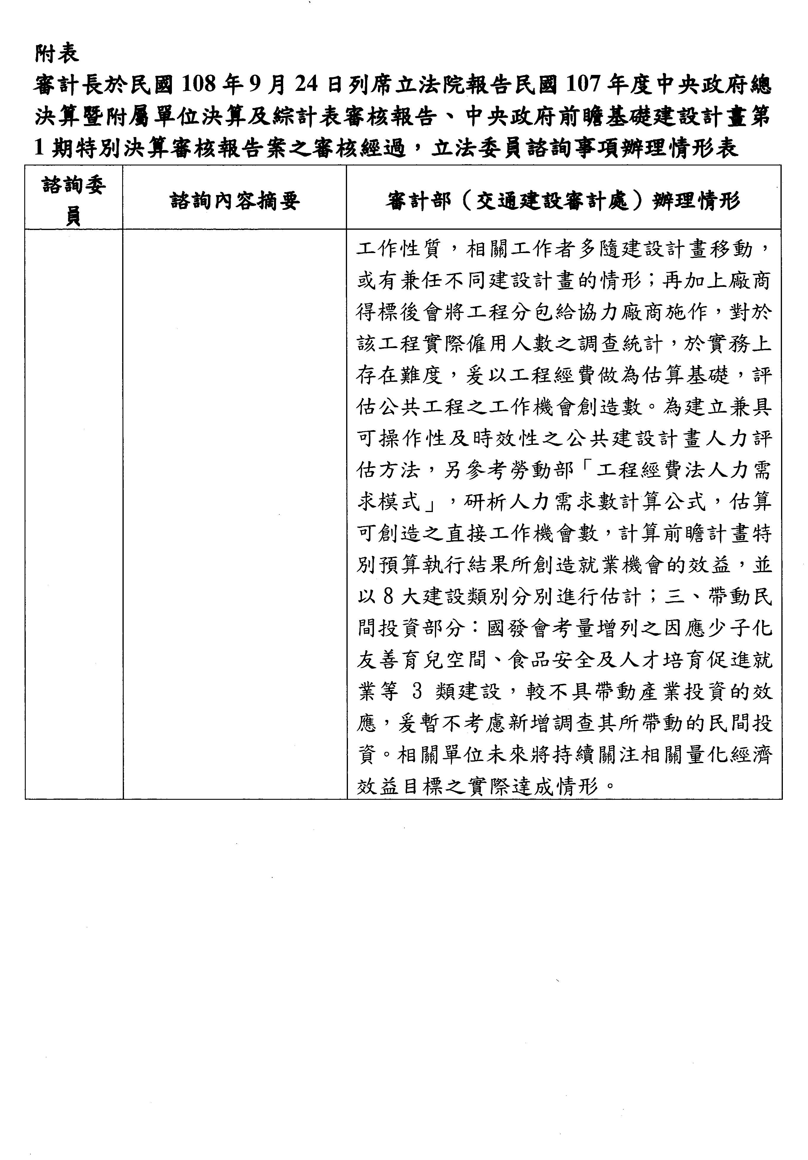 (立法院函 中華民國108年11月5日臺立院議字第1080703481號 施政報告質詢17號)