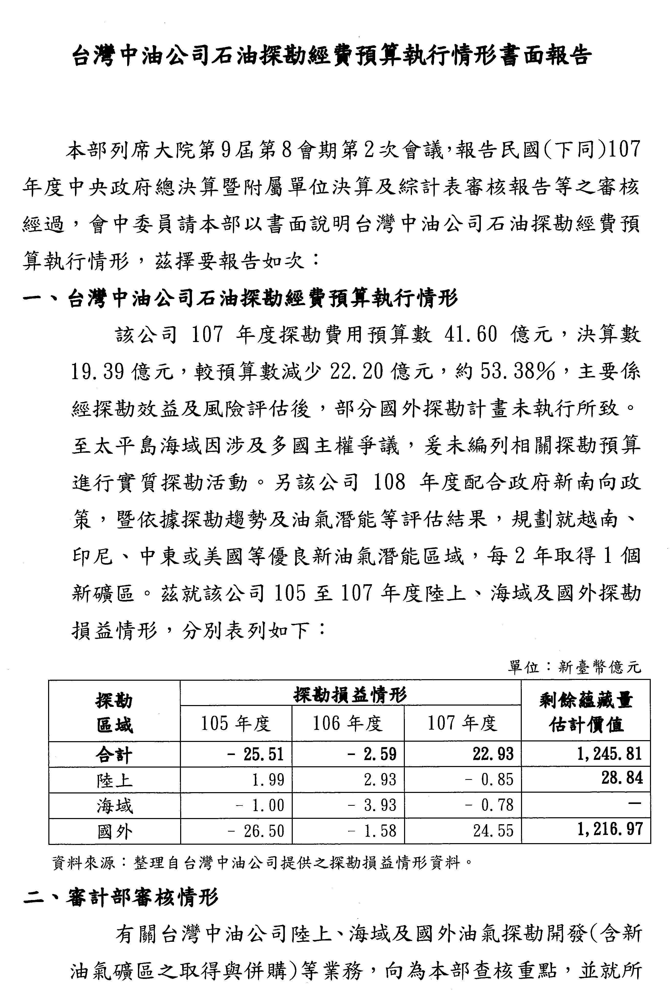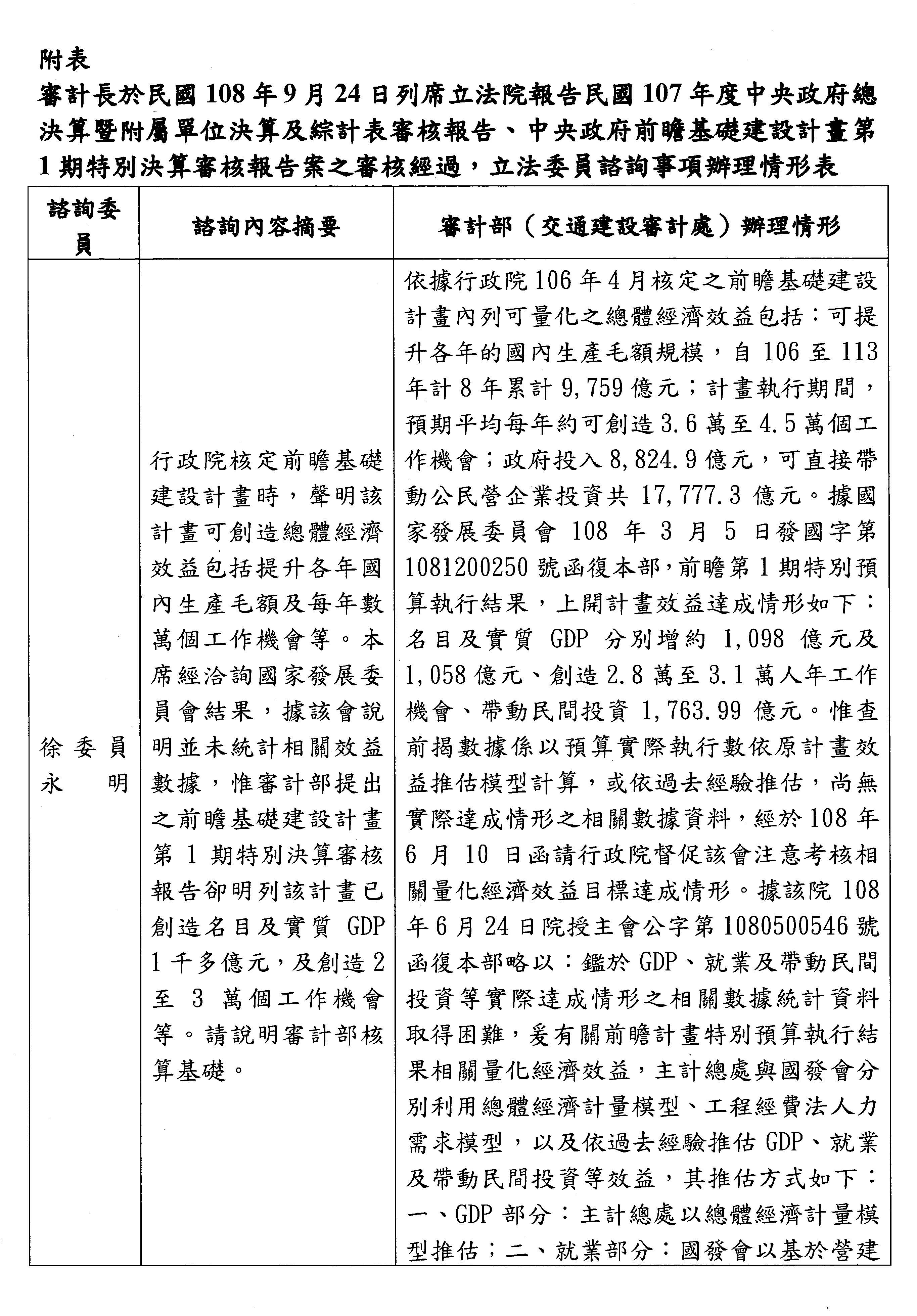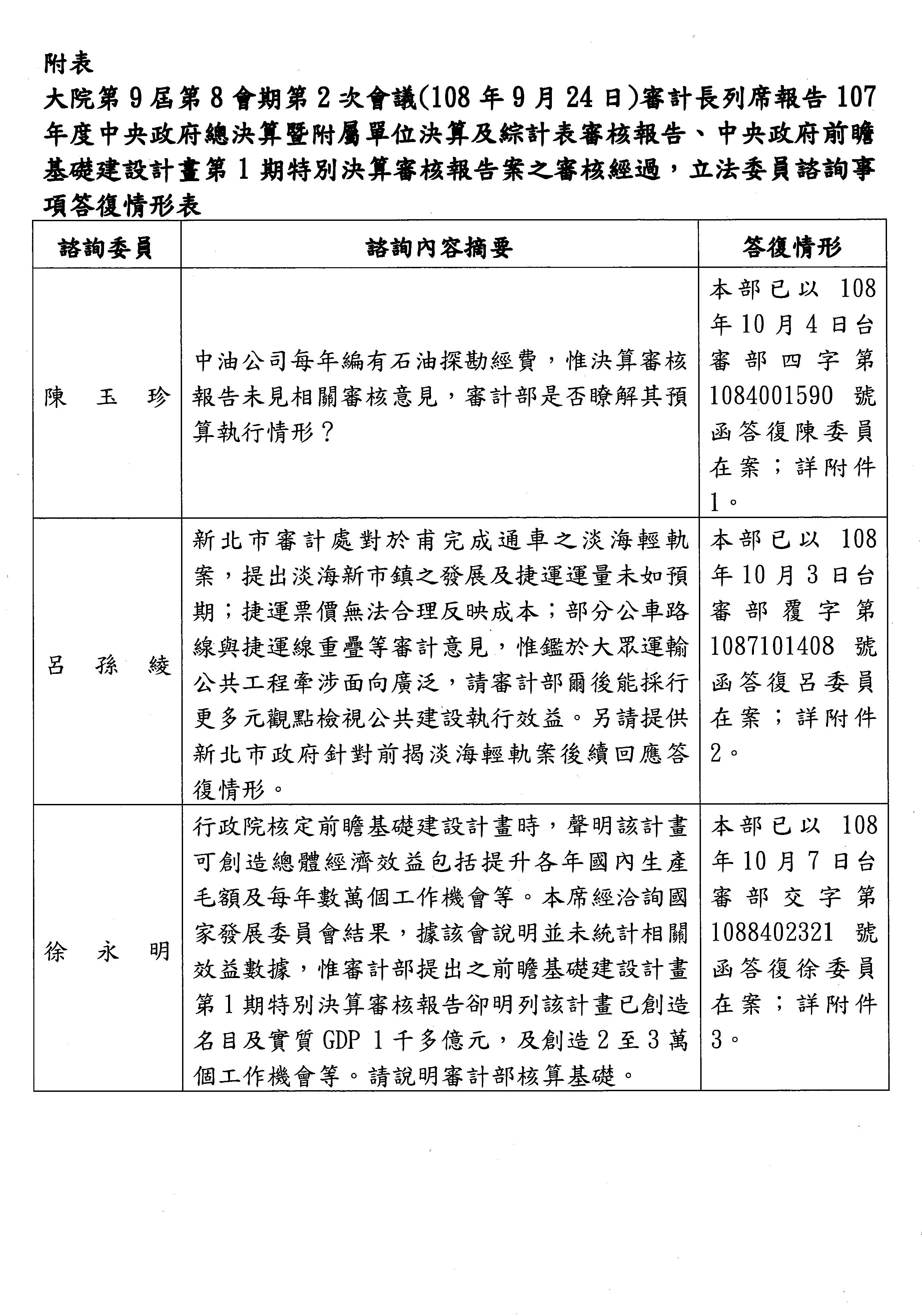 (一)審計部函送委員陳玉珍、呂孫綾、徐永明等3人就「中華民國107年度中央政府總決算審核報告」、「中央政府前瞻基礎建設計畫第1期特別決算審核報告(中華民國106年度至107年度)」案審核經過所提諮詢之書面答復,請查照案。