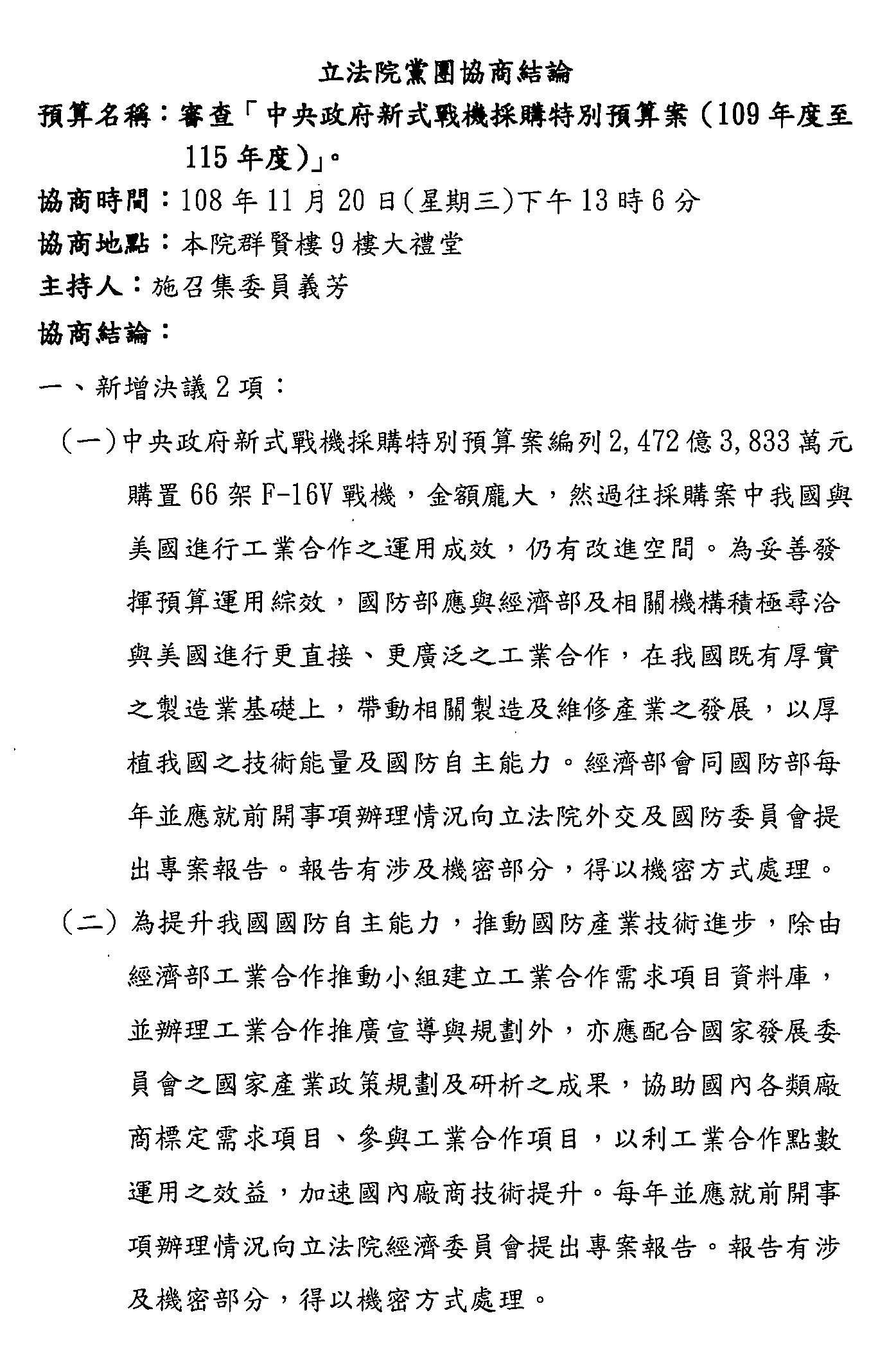 協商主題 中央政府新式戰機採購特別預算案(109年度至115年度)