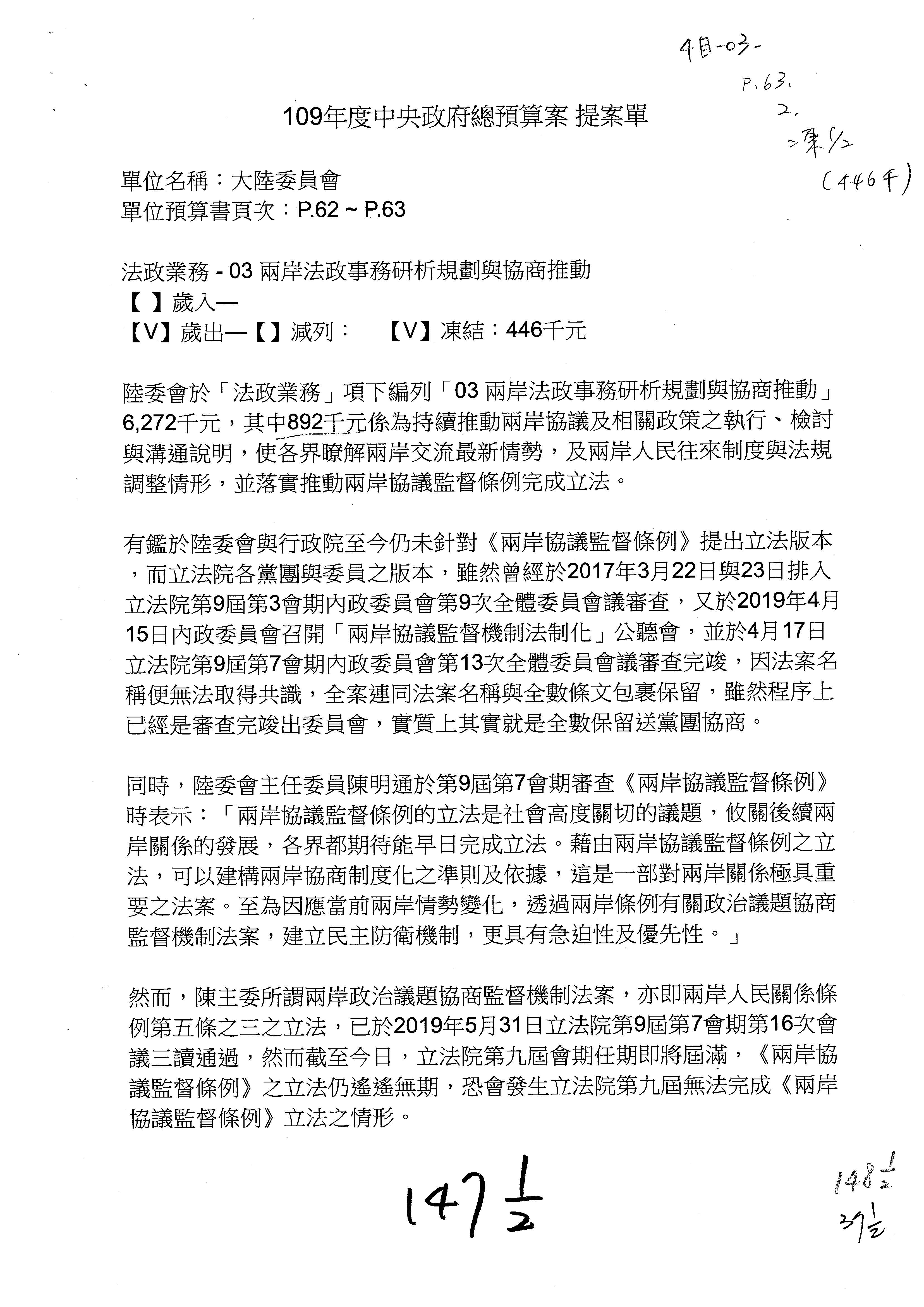 (一)109年度中央研究院預算編列「業務費」項下「臨時人員酬金」31億1,053萬元,凍結1,500萬元,俟中央研究院向立法院教育及文化委員會提出書面報告後,始得動支。