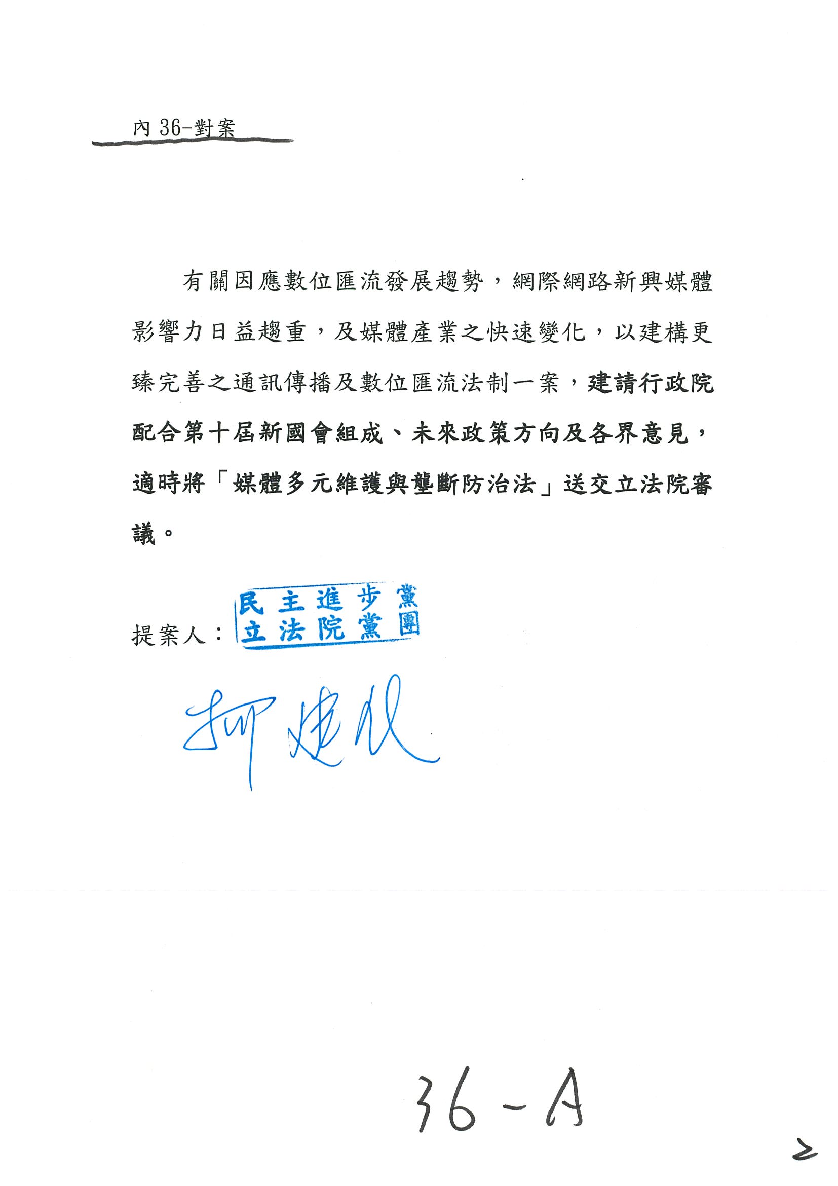 主席:請問院會,針對第36-A案有無異議?(無)無異議,本案照案通過。