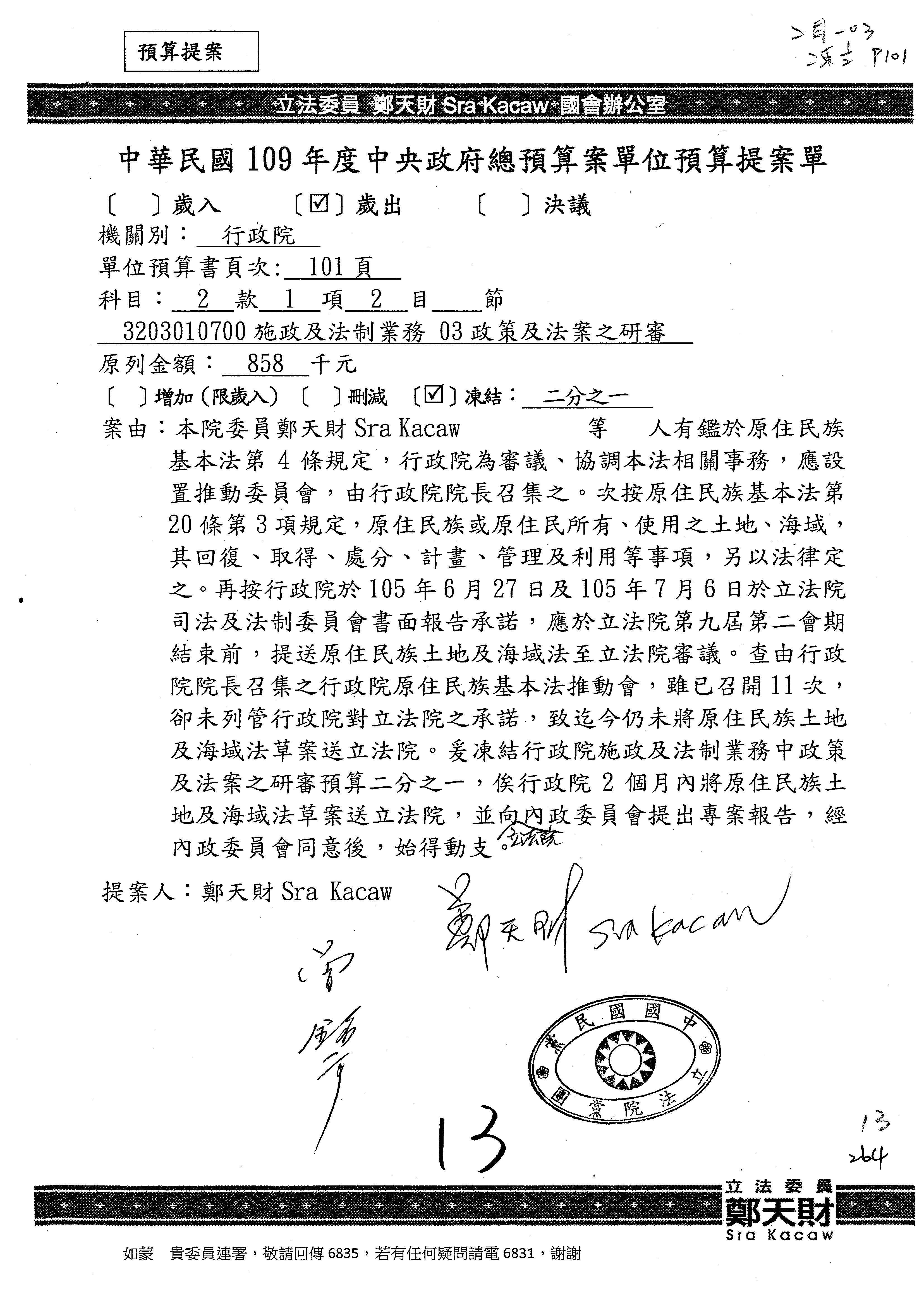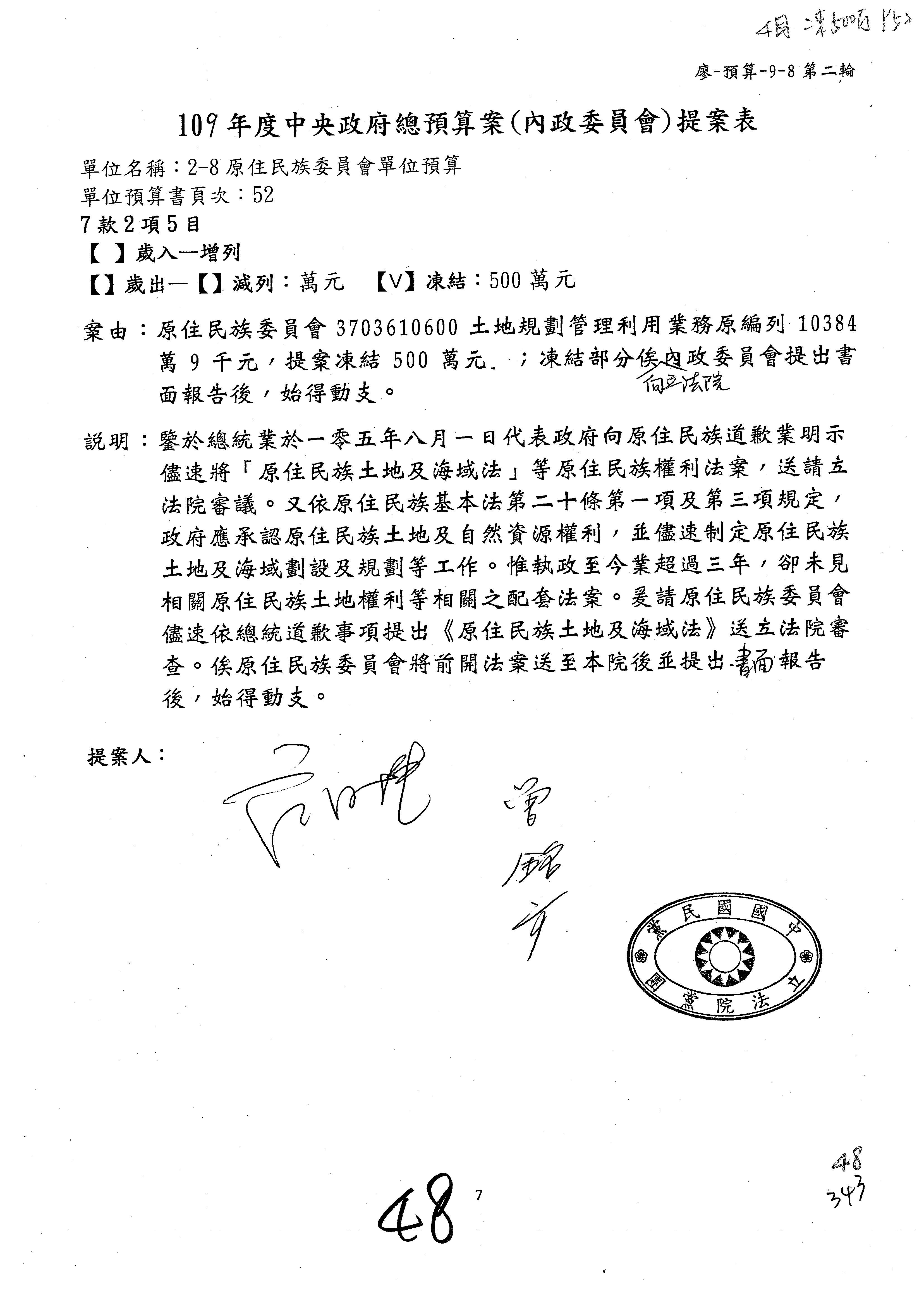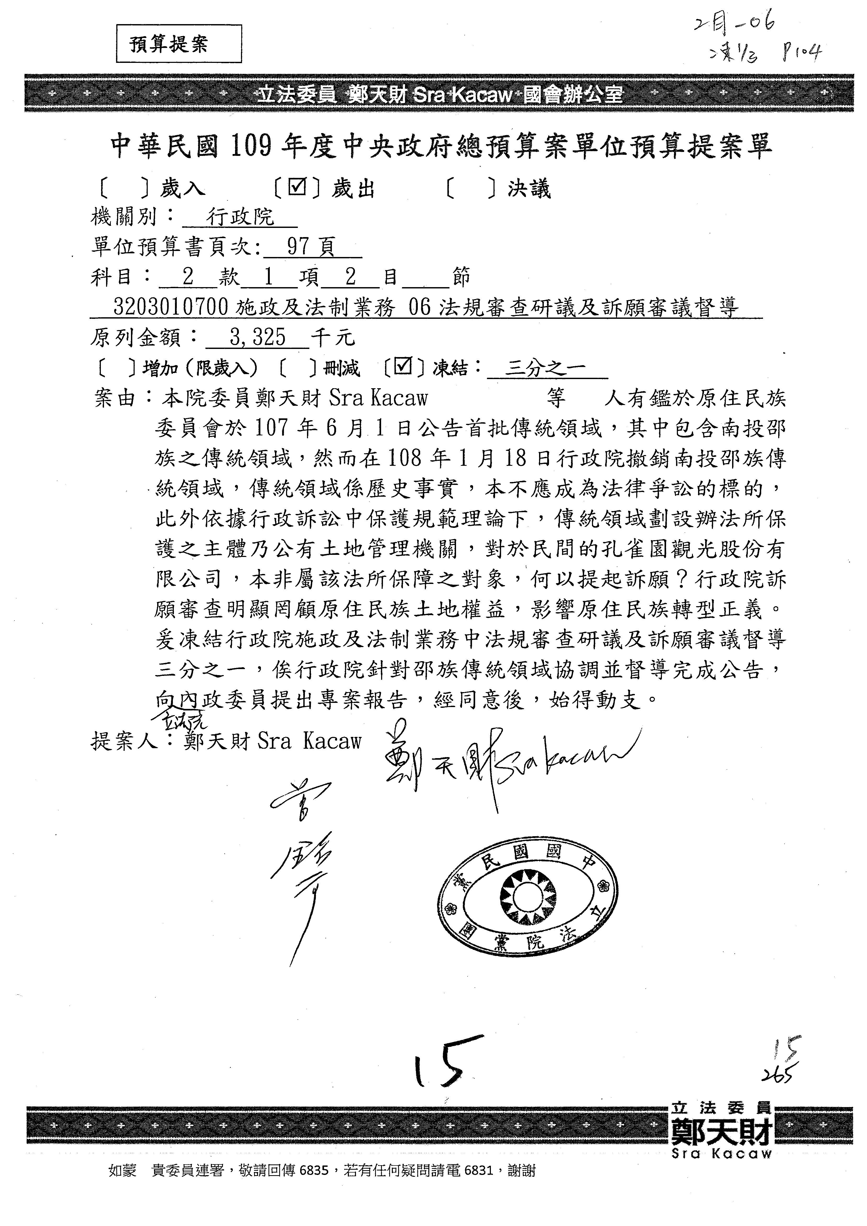 關於109年度中央政府總預算,其實在整個會期當中,經過各委員會的討論,大家非常詳細的一個部會、一個部會的審查,總共只刪除了15億元。上個禮拜在院長的指導之下、在院長的主持之下,各黨團也坐下來好好的把統刪的部分、把我們提出的項目,一樣一樣的進行討論,所以最後達成一個決議,就是中央政府總預算這次的統刪達到1.17%,總共有246億元的額度,這樣我們對人民有所交代,即中央政府總預算我們就是刪除這樣的額度。