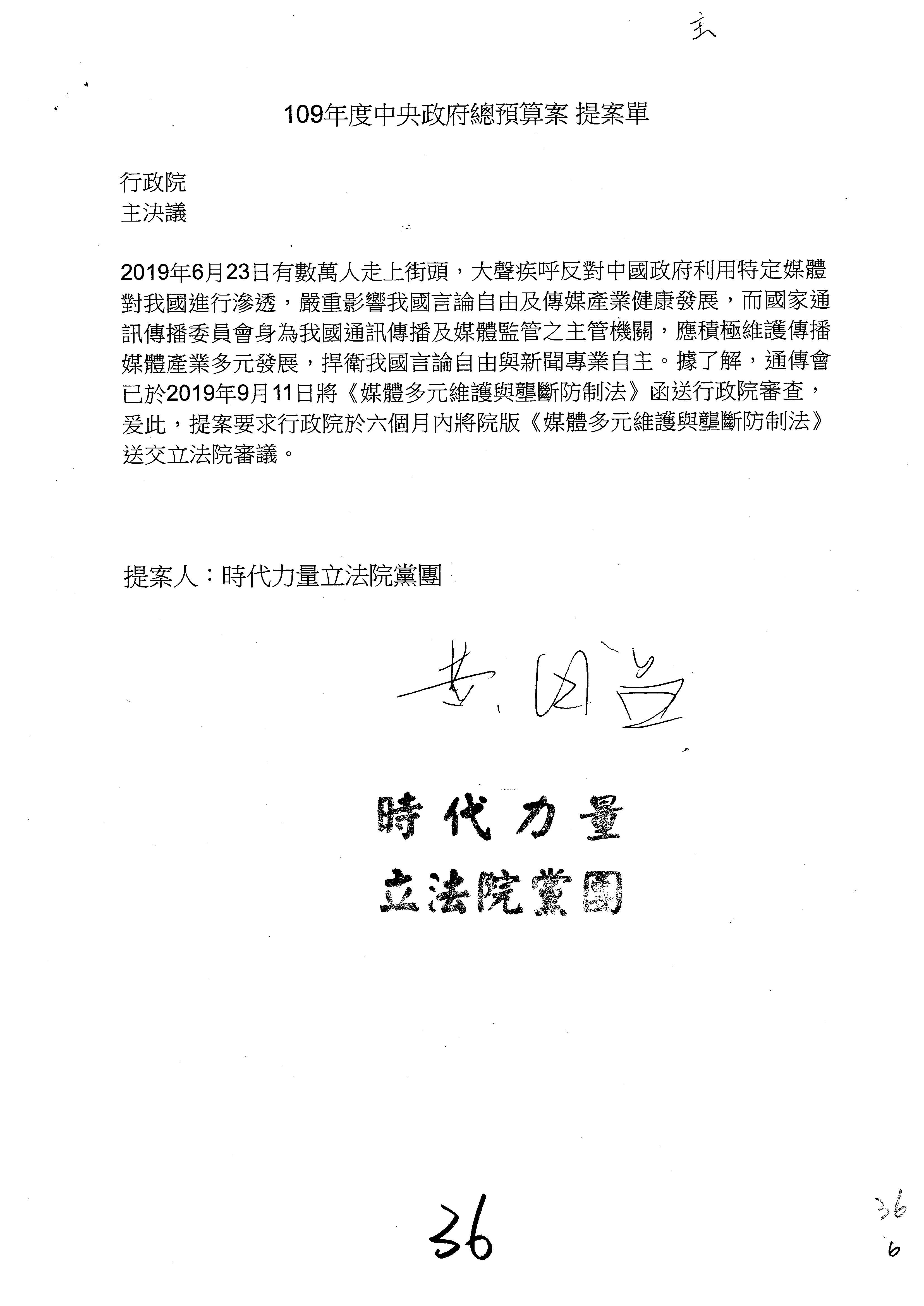 主席:現在進行處理。針對第36案,現有民進黨黨團及時代力量黨團要求記名表決,現在開始,時間1分鐘。