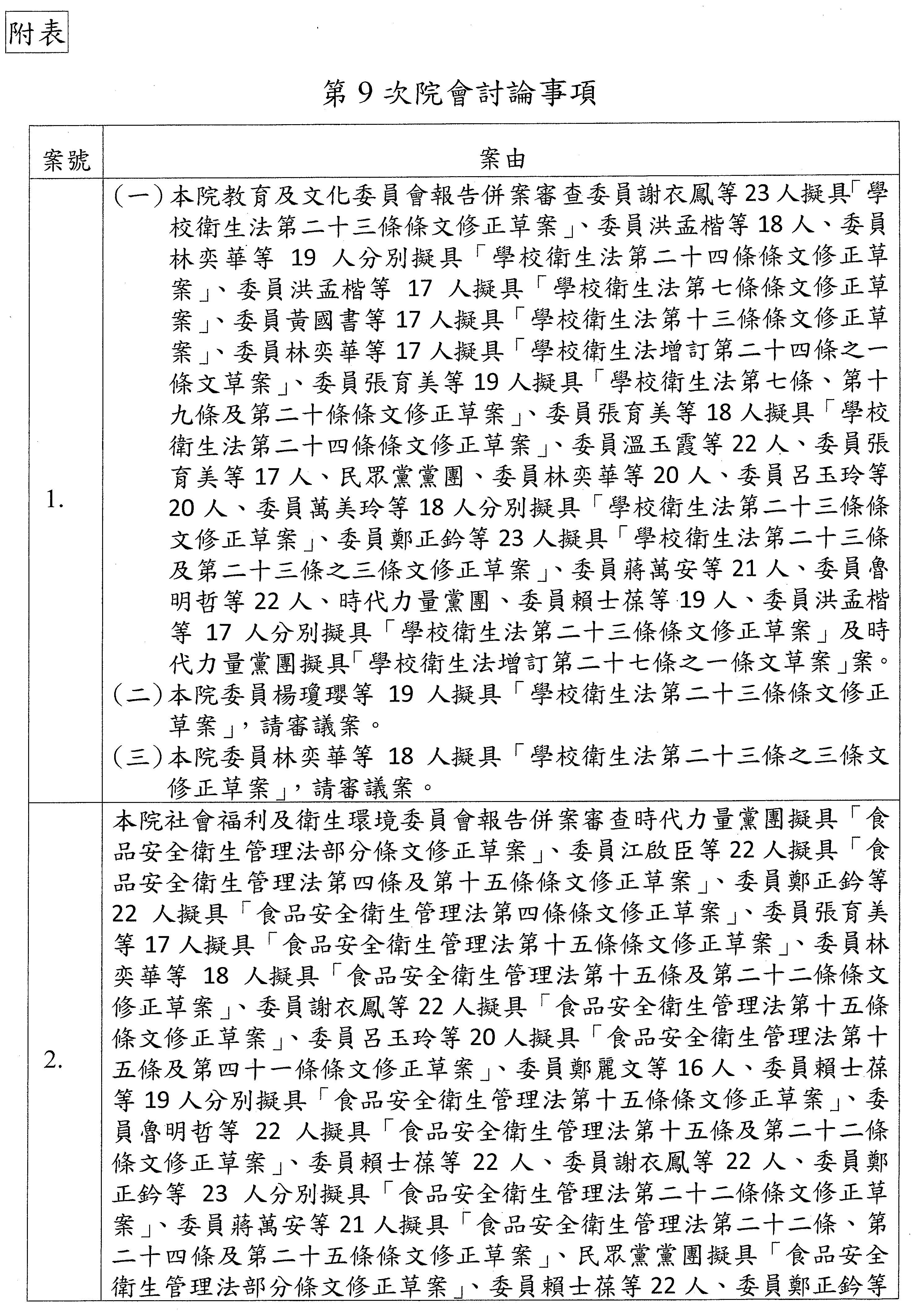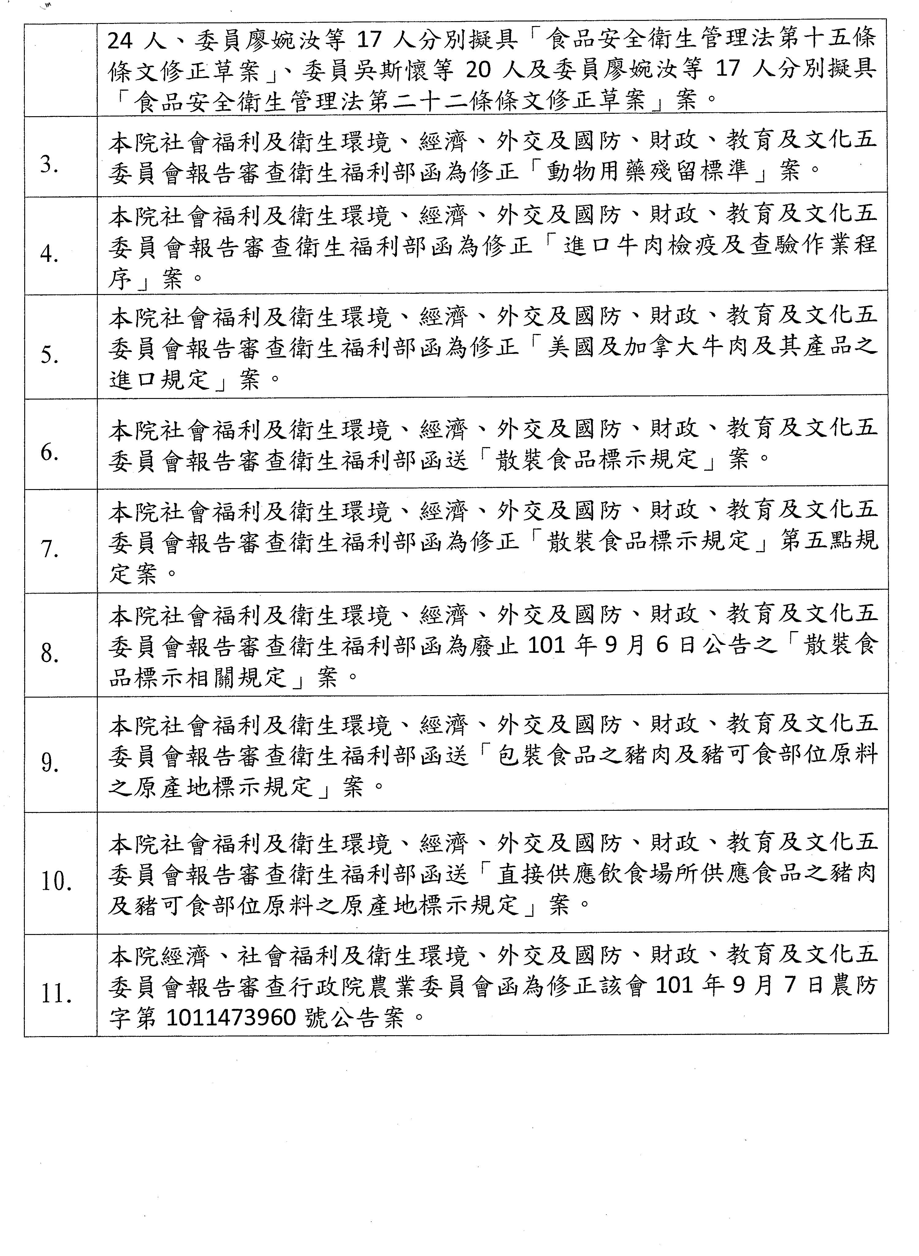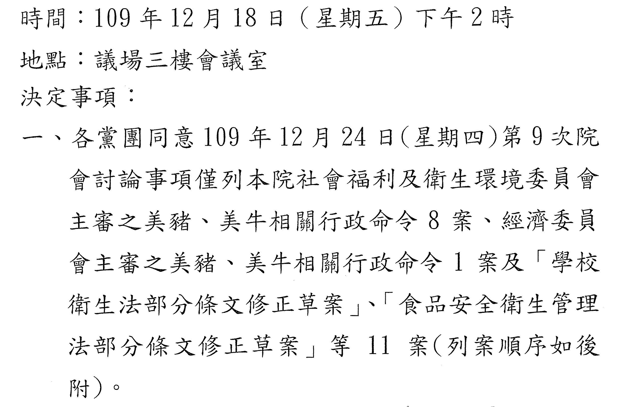 一、各黨團同意109年12月24日(星期四)第9次院會討論事項僅列本院社會福利及衛生環境委員會主審之美豬、美牛相關行政命令8案、經濟委員會主審之美豬、美牛相關行政命令1案及「學校衛生法部分條文修正草案」、「食品安全衛生管理法部分條文修正草案」等11案(列案順序如後附)。