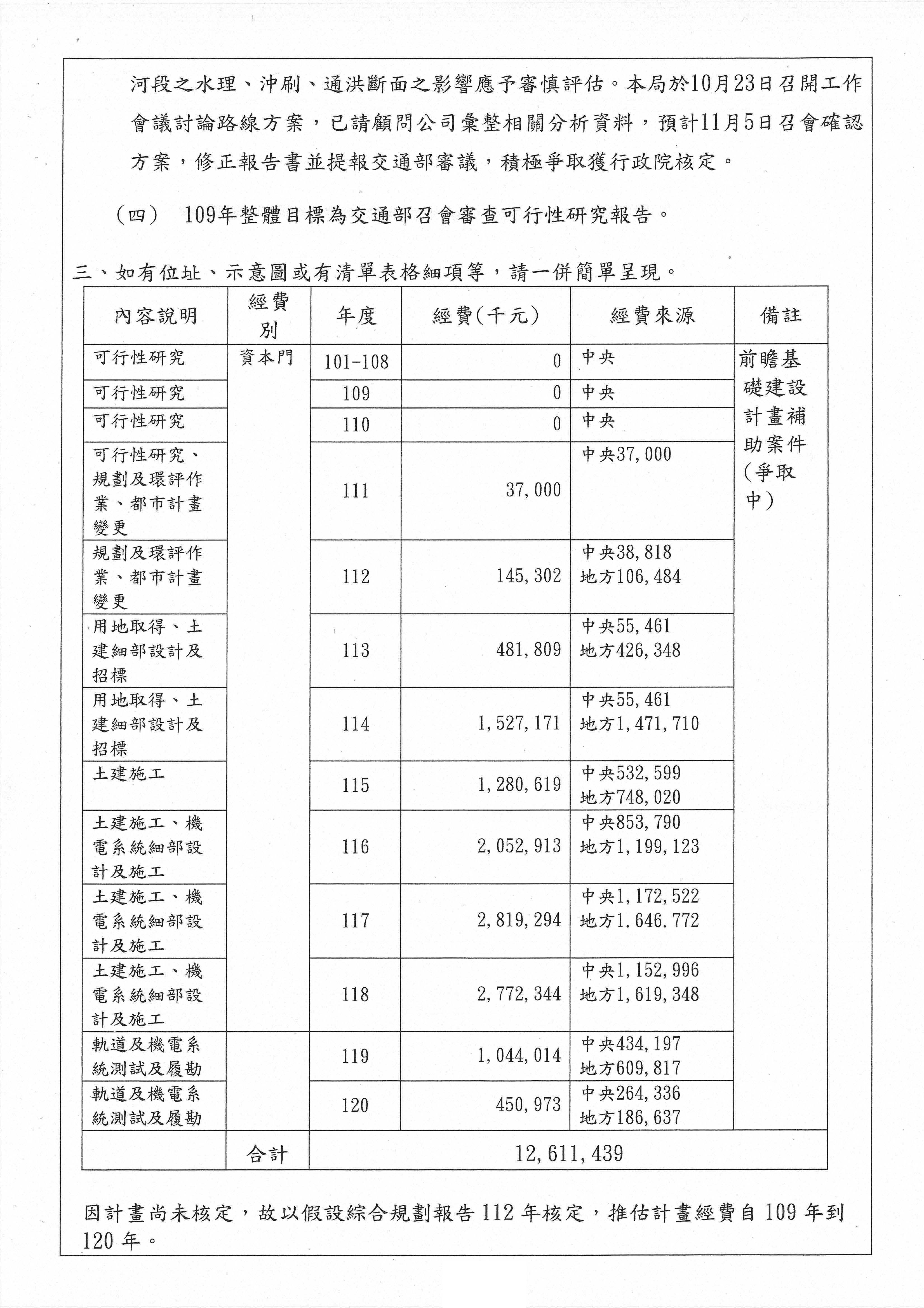 總經費為21.63億元,可行性評估已於109/10/13原則同意,預計110/5/15提送期中報告。 |