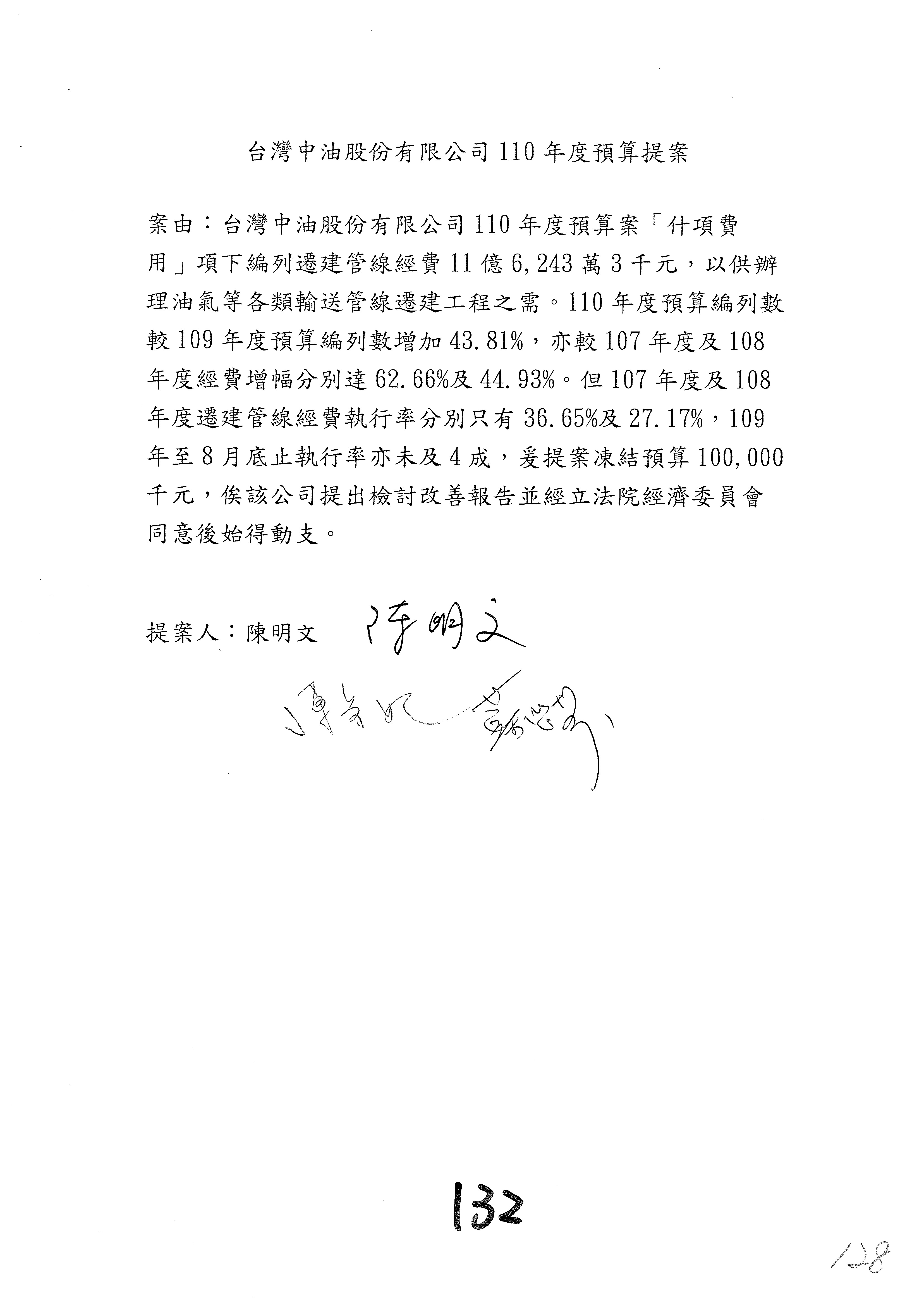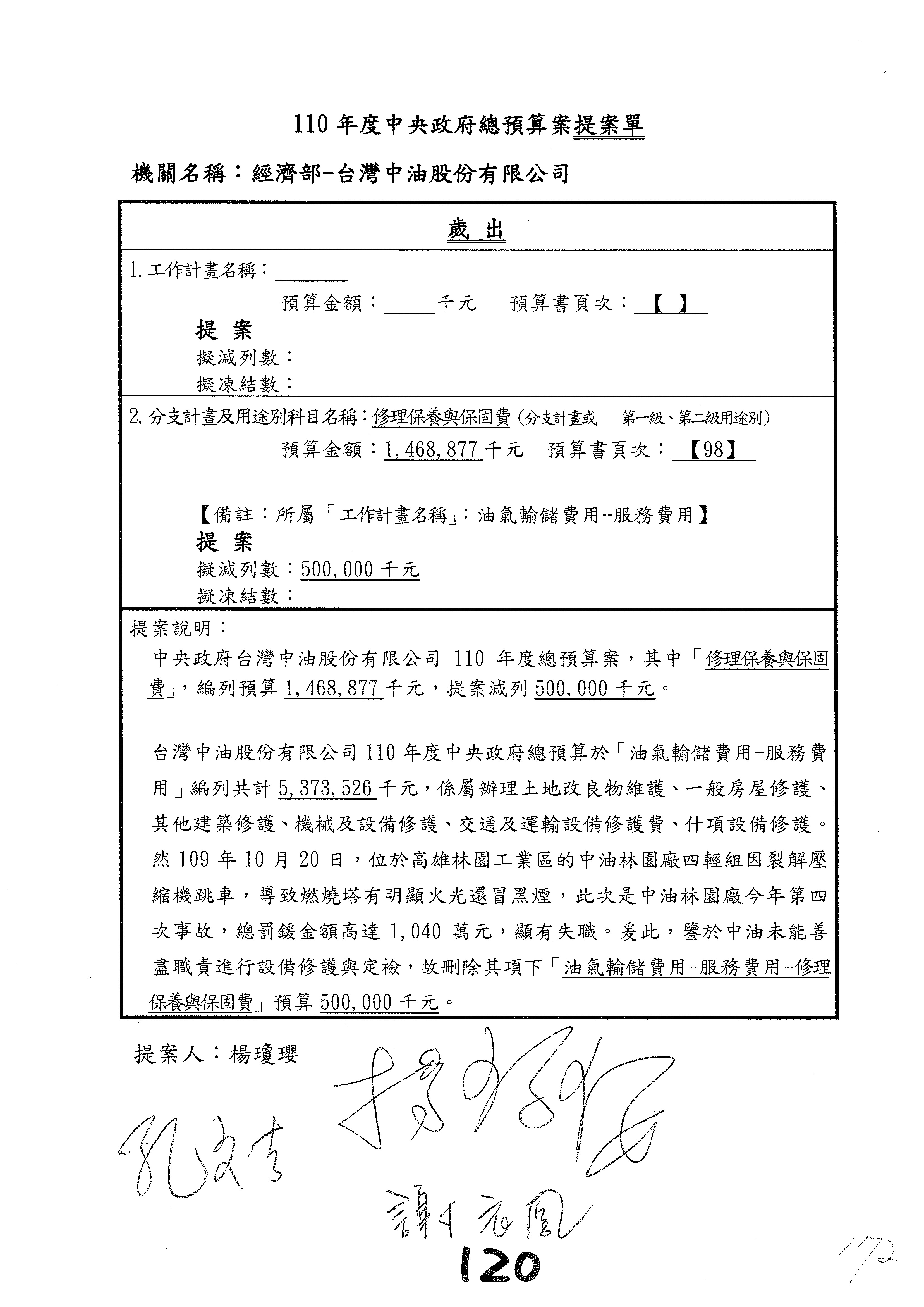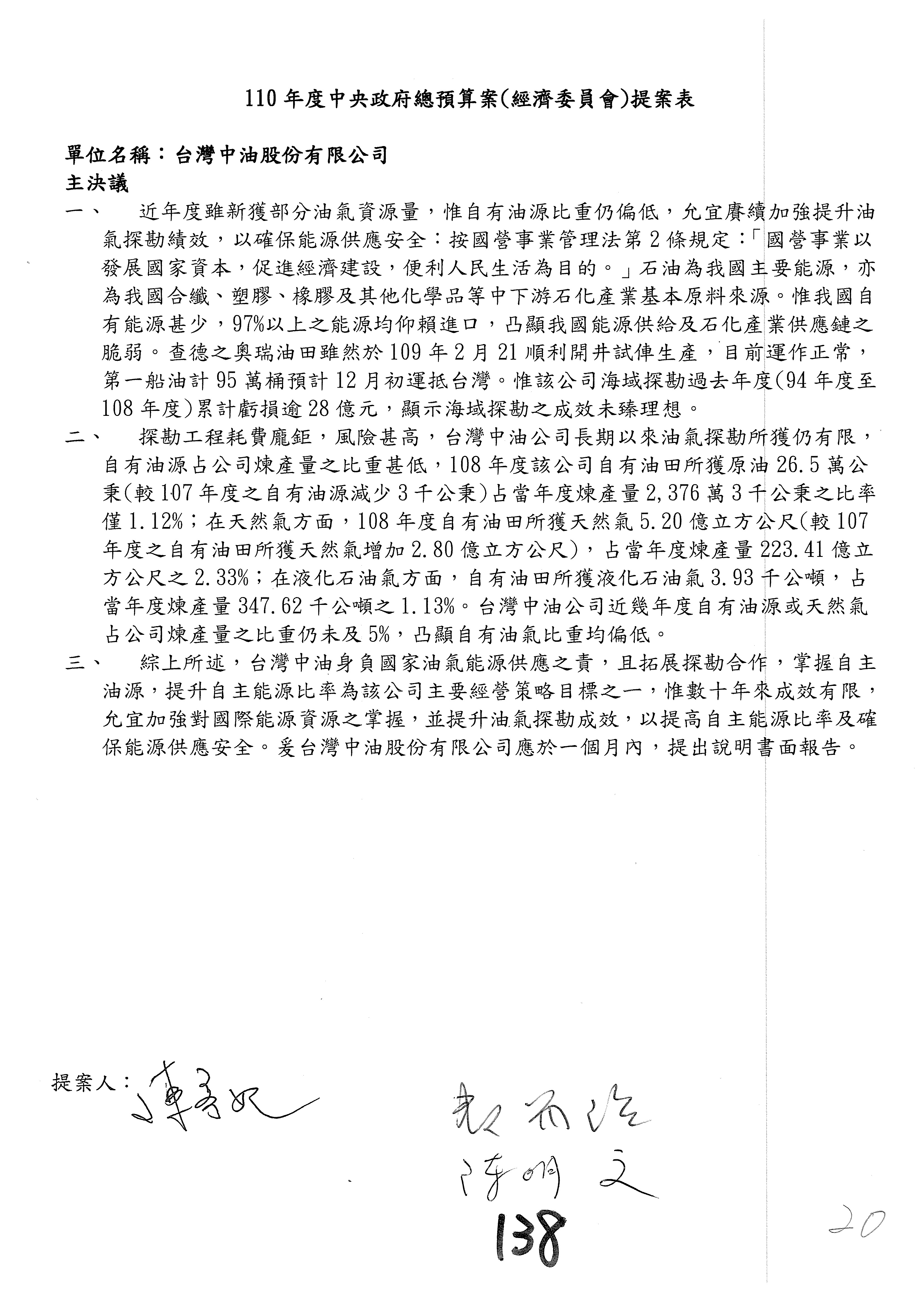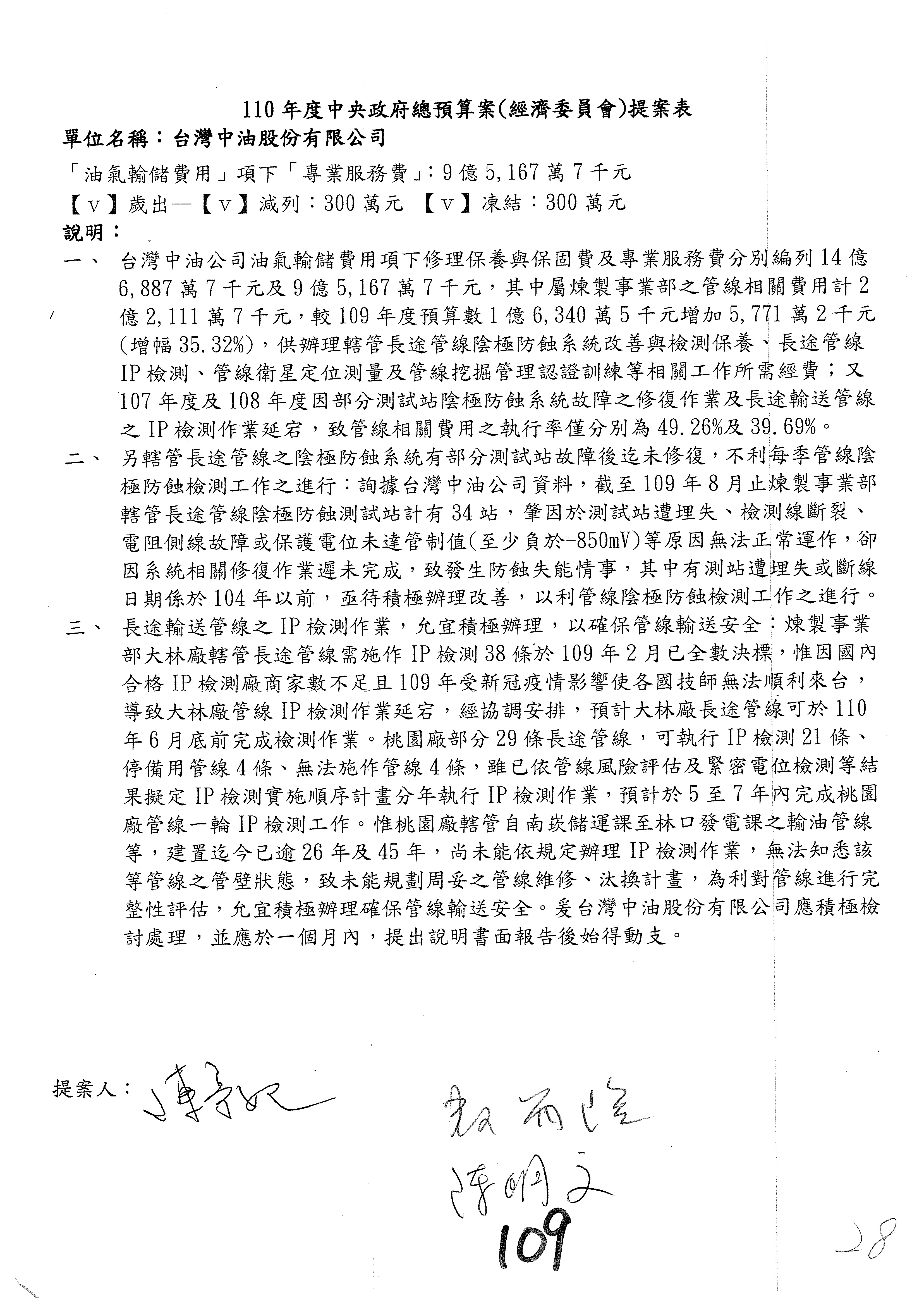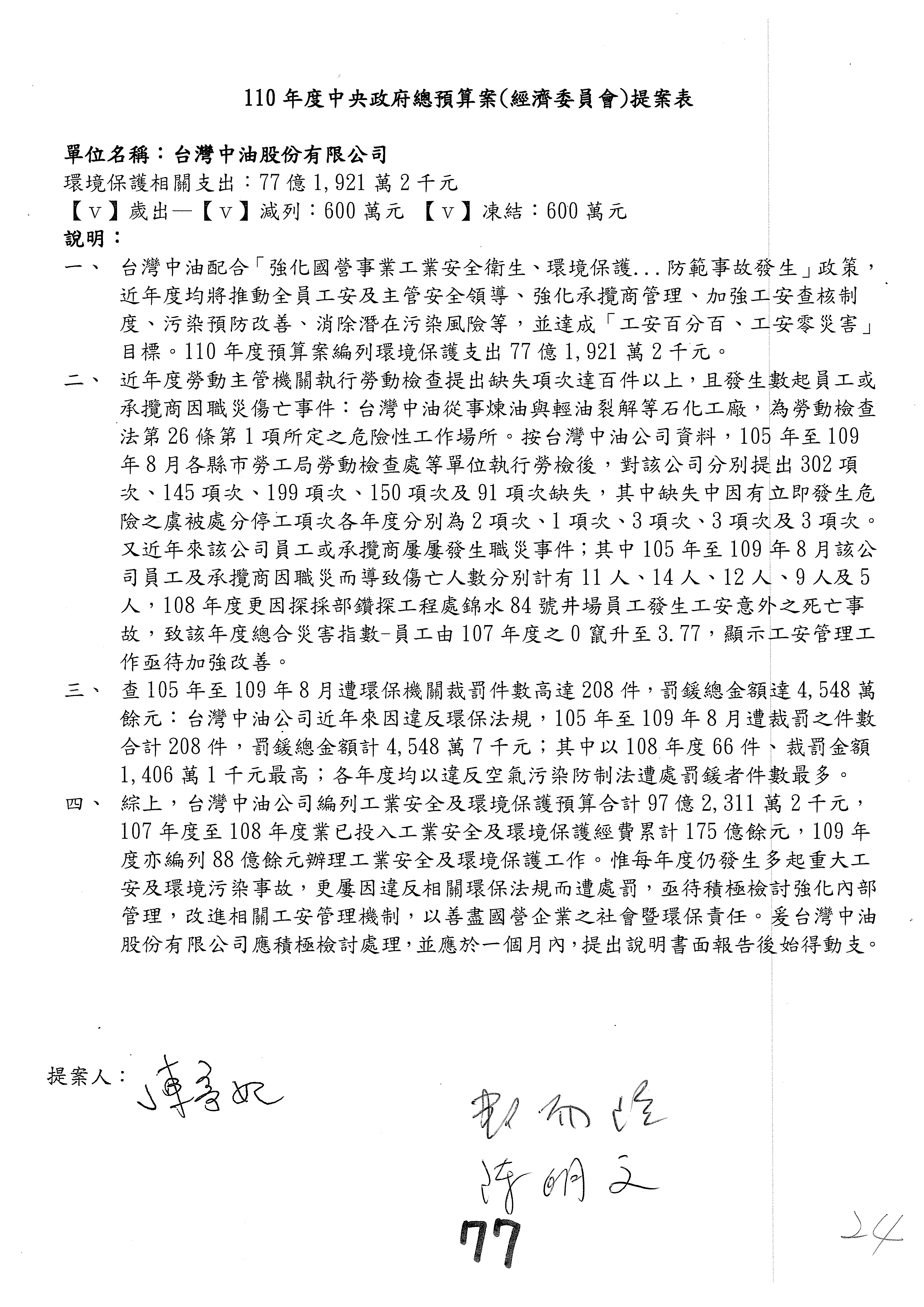 中油公司預算提案協商結論:第76案到第82案「工安環保及衛生」凍結5,000萬元,提出書面報告後始得動支;第83案到第85案為「研究發展支出」,其中第83案改主決議,「研究發展支出」凍結3億元,提出書面報告後始得動支;第86案到第88案增列「營業收入」2,000萬元;第89案減列「水電費」4,000萬元,科目自行調整;第90案到第99案減列「旅運費」900萬元,科目自行調整;第100案到第103案「印刷裝訂與廣告費」凍結2,000萬元,提出書面報告後始得動支;第104案撤案;第105案預算照列;第106案至第112案,其中第107案、第109案改主決議,「專業服務費」減列1,000萬元,科目自行調整,另凍結5,000萬元,提出書面報告後始得動支;第113案照案通過;第114案「會費」減列300萬元,科目自行調整;第115案預算照列;第116案保留送院會處理;第117案至第124案「油氣輸儲費用」減列1,000萬元,科目自行調整;第125案到第127案「探勘費用」凍結10%,提出專案報告後始得動支;第128案「管理費用」減列100萬元,科目自行調整;第129案及第130案「利息」減列600萬元;第131案到第133案「其他營業外費用」凍結1,000萬元,提出書面報告後始得動支;第134案到第136案「專案計畫」減列20億元,另凍結10億元,提出專案報告後始得動支;第137案保留送院會處理;主決議第138案至第168案均照案通過;第169案最後一句修正為「爰提案要求經濟部應將120年底的自備儲槽容積天數規定調高至30天以上」;第170案將「每季」改為「每年」;第171案也將「每季」改為「每年」;第172案「專案報告」改為「書面報告」;第173案、第174案、第175案及第175-1案均照案通過。