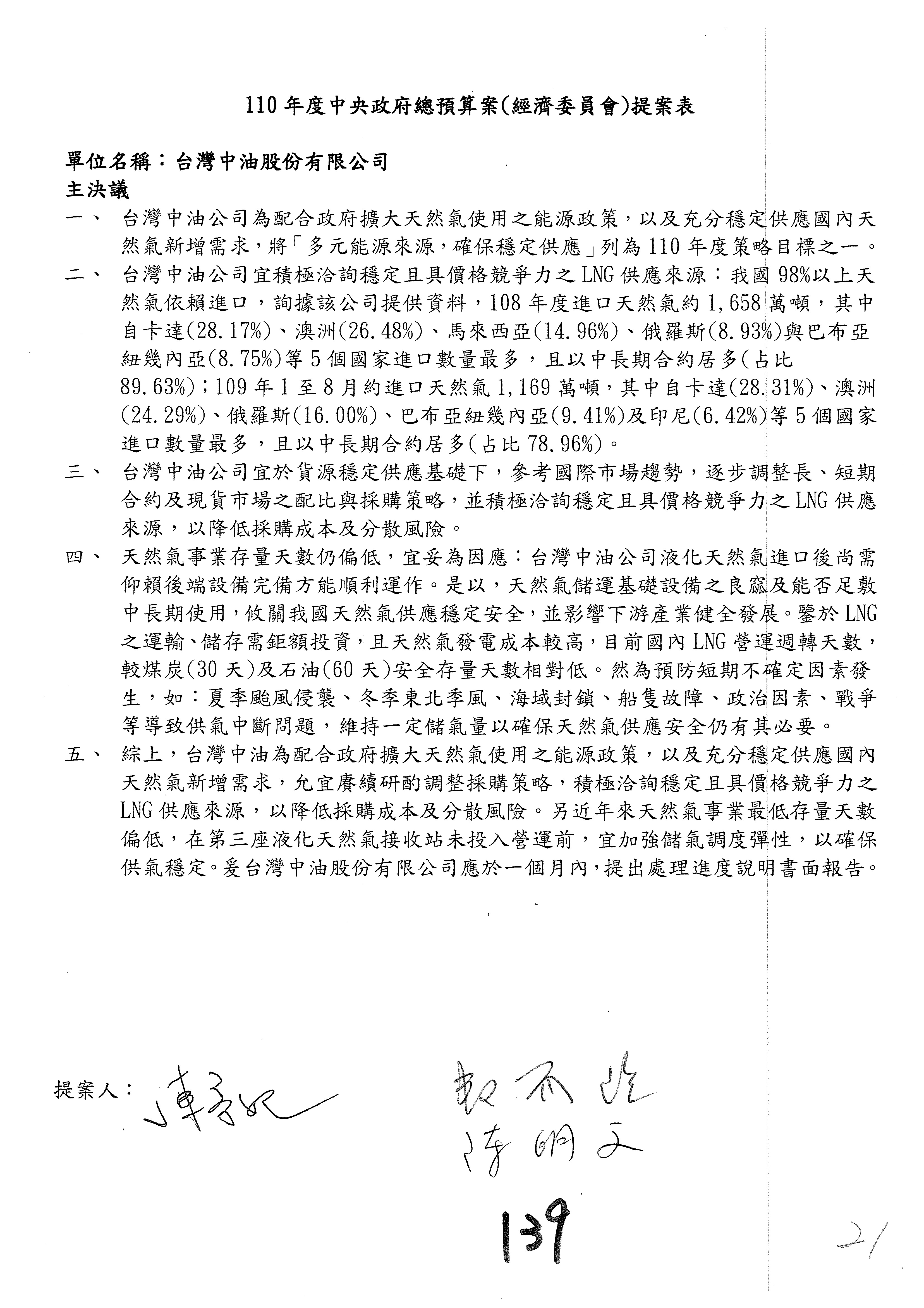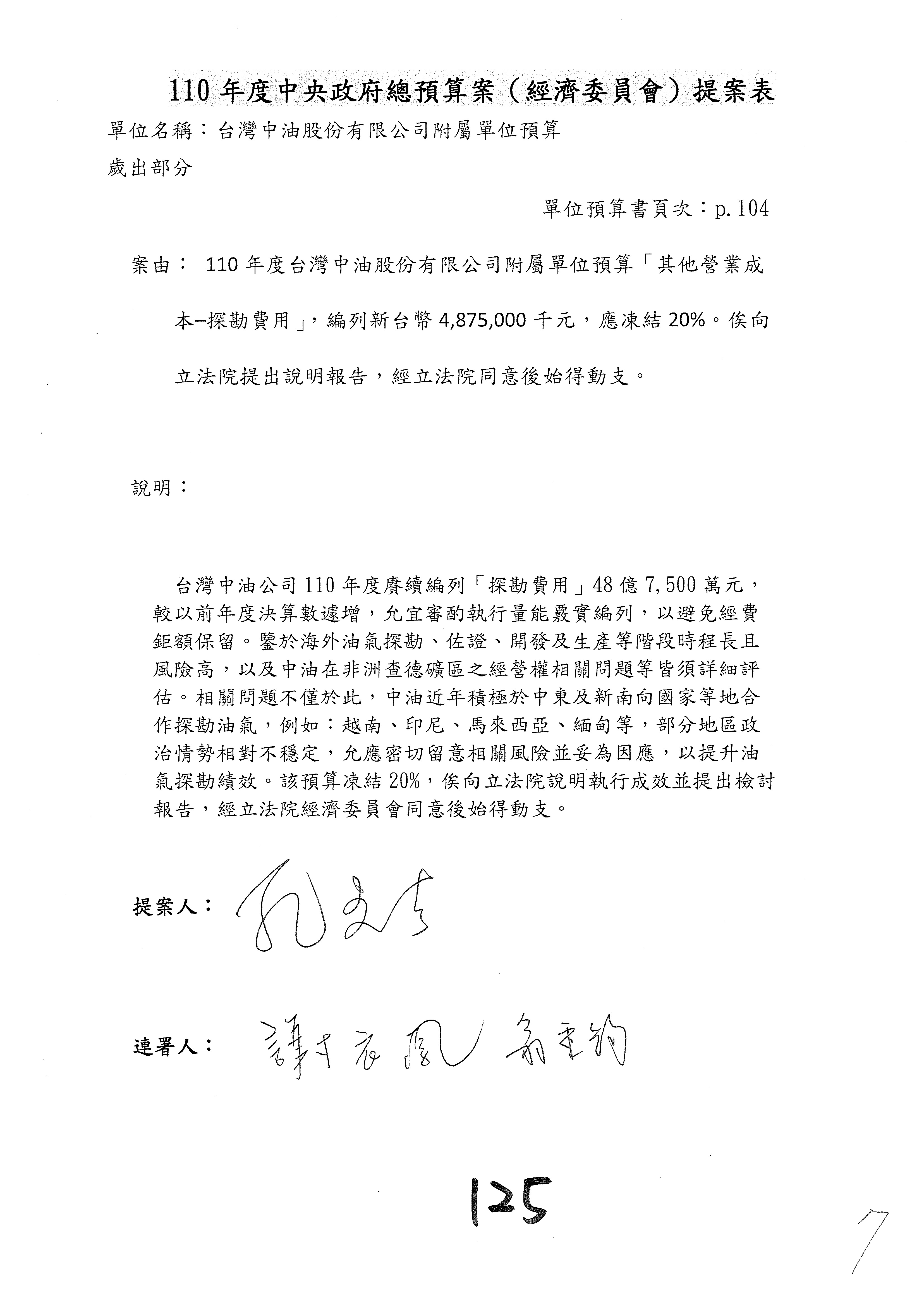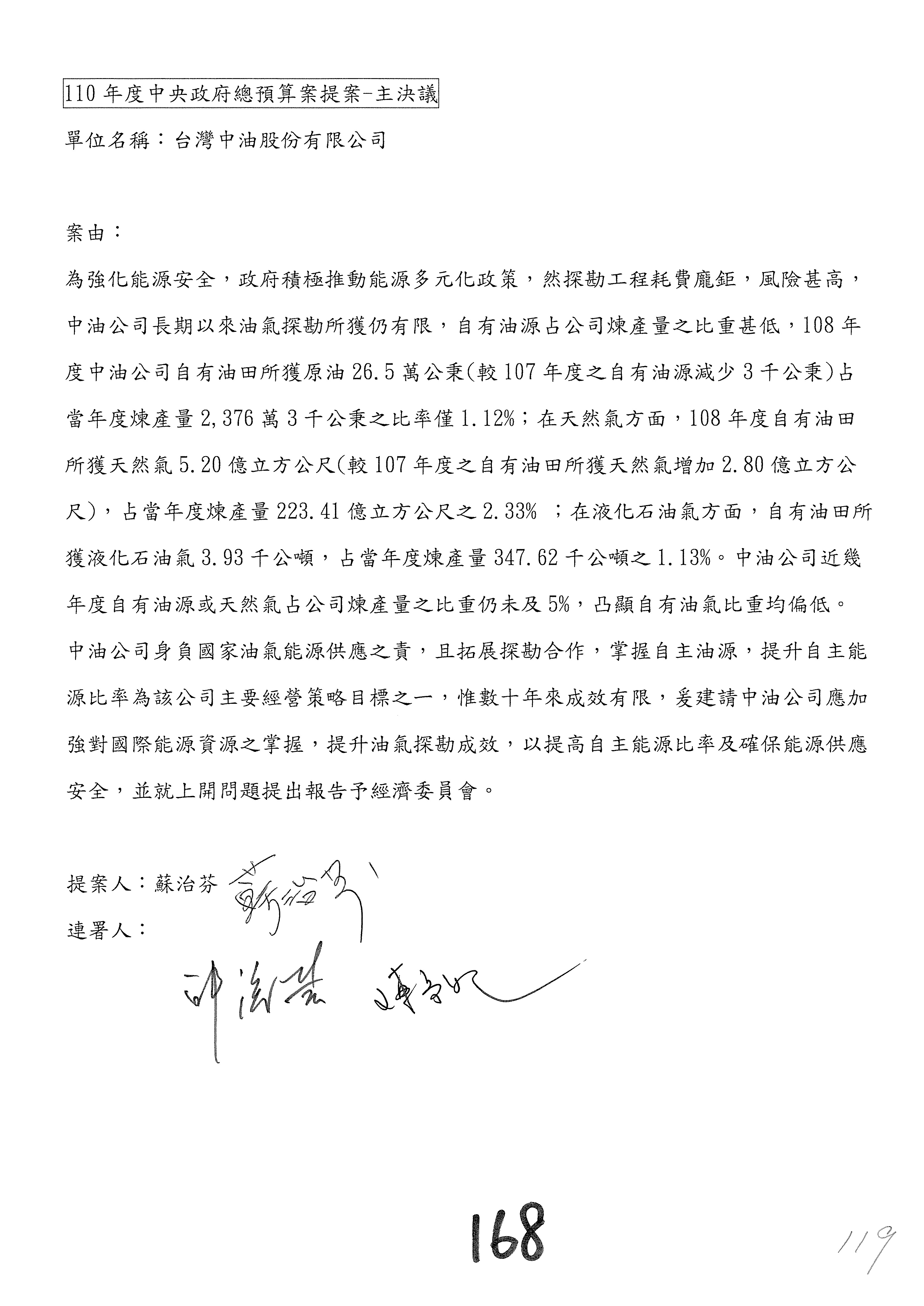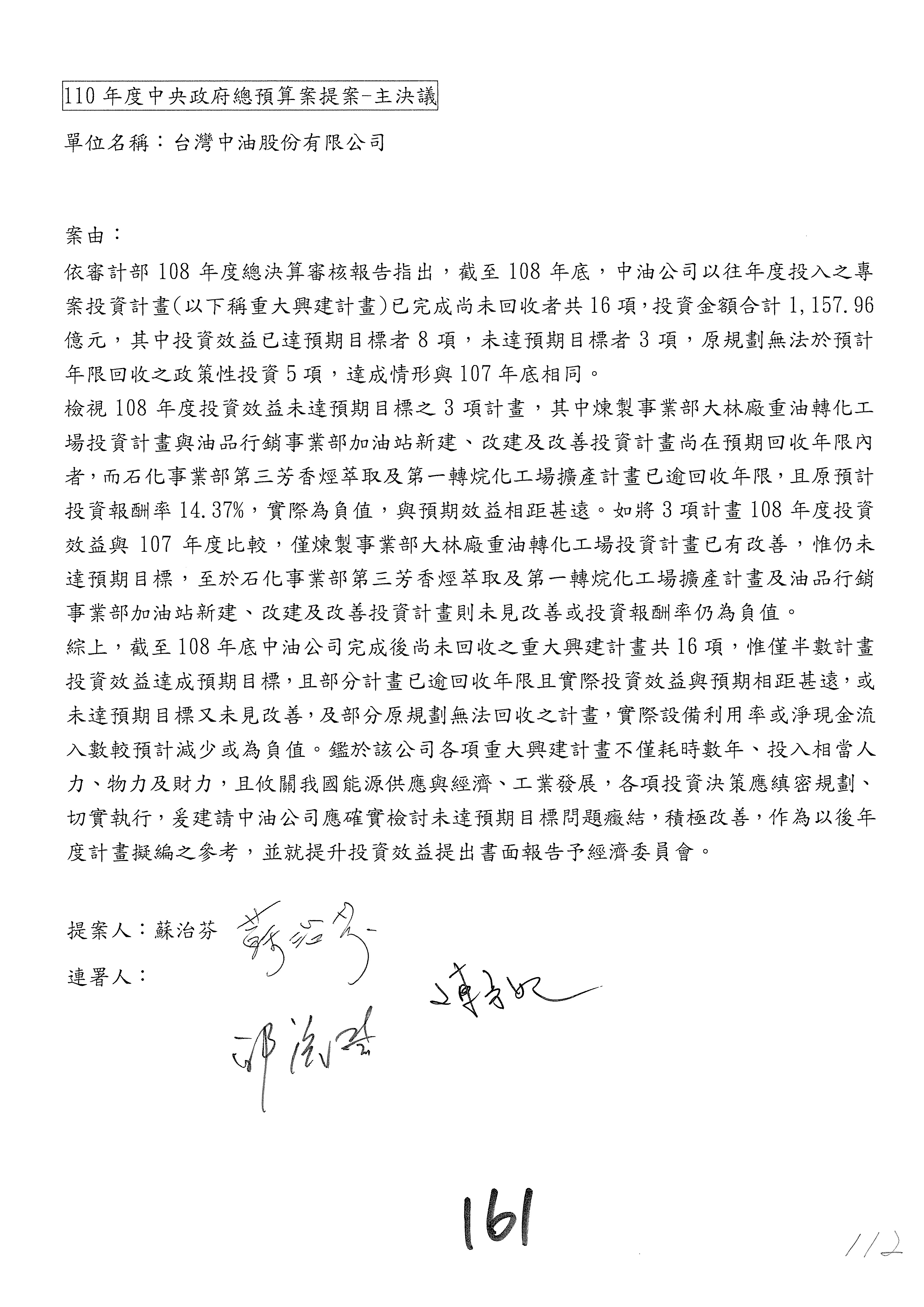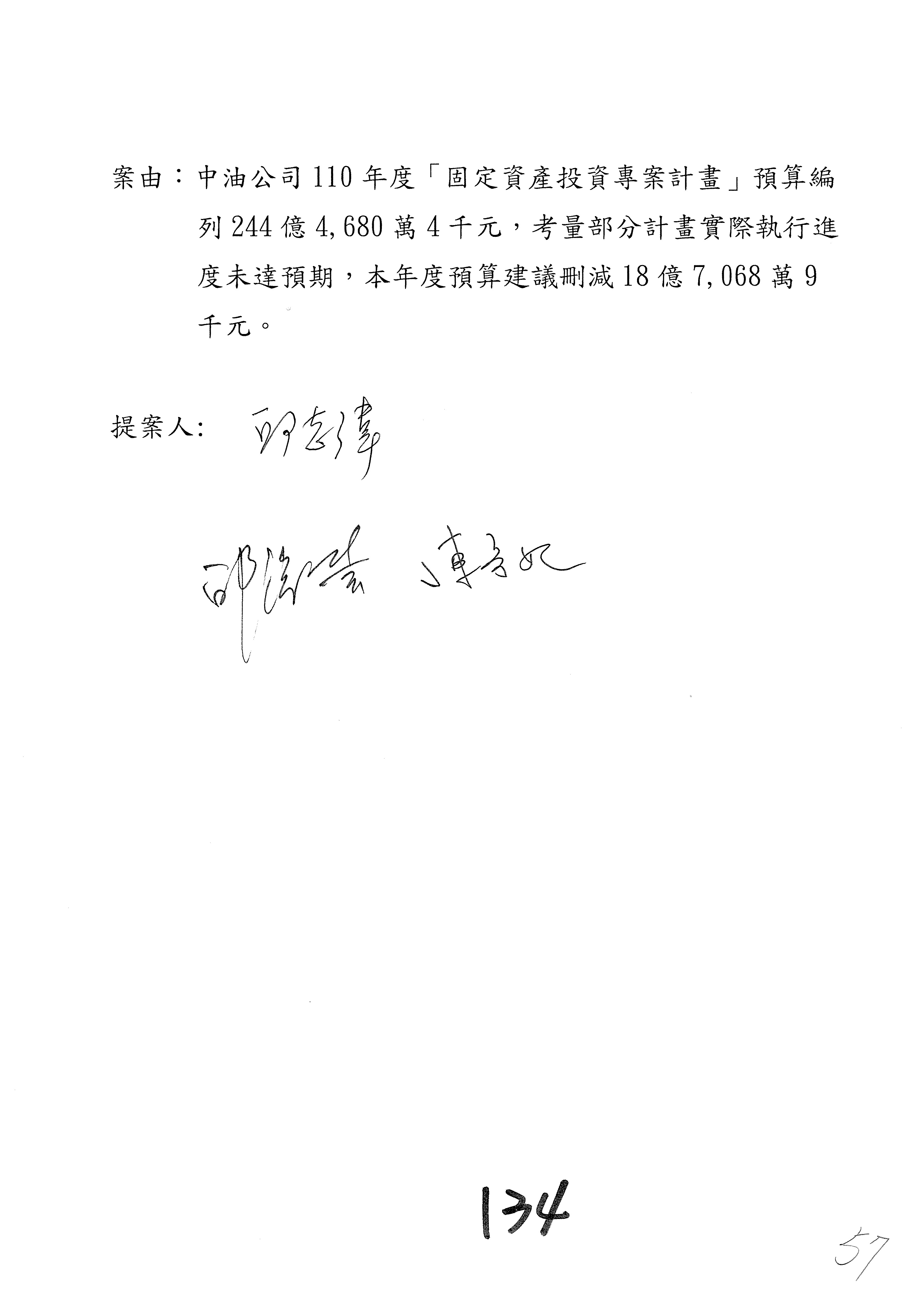 中油公司預算提案協商結論:第76案到第82案「工安環保及衛生」凍結5,000萬元,提出書面報告後始得動支;第83案到第85案為「研究發展支出」,其中第83案改主決議,「研究發展支出」凍結3億元,提出書面報告後始得動支;第86案到第88案增列「營業收入」2,000萬元;第89案減列「水電費」4,000萬元,科目自行調整;第90案到第99案減列「旅運費」900萬元,科目自行調整;第100案到第103案「印刷裝訂與廣告費」凍結2,000萬元,提出書面報告後始得動支;第104案撤案;第105案預算照列;第106案至第112案,其中第107案、第109案改主決議,「專業服務費」減列1,000萬元,科目自行調整,另凍結5,000萬元,提出書面報告後始得動支;第113案照案通過;第114案「會費」減列300萬元,科目自行調整;第115案預算照列;第116案保留送院會處理;第117案至第124案「油氣輸儲費用」減列1,000萬元,科目自行調整;第125案到第127案「探勘費用」凍結10%,提出專案報告後始得動支;第128案「管理費用」減列100萬元,科目自行調整;第129案及第130案「利息」減列600萬元;第131案到第133案「其他營業外費用」凍結1,000萬元,提出書面報告後始得動支;第134案到第136案「專案計畫」減列20億元,另凍結10億元,提出專案報告後始得動支;第137案保留送院會處理;主決議第138案至第168案均照案通過;第169案最後一句修正為「爰提案要求經濟部應將120年底的自備儲槽容積天數規定調高至30天以上」;第170案將「每季」改為「每年」;第171案也將「每季」改為「每年」;第172案「專案報告」改為「書面報告」;第173案、第174案、第175案及第175-1案均照案通過。