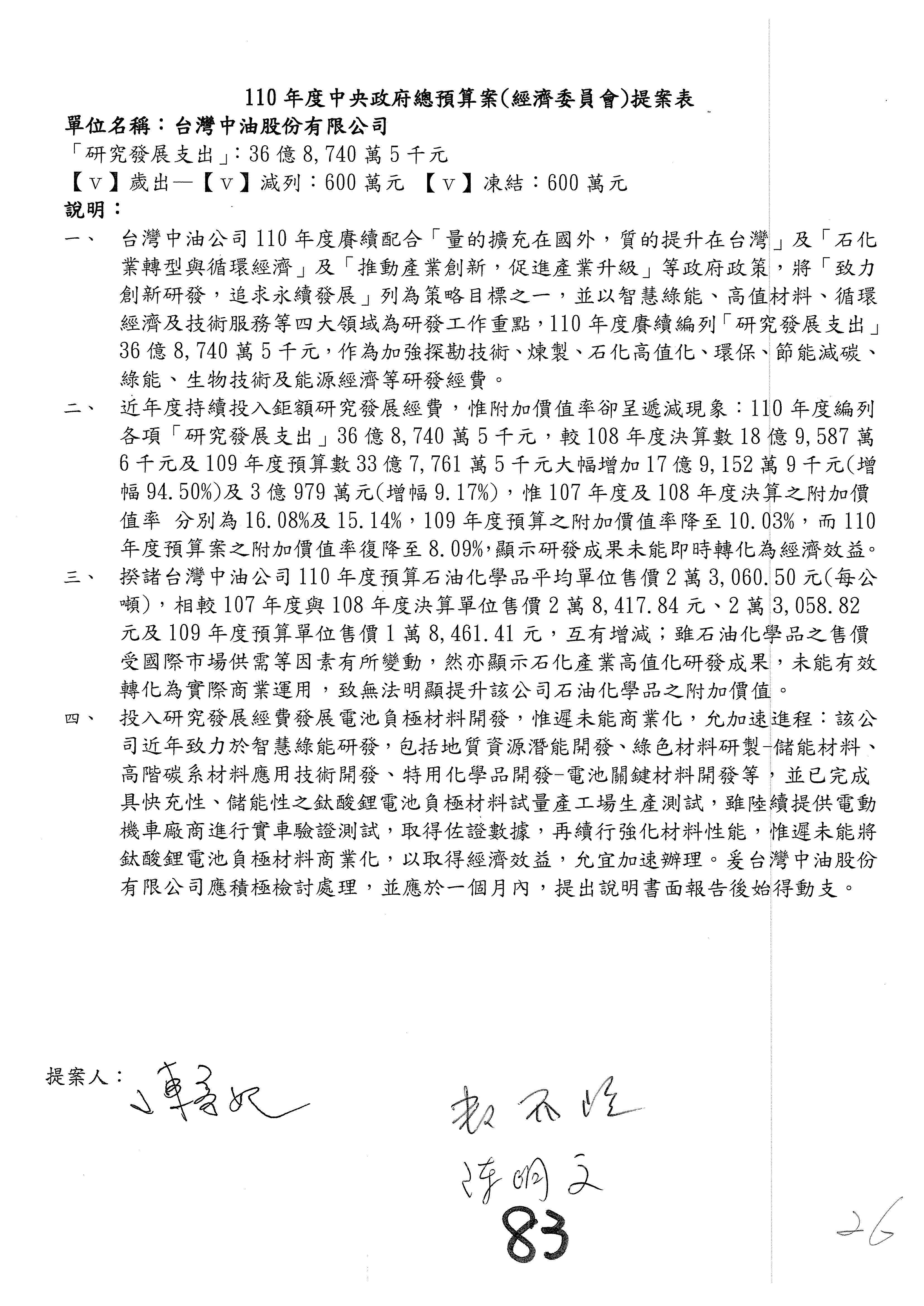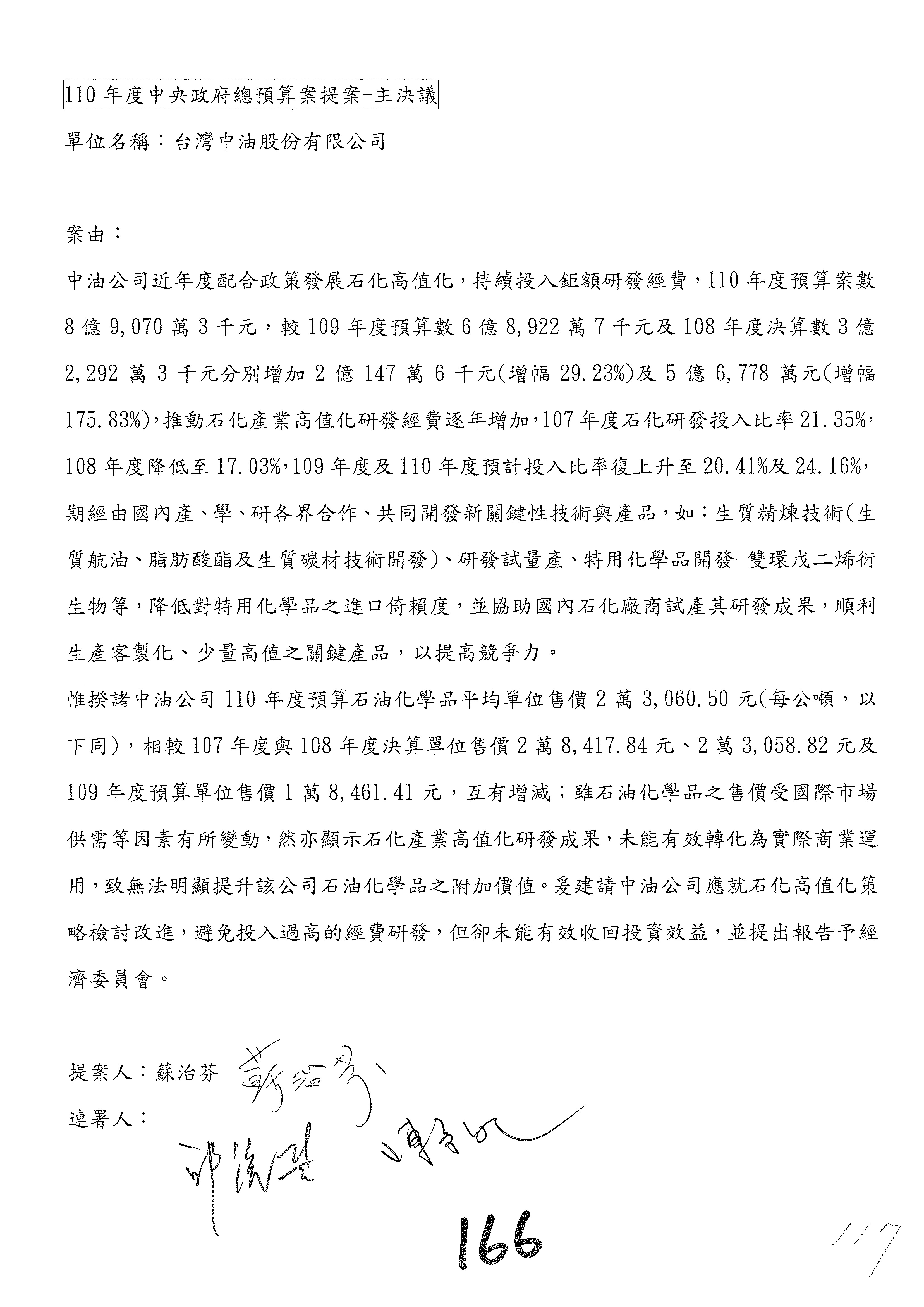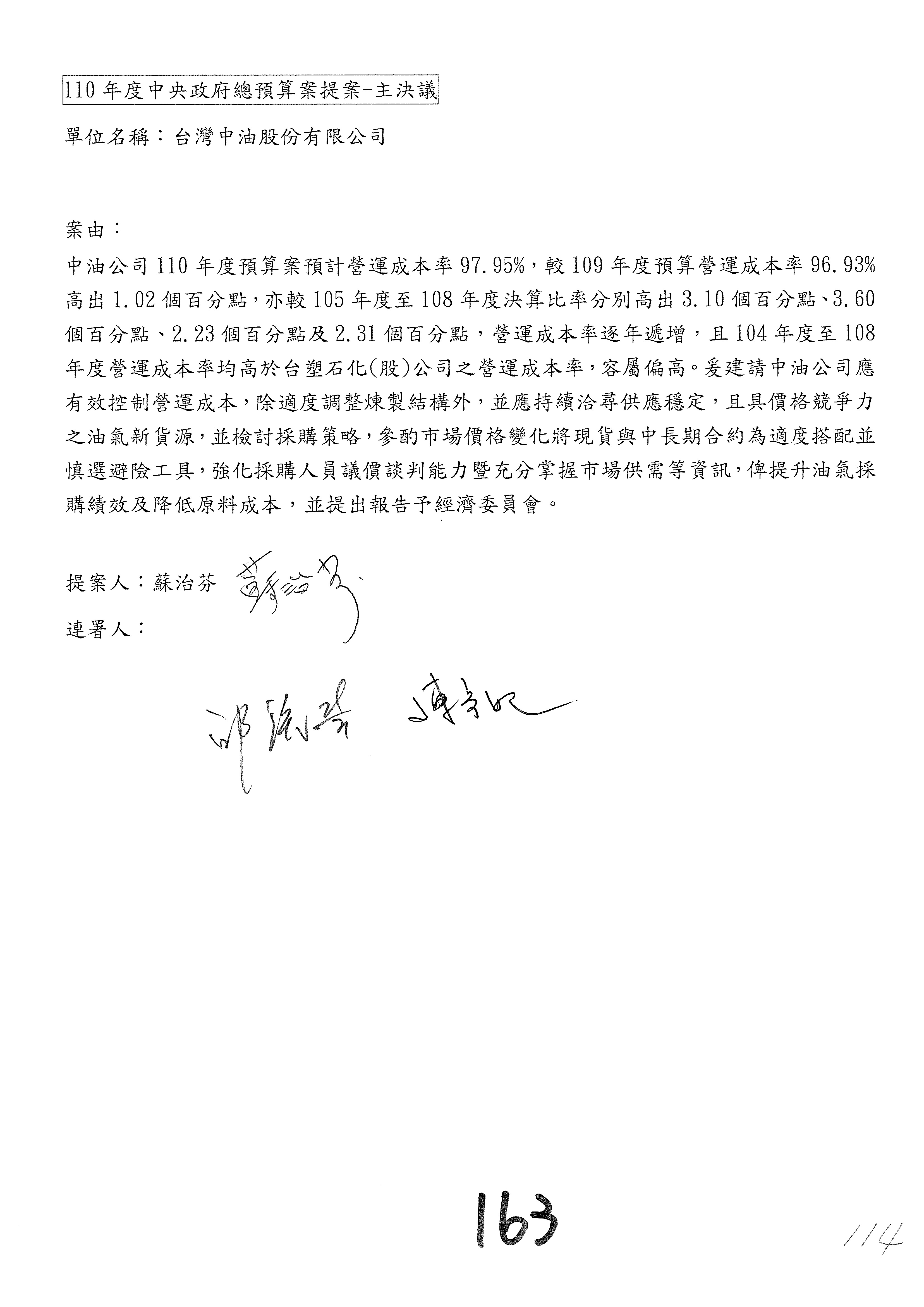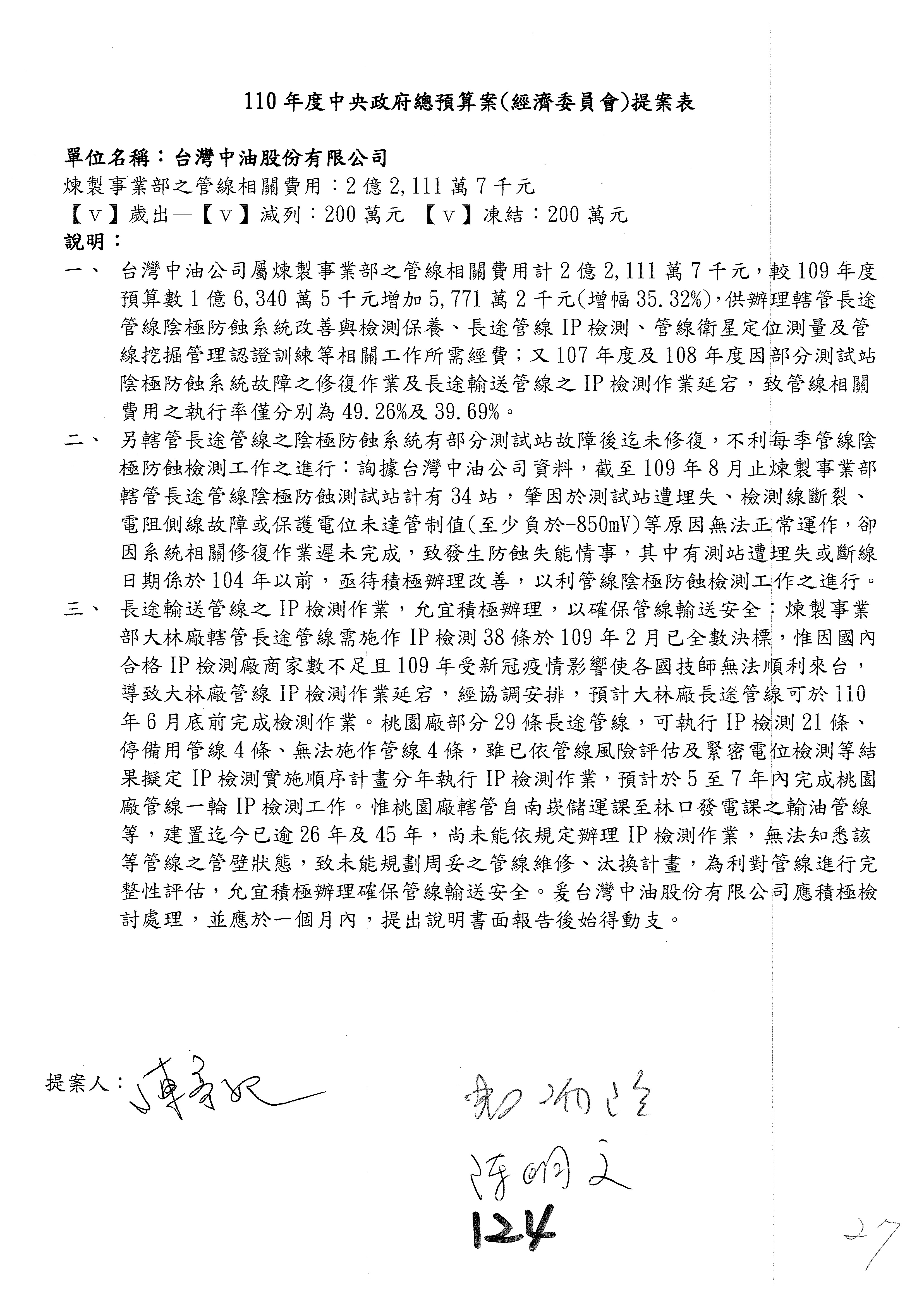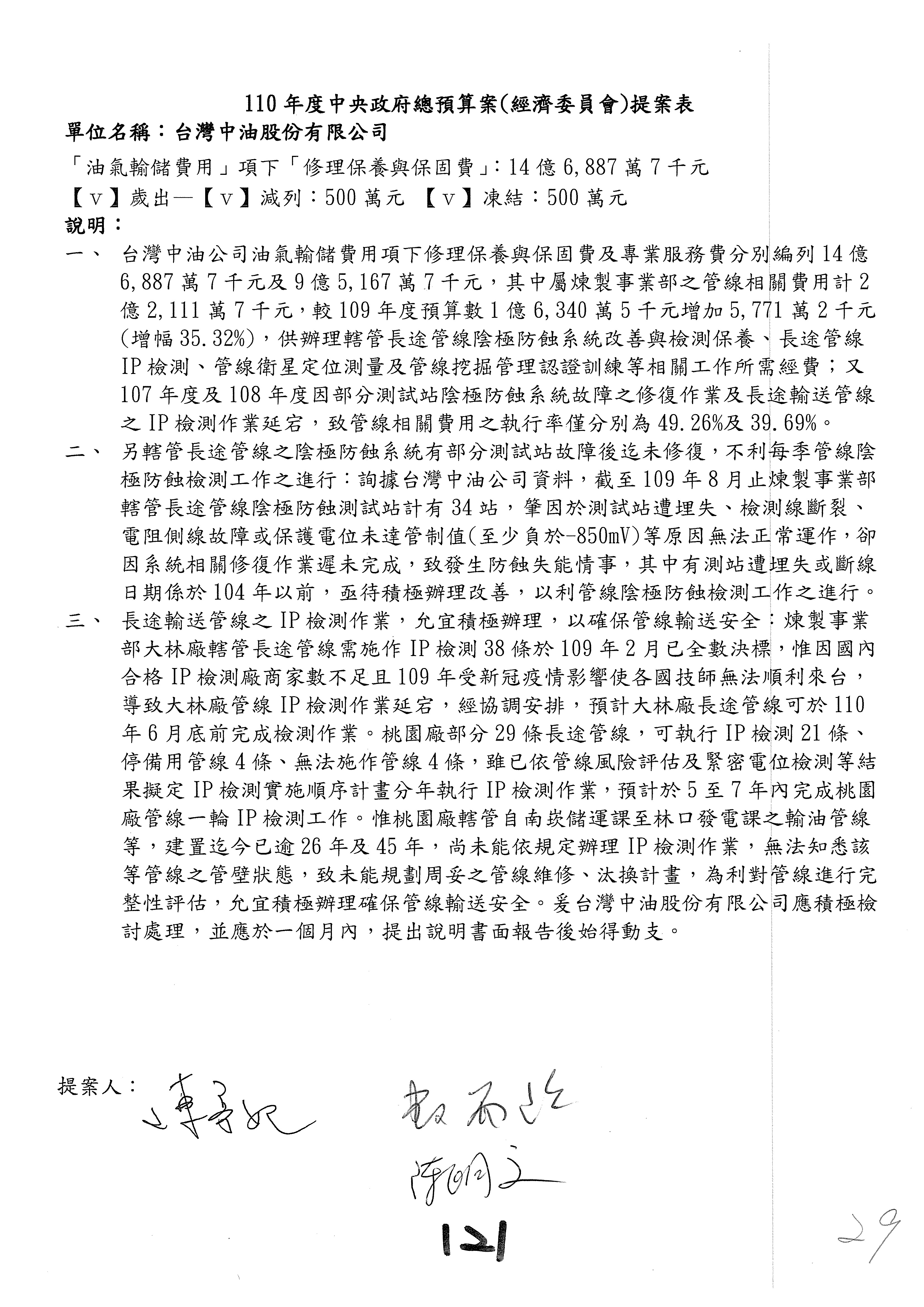 中油公司預算提案協商結論:第76案到第82案「工安環保及衛生」凍結5,000萬元,提出書面報告後始得動支;第83案到第85案為「研究發展支出」,其中第83案改主決議,「研究發展支出」凍結3億元,提出書面報告後始得動支;第86案到第88案增列「營業收入」2,000萬元;第89案減列「水電費」4,000萬元,科目自行調整;第90案到第99案減列「旅運費」900萬元,科目自行調整;第100案到第103案「印刷裝訂與廣告費」凍結2,000萬元,提出書面報告後始得動支;第104案撤案;第105案預算照列;第106案至第112案,其中第107案、第109案改主決議,「專業服務費」減列1,000萬元,科目自行調整,另凍結5,000萬元,提出書面報告後始得動支;第113案照案通過;第114案「會費」減列300萬元,科目自行調整;第115案預算照列;第116案保留送院會處理;第117案至第124案「油氣輸儲費用」減列1,000萬元,科目自行調整;第125案到第127案「探勘費用」凍結10%,提出專案報告後始得動支;第128案「管理費用」減列100萬元,科目自行調整;第129案及第130案「利息」減列600萬元;第131案到第133案「其他營業外費用」凍結1,000萬元,提出書面報告後始得動支;第134案到第136案「專案計畫」減列20億元,另凍結10億元,提出專案報告後始得動支;第137案保留送院會處理;主決議第138案至第168案均照案通過;第169案最後一句修正為「爰提案要求經濟部應將120年底的自備儲槽容積天數規定調高至30天以上」;第170案將「每季」改為「每年」;第171案也將「每季」改為「每年」;第172案「專案報告」改為「書面報告」;第173案、第174案、第175案及第175-1案均照案通過。