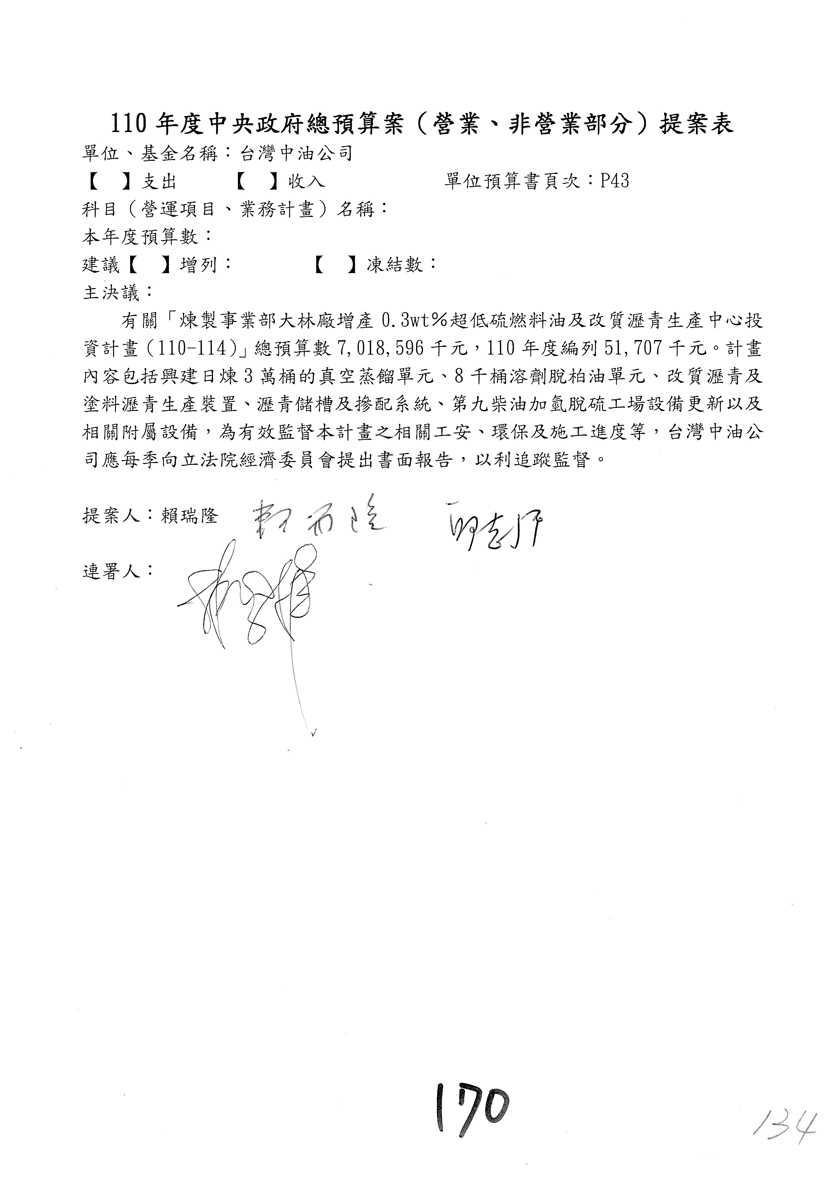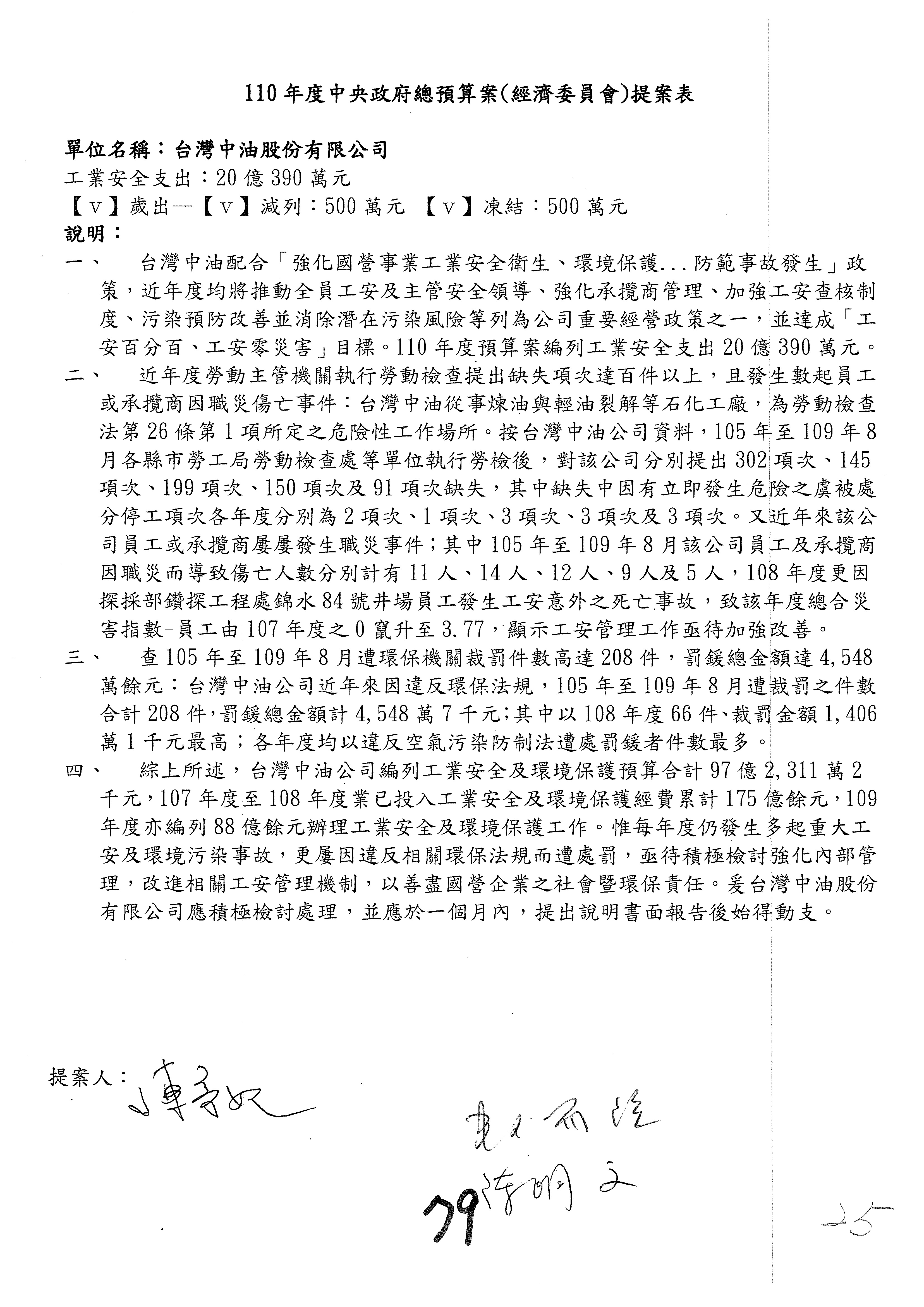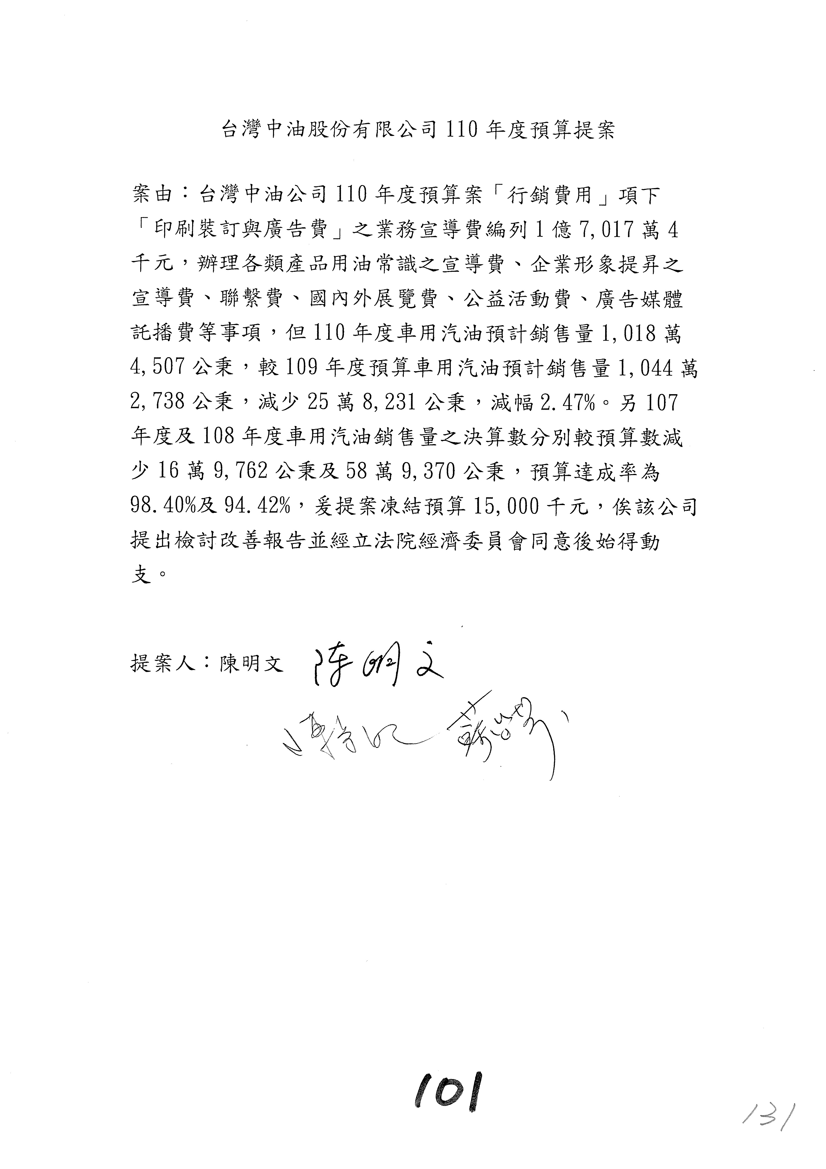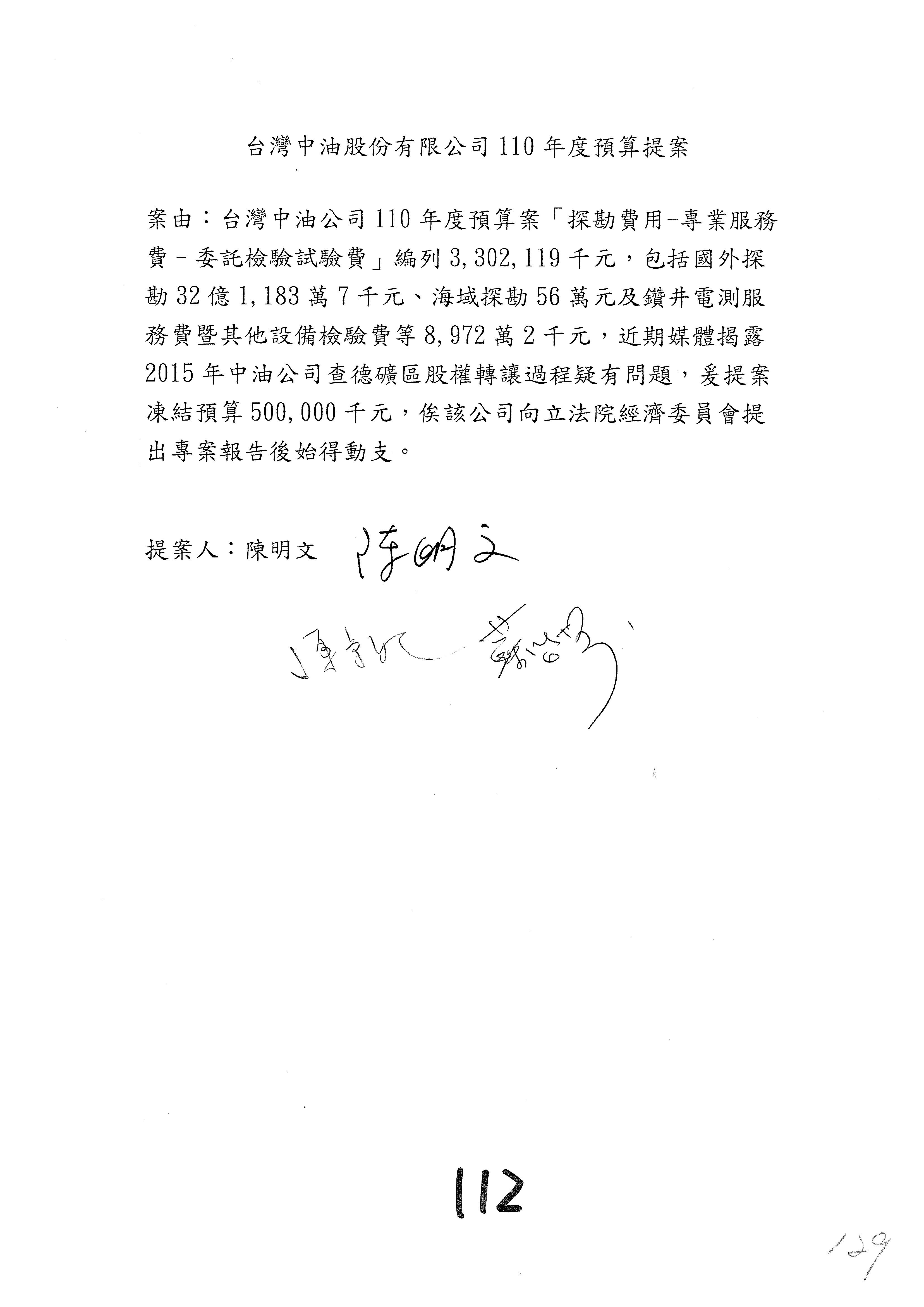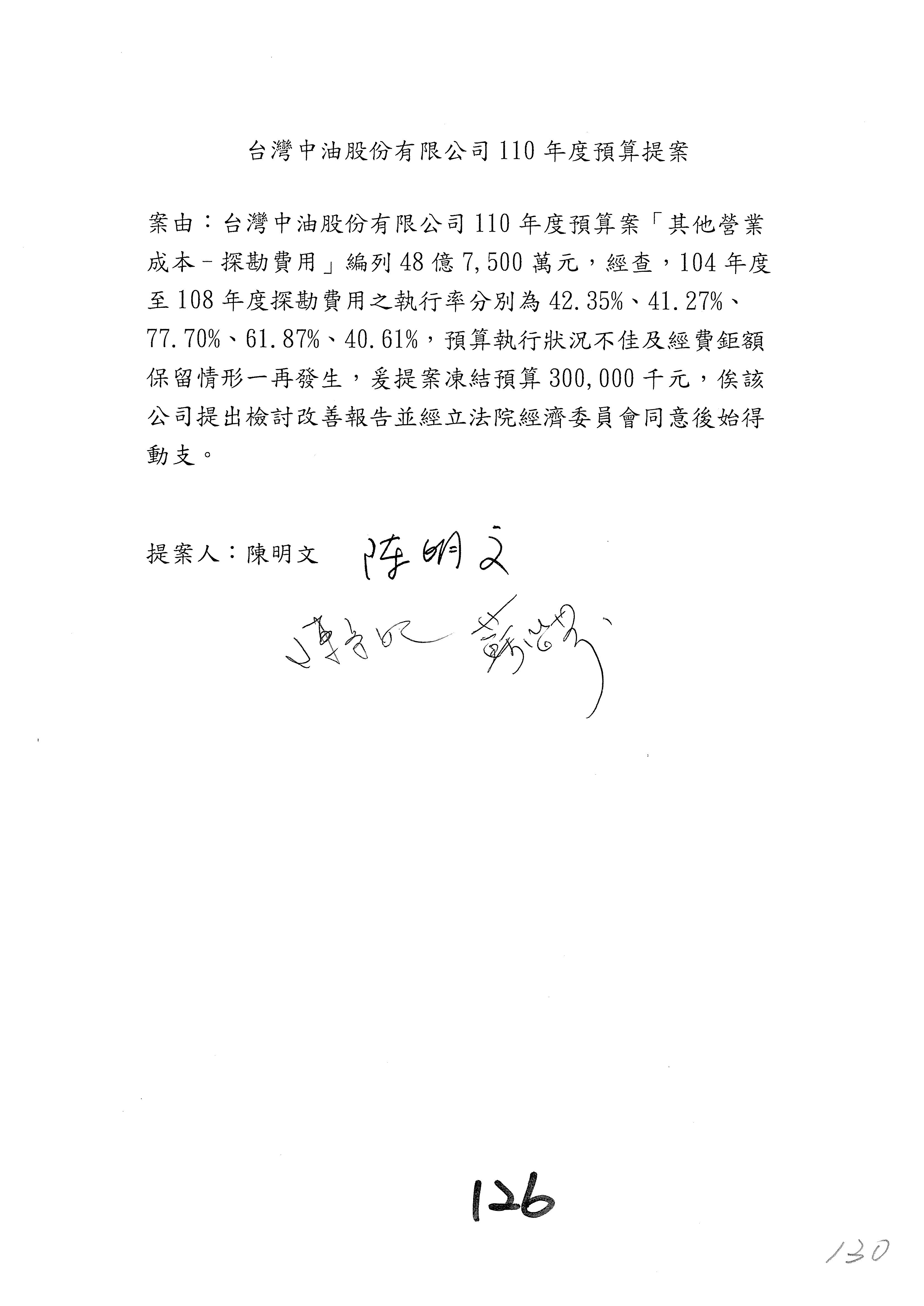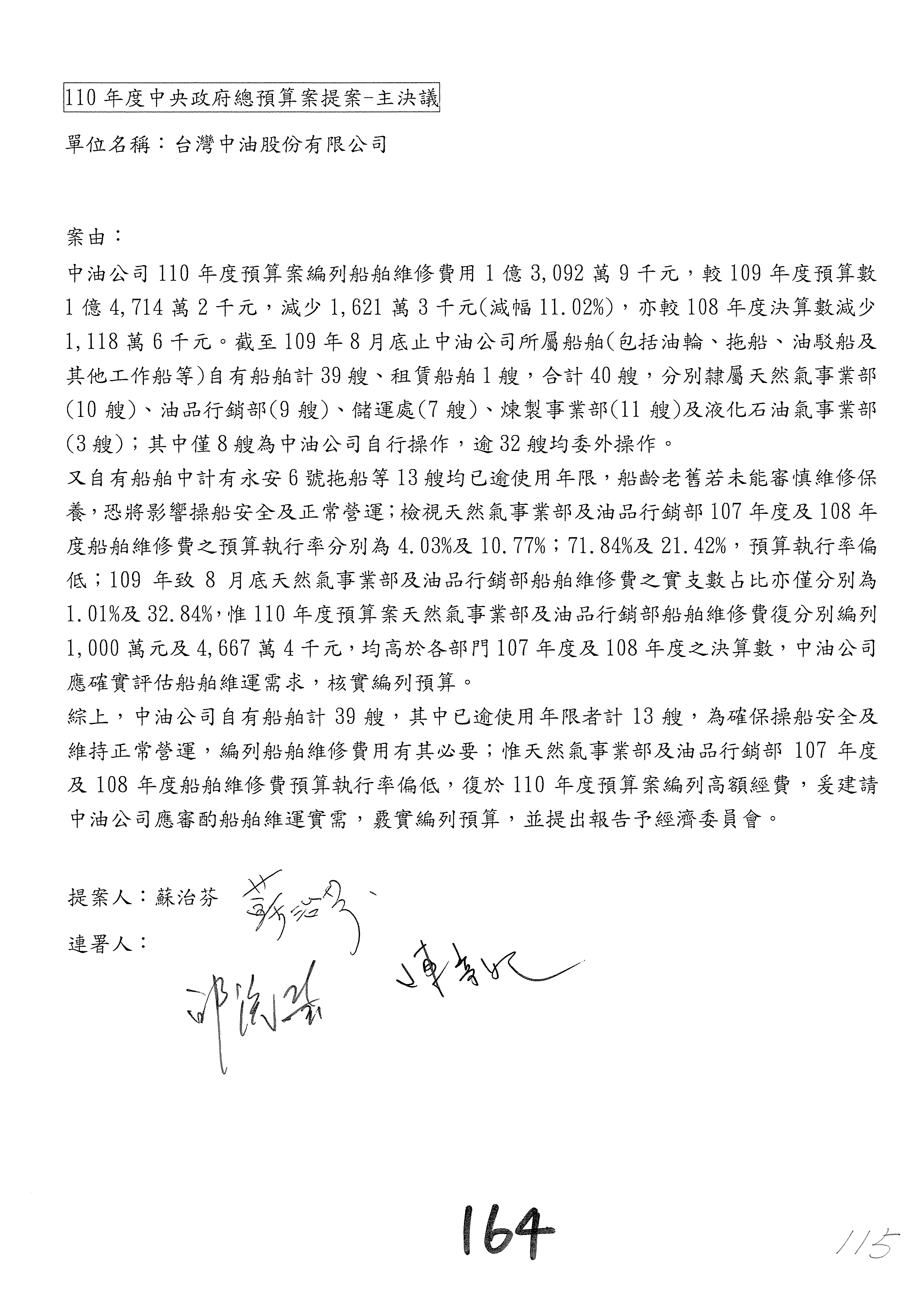 中油公司預算提案協商結論:第76案到第82案「工安環保及衛生」凍結5,000萬元,提出書面報告後始得動支;第83案到第85案為「研究發展支出」,其中第83案改主決議,「研究發展支出」凍結3億元,提出書面報告後始得動支;第86案到第88案增列「營業收入」2,000萬元;第89案減列「水電費」4,000萬元,科目自行調整;第90案到第99案減列「旅運費」900萬元,科目自行調整;第100案到第103案「印刷裝訂與廣告費」凍結2,000萬元,提出書面報告後始得動支;第104案撤案;第105案預算照列;第106案至第112案,其中第107案、第109案改主決議,「專業服務費」減列1,000萬元,科目自行調整,另凍結5,000萬元,提出書面報告後始得動支;第113案照案通過;第114案「會費」減列300萬元,科目自行調整;第115案預算照列;第116案保留送院會處理;第117案至第124案「油氣輸儲費用」減列1,000萬元,科目自行調整;第125案到第127案「探勘費用」凍結10%,提出專案報告後始得動支;第128案「管理費用」減列100萬元,科目自行調整;第129案及第130案「利息」減列600萬元;第131案到第133案「其他營業外費用」凍結1,000萬元,提出書面報告後始得動支;第134案到第136案「專案計畫」減列20億元,另凍結10億元,提出專案報告後始得動支;第137案保留送院會處理;主決議第138案至第168案均照案通過;第169案最後一句修正為「爰提案要求經濟部應將120年底的自備儲槽容積天數規定調高至30天以上」;第170案將「每季」改為「每年」;第171案也將「每季」改為「每年」;第172案「專案報告」改為「書面報告」;第173案、第174案、第175案及第175-1案均照案通過。