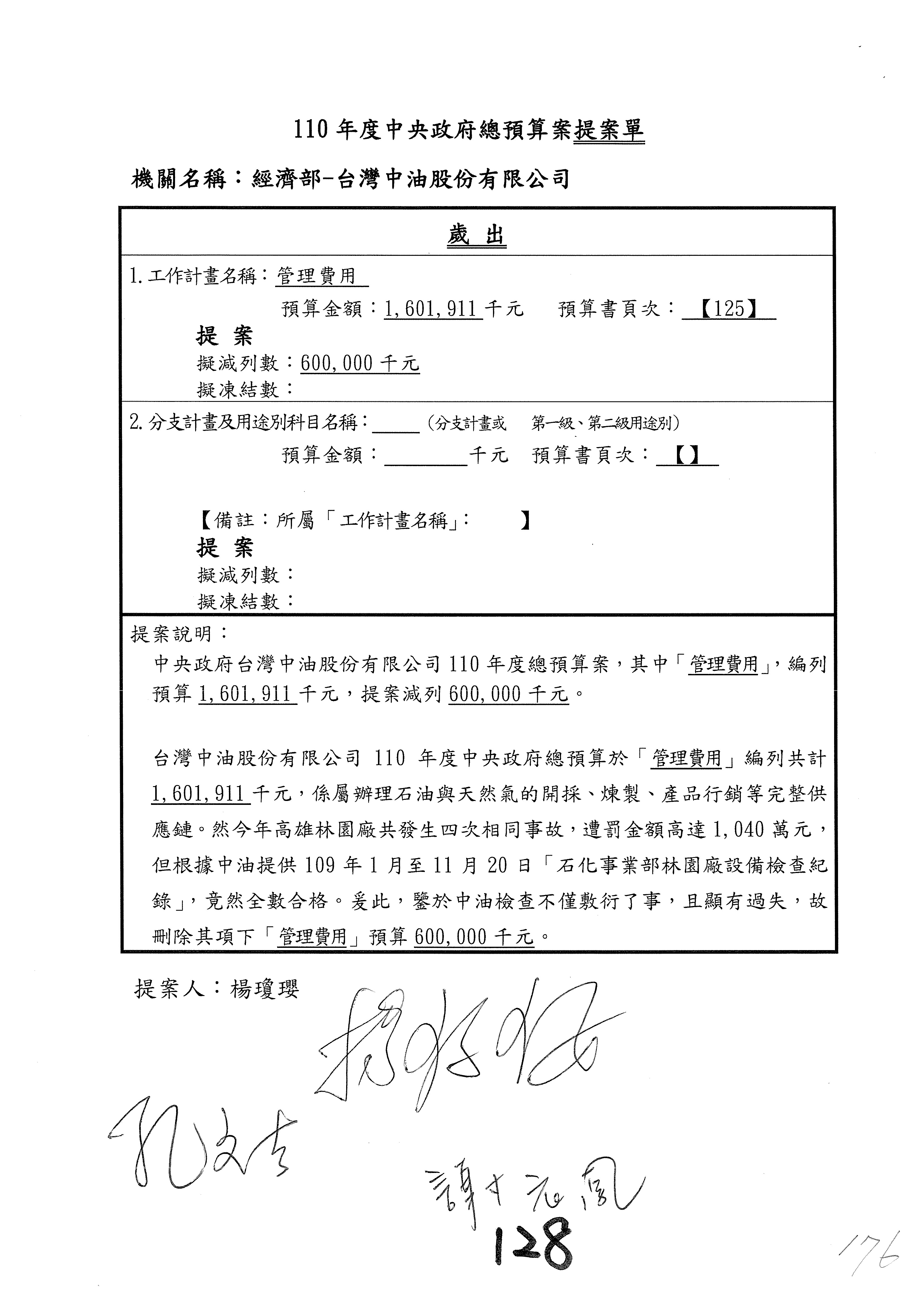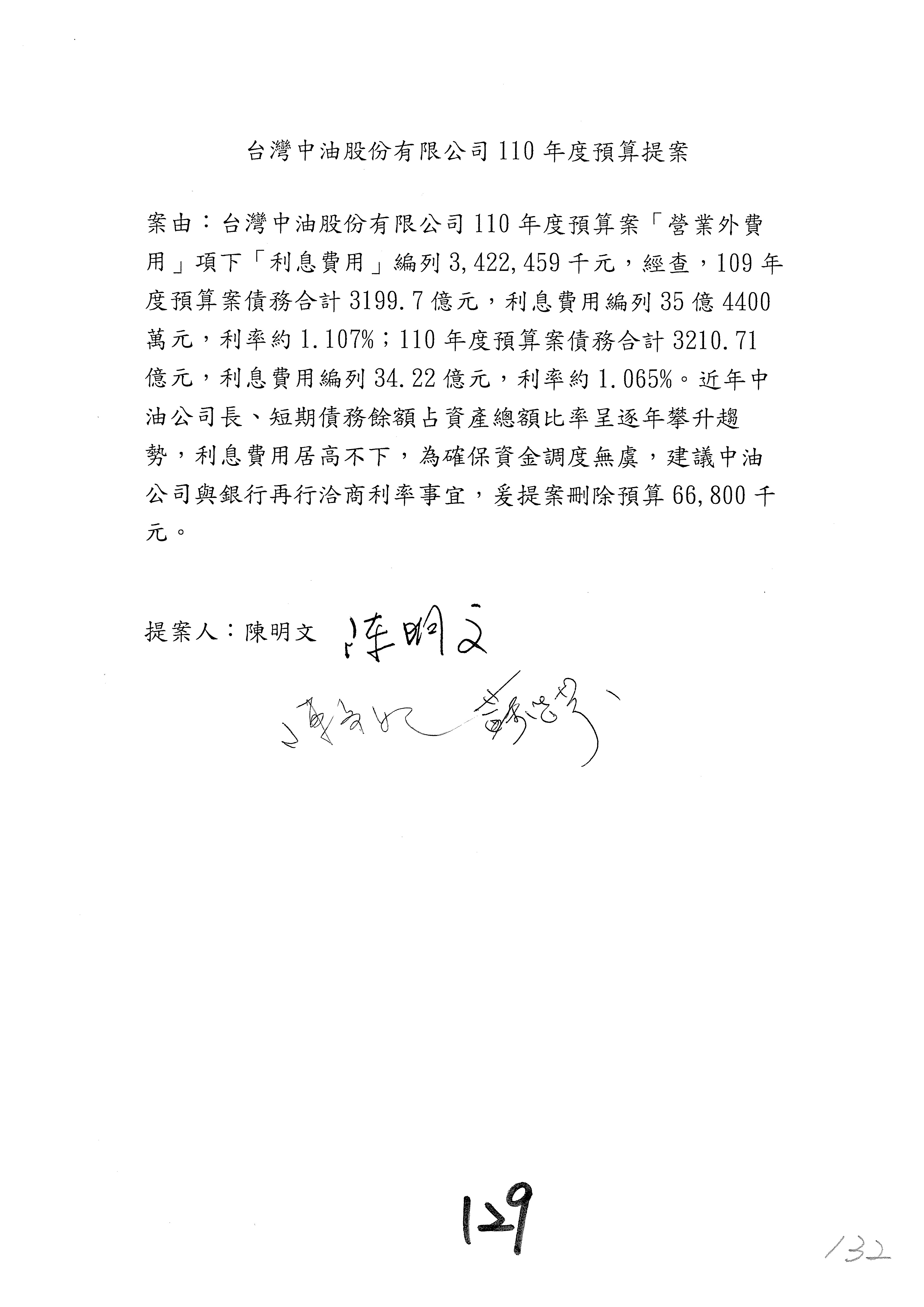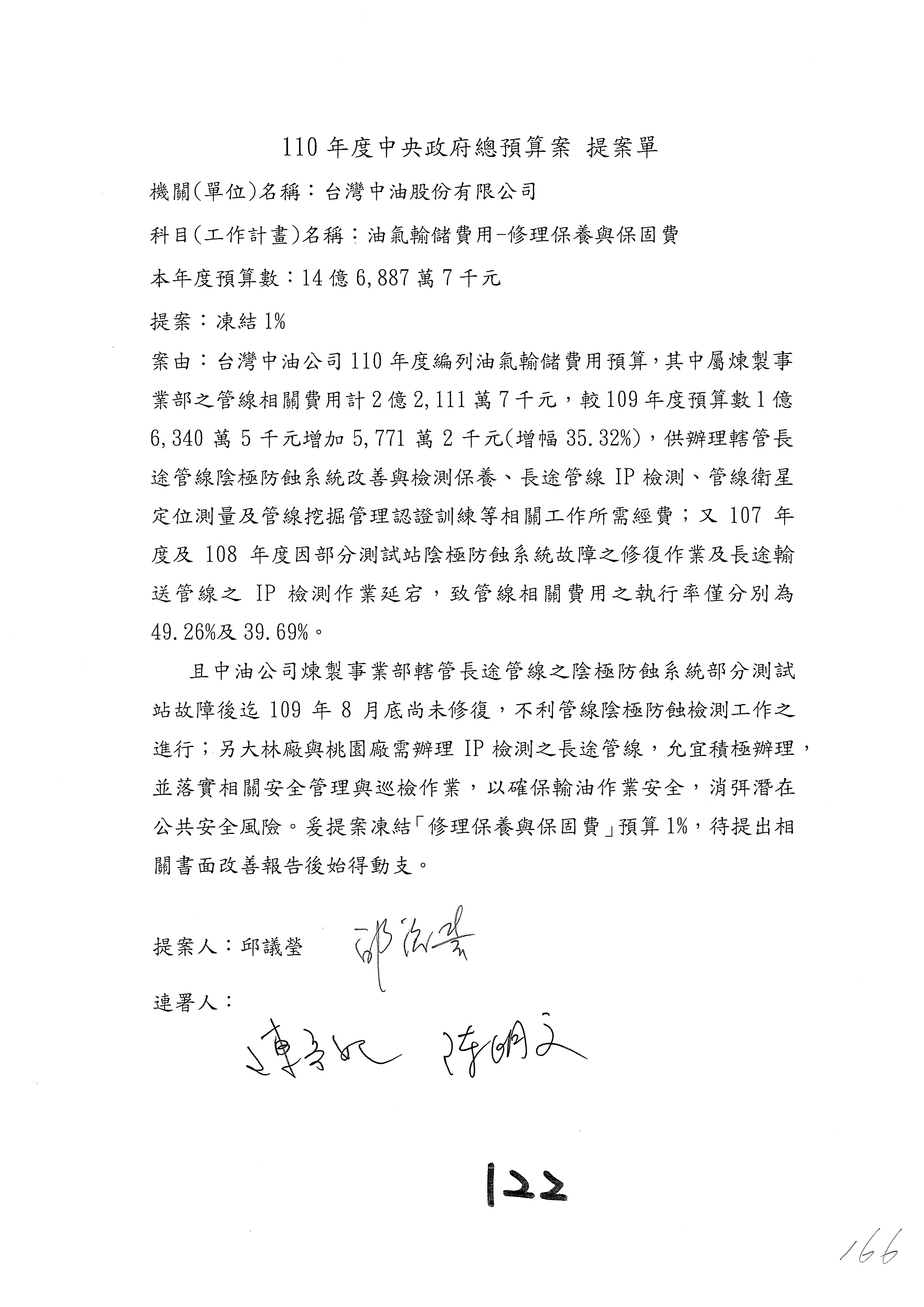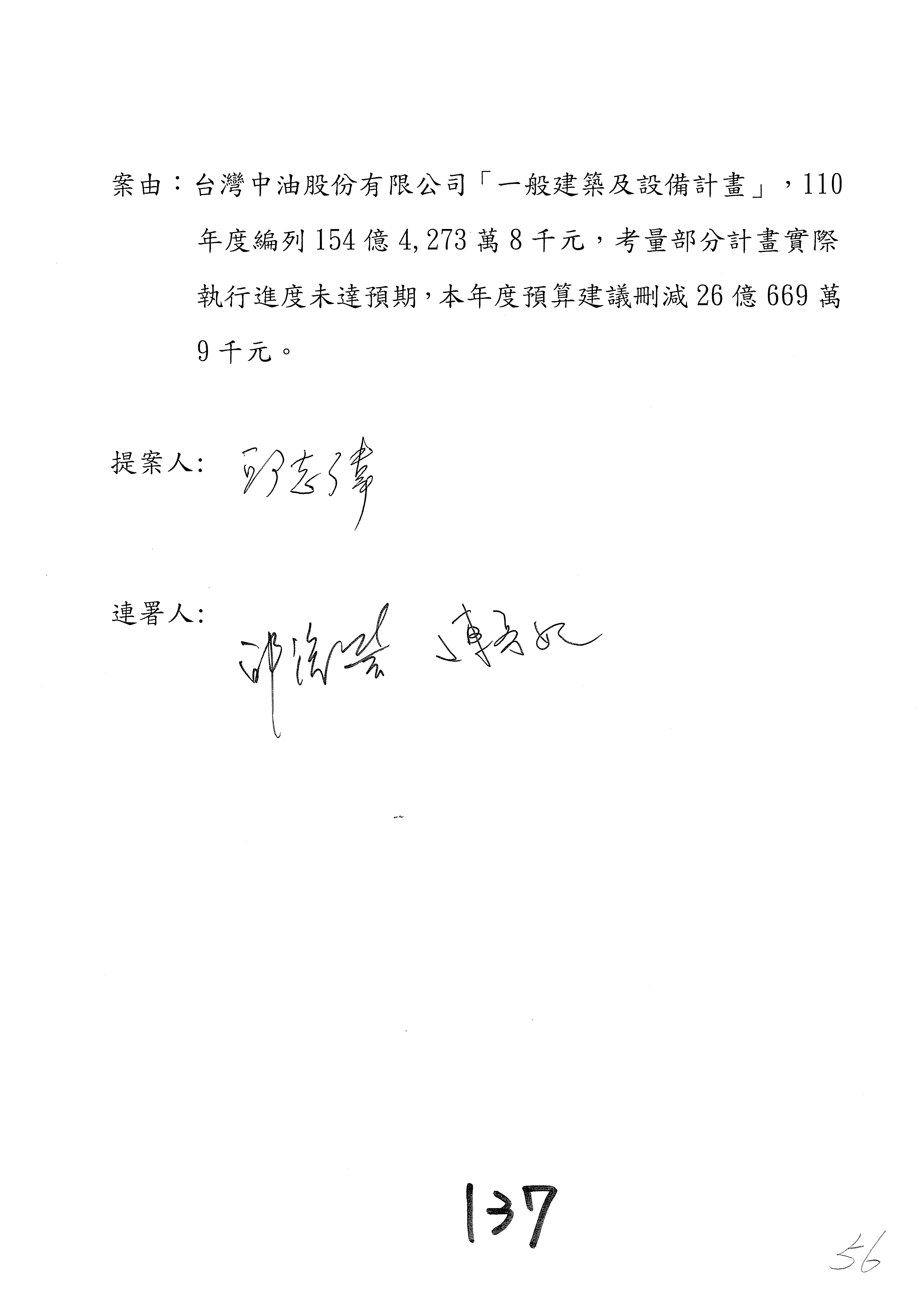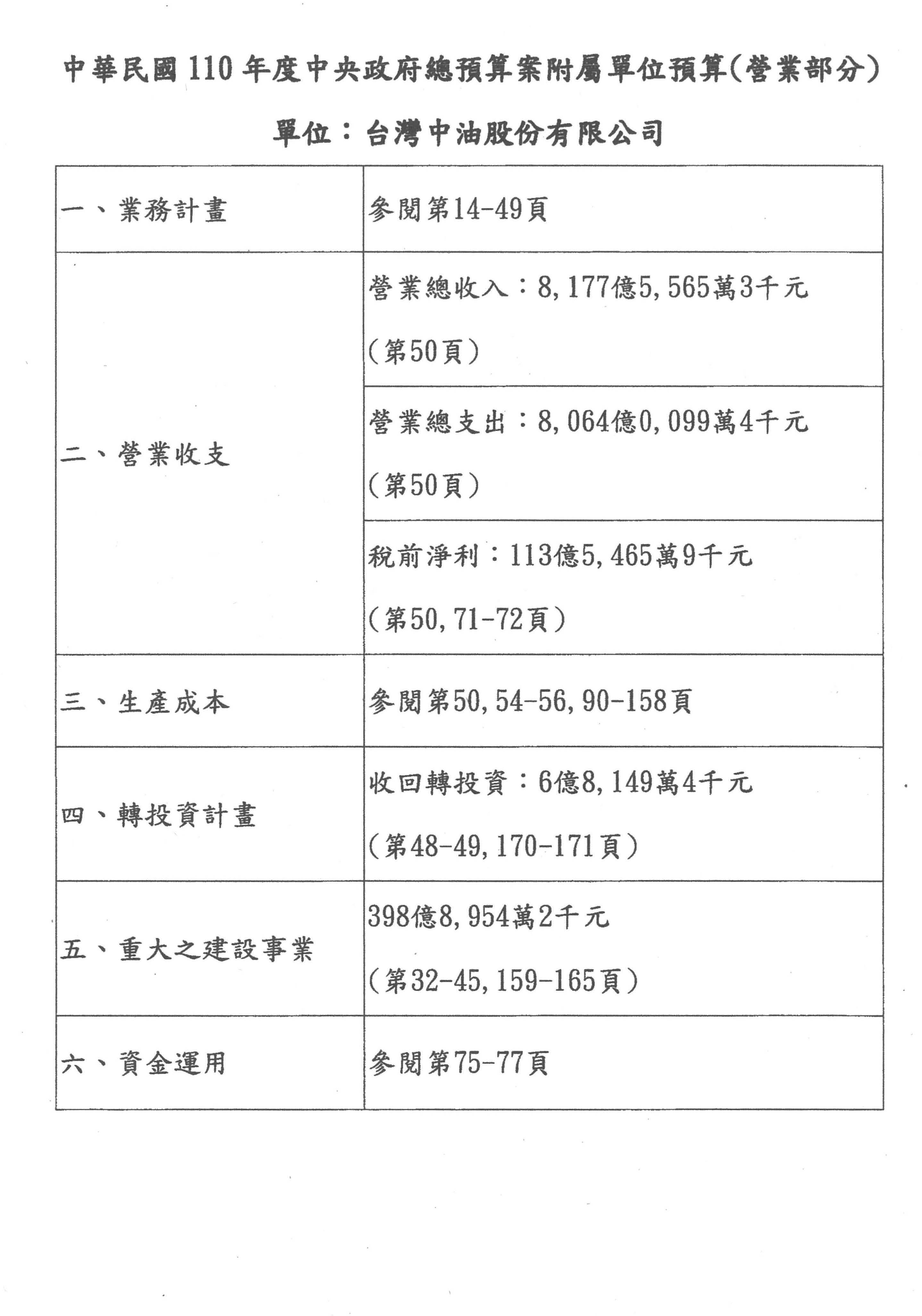 中油公司預算提案協商結論:第76案到第82案「工安環保及衛生」凍結5,000萬元,提出書面報告後始得動支;第83案到第85案為「研究發展支出」,其中第83案改主決議,「研究發展支出」凍結3億元,提出書面報告後始得動支;第86案到第88案增列「營業收入」2,000萬元;第89案減列「水電費」4,000萬元,科目自行調整;第90案到第99案減列「旅運費」900萬元,科目自行調整;第100案到第103案「印刷裝訂與廣告費」凍結2,000萬元,提出書面報告後始得動支;第104案撤案;第105案預算照列;第106案至第112案,其中第107案、第109案改主決議,「專業服務費」減列1,000萬元,科目自行調整,另凍結5,000萬元,提出書面報告後始得動支;第113案照案通過;第114案「會費」減列300萬元,科目自行調整;第115案預算照列;第116案保留送院會處理;第117案至第124案「油氣輸儲費用」減列1,000萬元,科目自行調整;第125案到第127案「探勘費用」凍結10%,提出專案報告後始得動支;第128案「管理費用」減列100萬元,科目自行調整;第129案及第130案「利息」減列600萬元;第131案到第133案「其他營業外費用」凍結1,000萬元,提出書面報告後始得動支;第134案到第136案「專案計畫」減列20億元,另凍結10億元,提出專案報告後始得動支;第137案保留送院會處理;主決議第138案至第168案均照案通過;第169案最後一句修正為「爰提案要求經濟部應將120年底的自備儲槽容積天數規定調高至30天以上」;第170案將「每季」改為「每年」;第171案也將「每季」改為「每年」;第172案「專案報告」改為「書面報告」;第173案、第174案、第175案及第175-1案均照案通過。