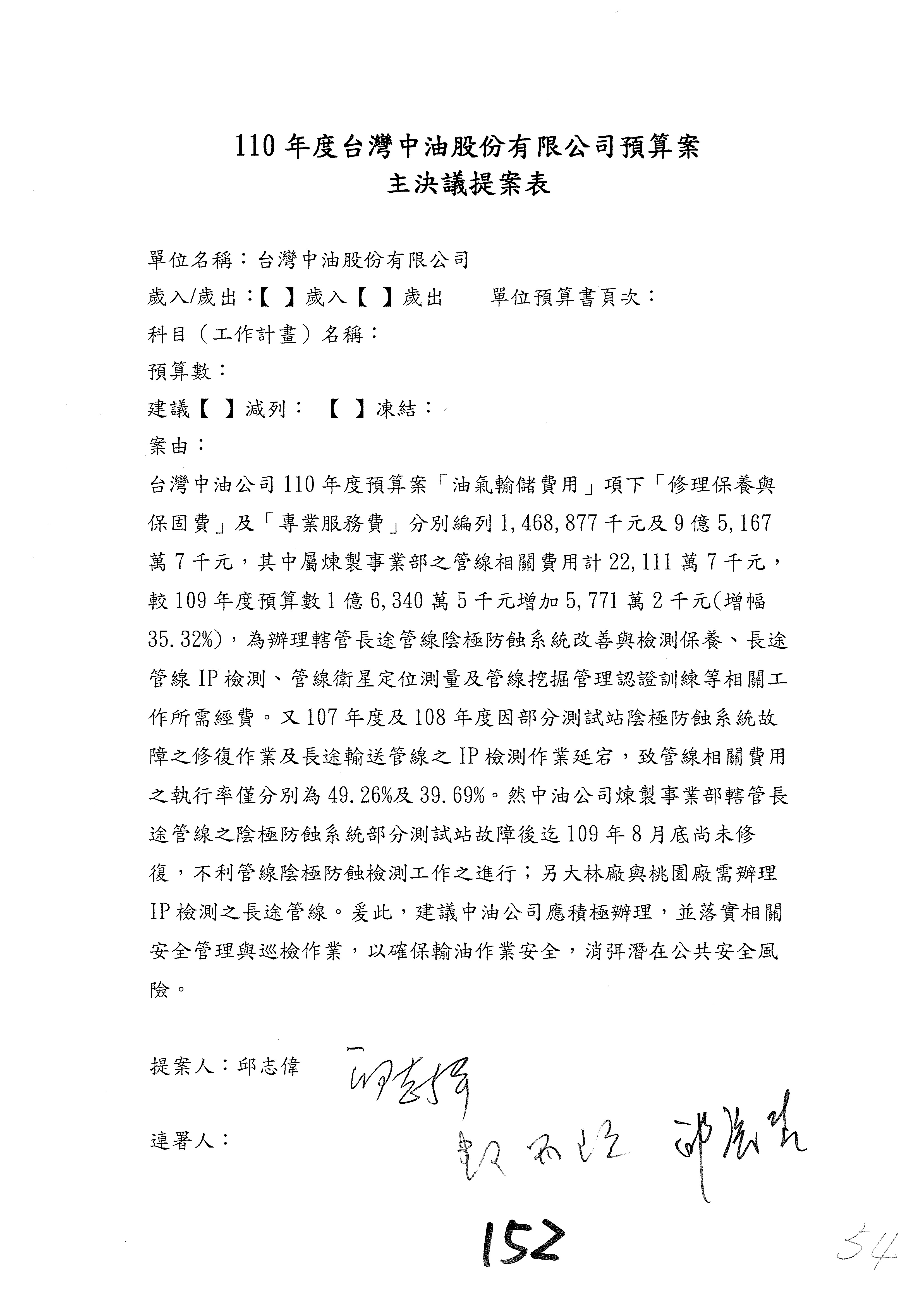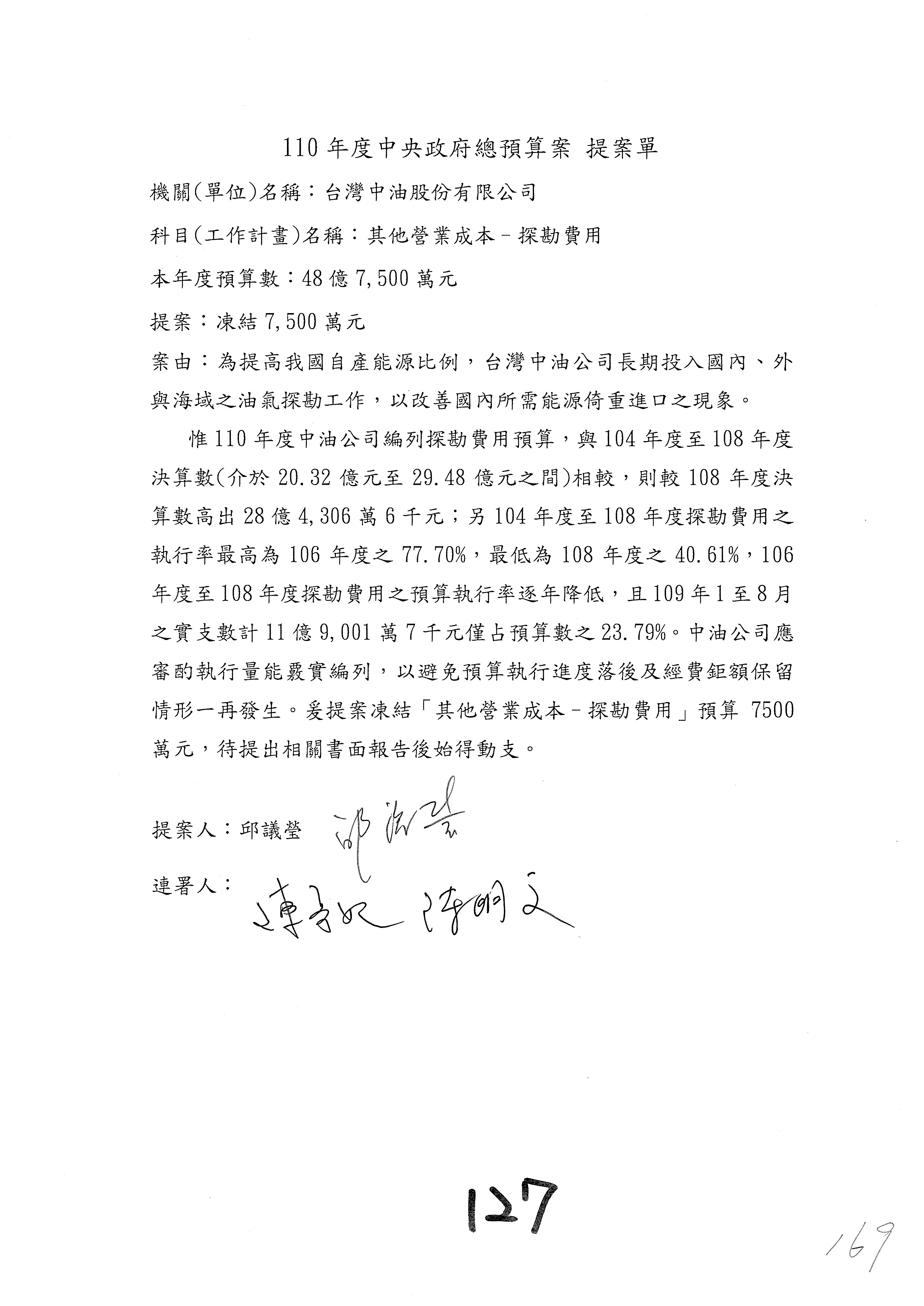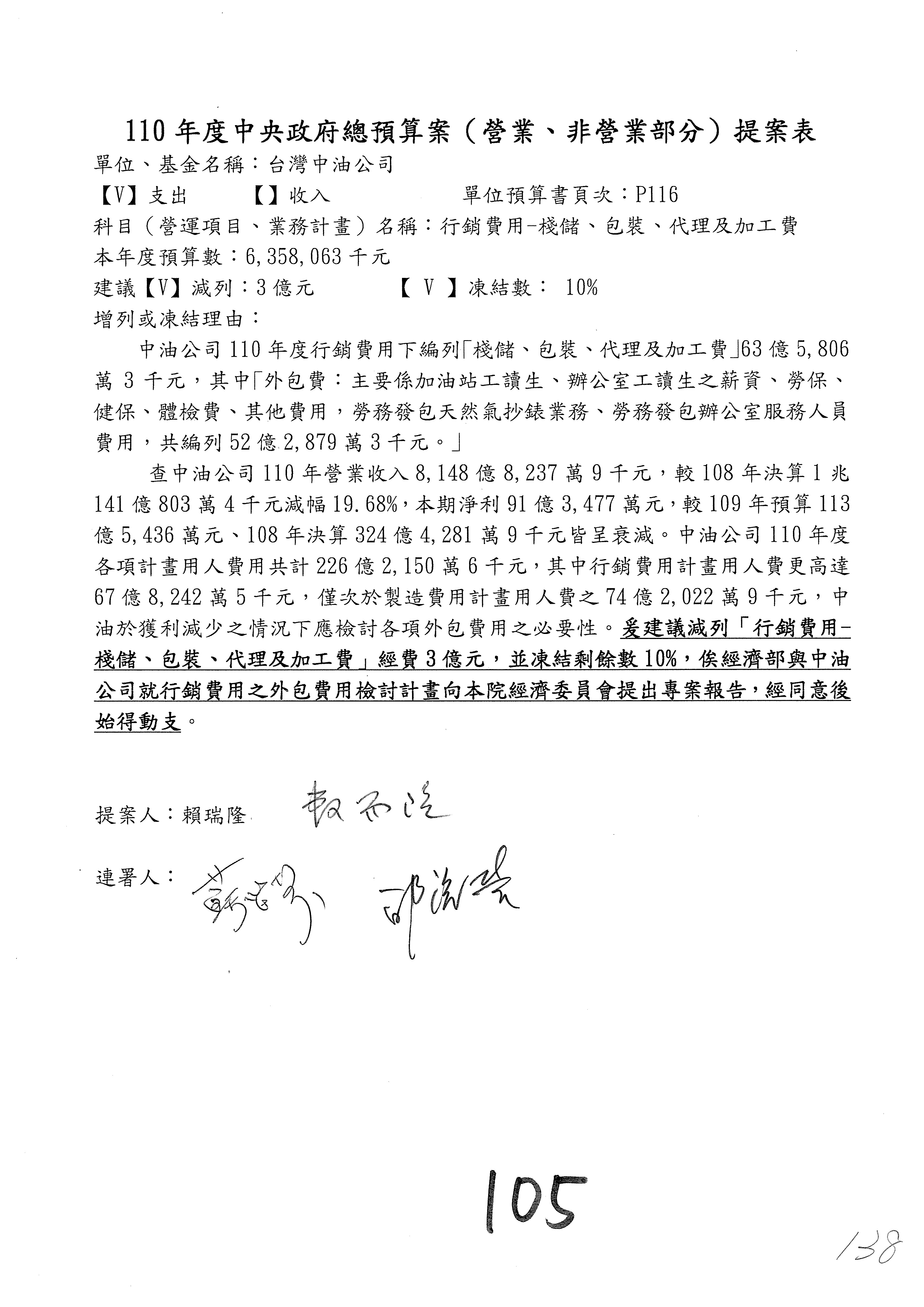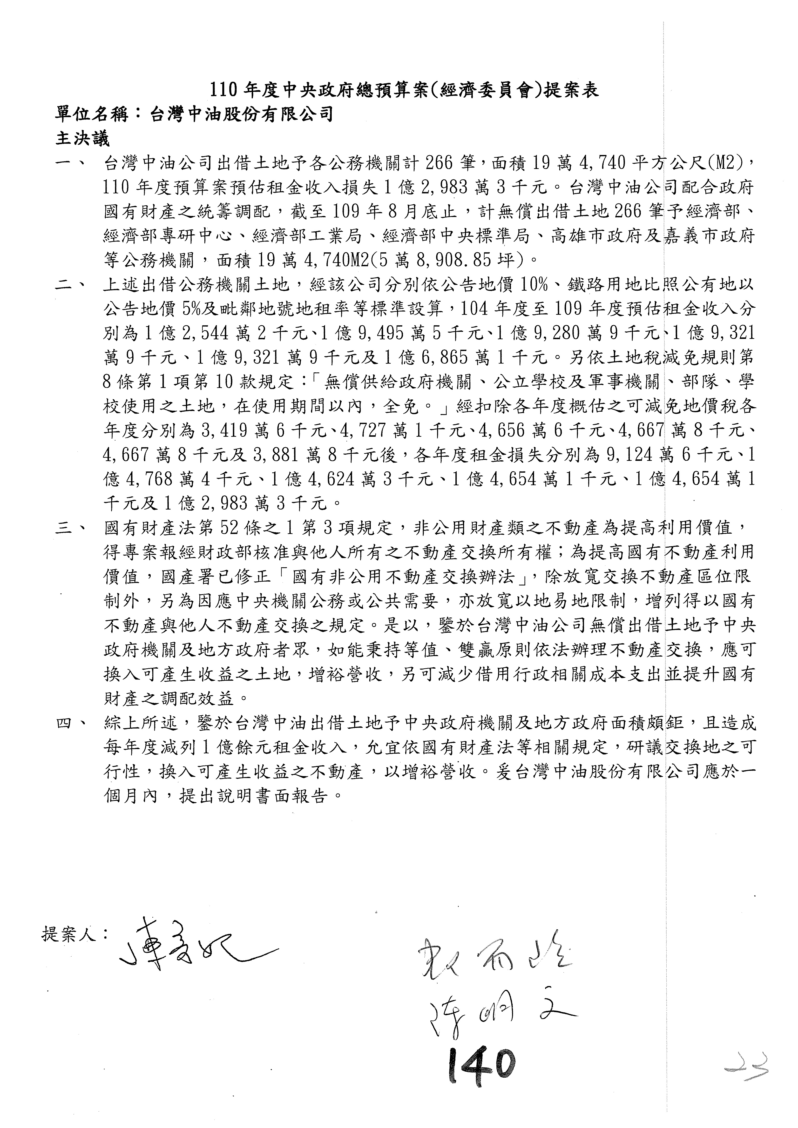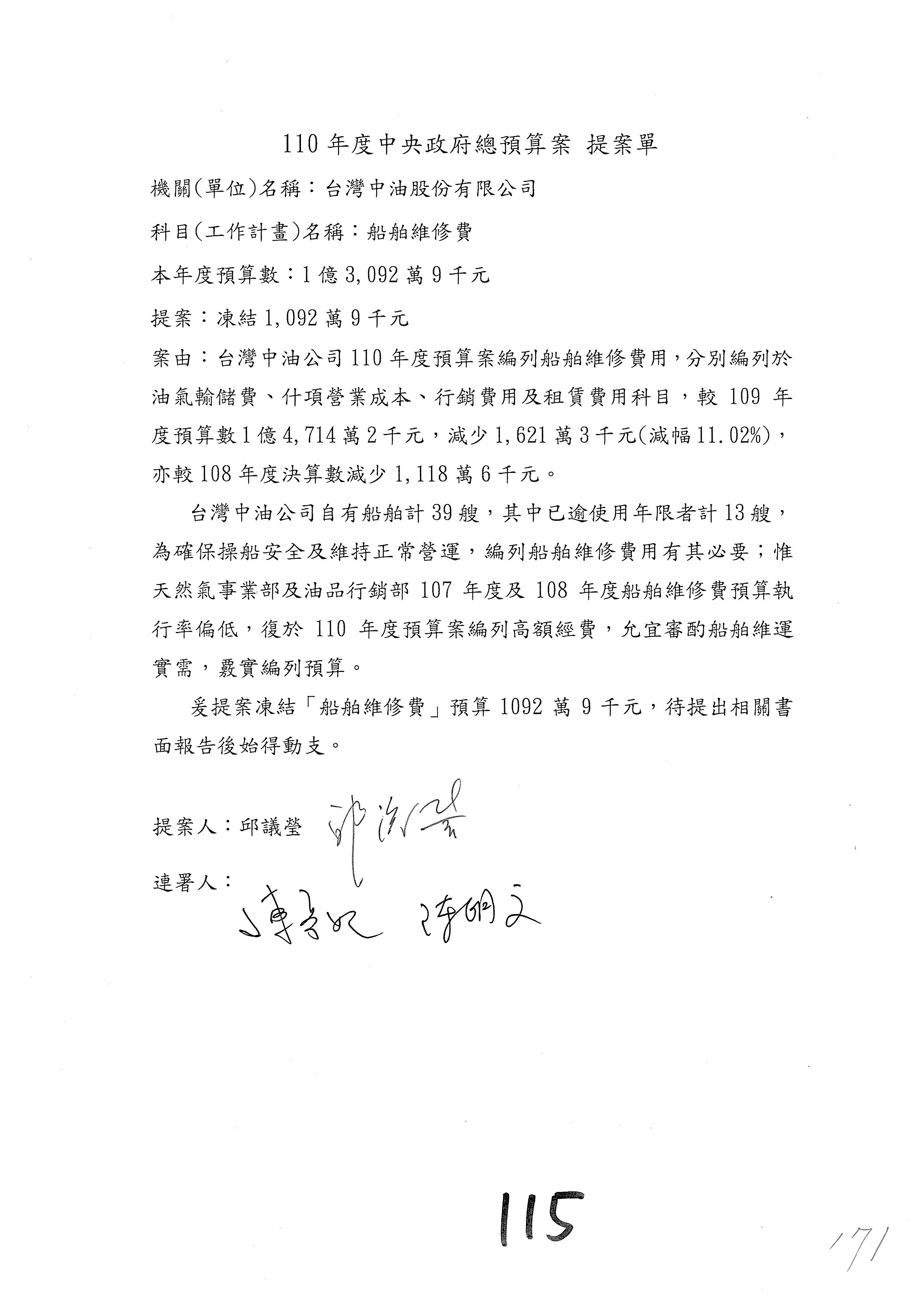 中油公司預算提案協商結論:第76案到第82案「工安環保及衛生」凍結5,000萬元,提出書面報告後始得動支;第83案到第85案為「研究發展支出」,其中第83案改主決議,「研究發展支出」凍結3億元,提出書面報告後始得動支;第86案到第88案增列「營業收入」2,000萬元;第89案減列「水電費」4,000萬元,科目自行調整;第90案到第99案減列「旅運費」900萬元,科目自行調整;第100案到第103案「印刷裝訂與廣告費」凍結2,000萬元,提出書面報告後始得動支;第104案撤案;第105案預算照列;第106案至第112案,其中第107案、第109案改主決議,「專業服務費」減列1,000萬元,科目自行調整,另凍結5,000萬元,提出書面報告後始得動支;第113案照案通過;第114案「會費」減列300萬元,科目自行調整;第115案預算照列;第116案保留送院會處理;第117案至第124案「油氣輸儲費用」減列1,000萬元,科目自行調整;第125案到第127案「探勘費用」凍結10%,提出專案報告後始得動支;第128案「管理費用」減列100萬元,科目自行調整;第129案及第130案「利息」減列600萬元;第131案到第133案「其他營業外費用」凍結1,000萬元,提出書面報告後始得動支;第134案到第136案「專案計畫」減列20億元,另凍結10億元,提出專案報告後始得動支;第137案保留送院會處理;主決議第138案至第168案均照案通過;第169案最後一句修正為「爰提案要求經濟部應將120年底的自備儲槽容積天數規定調高至30天以上」;第170案將「每季」改為「每年」;第171案也將「每季」改為「每年」;第172案「專案報告」改為「書面報告」;第173案、第174案、第175案及第175-1案均照案通過。