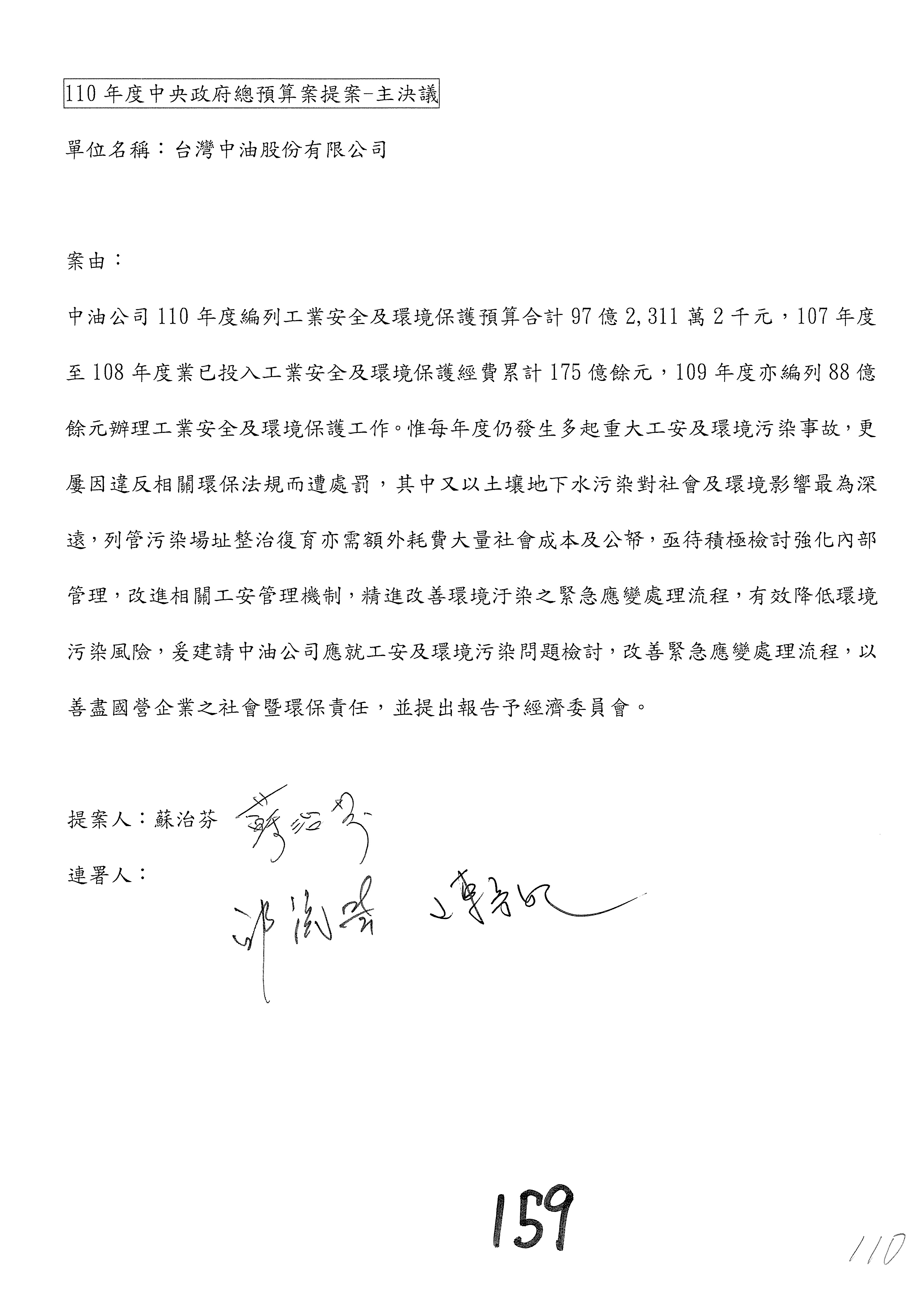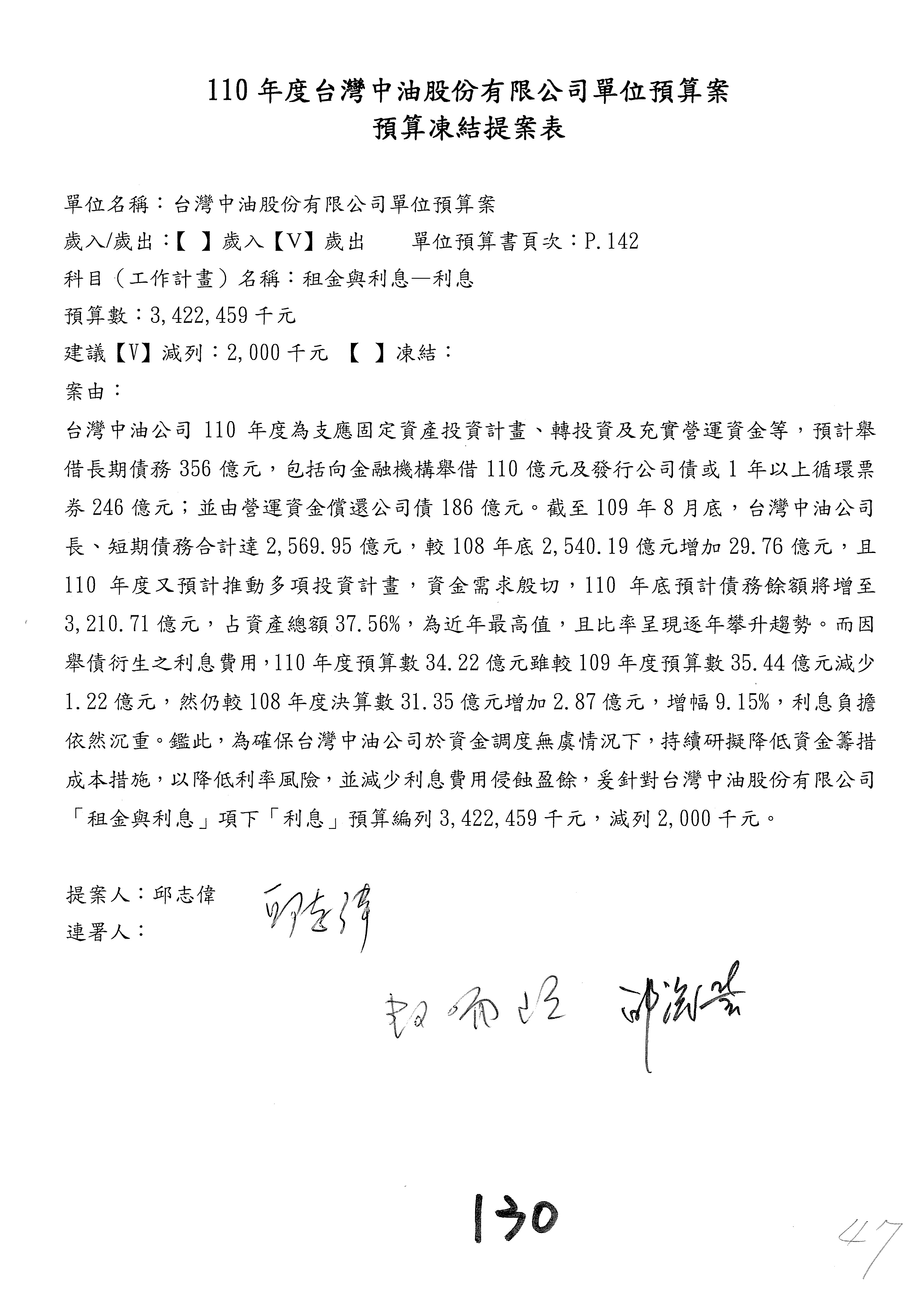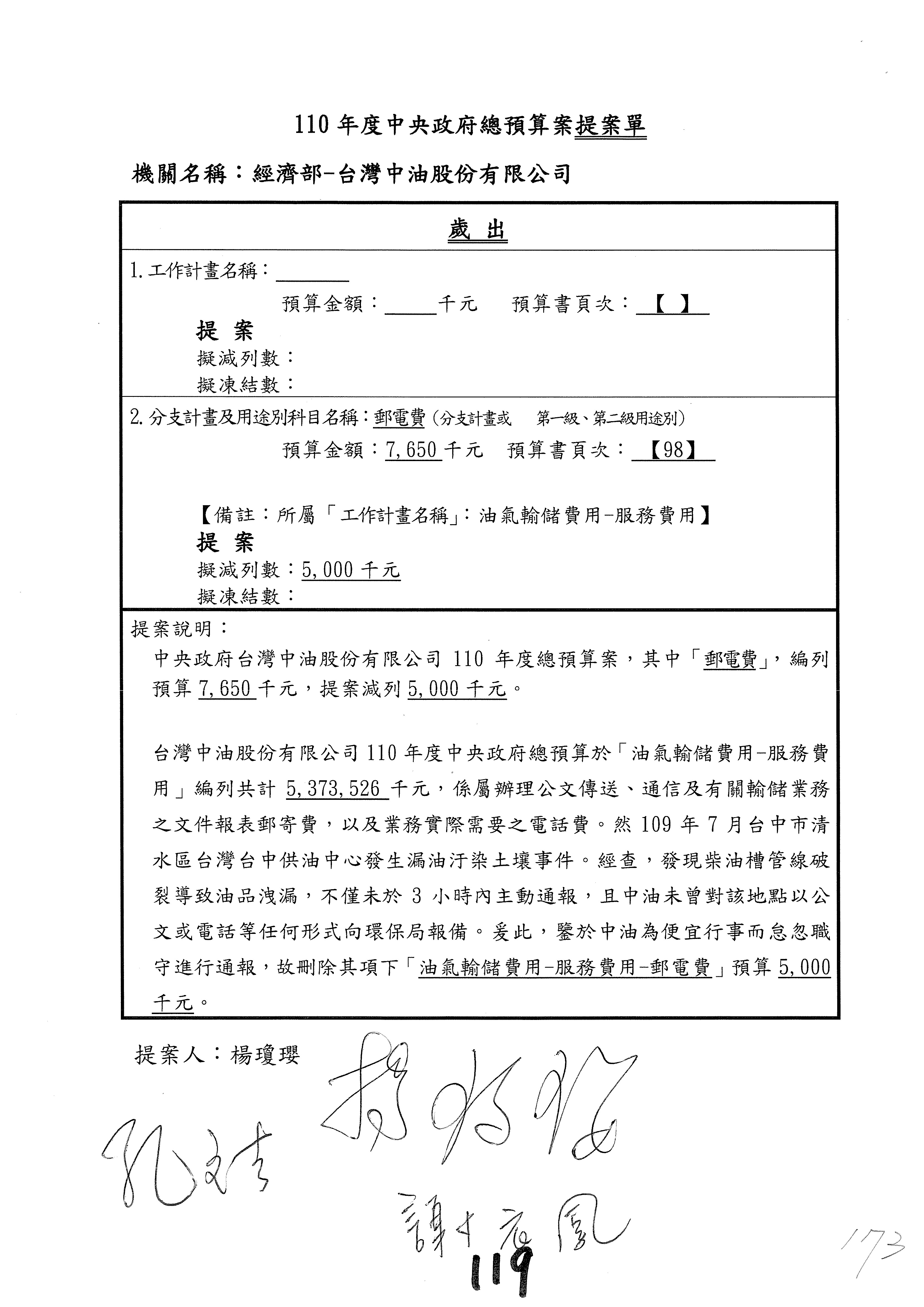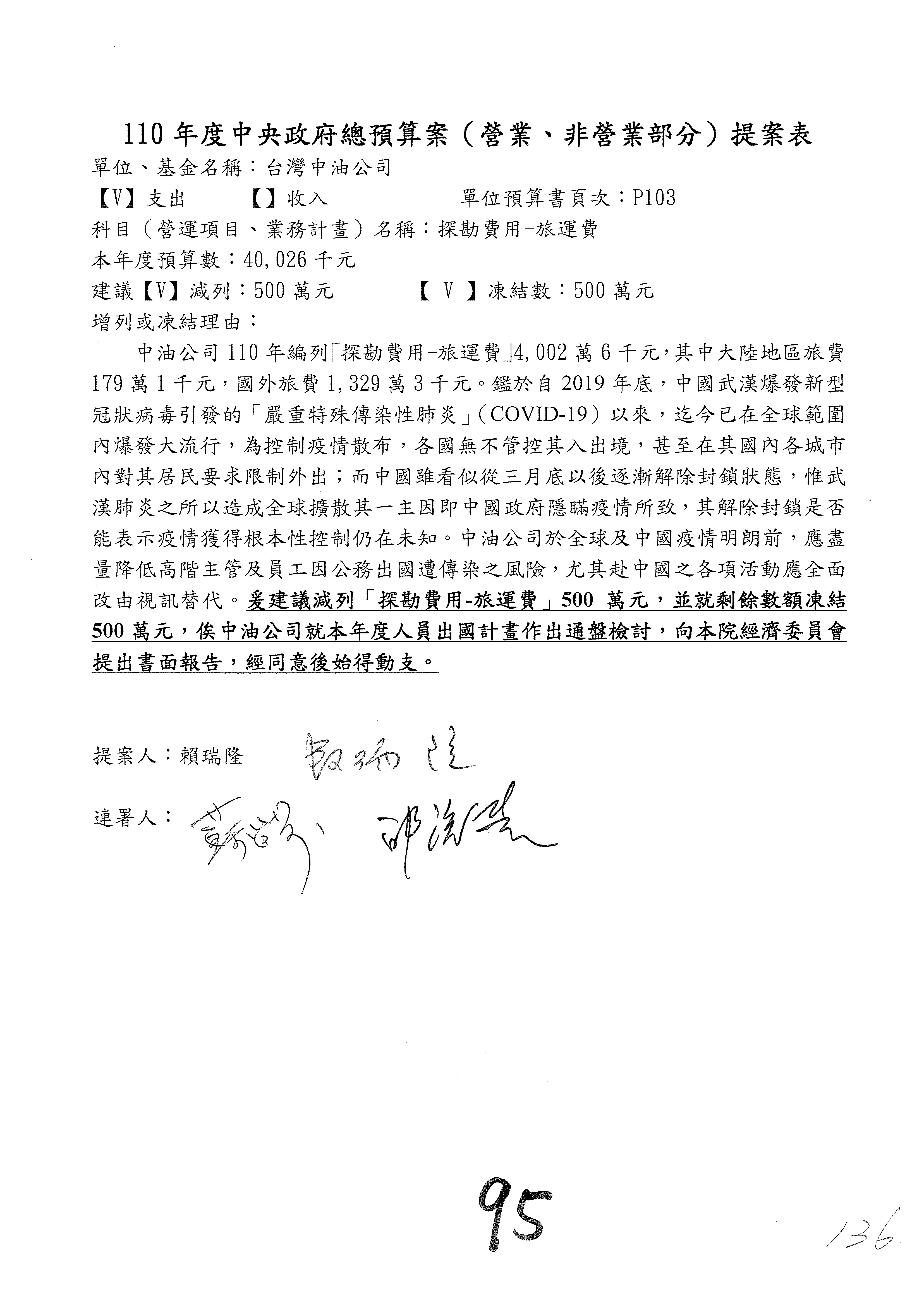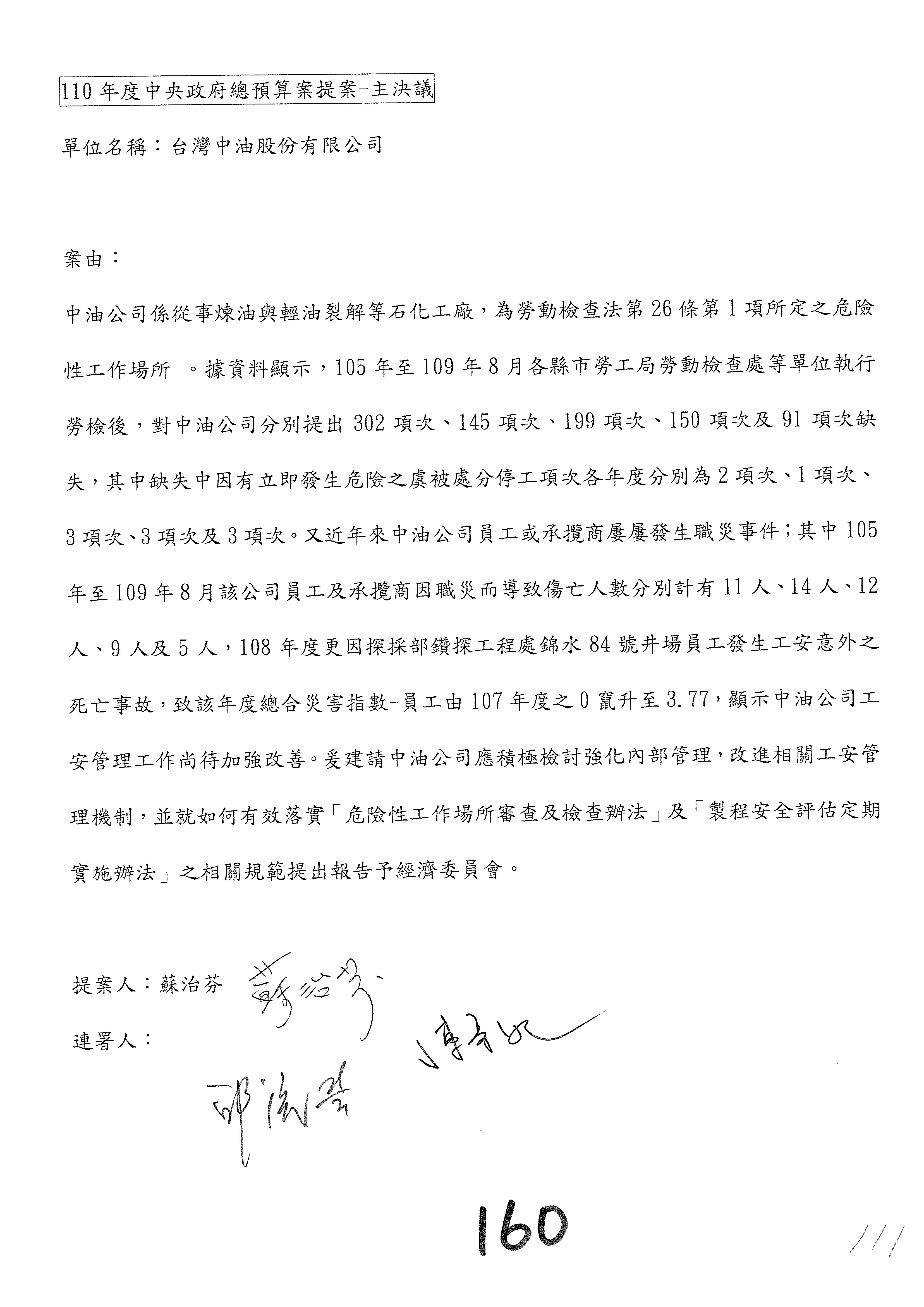 中油公司預算提案協商結論:第76案到第82案「工安環保及衛生」凍結5,000萬元,提出書面報告後始得動支;第83案到第85案為「研究發展支出」,其中第83案改主決議,「研究發展支出」凍結3億元,提出書面報告後始得動支;第86案到第88案增列「營業收入」2,000萬元;第89案減列「水電費」4,000萬元,科目自行調整;第90案到第99案減列「旅運費」900萬元,科目自行調整;第100案到第103案「印刷裝訂與廣告費」凍結2,000萬元,提出書面報告後始得動支;第104案撤案;第105案預算照列;第106案至第112案,其中第107案、第109案改主決議,「專業服務費」減列1,000萬元,科目自行調整,另凍結5,000萬元,提出書面報告後始得動支;第113案照案通過;第114案「會費」減列300萬元,科目自行調整;第115案預算照列;第116案保留送院會處理;第117案至第124案「油氣輸儲費用」減列1,000萬元,科目自行調整;第125案到第127案「探勘費用」凍結10%,提出專案報告後始得動支;第128案「管理費用」減列100萬元,科目自行調整;第129案及第130案「利息」減列600萬元;第131案到第133案「其他營業外費用」凍結1,000萬元,提出書面報告後始得動支;第134案到第136案「專案計畫」減列20億元,另凍結10億元,提出專案報告後始得動支;第137案保留送院會處理;主決議第138案至第168案均照案通過;第169案最後一句修正為「爰提案要求經濟部應將120年底的自備儲槽容積天數規定調高至30天以上」;第170案將「每季」改為「每年」;第171案也將「每季」改為「每年」;第172案「專案報告」改為「書面報告」;第173案、第174案、第175案及第175-1案均照案通過。