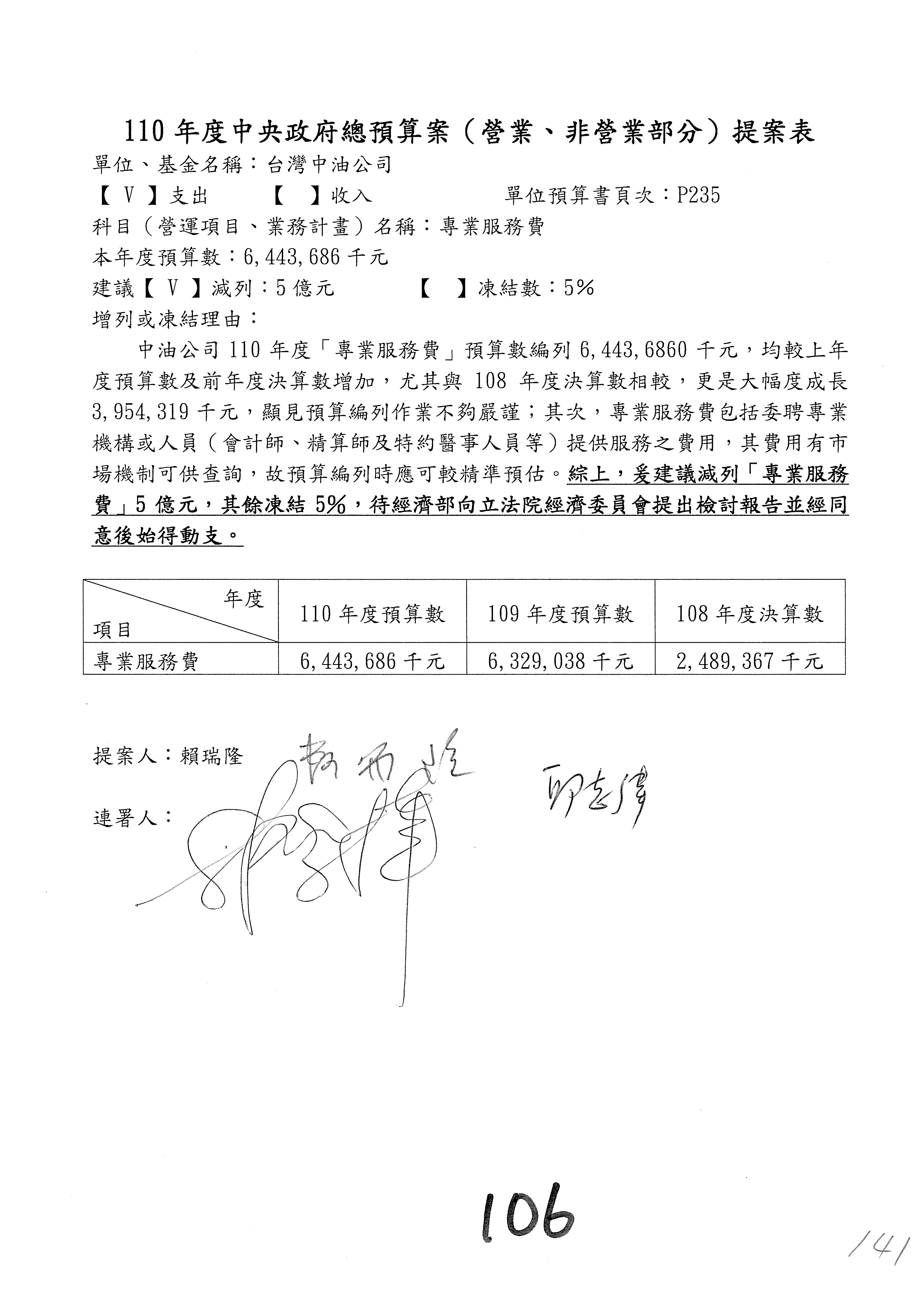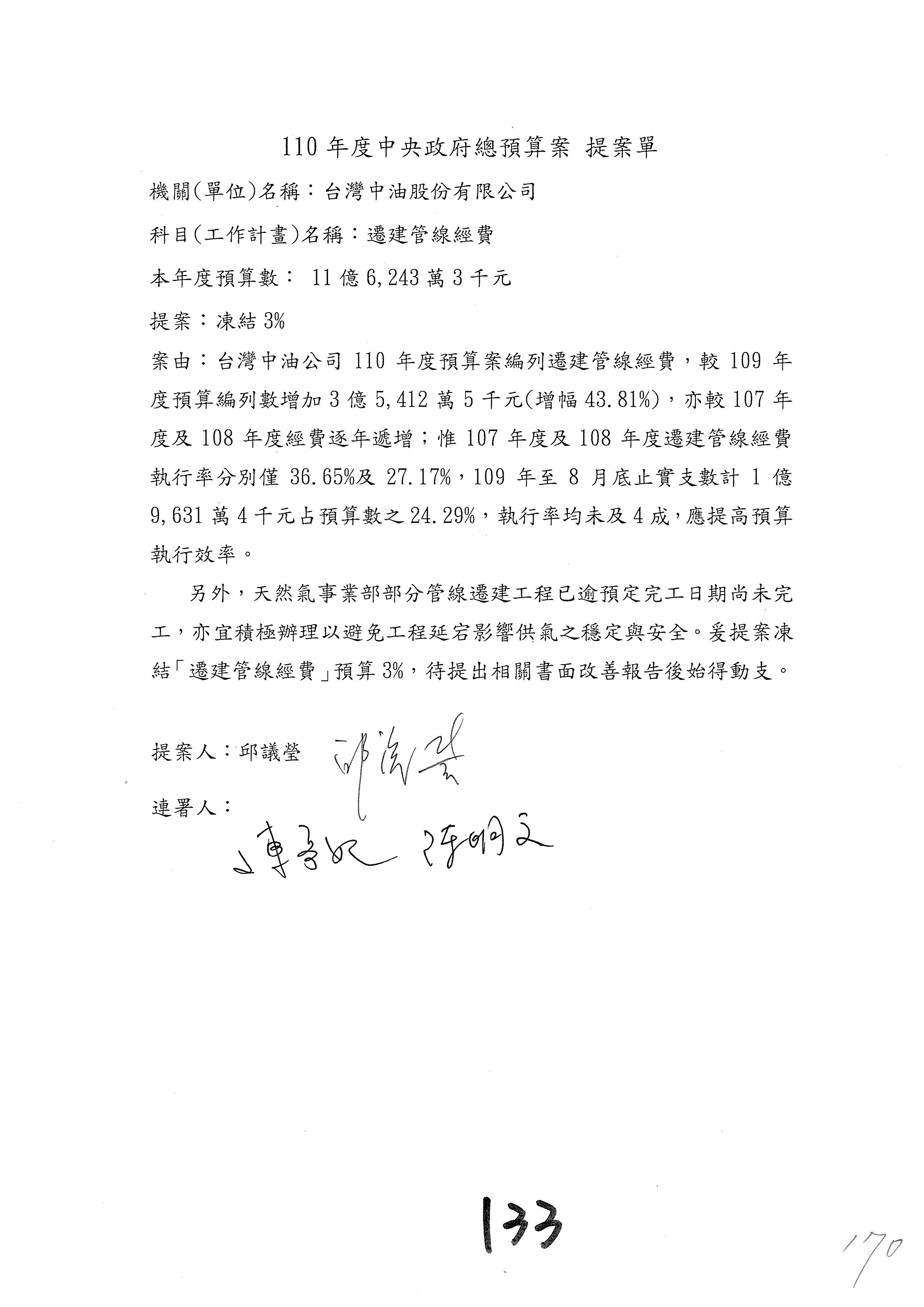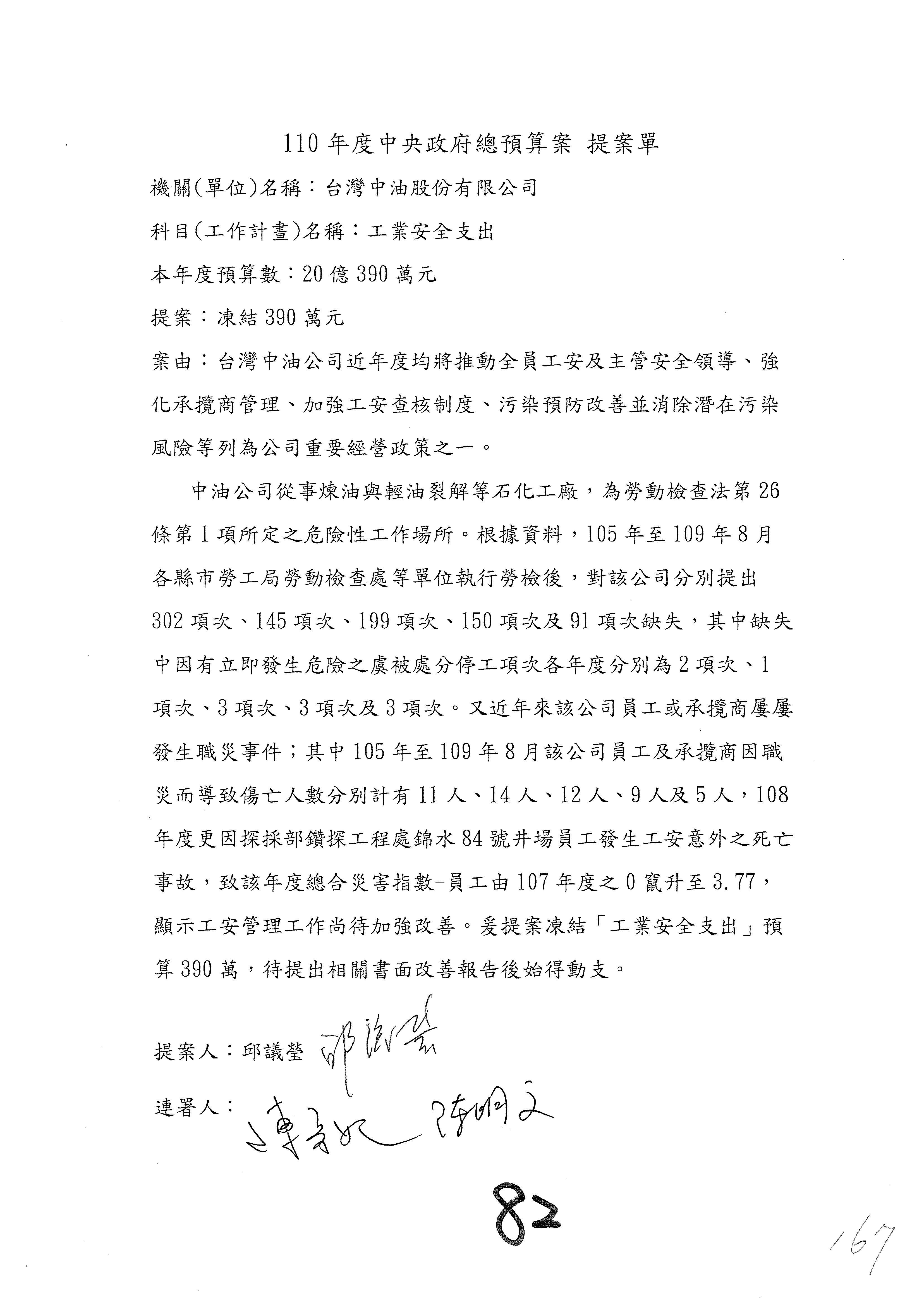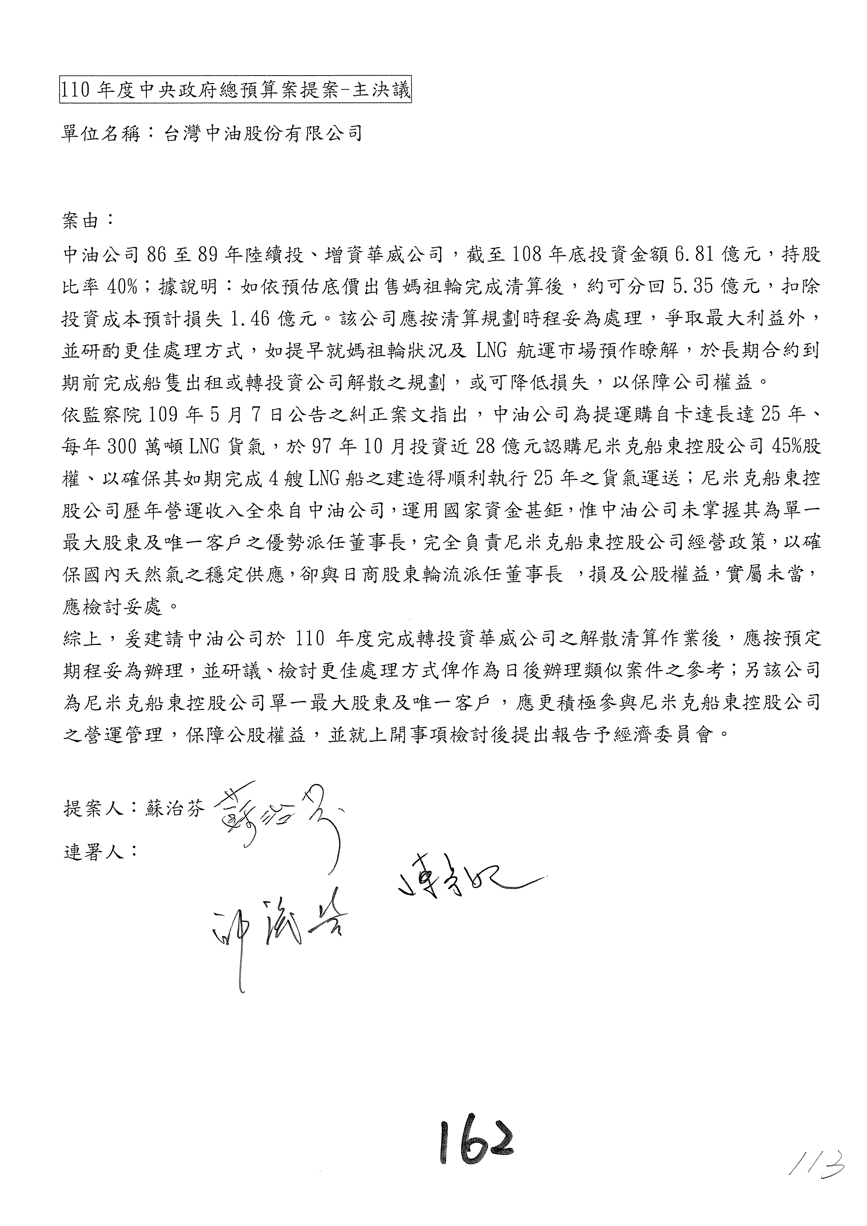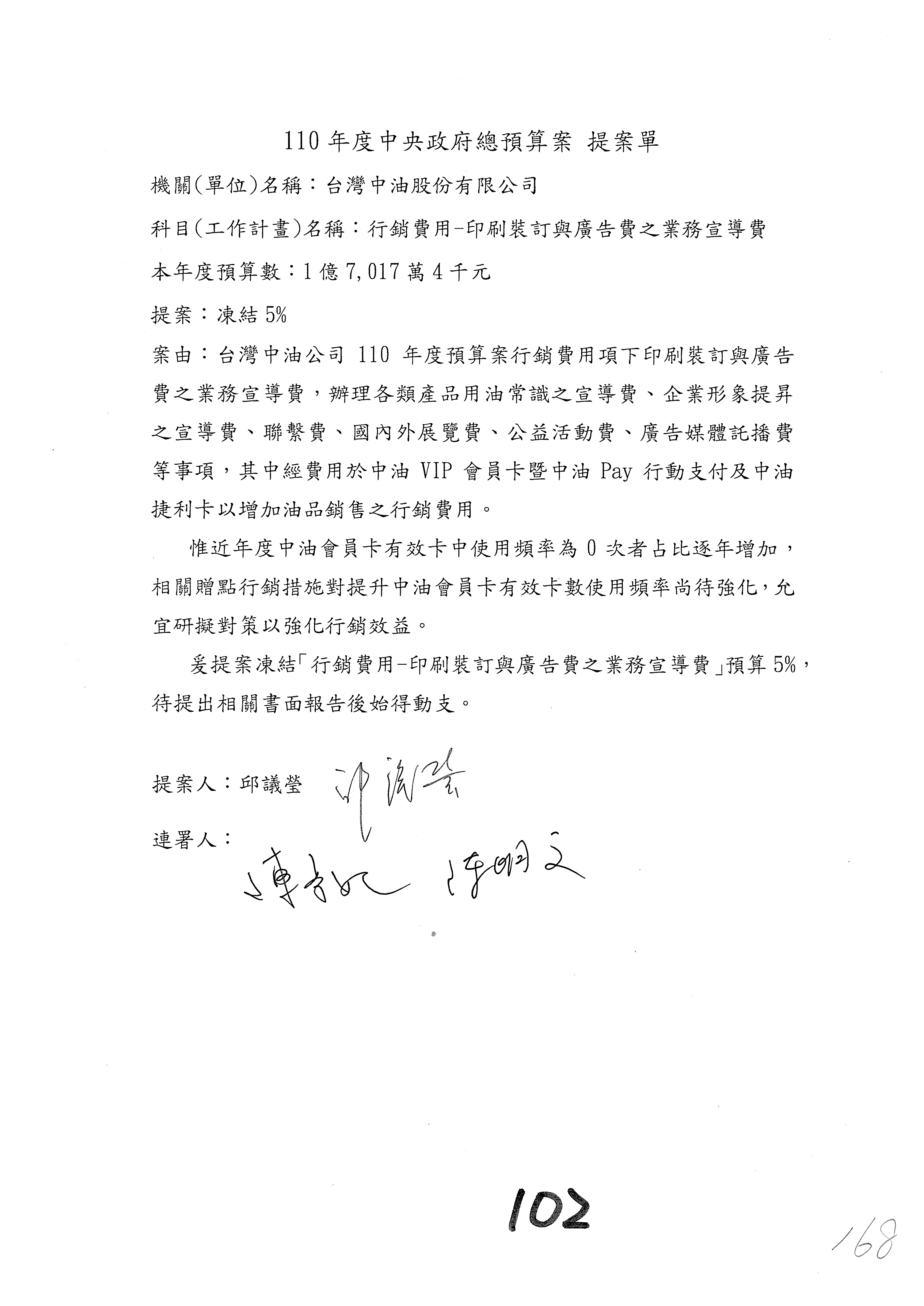 中油公司預算提案協商結論:第76案到第82案「工安環保及衛生」凍結5,000萬元,提出書面報告後始得動支;第83案到第85案為「研究發展支出」,其中第83案改主決議,「研究發展支出」凍結3億元,提出書面報告後始得動支;第86案到第88案增列「營業收入」2,000萬元;第89案減列「水電費」4,000萬元,科目自行調整;第90案到第99案減列「旅運費」900萬元,科目自行調整;第100案到第103案「印刷裝訂與廣告費」凍結2,000萬元,提出書面報告後始得動支;第104案撤案;第105案預算照列;第106案至第112案,其中第107案、第109案改主決議,「專業服務費」減列1,000萬元,科目自行調整,另凍結5,000萬元,提出書面報告後始得動支;第113案照案通過;第114案「會費」減列300萬元,科目自行調整;第115案預算照列;第116案保留送院會處理;第117案至第124案「油氣輸儲費用」減列1,000萬元,科目自行調整;第125案到第127案「探勘費用」凍結10%,提出專案報告後始得動支;第128案「管理費用」減列100萬元,科目自行調整;第129案及第130案「利息」減列600萬元;第131案到第133案「其他營業外費用」凍結1,000萬元,提出書面報告後始得動支;第134案到第136案「專案計畫」減列20億元,另凍結10億元,提出專案報告後始得動支;第137案保留送院會處理;主決議第138案至第168案均照案通過;第169案最後一句修正為「爰提案要求經濟部應將120年底的自備儲槽容積天數規定調高至30天以上」;第170案將「每季」改為「每年」;第171案也將「每季」改為「每年」;第172案「專案報告」改為「書面報告」;第173案、第174案、第175案及第175-1案均照案通過。
