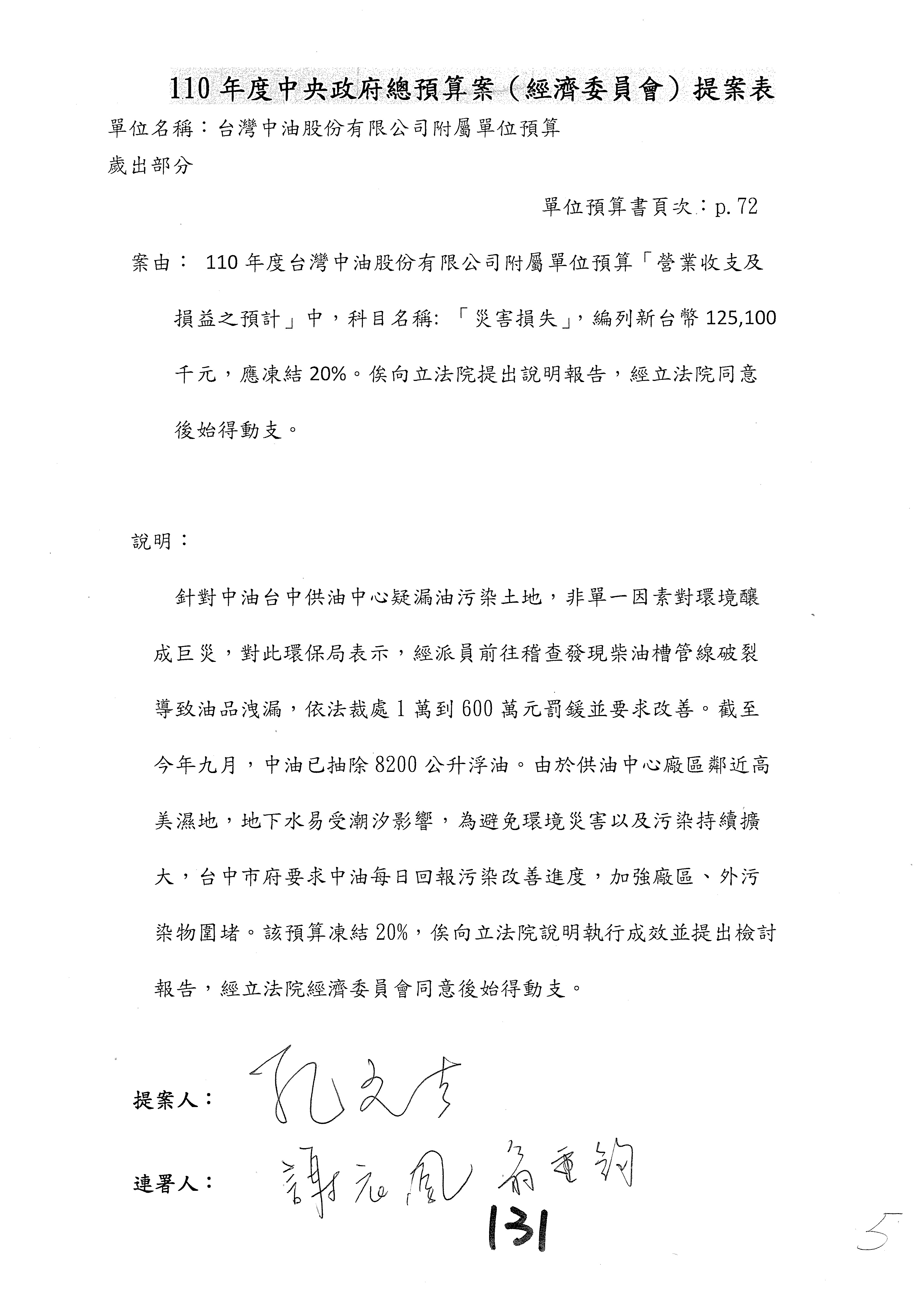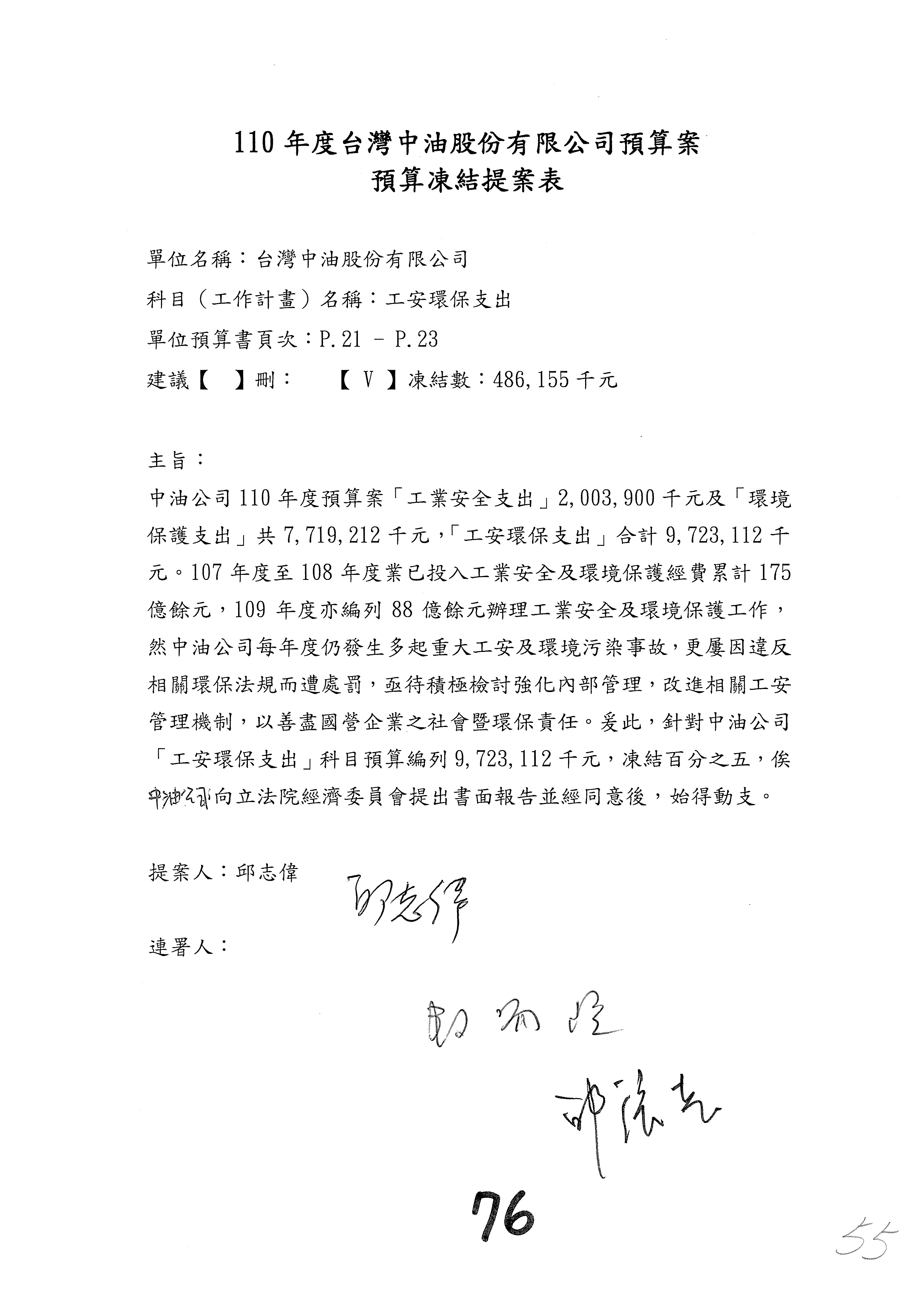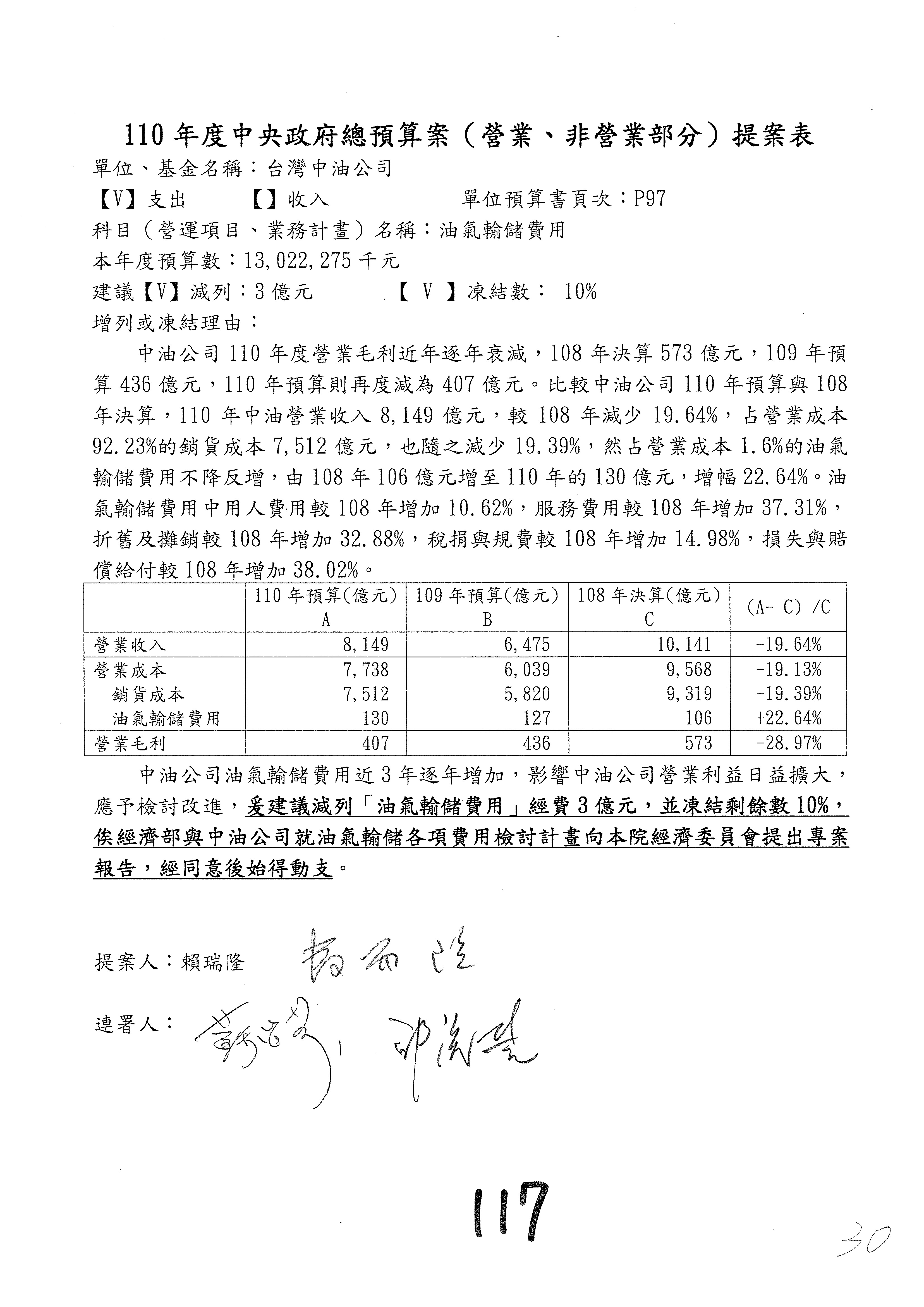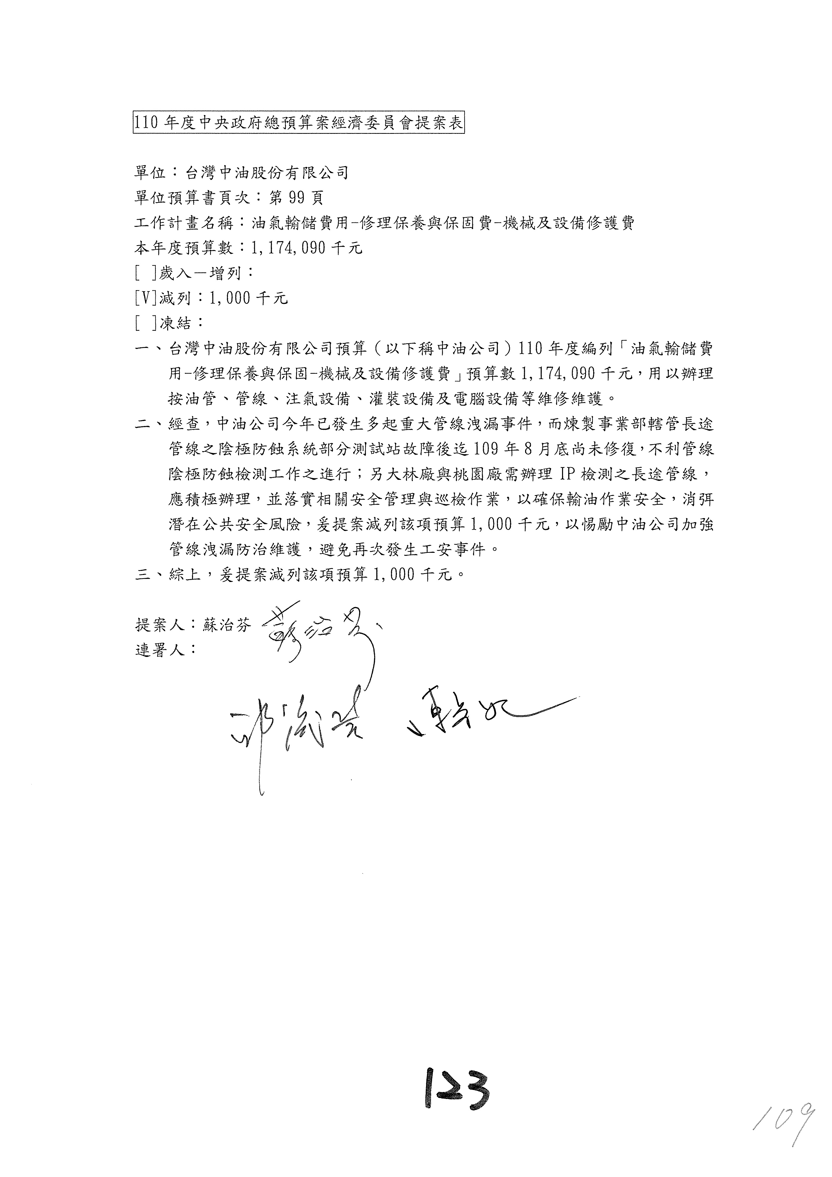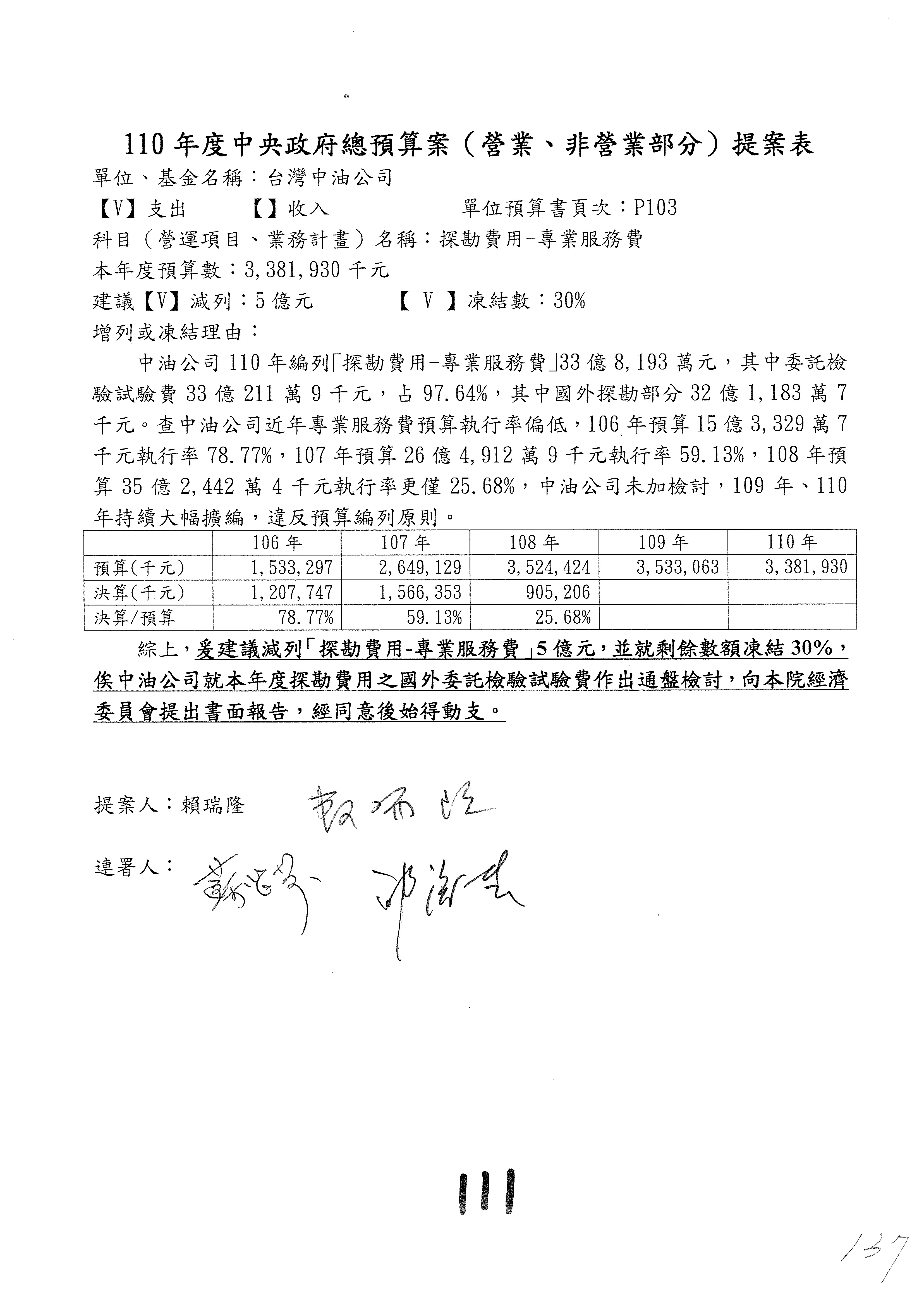 中油公司預算提案協商結論:第76案到第82案「工安環保及衛生」凍結5,000萬元,提出書面報告後始得動支;第83案到第85案為「研究發展支出」,其中第83案改主決議,「研究發展支出」凍結3億元,提出書面報告後始得動支;第86案到第88案增列「營業收入」2,000萬元;第89案減列「水電費」4,000萬元,科目自行調整;第90案到第99案減列「旅運費」900萬元,科目自行調整;第100案到第103案「印刷裝訂與廣告費」凍結2,000萬元,提出書面報告後始得動支;第104案撤案;第105案預算照列;第106案至第112案,其中第107案、第109案改主決議,「專業服務費」減列1,000萬元,科目自行調整,另凍結5,000萬元,提出書面報告後始得動支;第113案照案通過;第114案「會費」減列300萬元,科目自行調整;第115案預算照列;第116案保留送院會處理;第117案至第124案「油氣輸儲費用」減列1,000萬元,科目自行調整;第125案到第127案「探勘費用」凍結10%,提出專案報告後始得動支;第128案「管理費用」減列100萬元,科目自行調整;第129案及第130案「利息」減列600萬元;第131案到第133案「其他營業外費用」凍結1,000萬元,提出書面報告後始得動支;第134案到第136案「專案計畫」減列20億元,另凍結10億元,提出專案報告後始得動支;第137案保留送院會處理;主決議第138案至第168案均照案通過;第169案最後一句修正為「爰提案要求經濟部應將120年底的自備儲槽容積天數規定調高至30天以上」;第170案將「每季」改為「每年」;第171案也將「每季」改為「每年」;第172案「專案報告」改為「書面報告」;第173案、第174案、第175案及第175-1案均照案通過。