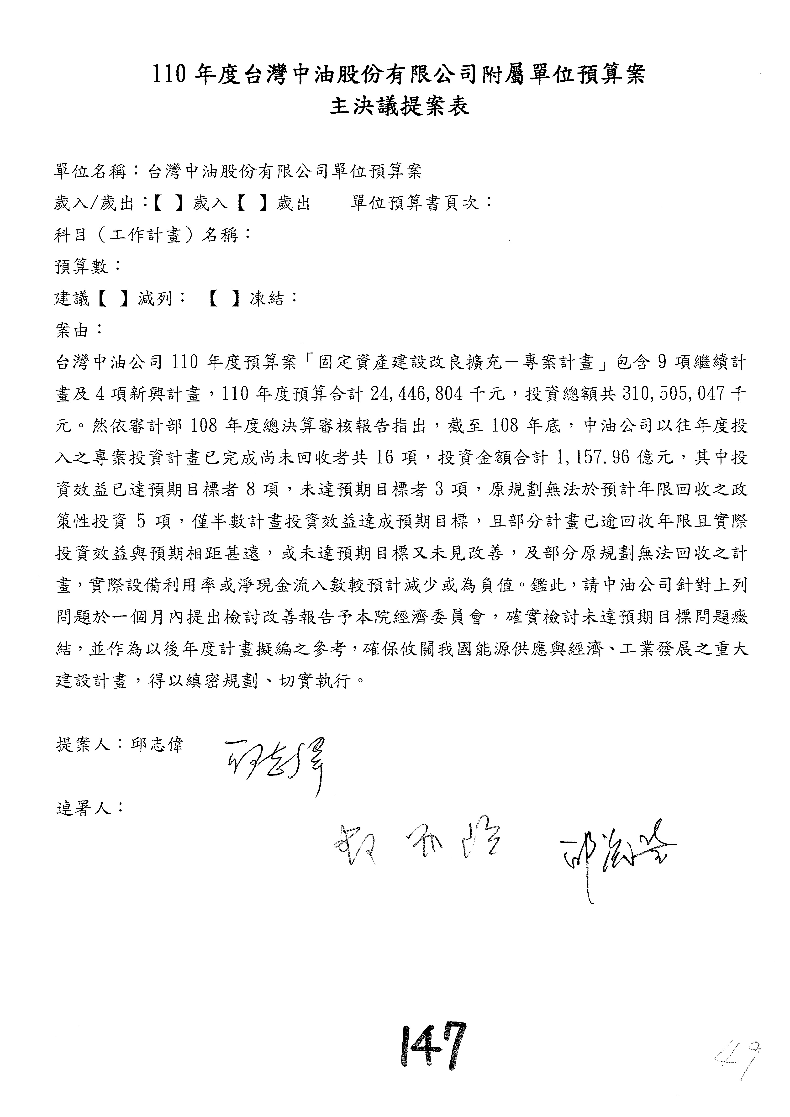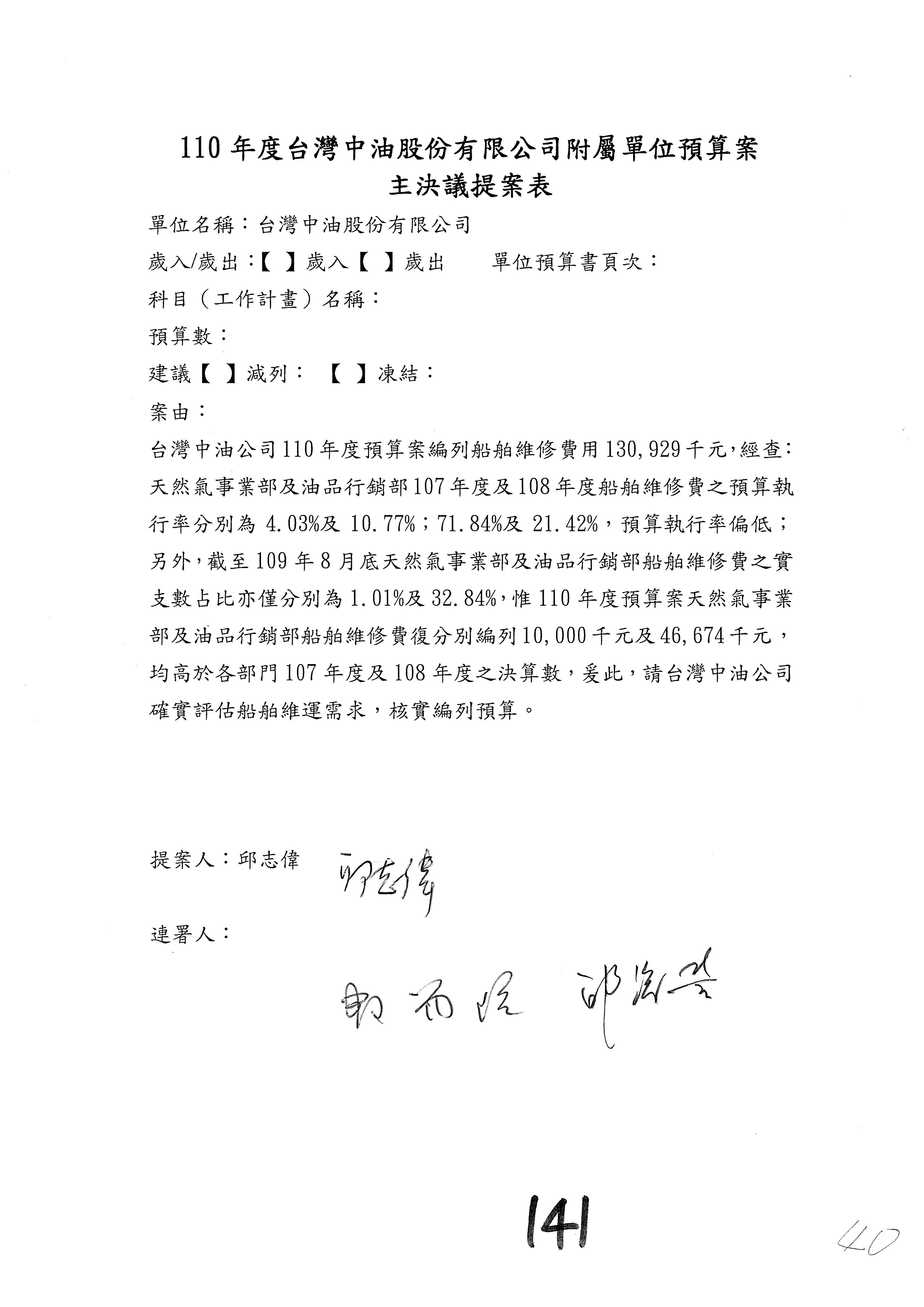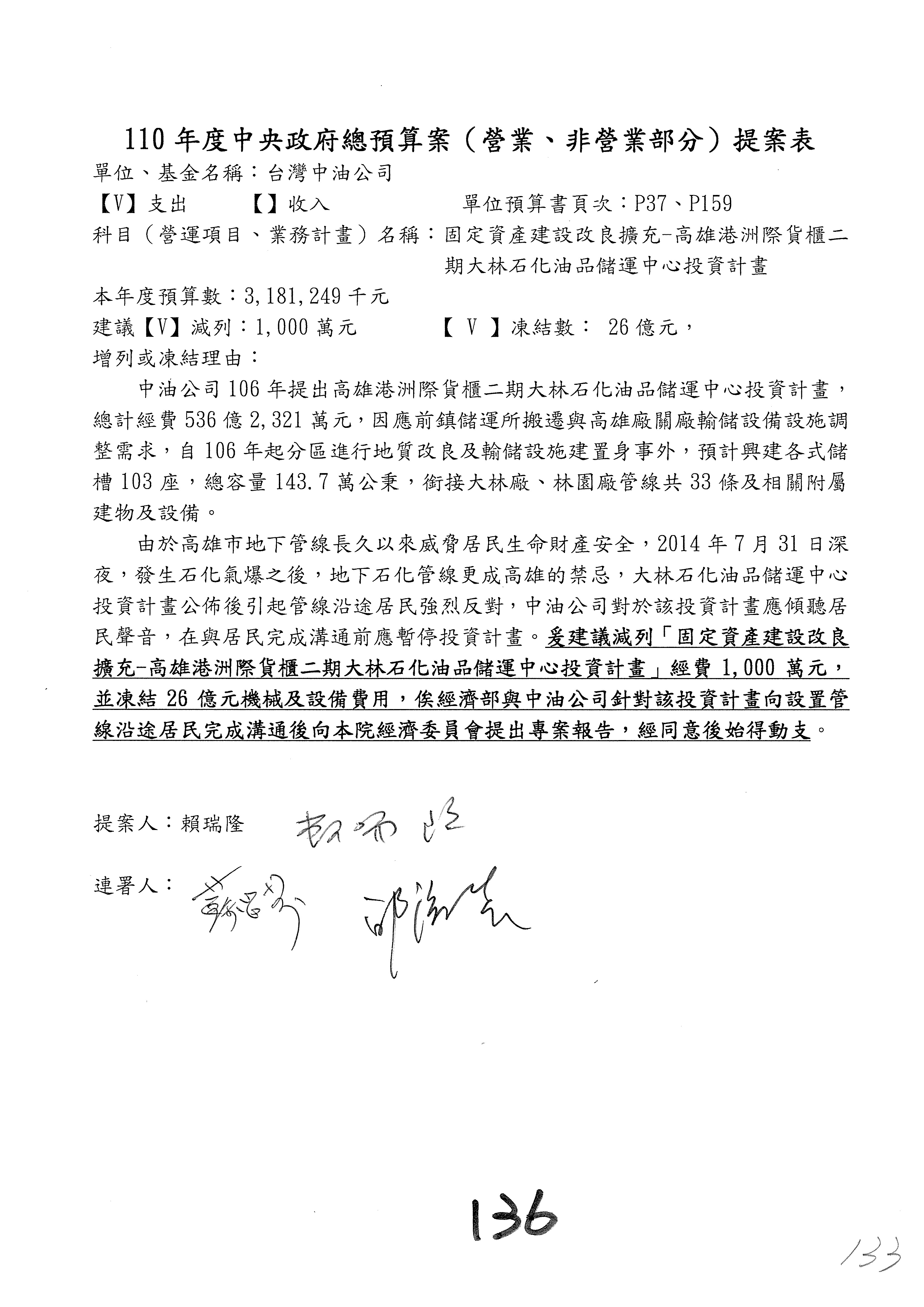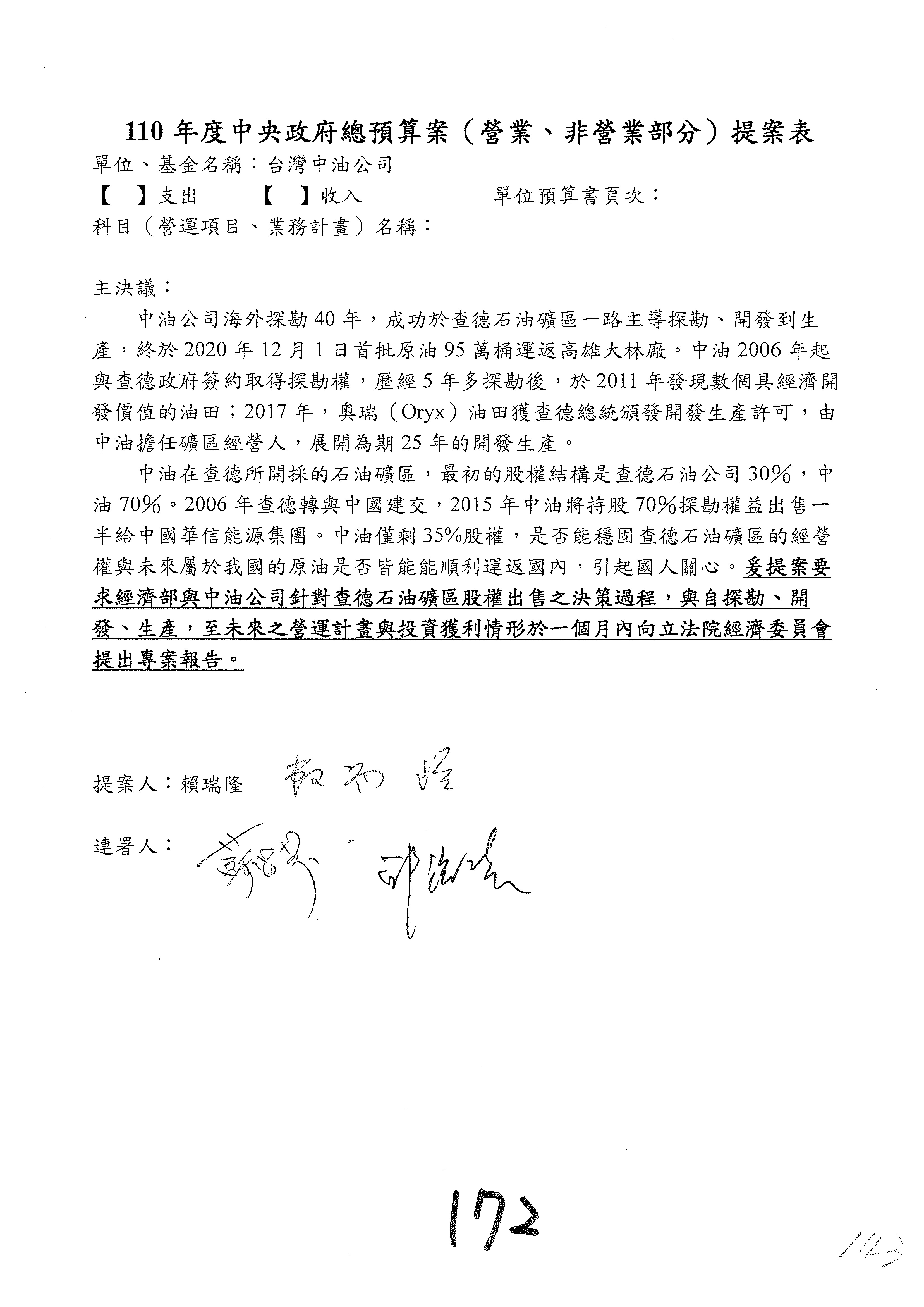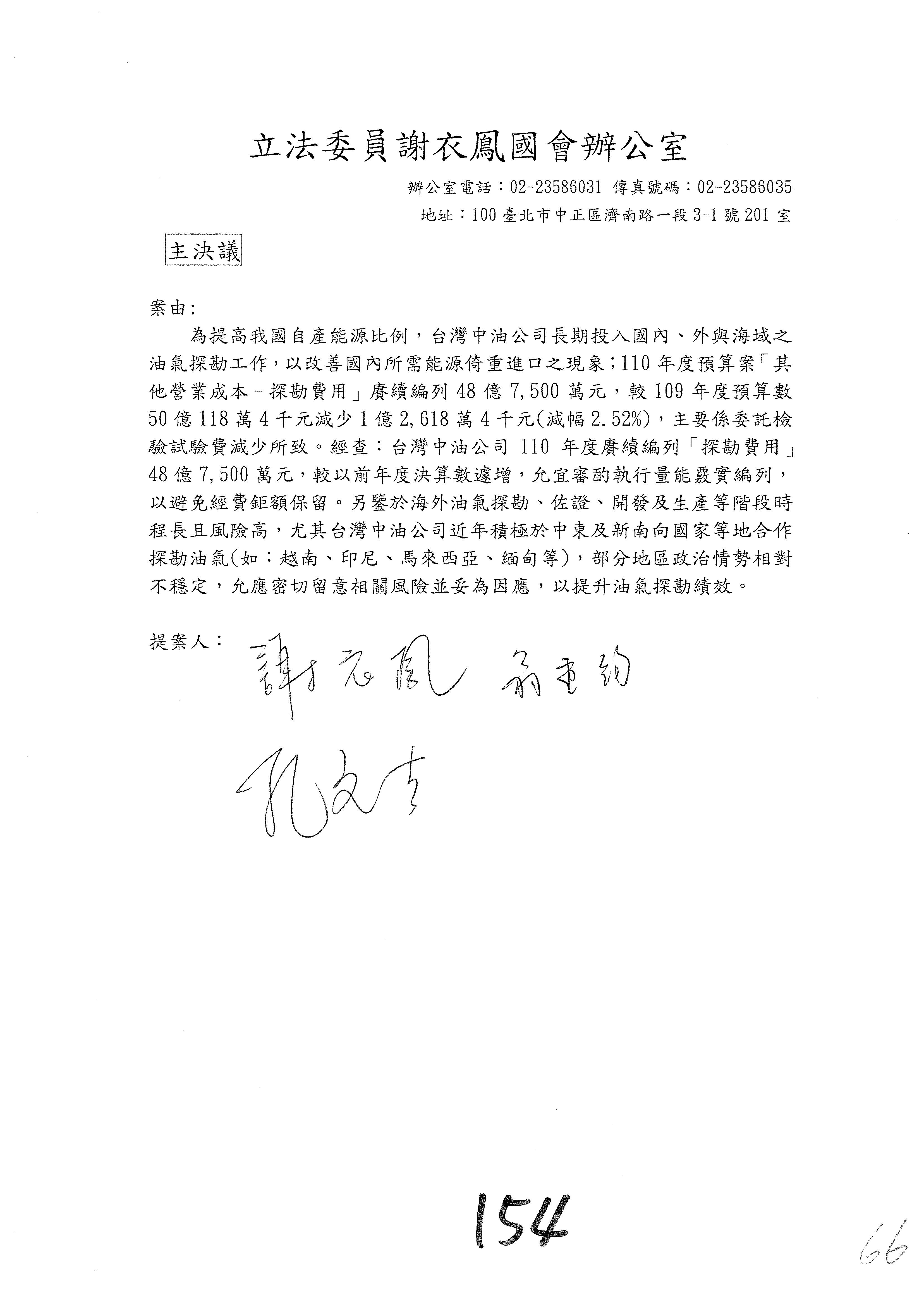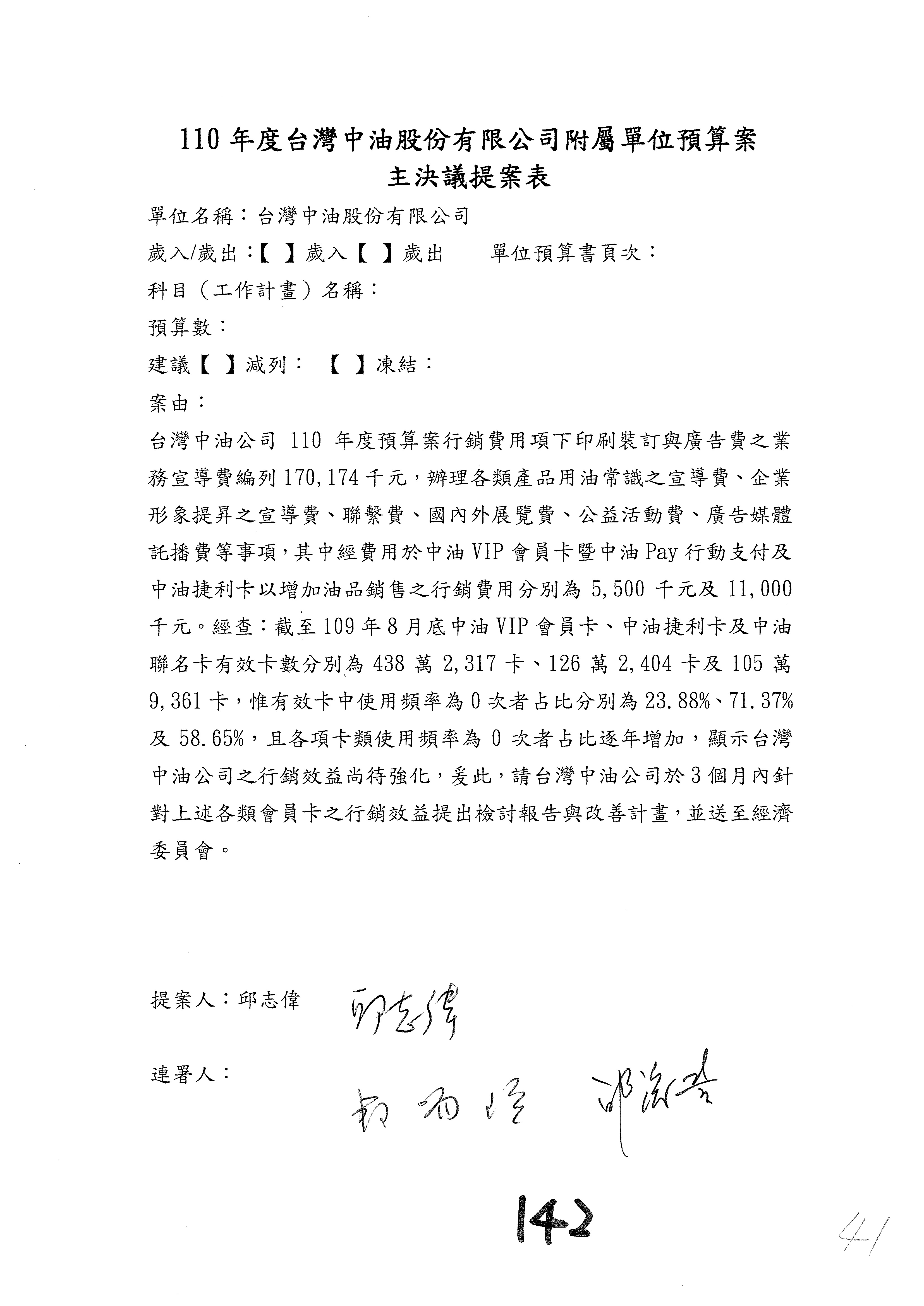 中油公司預算提案協商結論:第76案到第82案「工安環保及衛生」凍結5,000萬元,提出書面報告後始得動支;第83案到第85案為「研究發展支出」,其中第83案改主決議,「研究發展支出」凍結3億元,提出書面報告後始得動支;第86案到第88案增列「營業收入」2,000萬元;第89案減列「水電費」4,000萬元,科目自行調整;第90案到第99案減列「旅運費」900萬元,科目自行調整;第100案到第103案「印刷裝訂與廣告費」凍結2,000萬元,提出書面報告後始得動支;第104案撤案;第105案預算照列;第106案至第112案,其中第107案、第109案改主決議,「專業服務費」減列1,000萬元,科目自行調整,另凍結5,000萬元,提出書面報告後始得動支;第113案照案通過;第114案「會費」減列300萬元,科目自行調整;第115案預算照列;第116案保留送院會處理;第117案至第124案「油氣輸儲費用」減列1,000萬元,科目自行調整;第125案到第127案「探勘費用」凍結10%,提出專案報告後始得動支;第128案「管理費用」減列100萬元,科目自行調整;第129案及第130案「利息」減列600萬元;第131案到第133案「其他營業外費用」凍結1,000萬元,提出書面報告後始得動支;第134案到第136案「專案計畫」減列20億元,另凍結10億元,提出專案報告後始得動支;第137案保留送院會處理;主決議第138案至第168案均照案通過;第169案最後一句修正為「爰提案要求經濟部應將120年底的自備儲槽容積天數規定調高至30天以上」;第170案將「每季」改為「每年」;第171案也將「每季」改為「每年」;第172案「專案報告」改為「書面報告」;第173案、第174案、第175案及第175-1案均照案通過。