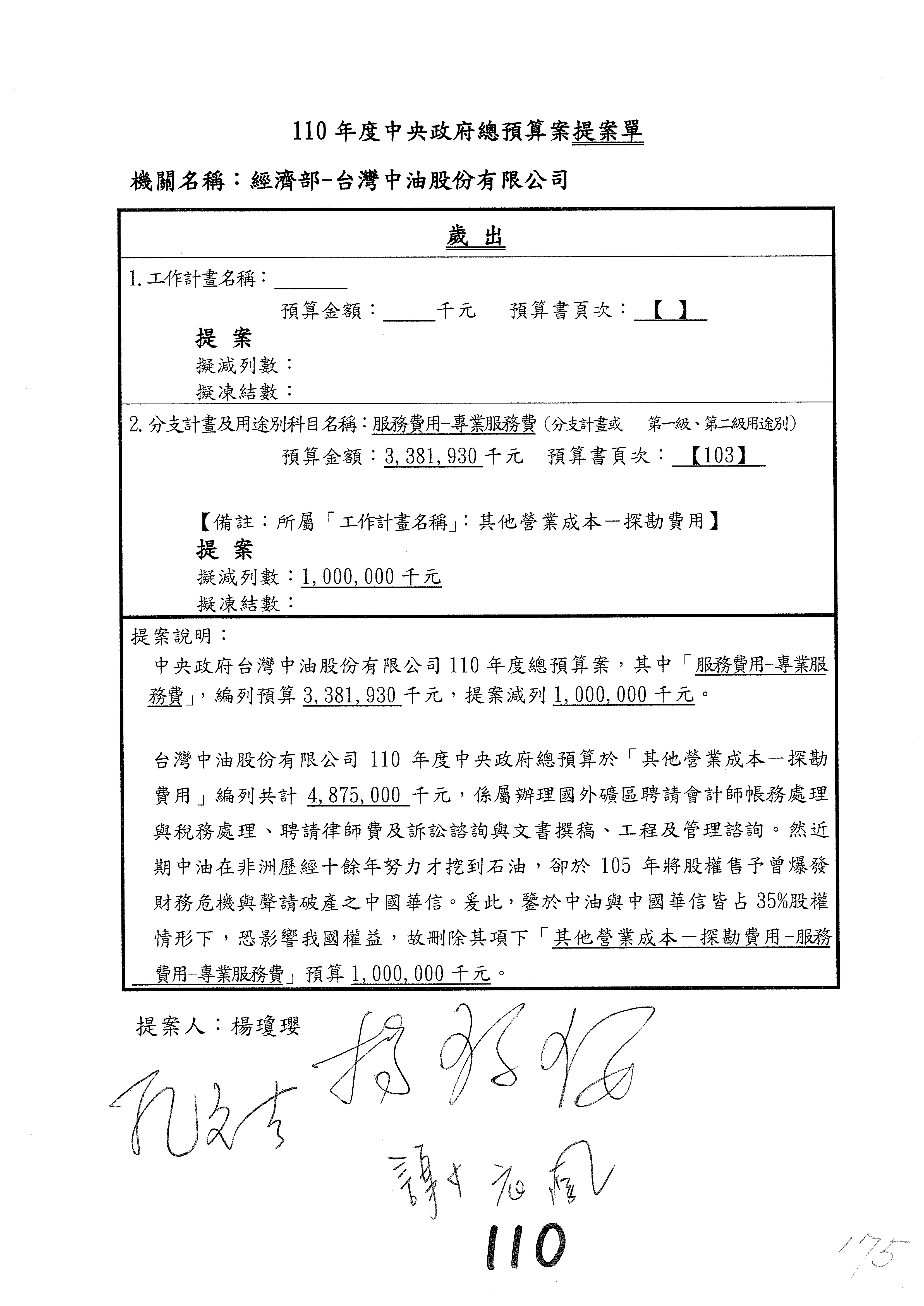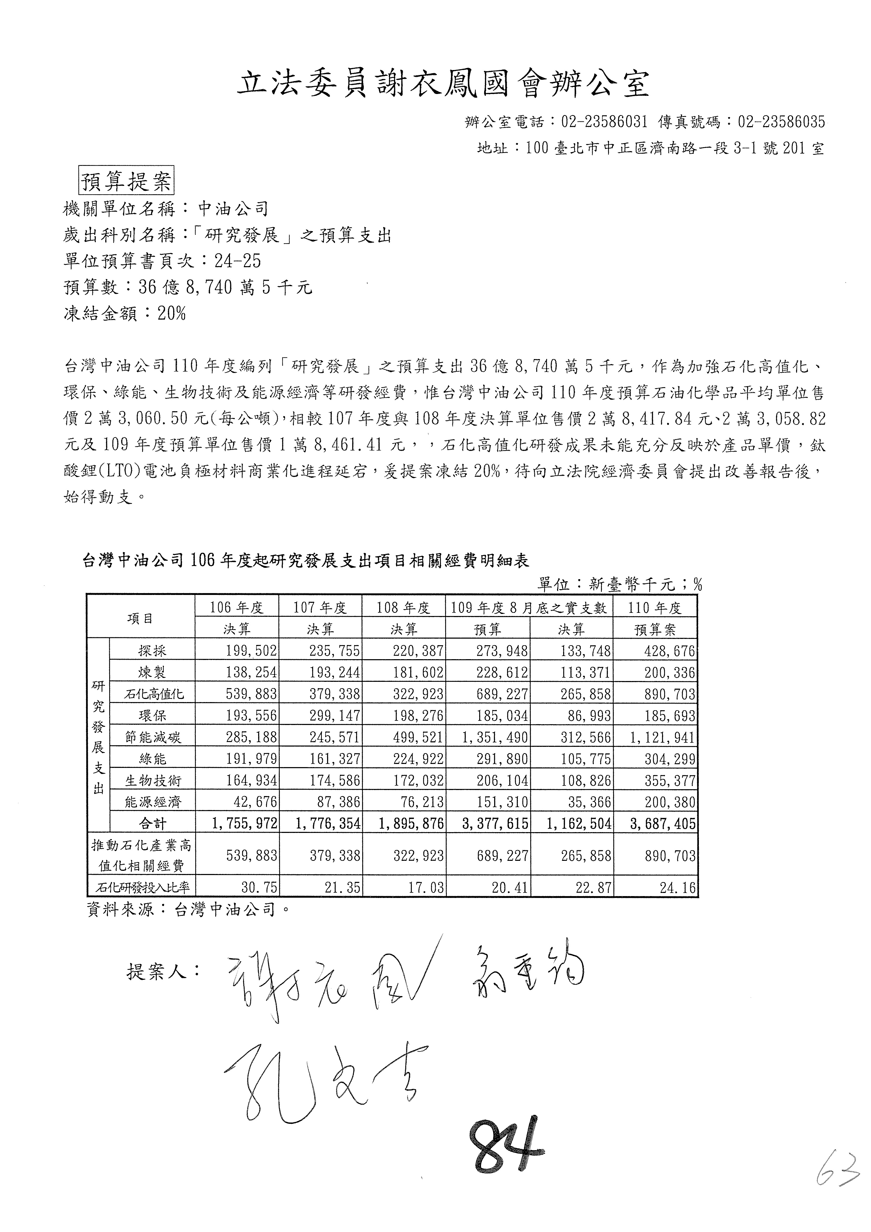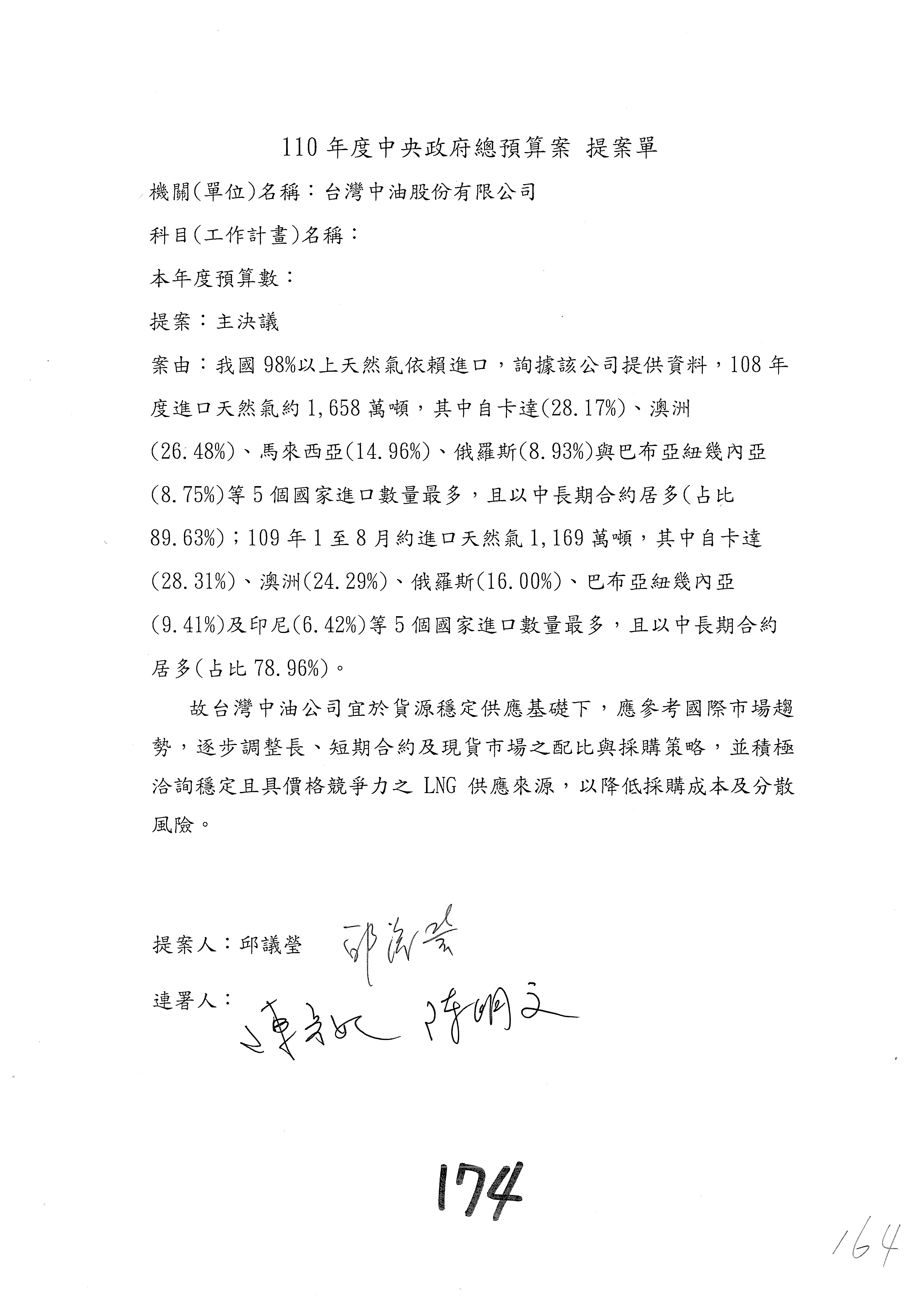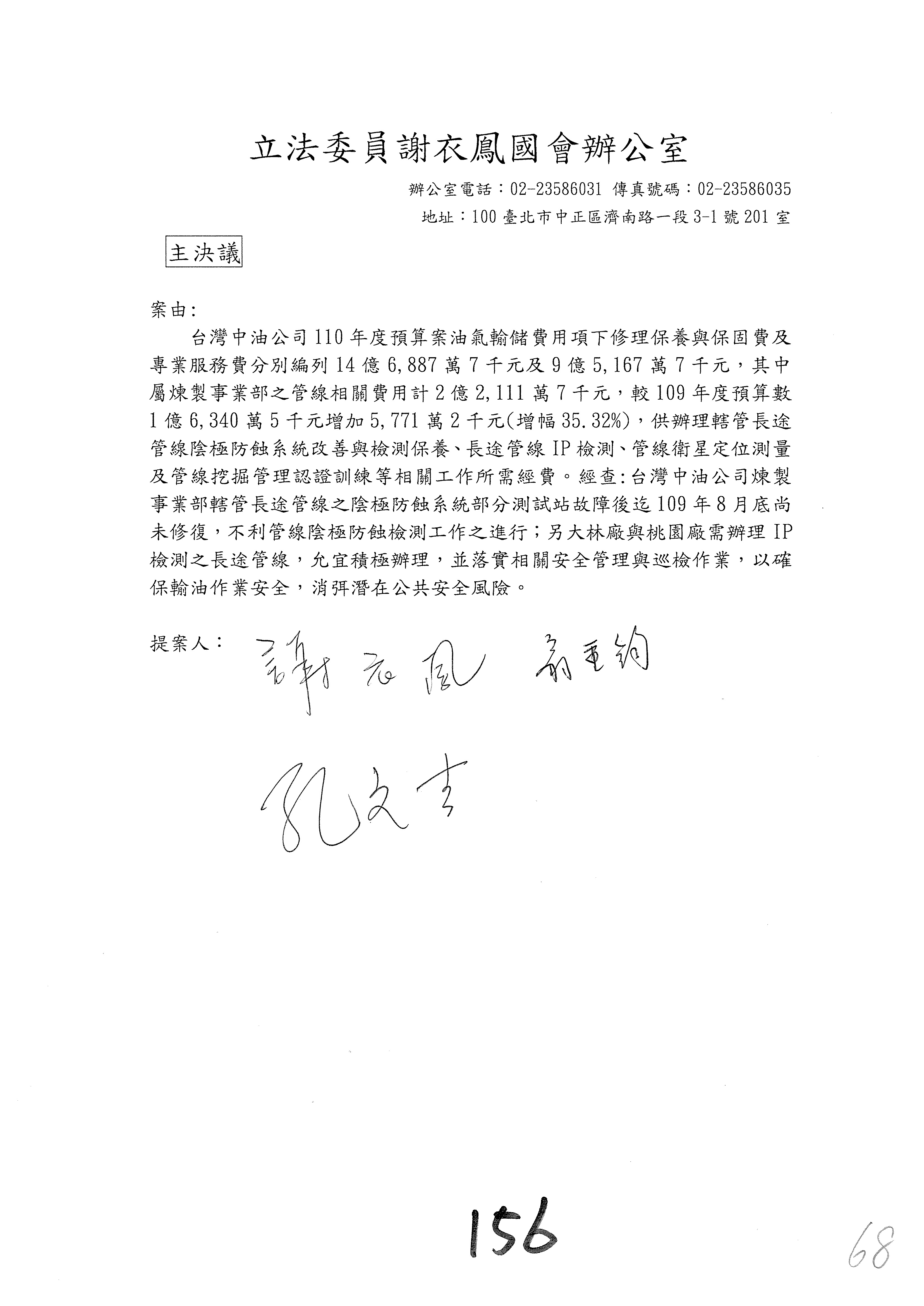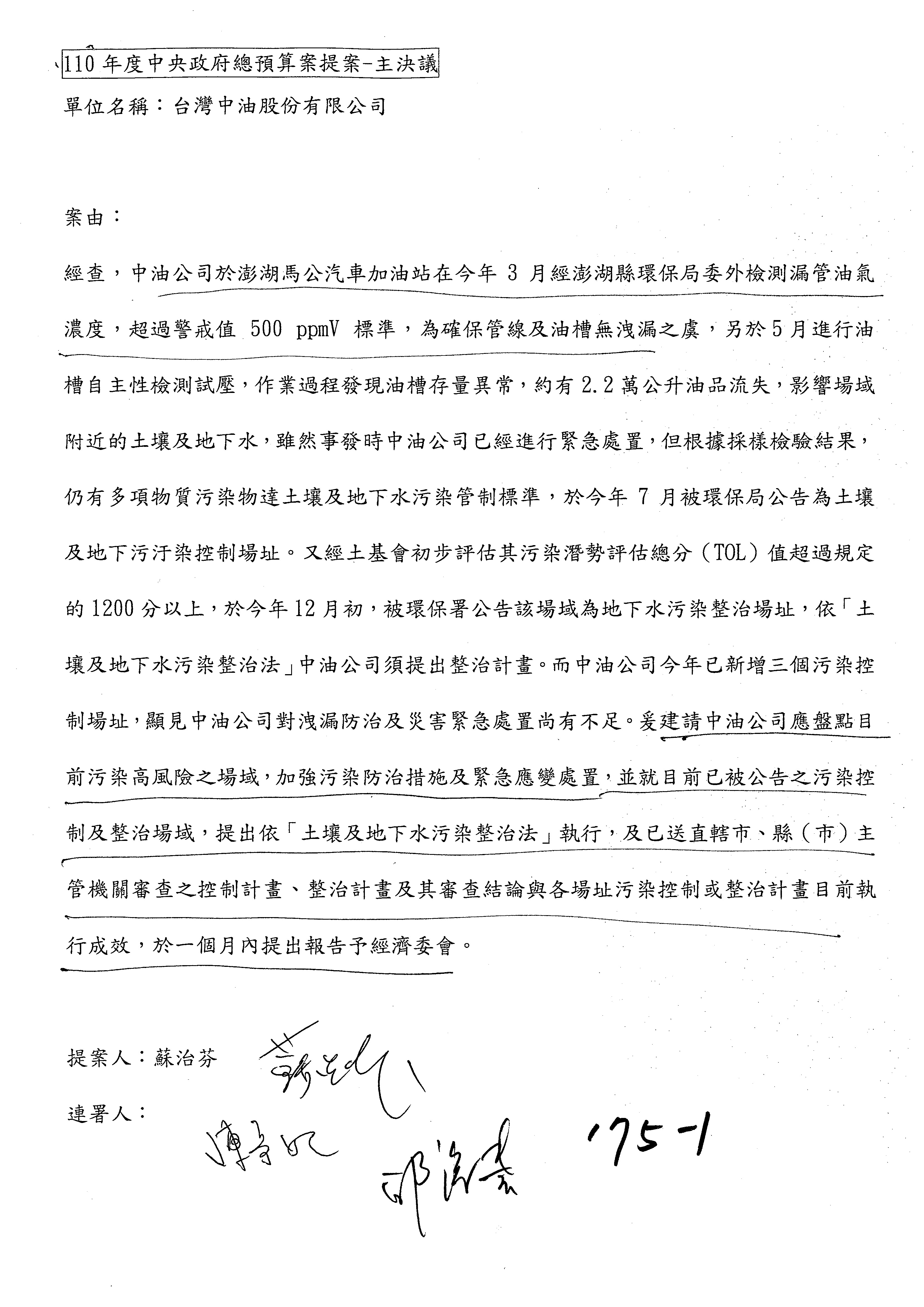 中油公司預算提案協商結論:第76案到第82案「工安環保及衛生」凍結5,000萬元,提出書面報告後始得動支;第83案到第85案為「研究發展支出」,其中第83案改主決議,「研究發展支出」凍結3億元,提出書面報告後始得動支;第86案到第88案增列「營業收入」2,000萬元;第89案減列「水電費」4,000萬元,科目自行調整;第90案到第99案減列「旅運費」900萬元,科目自行調整;第100案到第103案「印刷裝訂與廣告費」凍結2,000萬元,提出書面報告後始得動支;第104案撤案;第105案預算照列;第106案至第112案,其中第107案、第109案改主決議,「專業服務費」減列1,000萬元,科目自行調整,另凍結5,000萬元,提出書面報告後始得動支;第113案照案通過;第114案「會費」減列300萬元,科目自行調整;第115案預算照列;第116案保留送院會處理;第117案至第124案「油氣輸儲費用」減列1,000萬元,科目自行調整;第125案到第127案「探勘費用」凍結10%,提出專案報告後始得動支;第128案「管理費用」減列100萬元,科目自行調整;第129案及第130案「利息」減列600萬元;第131案到第133案「其他營業外費用」凍結1,000萬元,提出書面報告後始得動支;第134案到第136案「專案計畫」減列20億元,另凍結10億元,提出專案報告後始得動支;第137案保留送院會處理;主決議第138案至第168案均照案通過;第169案最後一句修正為「爰提案要求經濟部應將120年底的自備儲槽容積天數規定調高至30天以上」;第170案將「每季」改為「每年」;第171案也將「每季」改為「每年」;第172案「專案報告」改為「書面報告」;第173案、第174案、第175案及第175-1案均照案通過。