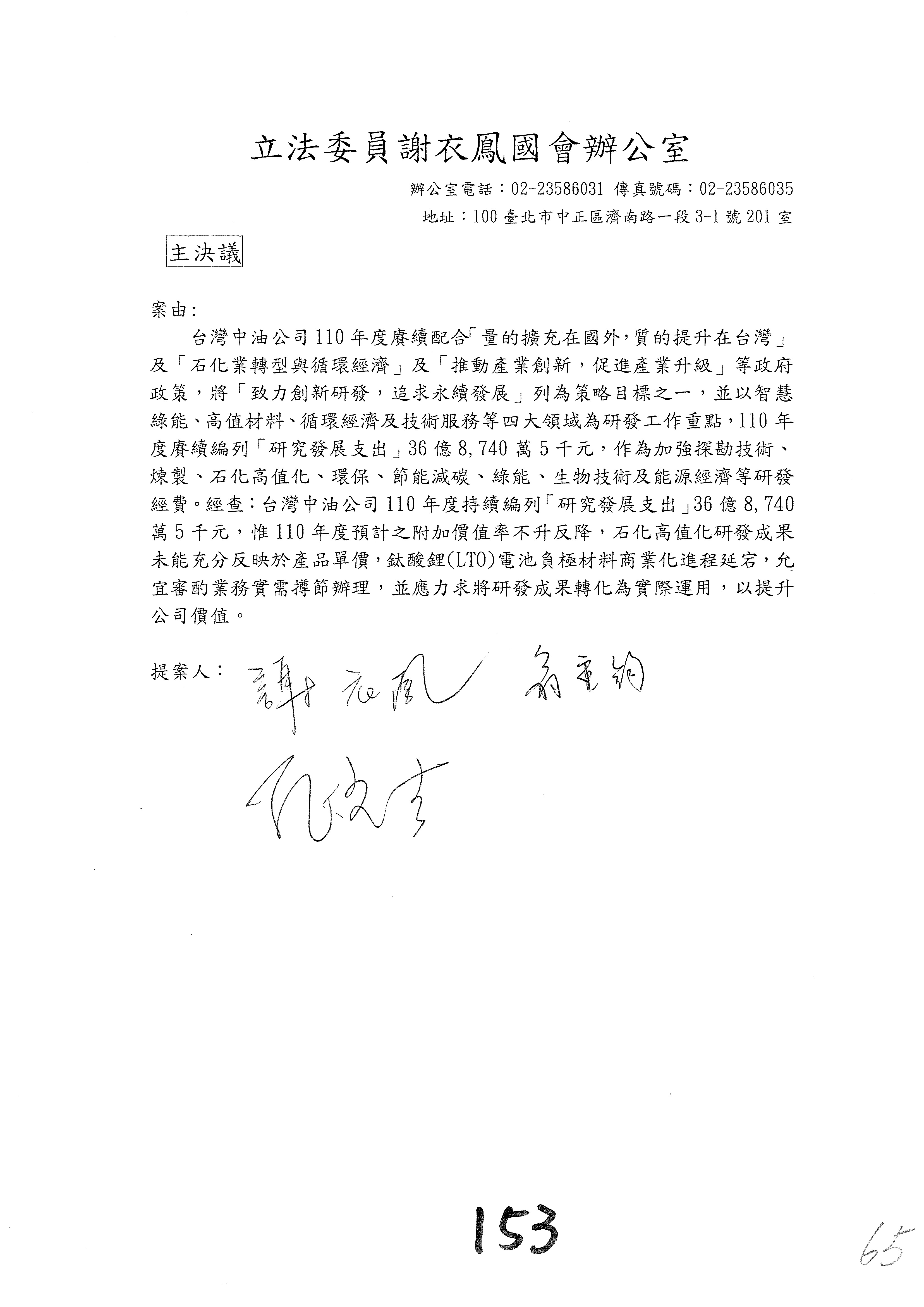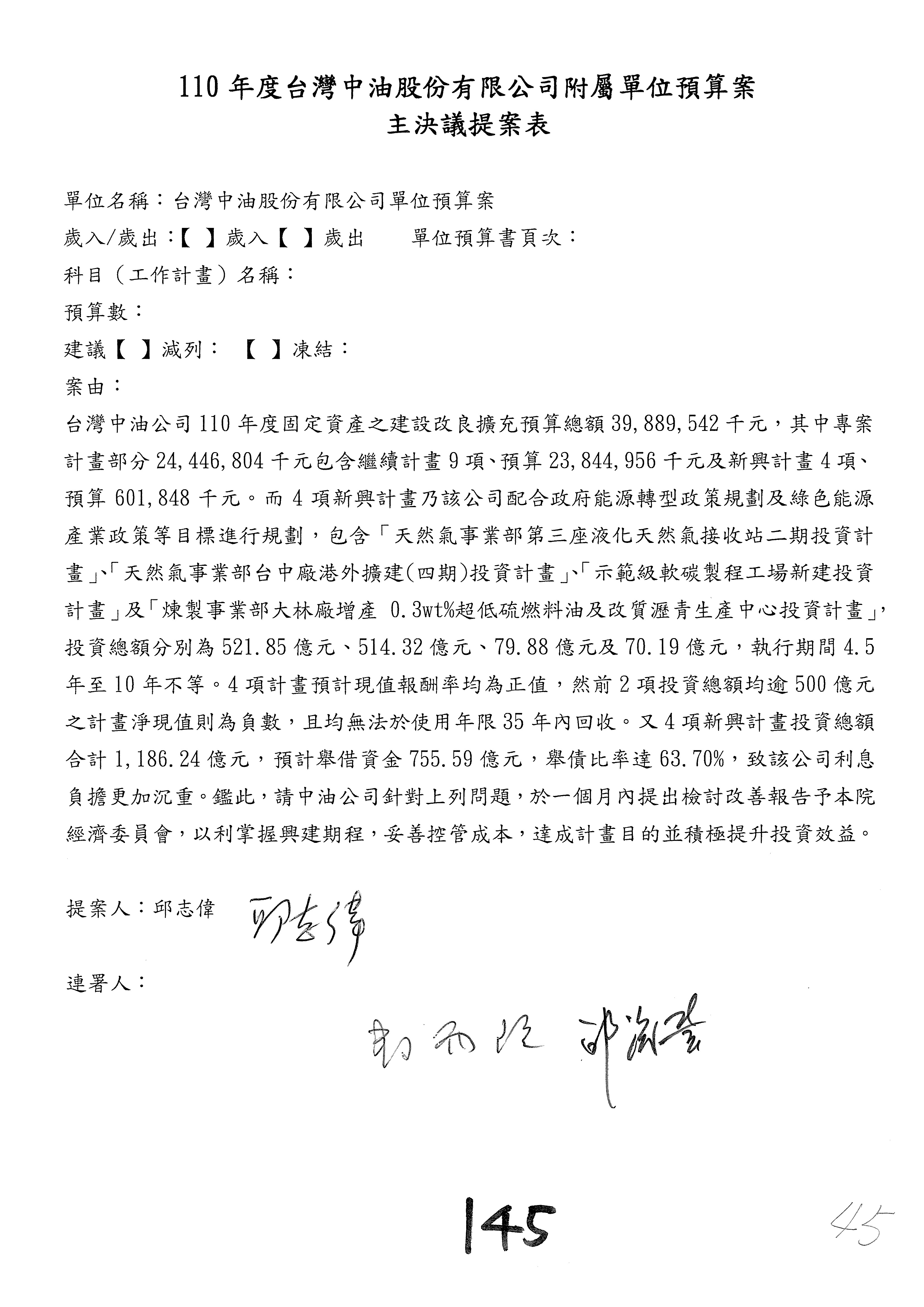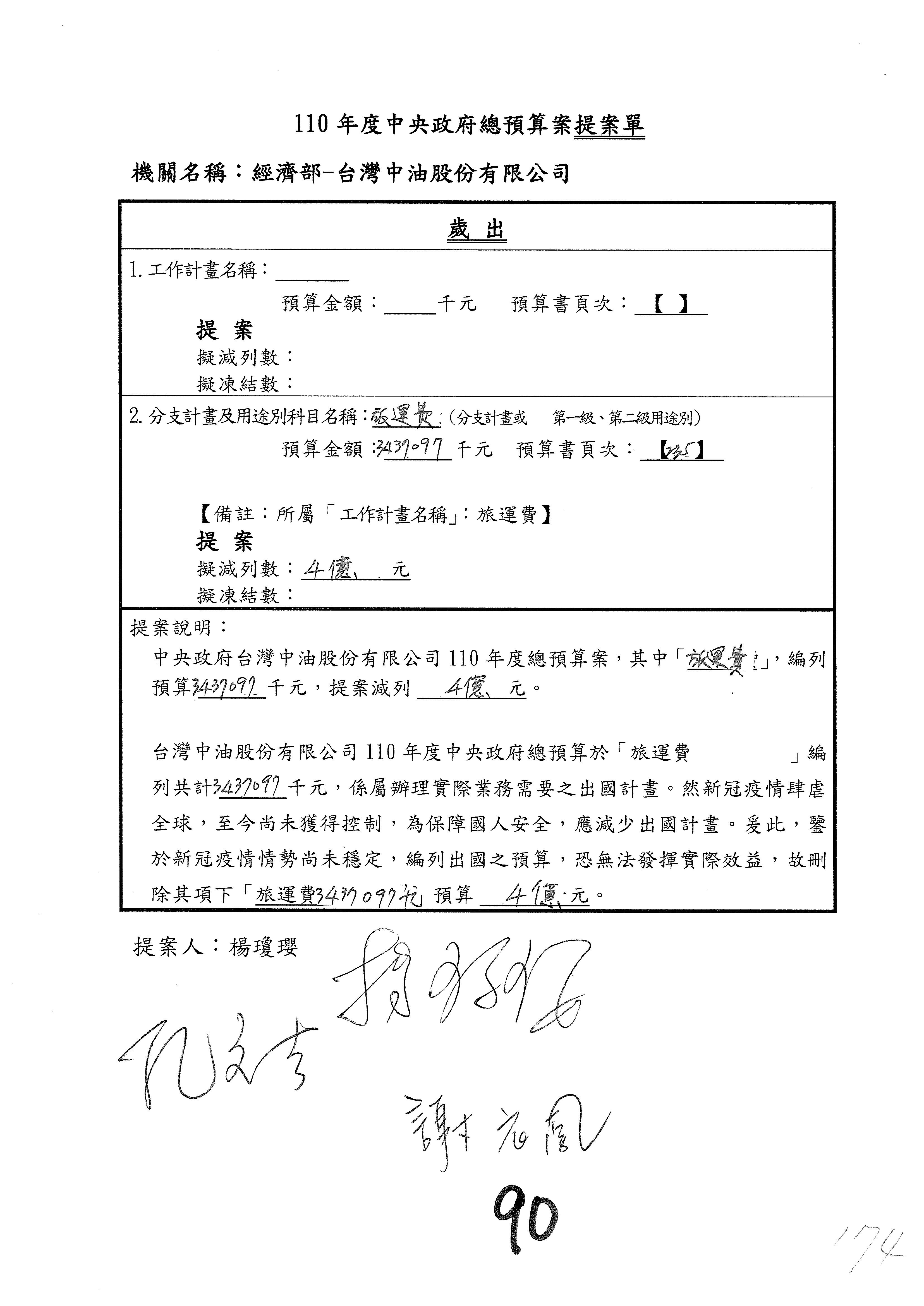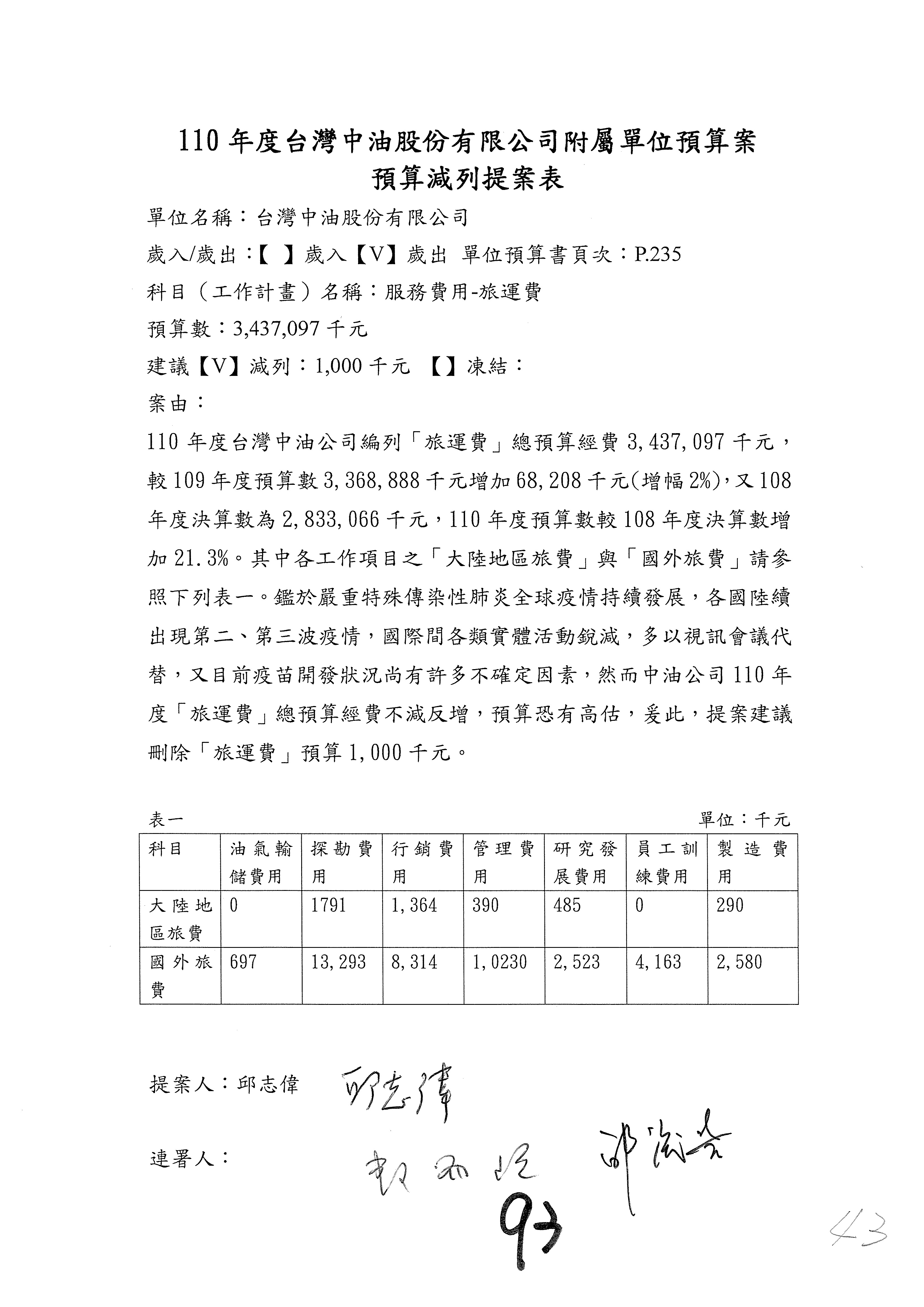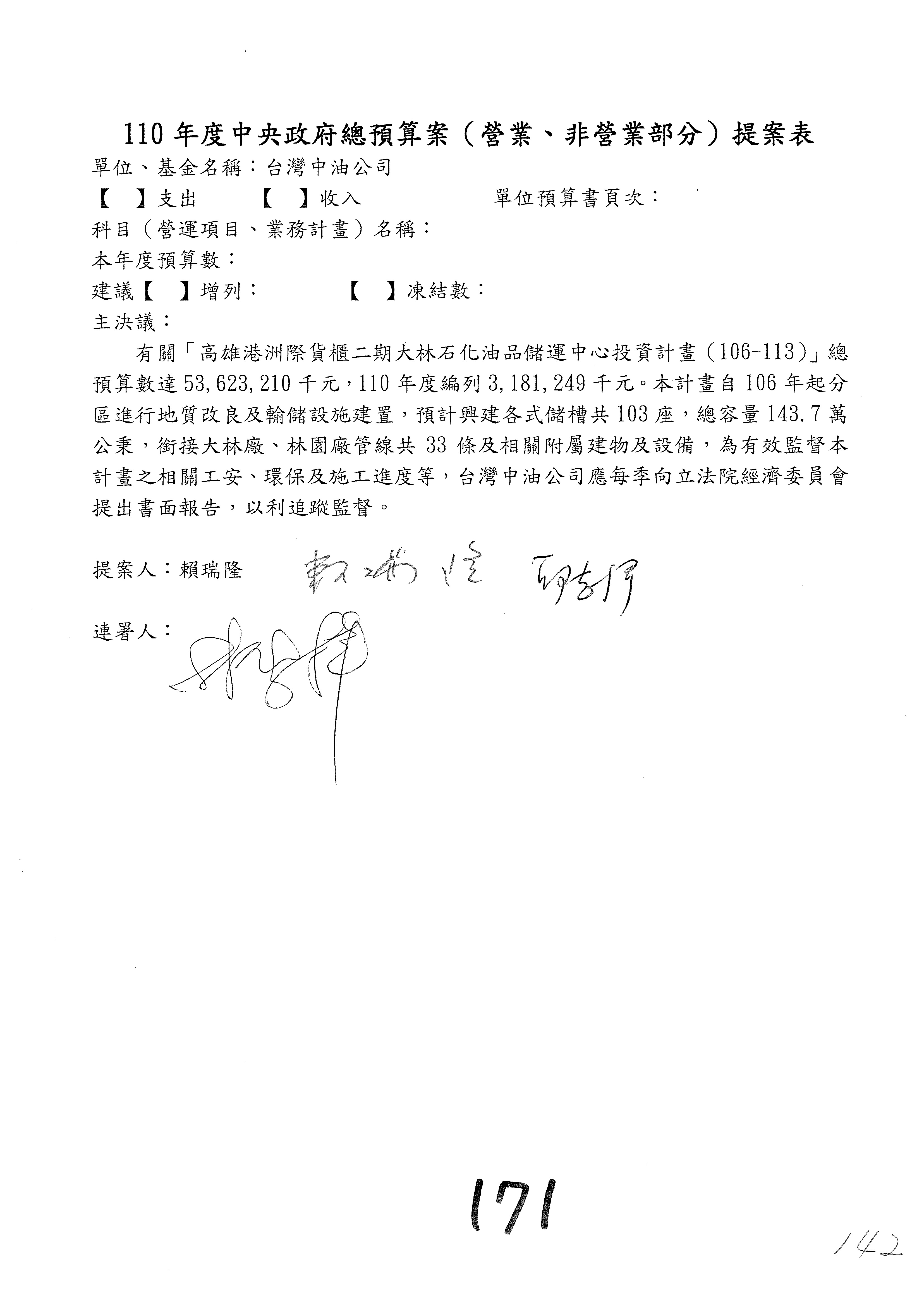 中油公司預算提案協商結論:第76案到第82案「工安環保及衛生」凍結5,000萬元,提出書面報告後始得動支;第83案到第85案為「研究發展支出」,其中第83案改主決議,「研究發展支出」凍結3億元,提出書面報告後始得動支;第86案到第88案增列「營業收入」2,000萬元;第89案減列「水電費」4,000萬元,科目自行調整;第90案到第99案減列「旅運費」900萬元,科目自行調整;第100案到第103案「印刷裝訂與廣告費」凍結2,000萬元,提出書面報告後始得動支;第104案撤案;第105案預算照列;第106案至第112案,其中第107案、第109案改主決議,「專業服務費」減列1,000萬元,科目自行調整,另凍結5,000萬元,提出書面報告後始得動支;第113案照案通過;第114案「會費」減列300萬元,科目自行調整;第115案預算照列;第116案保留送院會處理;第117案至第124案「油氣輸儲費用」減列1,000萬元,科目自行調整;第125案到第127案「探勘費用」凍結10%,提出專案報告後始得動支;第128案「管理費用」減列100萬元,科目自行調整;第129案及第130案「利息」減列600萬元;第131案到第133案「其他營業外費用」凍結1,000萬元,提出書面報告後始得動支;第134案到第136案「專案計畫」減列20億元,另凍結10億元,提出專案報告後始得動支;第137案保留送院會處理;主決議第138案至第168案均照案通過;第169案最後一句修正為「爰提案要求經濟部應將120年底的自備儲槽容積天數規定調高至30天以上」;第170案將「每季」改為「每年」;第171案也將「每季」改為「每年」;第172案「專案報告」改為「書面報告」;第173案、第174案、第175案及第175-1案均照案通過。