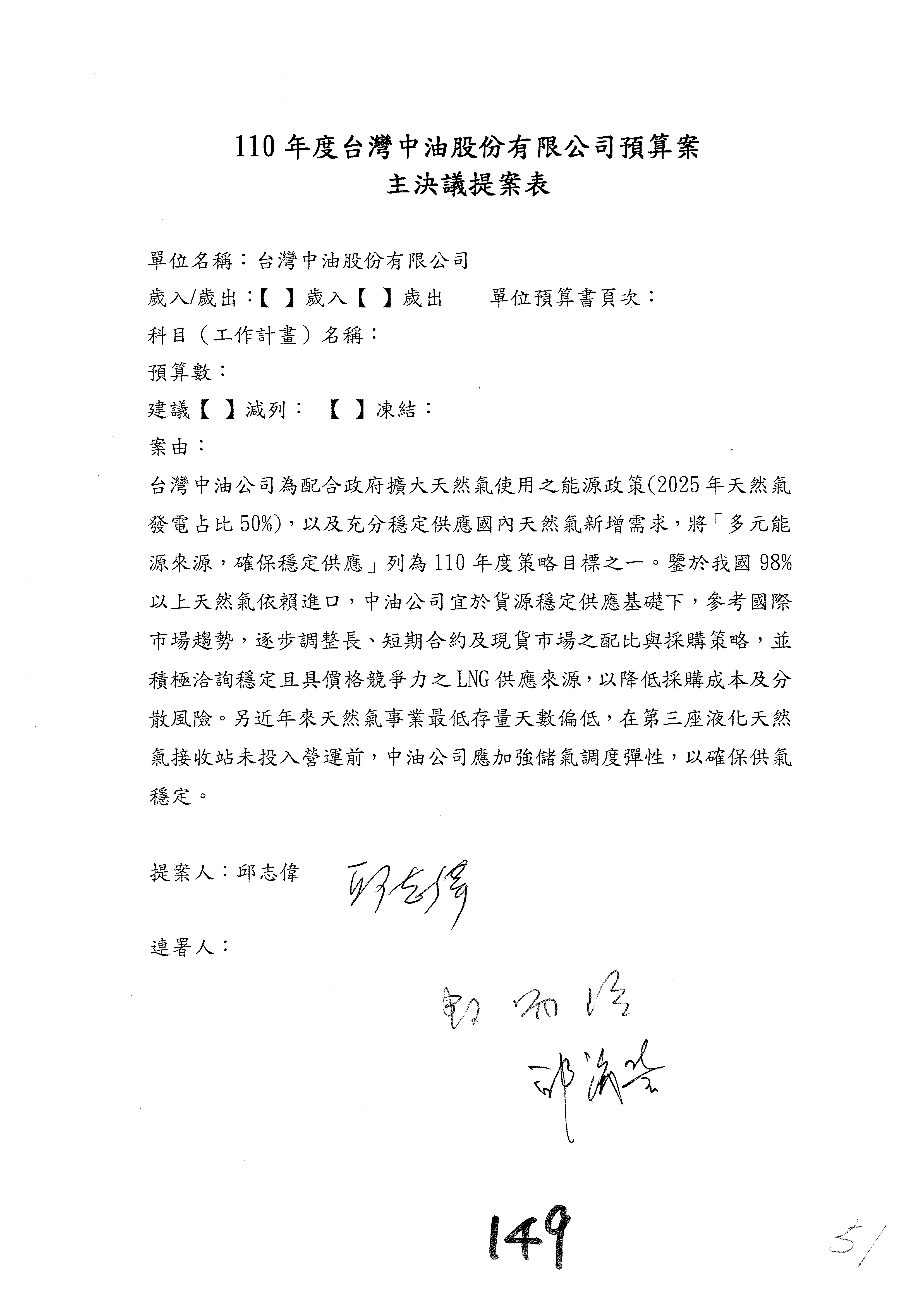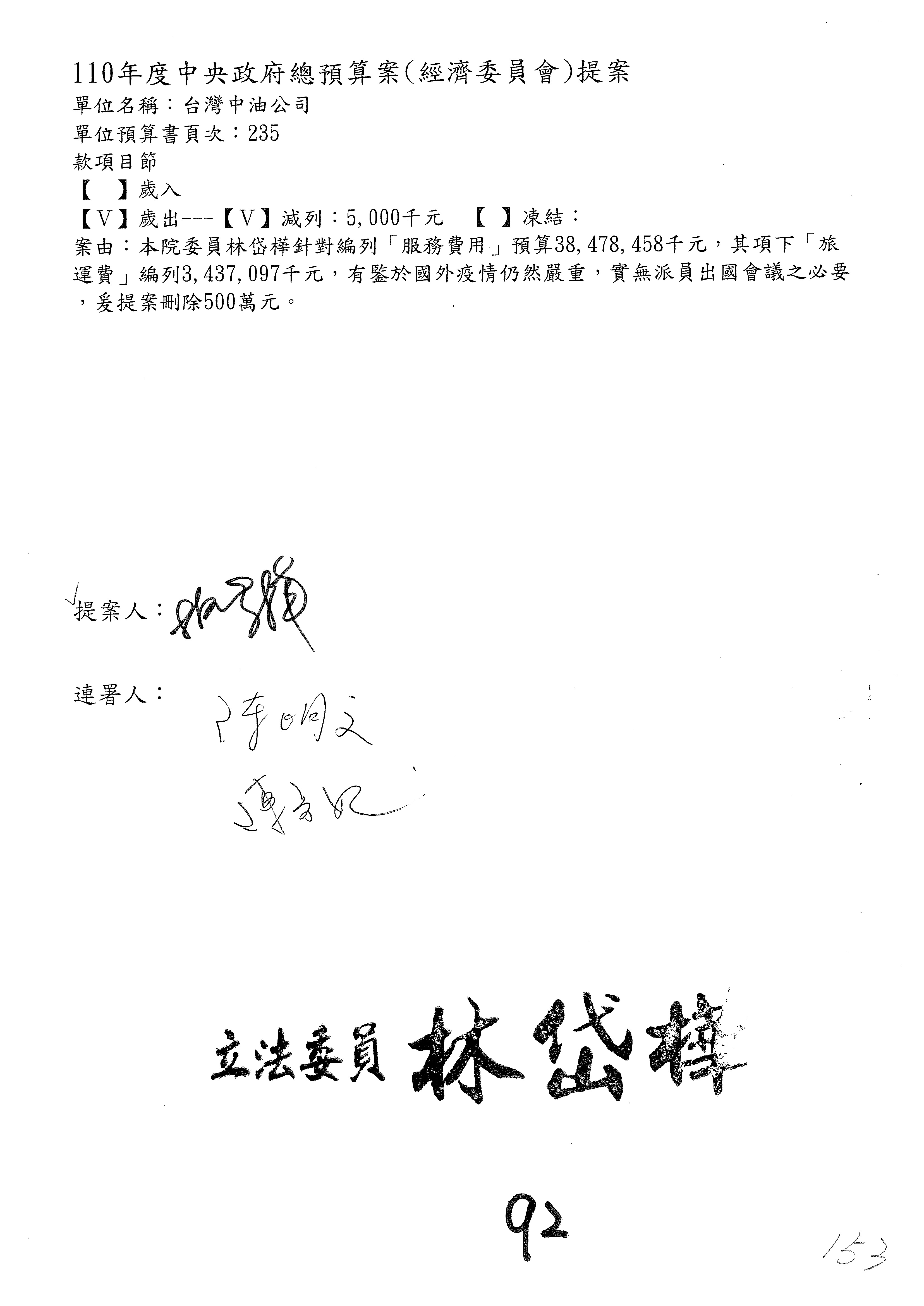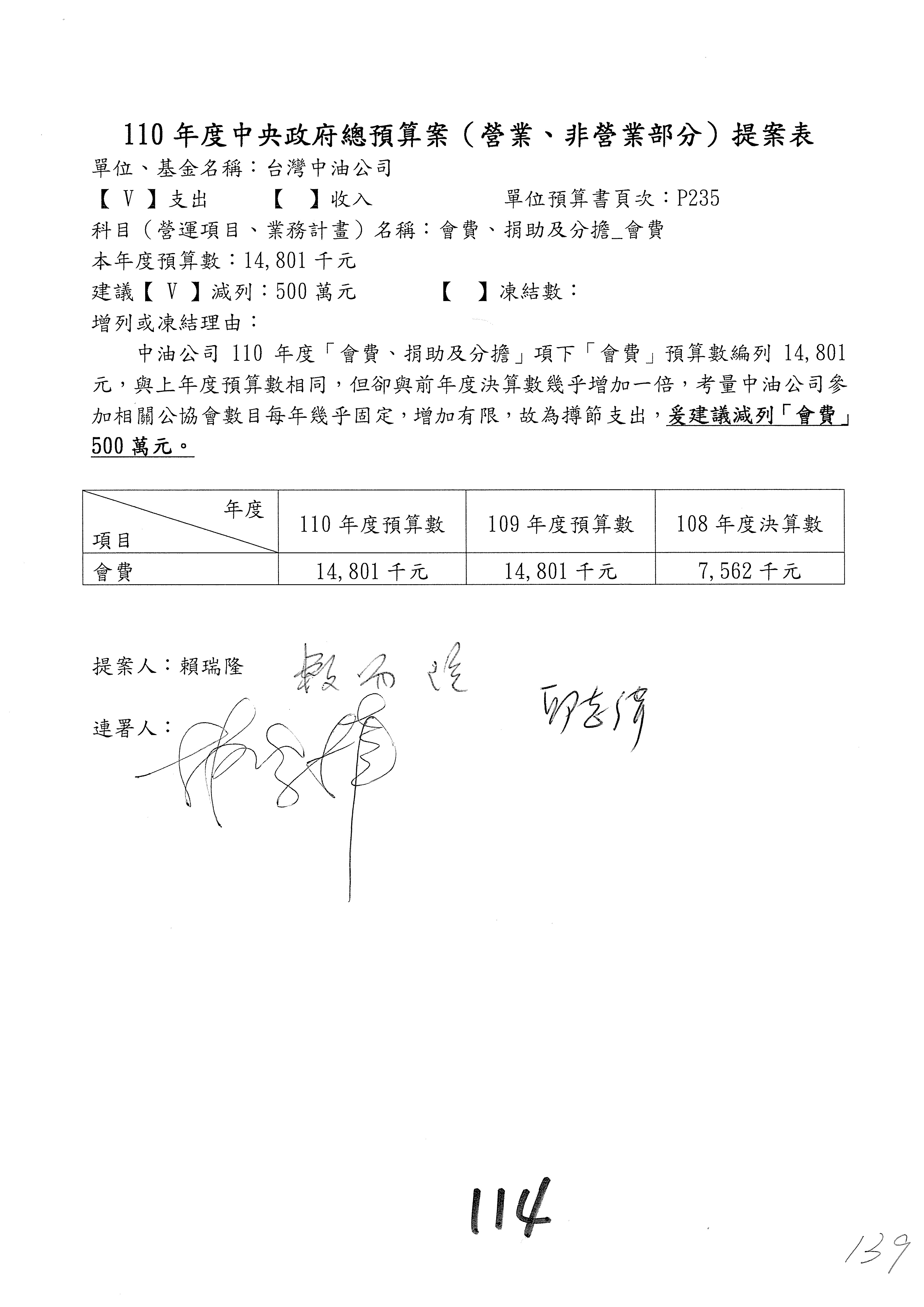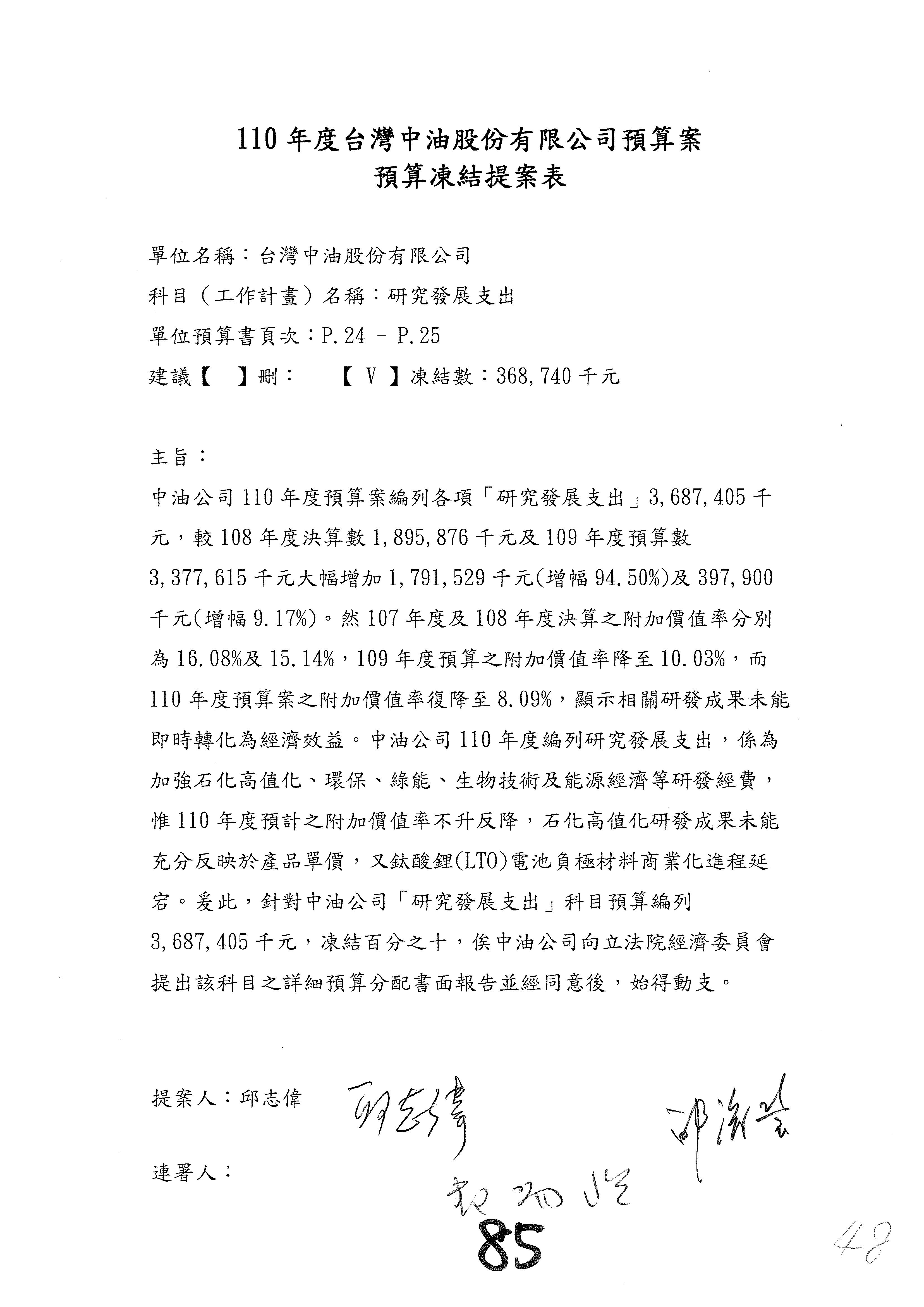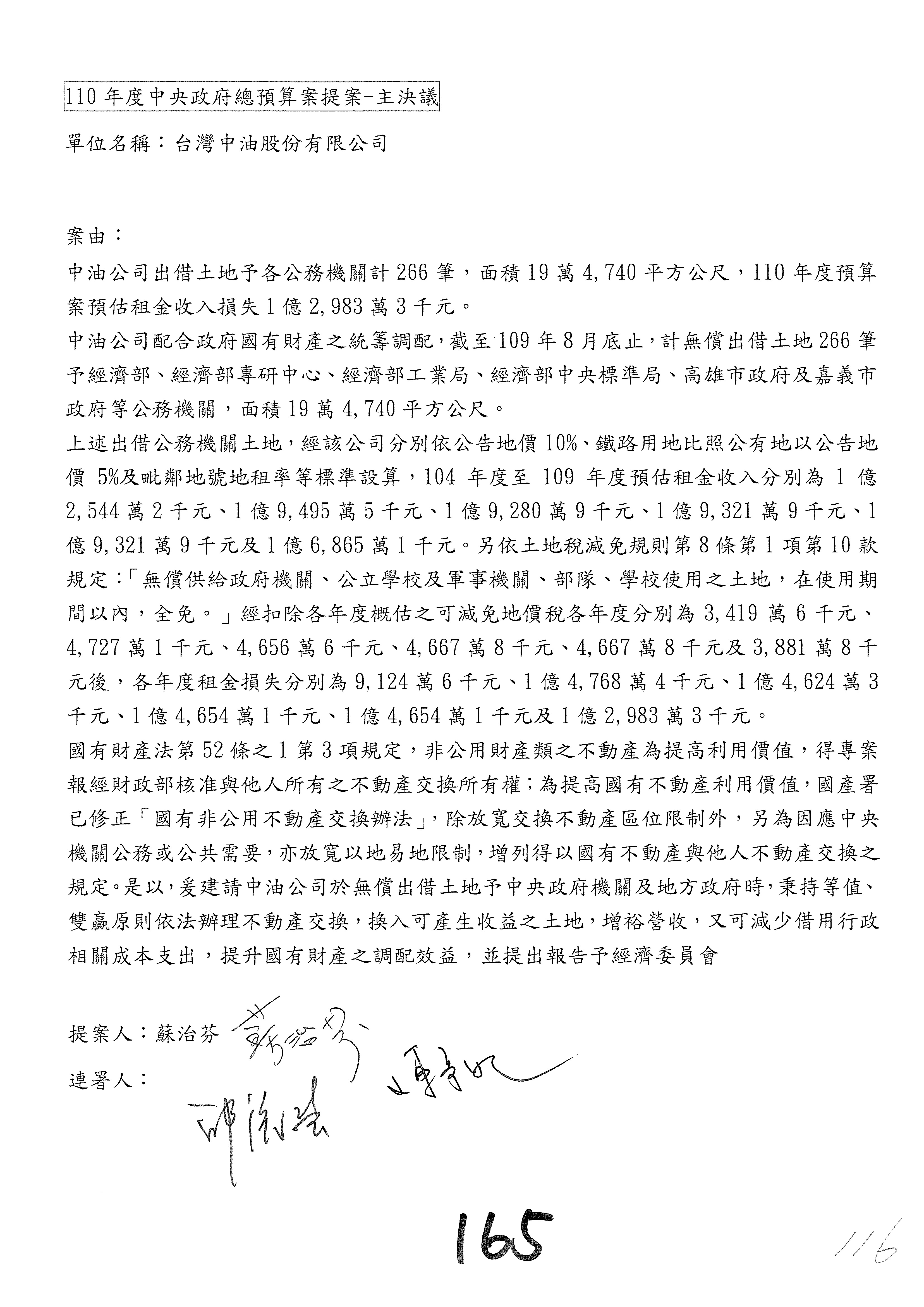 中油公司預算提案協商結論:第76案到第82案「工安環保及衛生」凍結5,000萬元,提出書面報告後始得動支;第83案到第85案為「研究發展支出」,其中第83案改主決議,「研究發展支出」凍結3億元,提出書面報告後始得動支;第86案到第88案增列「營業收入」2,000萬元;第89案減列「水電費」4,000萬元,科目自行調整;第90案到第99案減列「旅運費」900萬元,科目自行調整;第100案到第103案「印刷裝訂與廣告費」凍結2,000萬元,提出書面報告後始得動支;第104案撤案;第105案預算照列;第106案至第112案,其中第107案、第109案改主決議,「專業服務費」減列1,000萬元,科目自行調整,另凍結5,000萬元,提出書面報告後始得動支;第113案照案通過;第114案「會費」減列300萬元,科目自行調整;第115案預算照列;第116案保留送院會處理;第117案至第124案「油氣輸儲費用」減列1,000萬元,科目自行調整;第125案到第127案「探勘費用」凍結10%,提出專案報告後始得動支;第128案「管理費用」減列100萬元,科目自行調整;第129案及第130案「利息」減列600萬元;第131案到第133案「其他營業外費用」凍結1,000萬元,提出書面報告後始得動支;第134案到第136案「專案計畫」減列20億元,另凍結10億元,提出專案報告後始得動支;第137案保留送院會處理;主決議第138案至第168案均照案通過;第169案最後一句修正為「爰提案要求經濟部應將120年底的自備儲槽容積天數規定調高至30天以上」;第170案將「每季」改為「每年」;第171案也將「每季」改為「每年」;第172案「專案報告」改為「書面報告」;第173案、第174案、第175案及第175-1案均照案通過。