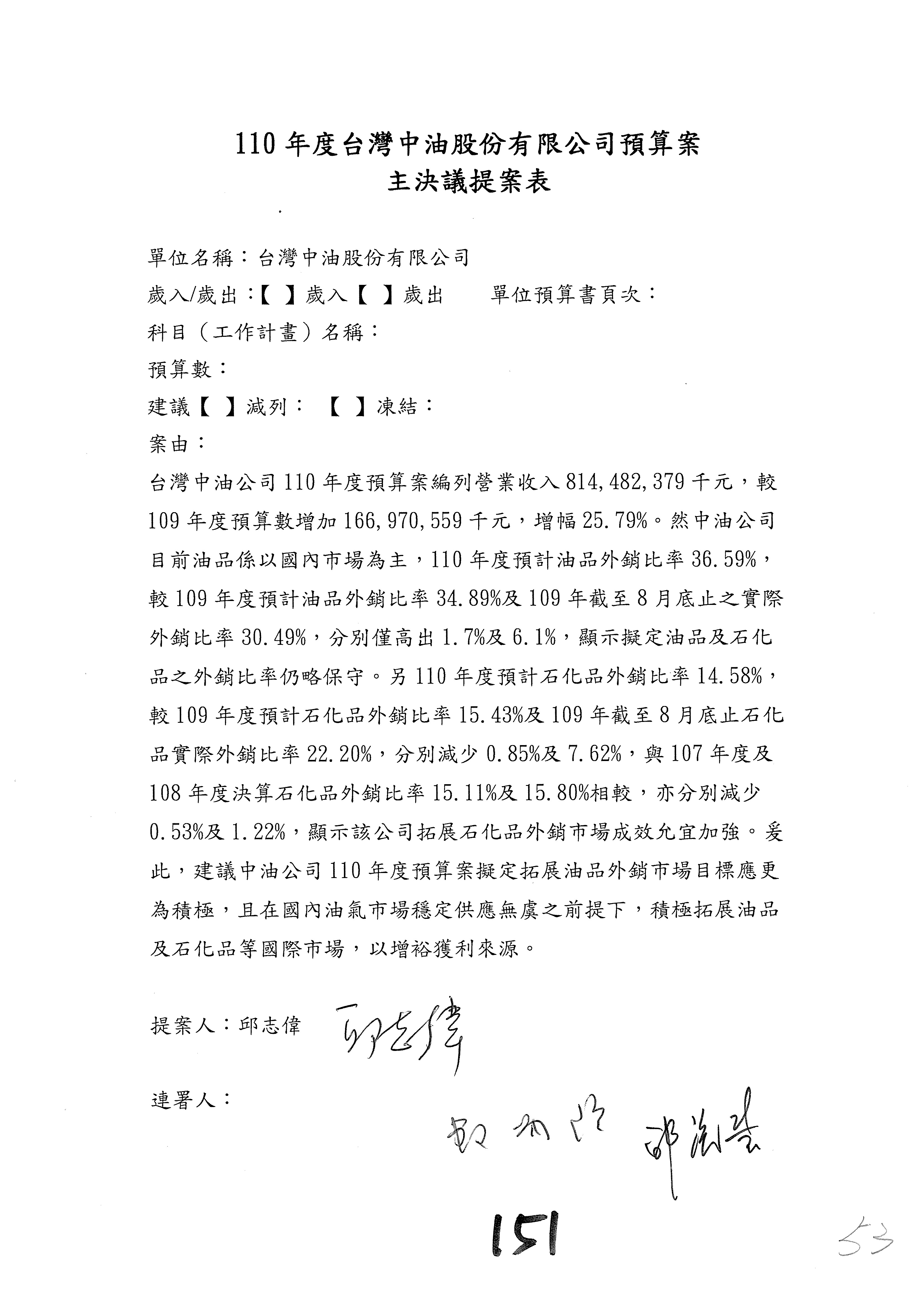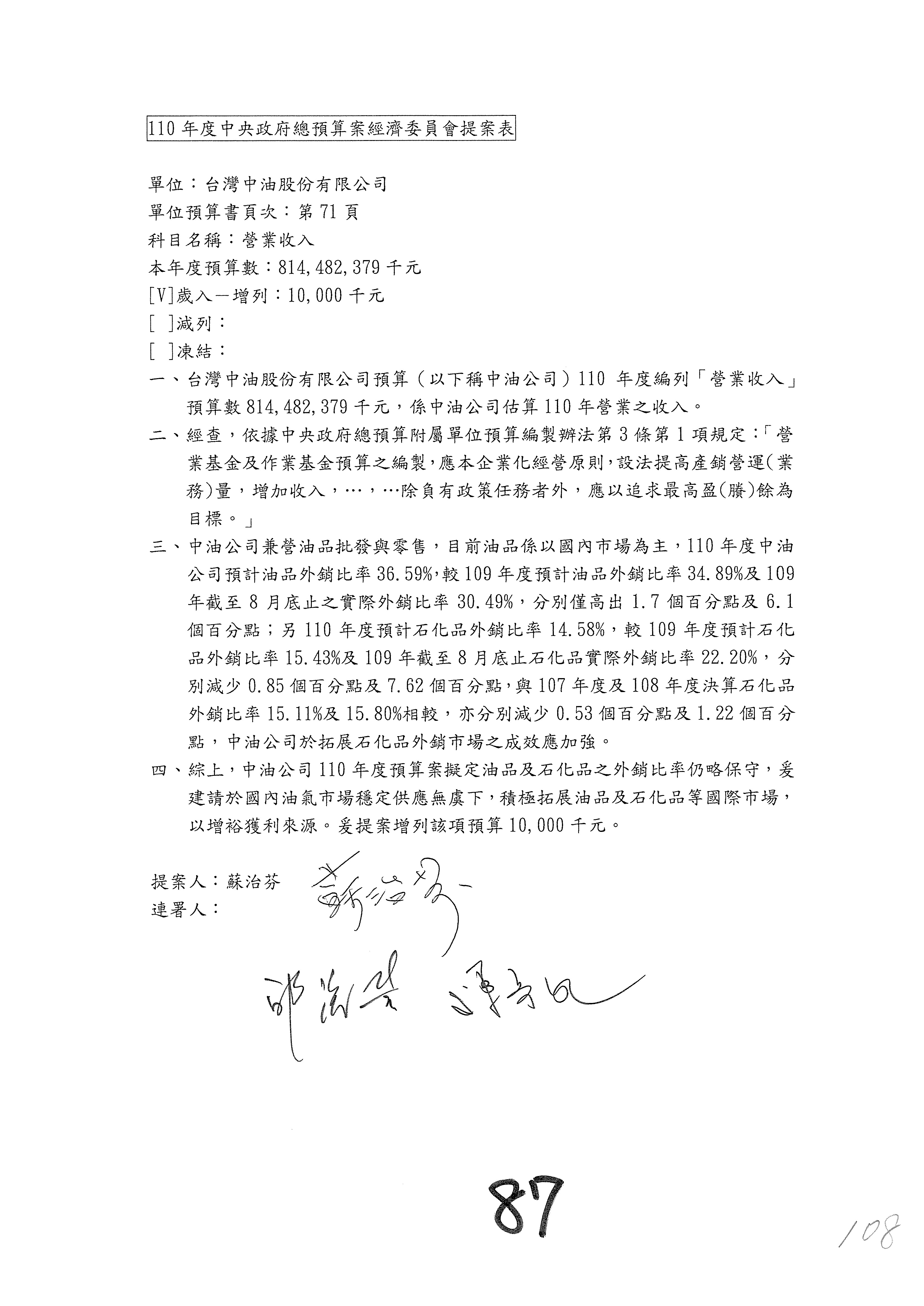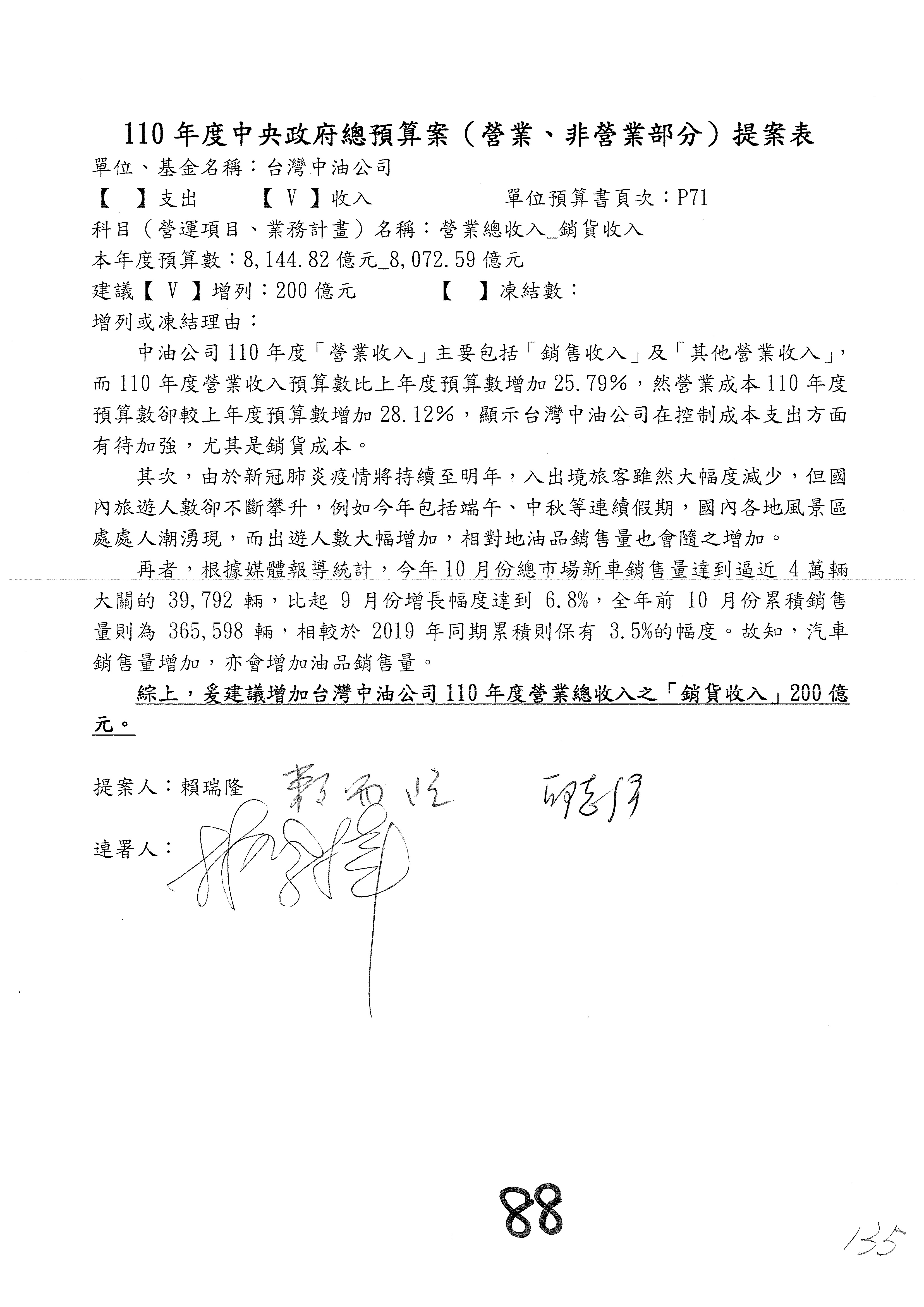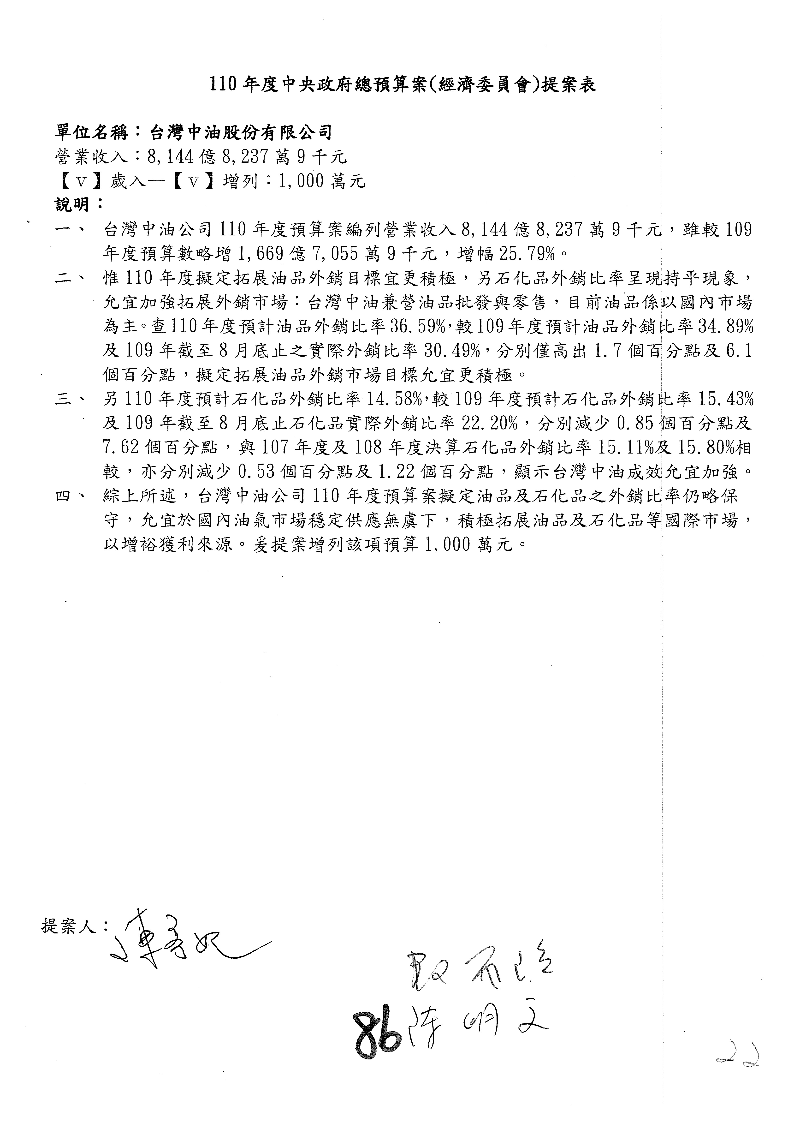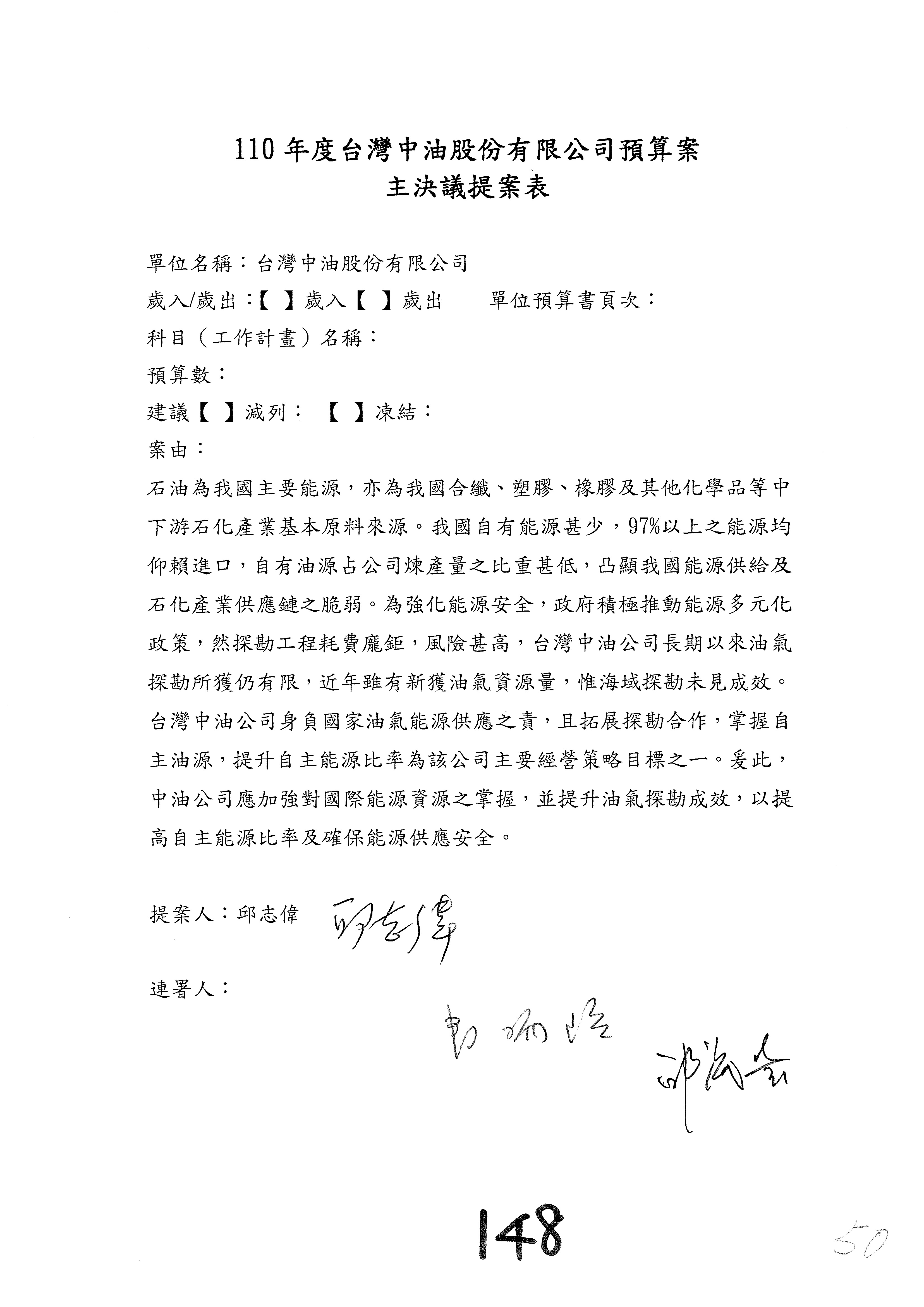 中油公司預算提案協商結論:第76案到第82案「工安環保及衛生」凍結5,000萬元,提出書面報告後始得動支;第83案到第85案為「研究發展支出」,其中第83案改主決議,「研究發展支出」凍結3億元,提出書面報告後始得動支;第86案到第88案增列「營業收入」2,000萬元;第89案減列「水電費」4,000萬元,科目自行調整;第90案到第99案減列「旅運費」900萬元,科目自行調整;第100案到第103案「印刷裝訂與廣告費」凍結2,000萬元,提出書面報告後始得動支;第104案撤案;第105案預算照列;第106案至第112案,其中第107案、第109案改主決議,「專業服務費」減列1,000萬元,科目自行調整,另凍結5,000萬元,提出書面報告後始得動支;第113案照案通過;第114案「會費」減列300萬元,科目自行調整;第115案預算照列;第116案保留送院會處理;第117案至第124案「油氣輸儲費用」減列1,000萬元,科目自行調整;第125案到第127案「探勘費用」凍結10%,提出專案報告後始得動支;第128案「管理費用」減列100萬元,科目自行調整;第129案及第130案「利息」減列600萬元;第131案到第133案「其他營業外費用」凍結1,000萬元,提出書面報告後始得動支;第134案到第136案「專案計畫」減列20億元,另凍結10億元,提出專案報告後始得動支;第137案保留送院會處理;主決議第138案至第168案均照案通過;第169案最後一句修正為「爰提案要求經濟部應將120年底的自備儲槽容積天數規定調高至30天以上」;第170案將「每季」改為「每年」;第171案也將「每季」改為「每年」;第172案「專案報告」改為「書面報告」;第173案、第174案、第175案及第175-1案均照案通過。