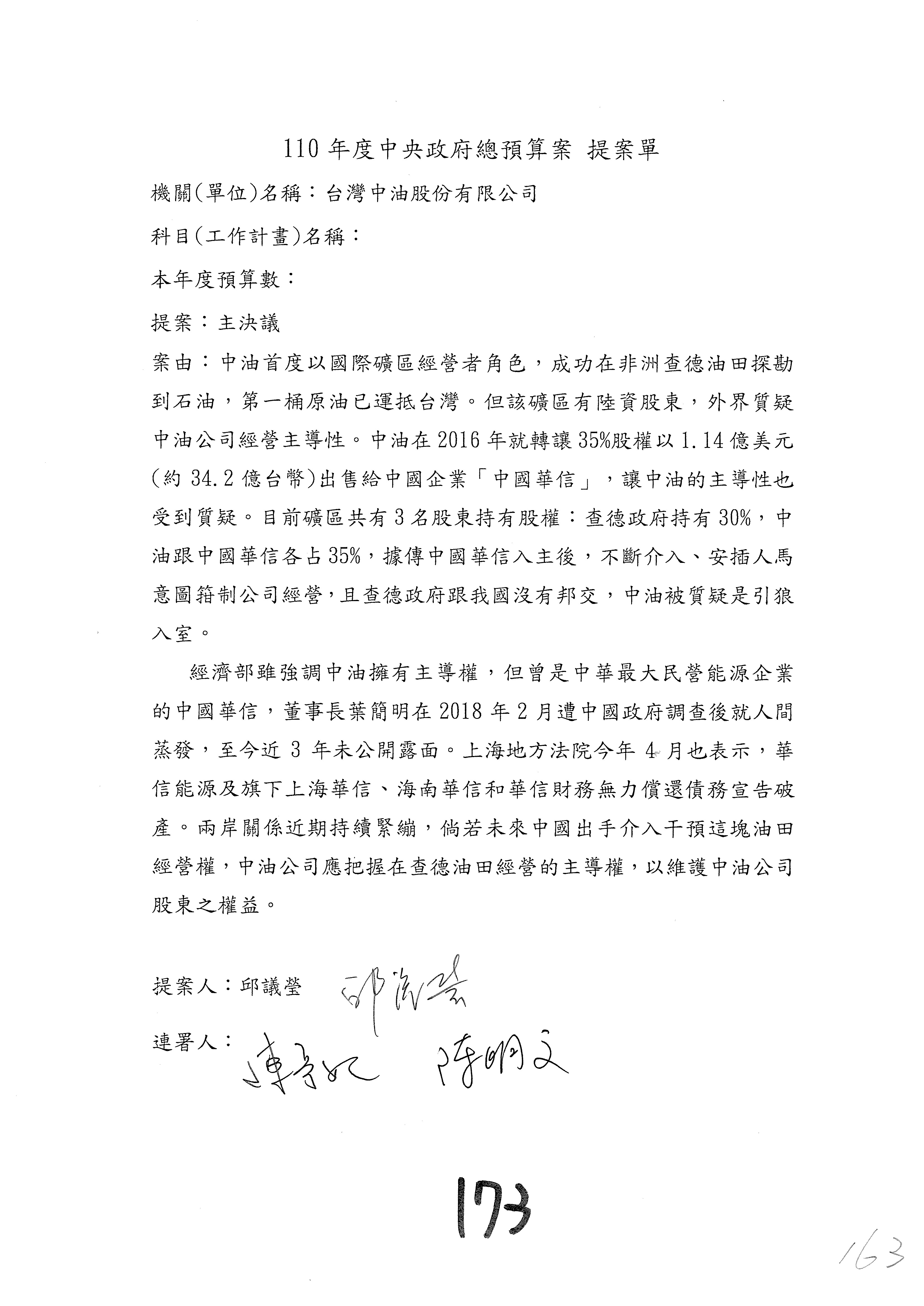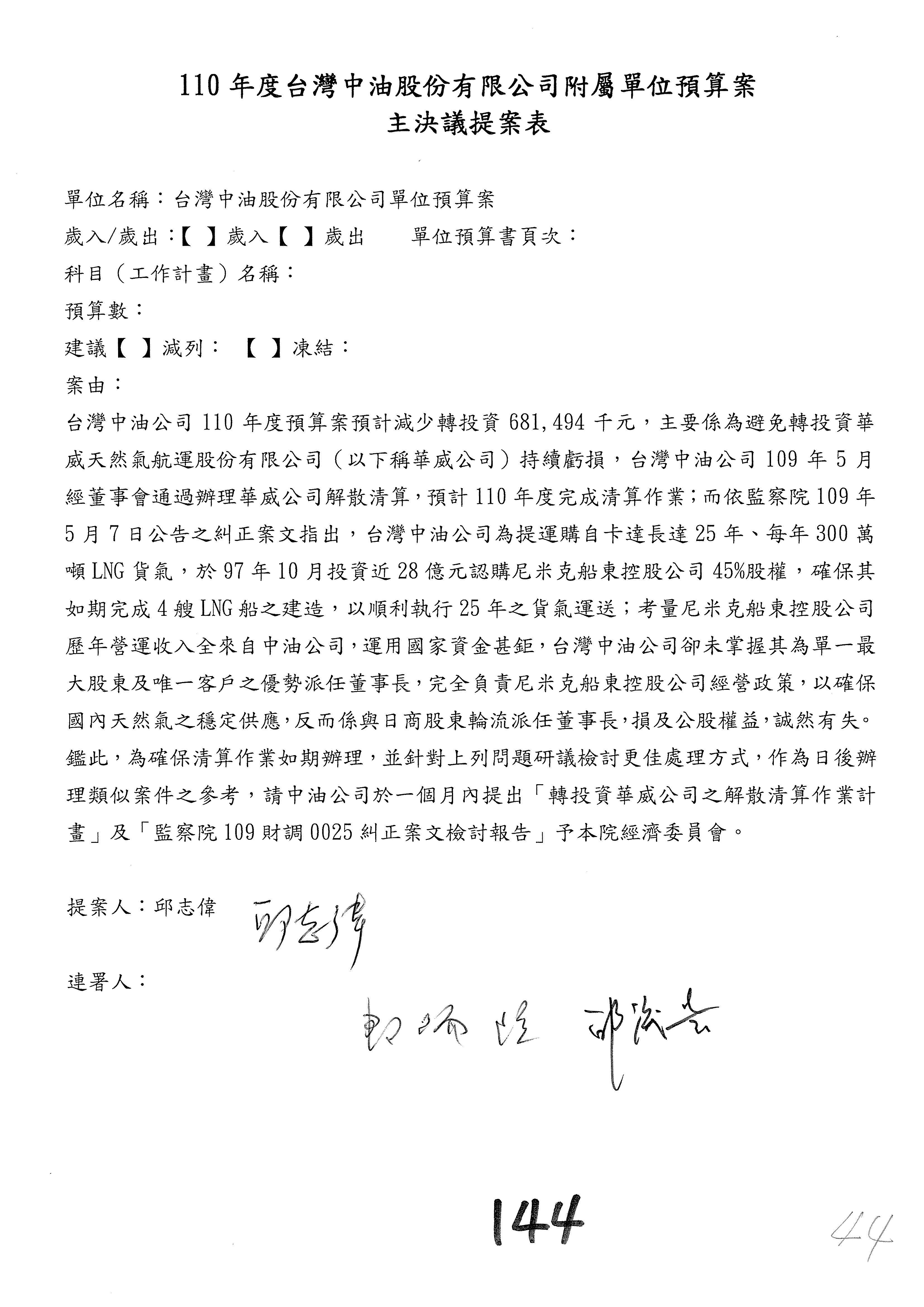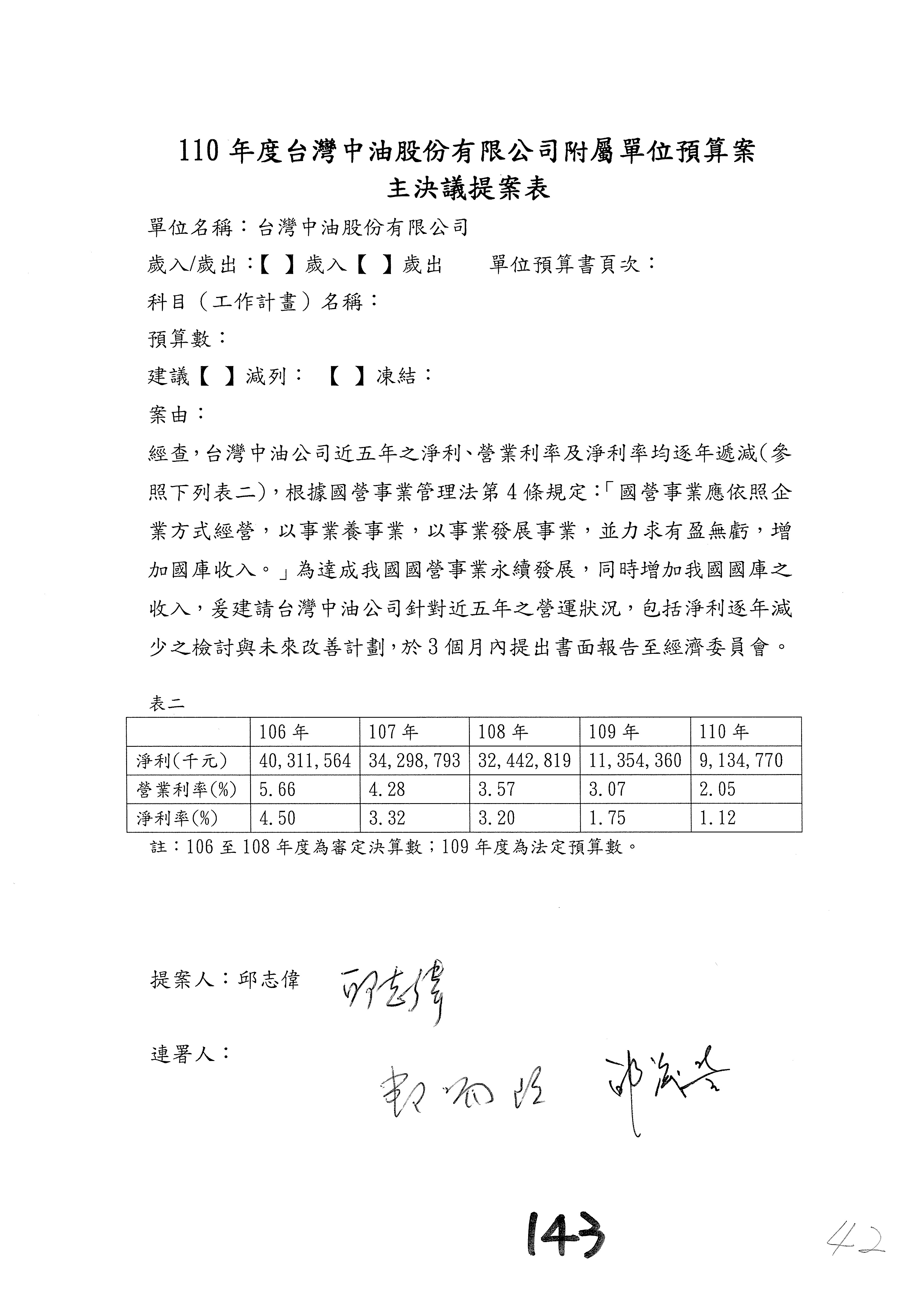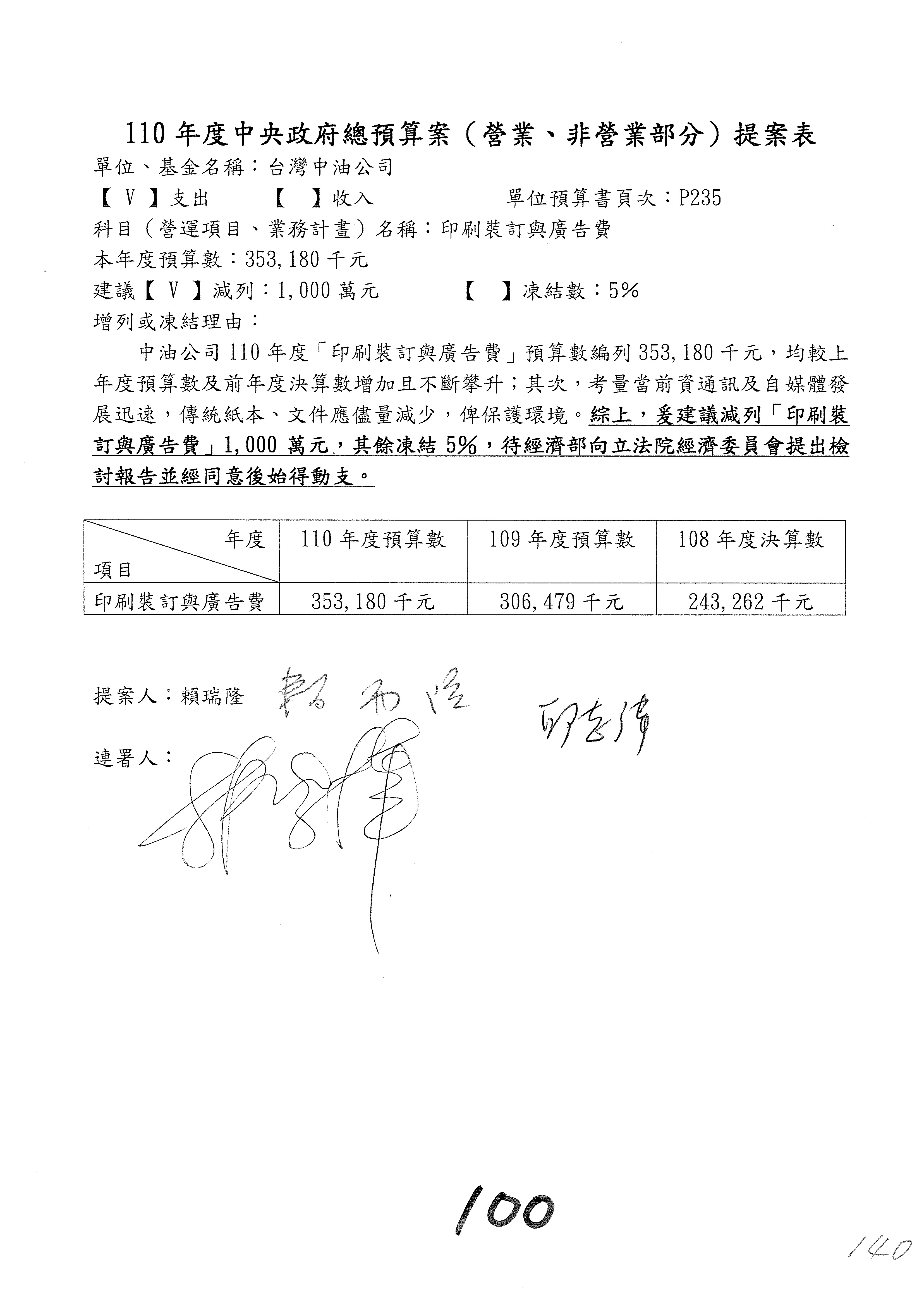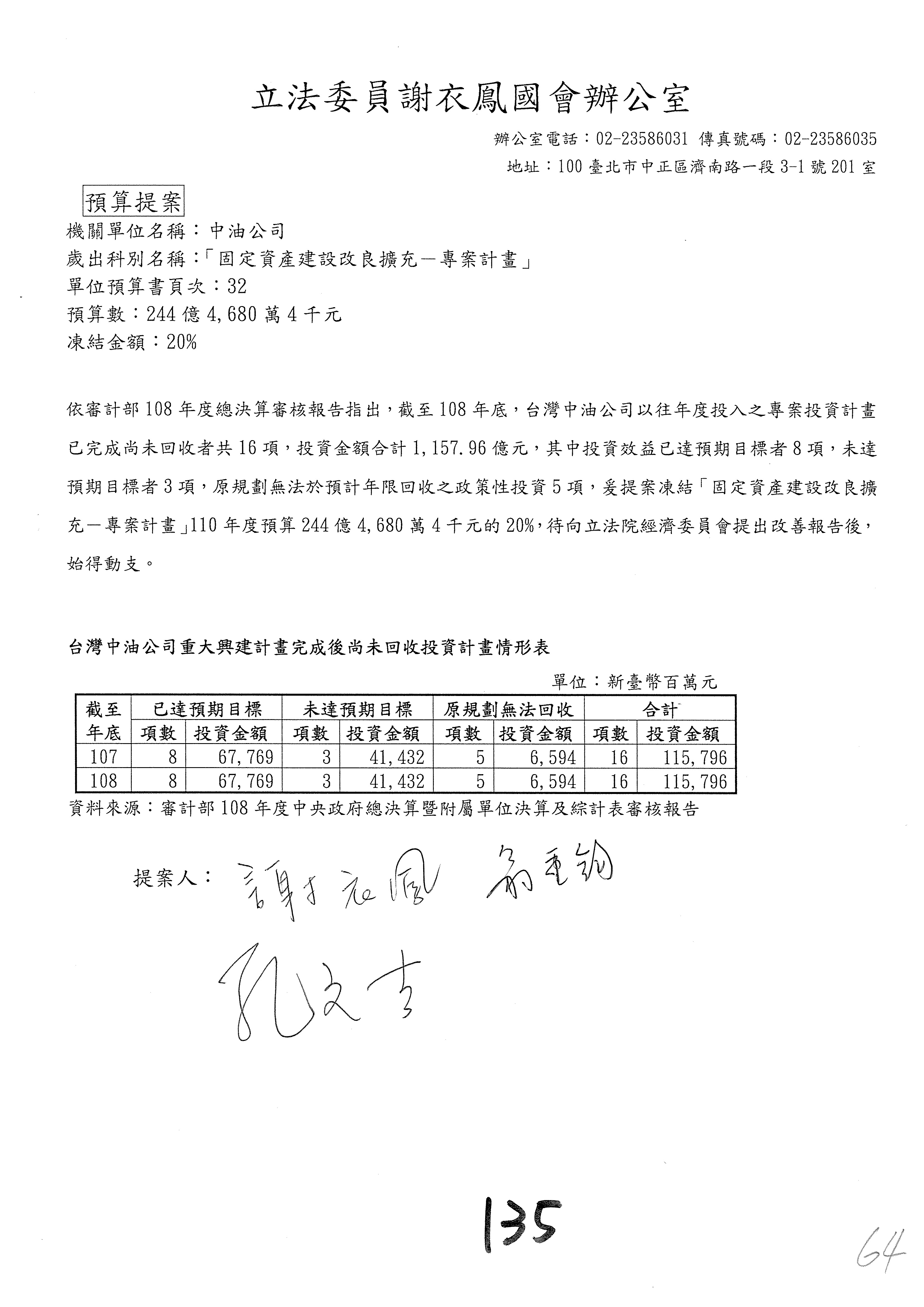 中油公司預算提案協商結論:第76案到第82案「工安環保及衛生」凍結5,000萬元,提出書面報告後始得動支;第83案到第85案為「研究發展支出」,其中第83案改主決議,「研究發展支出」凍結3億元,提出書面報告後始得動支;第86案到第88案增列「營業收入」2,000萬元;第89案減列「水電費」4,000萬元,科目自行調整;第90案到第99案減列「旅運費」900萬元,科目自行調整;第100案到第103案「印刷裝訂與廣告費」凍結2,000萬元,提出書面報告後始得動支;第104案撤案;第105案預算照列;第106案至第112案,其中第107案、第109案改主決議,「專業服務費」減列1,000萬元,科目自行調整,另凍結5,000萬元,提出書面報告後始得動支;第113案照案通過;第114案「會費」減列300萬元,科目自行調整;第115案預算照列;第116案保留送院會處理;第117案至第124案「油氣輸儲費用」減列1,000萬元,科目自行調整;第125案到第127案「探勘費用」凍結10%,提出專案報告後始得動支;第128案「管理費用」減列100萬元,科目自行調整;第129案及第130案「利息」減列600萬元;第131案到第133案「其他營業外費用」凍結1,000萬元,提出書面報告後始得動支;第134案到第136案「專案計畫」減列20億元,另凍結10億元,提出專案報告後始得動支;第137案保留送院會處理;主決議第138案至第168案均照案通過;第169案最後一句修正為「爰提案要求經濟部應將120年底的自備儲槽容積天數規定調高至30天以上」;第170案將「每季」改為「每年」;第171案也將「每季」改為「每年」;第172案「專案報告」改為「書面報告」;第173案、第174案、第175案及第175-1案均照案通過。