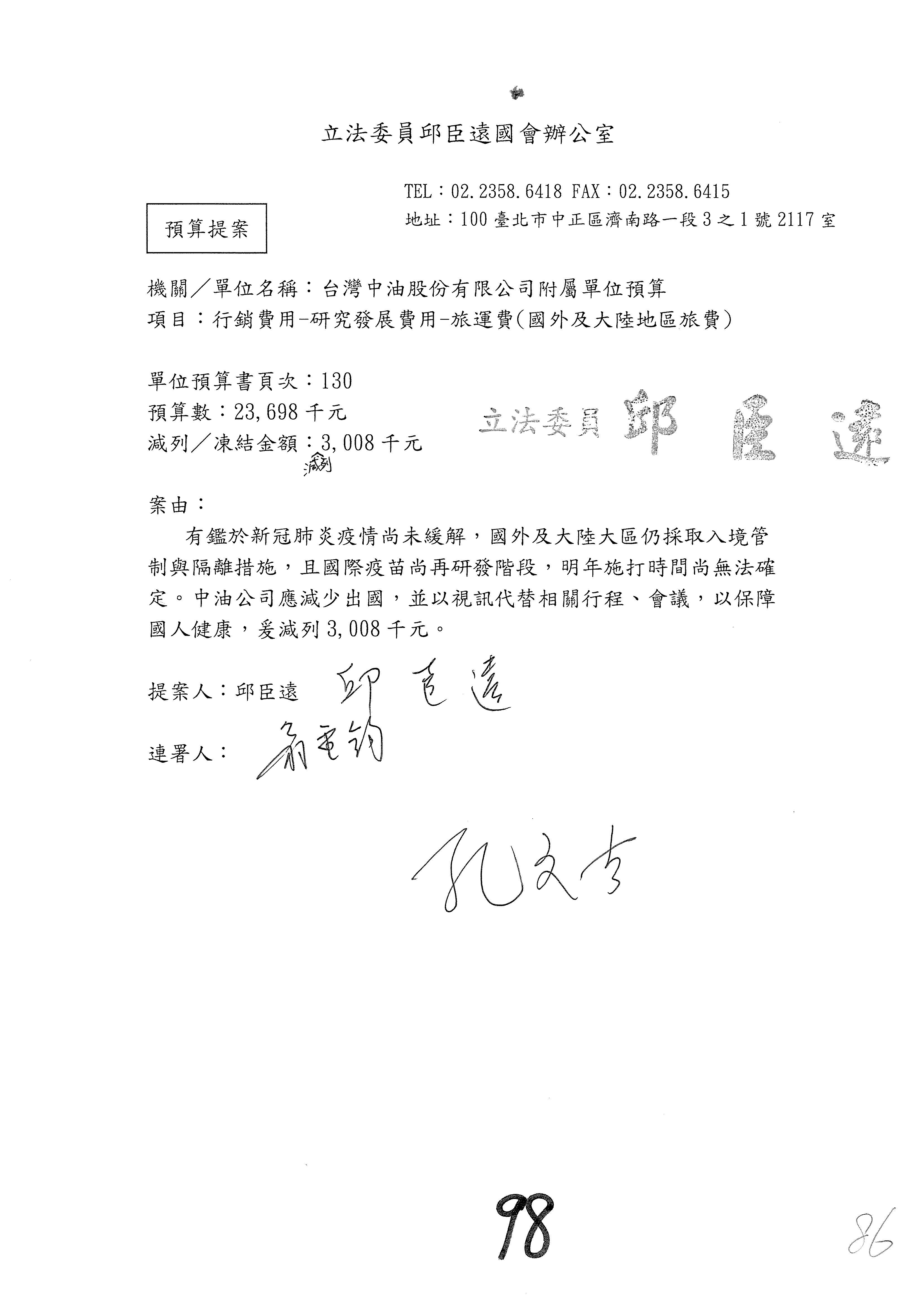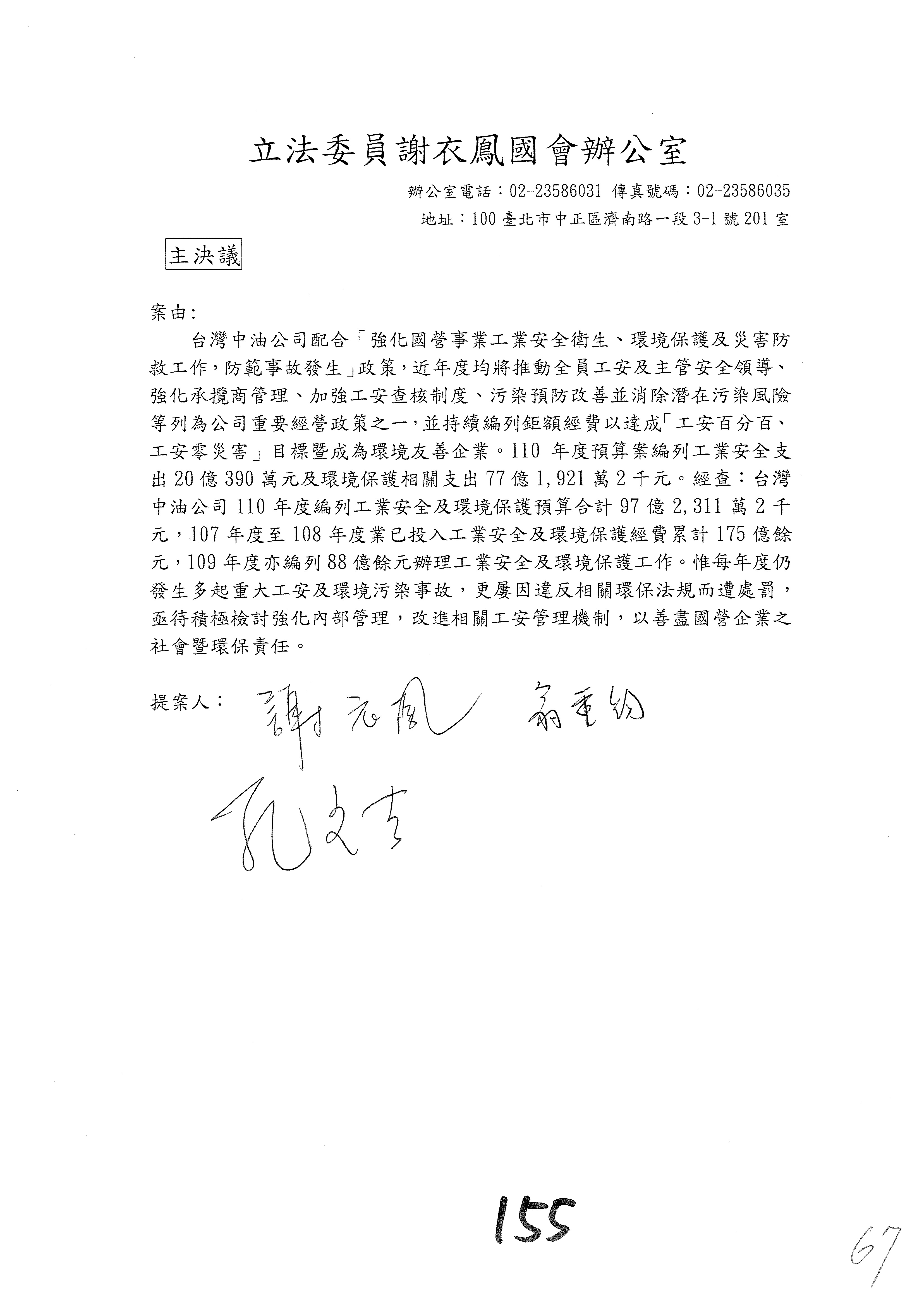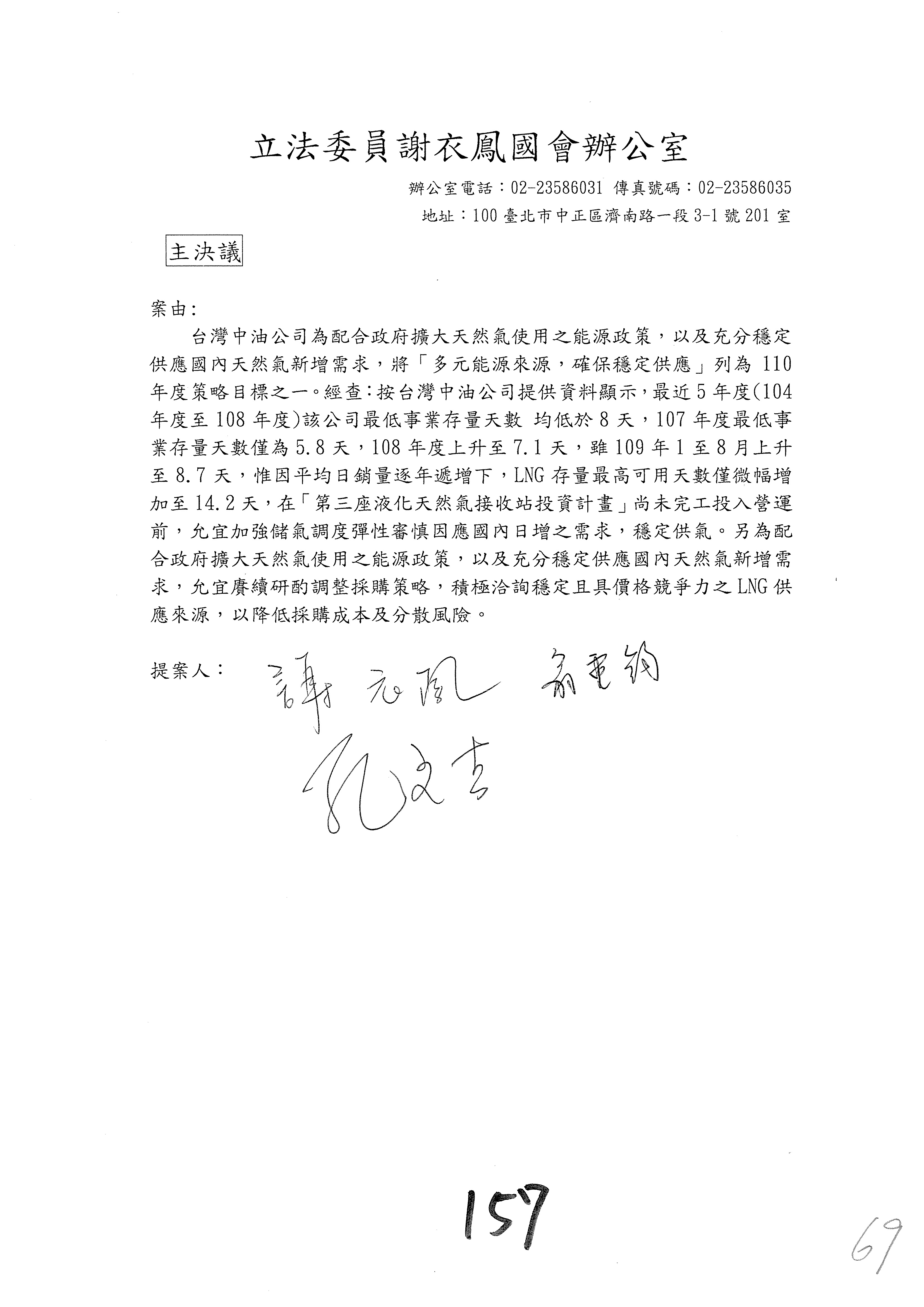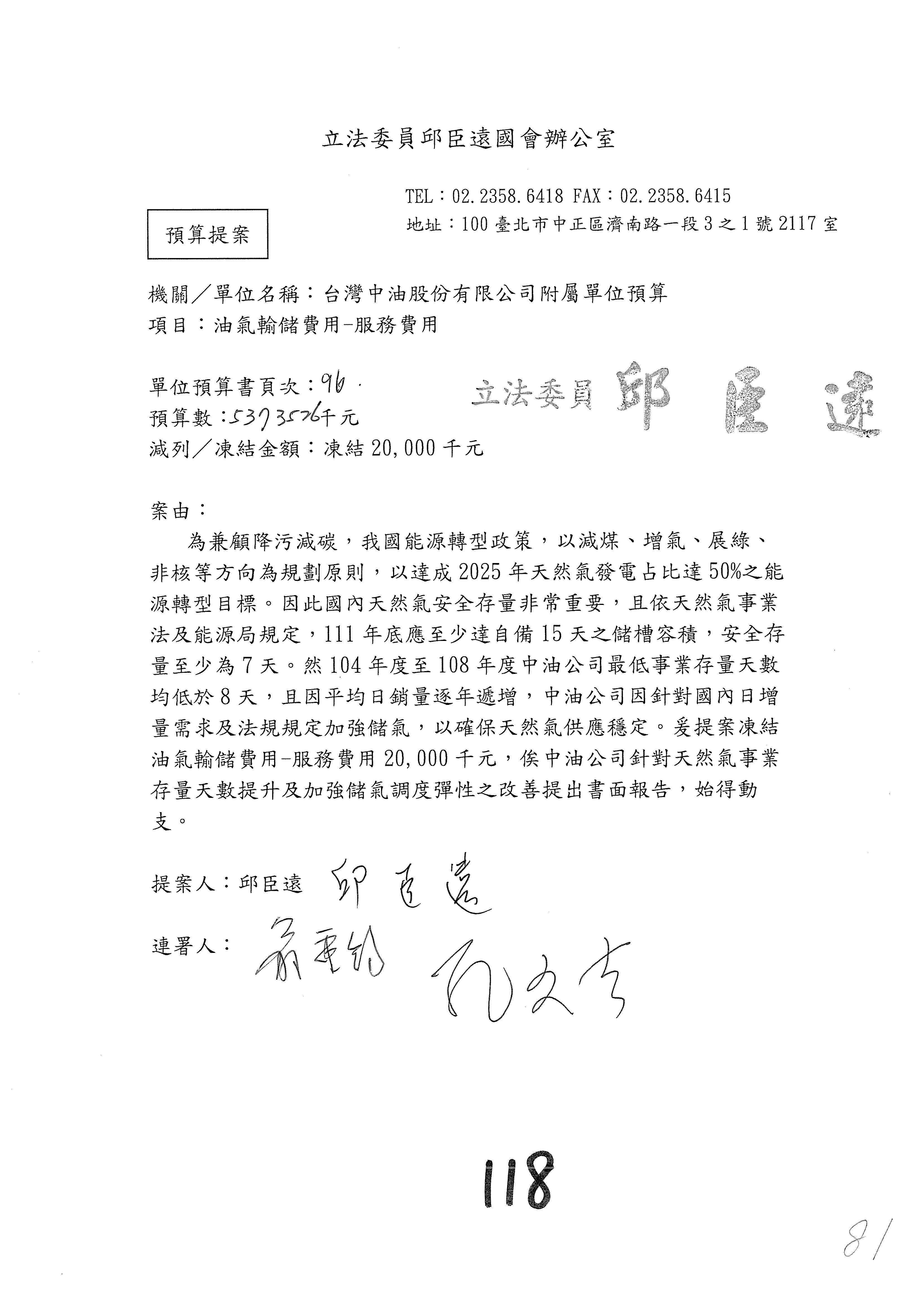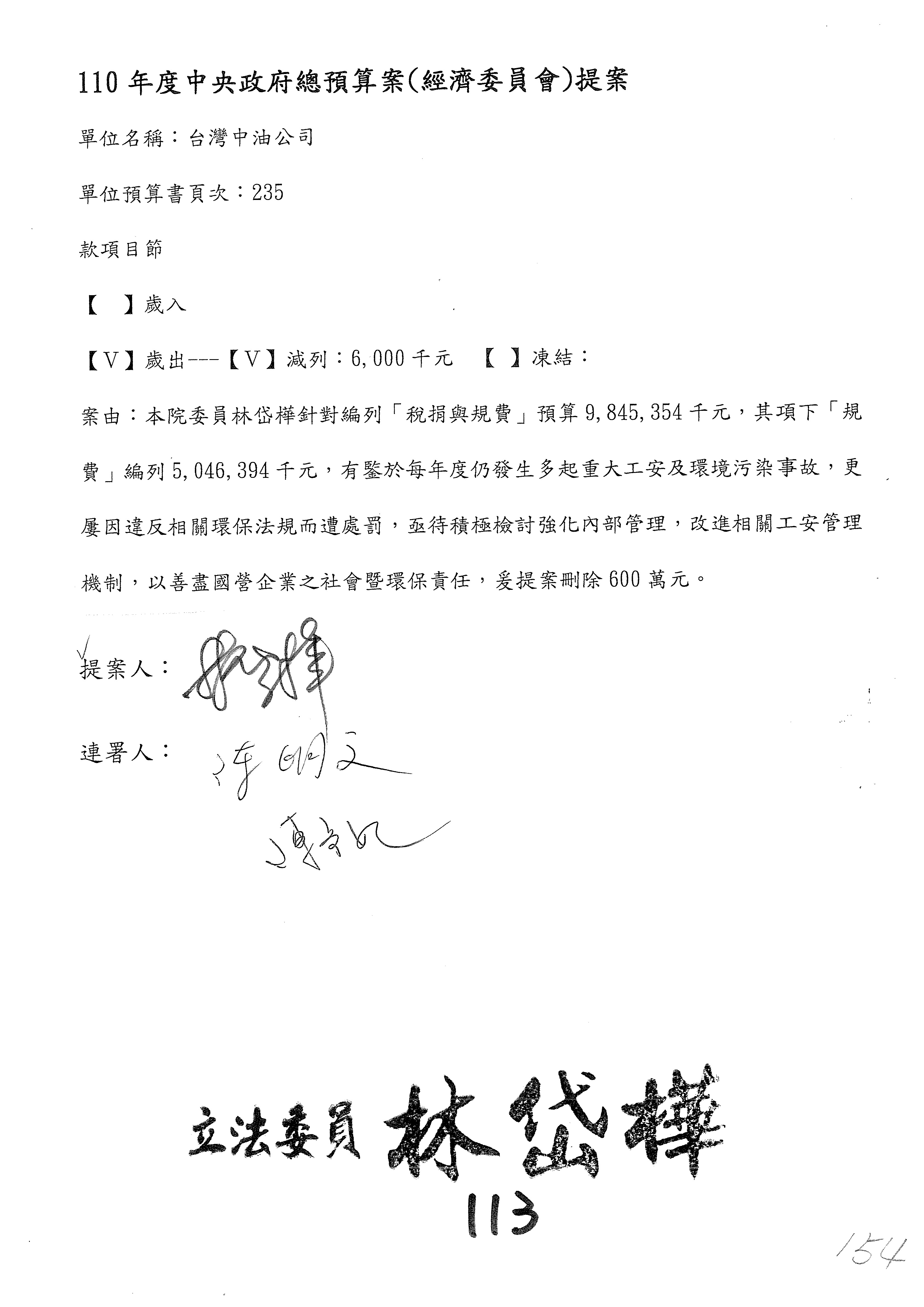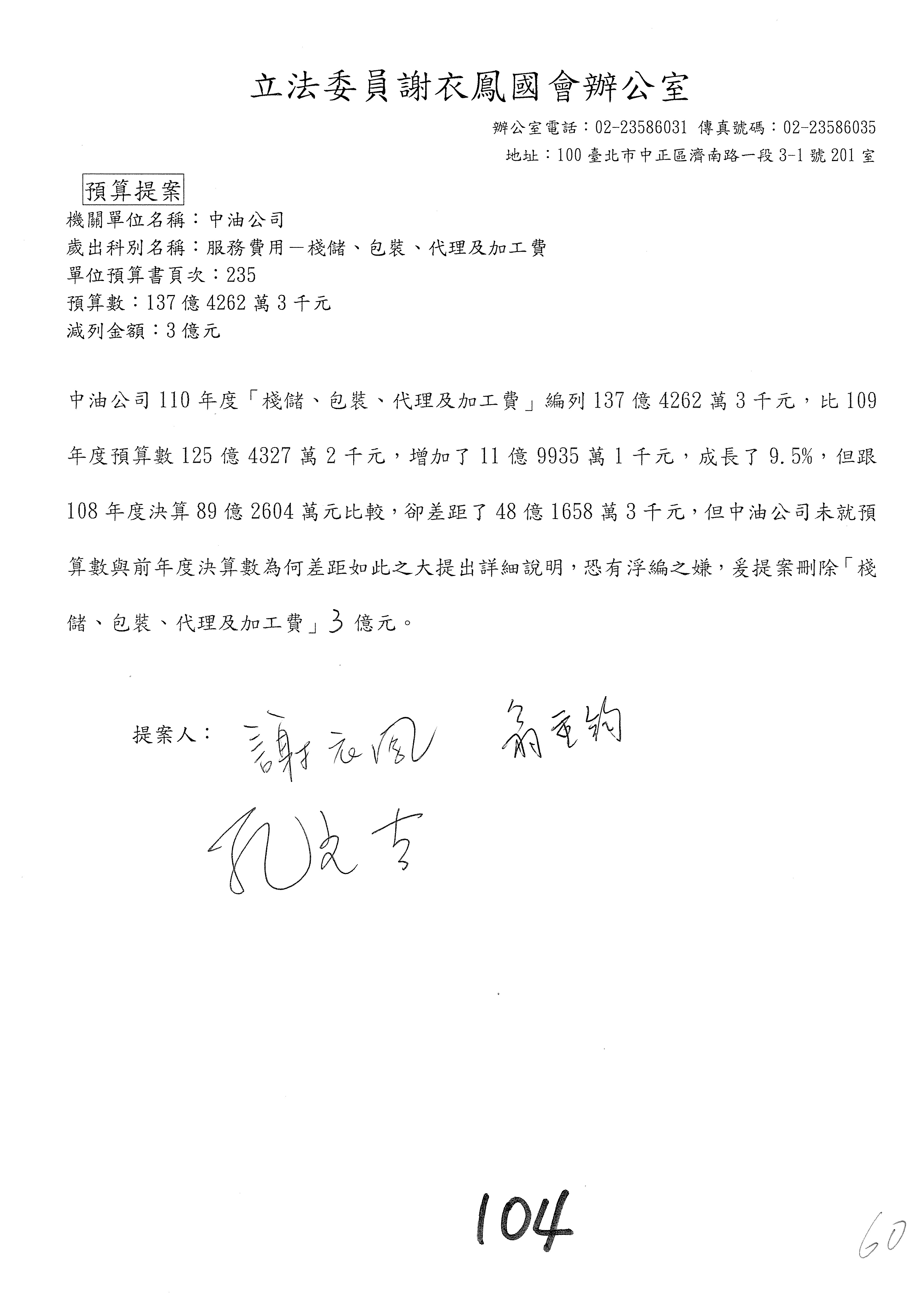 中油公司預算提案協商結論:第76案到第82案「工安環保及衛生」凍結5,000萬元,提出書面報告後始得動支;第83案到第85案為「研究發展支出」,其中第83案改主決議,「研究發展支出」凍結3億元,提出書面報告後始得動支;第86案到第88案增列「營業收入」2,000萬元;第89案減列「水電費」4,000萬元,科目自行調整;第90案到第99案減列「旅運費」900萬元,科目自行調整;第100案到第103案「印刷裝訂與廣告費」凍結2,000萬元,提出書面報告後始得動支;第104案撤案;第105案預算照列;第106案至第112案,其中第107案、第109案改主決議,「專業服務費」減列1,000萬元,科目自行調整,另凍結5,000萬元,提出書面報告後始得動支;第113案照案通過;第114案「會費」減列300萬元,科目自行調整;第115案預算照列;第116案保留送院會處理;第117案至第124案「油氣輸儲費用」減列1,000萬元,科目自行調整;第125案到第127案「探勘費用」凍結10%,提出專案報告後始得動支;第128案「管理費用」減列100萬元,科目自行調整;第129案及第130案「利息」減列600萬元;第131案到第133案「其他營業外費用」凍結1,000萬元,提出書面報告後始得動支;第134案到第136案「專案計畫」減列20億元,另凍結10億元,提出專案報告後始得動支;第137案保留送院會處理;主決議第138案至第168案均照案通過;第169案最後一句修正為「爰提案要求經濟部應將120年底的自備儲槽容積天數規定調高至30天以上」;第170案將「每季」改為「每年」;第171案也將「每季」改為「每年」;第172案「專案報告」改為「書面報告」;第173案、第174案、第175案及第175-1案均照案通過。