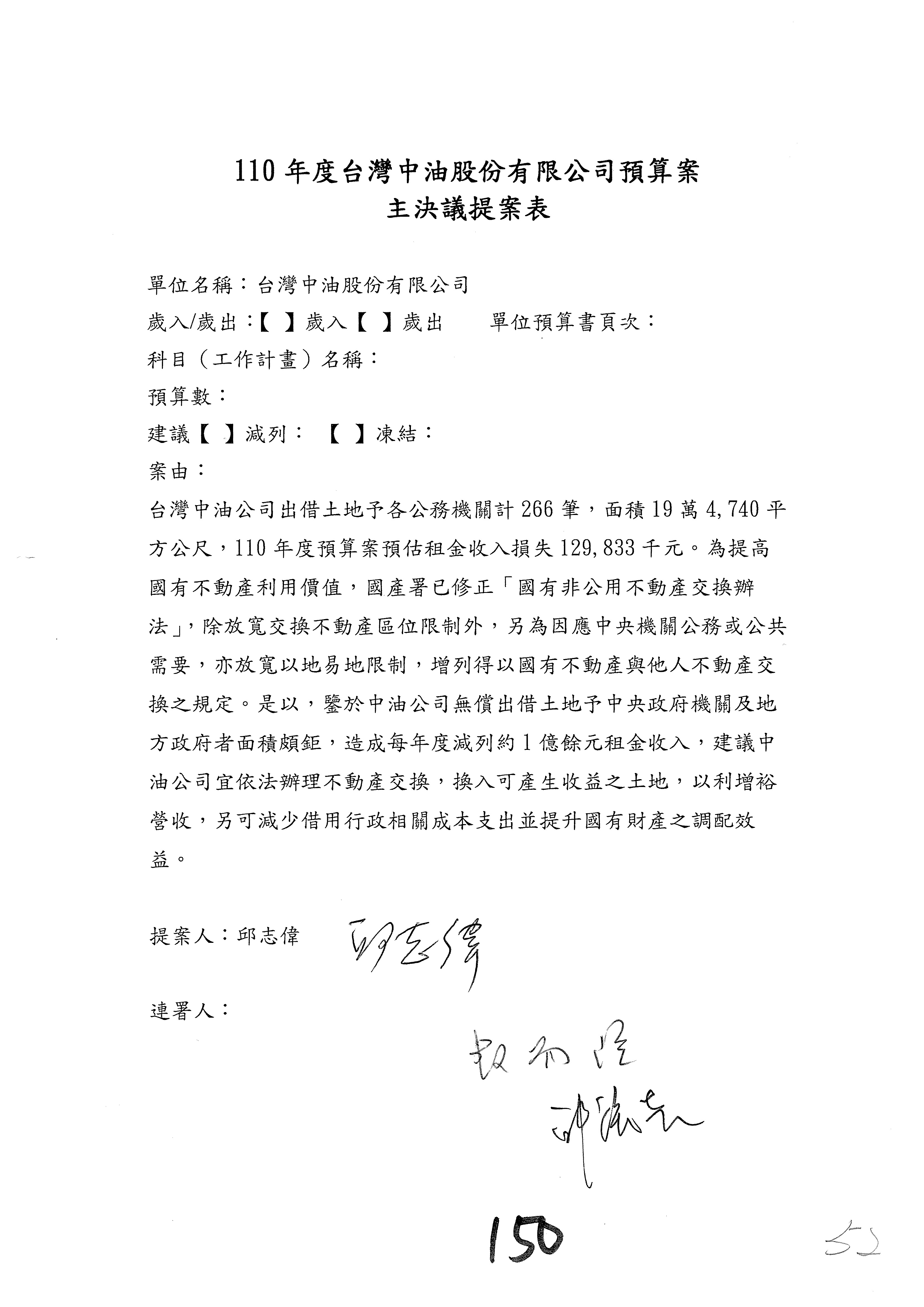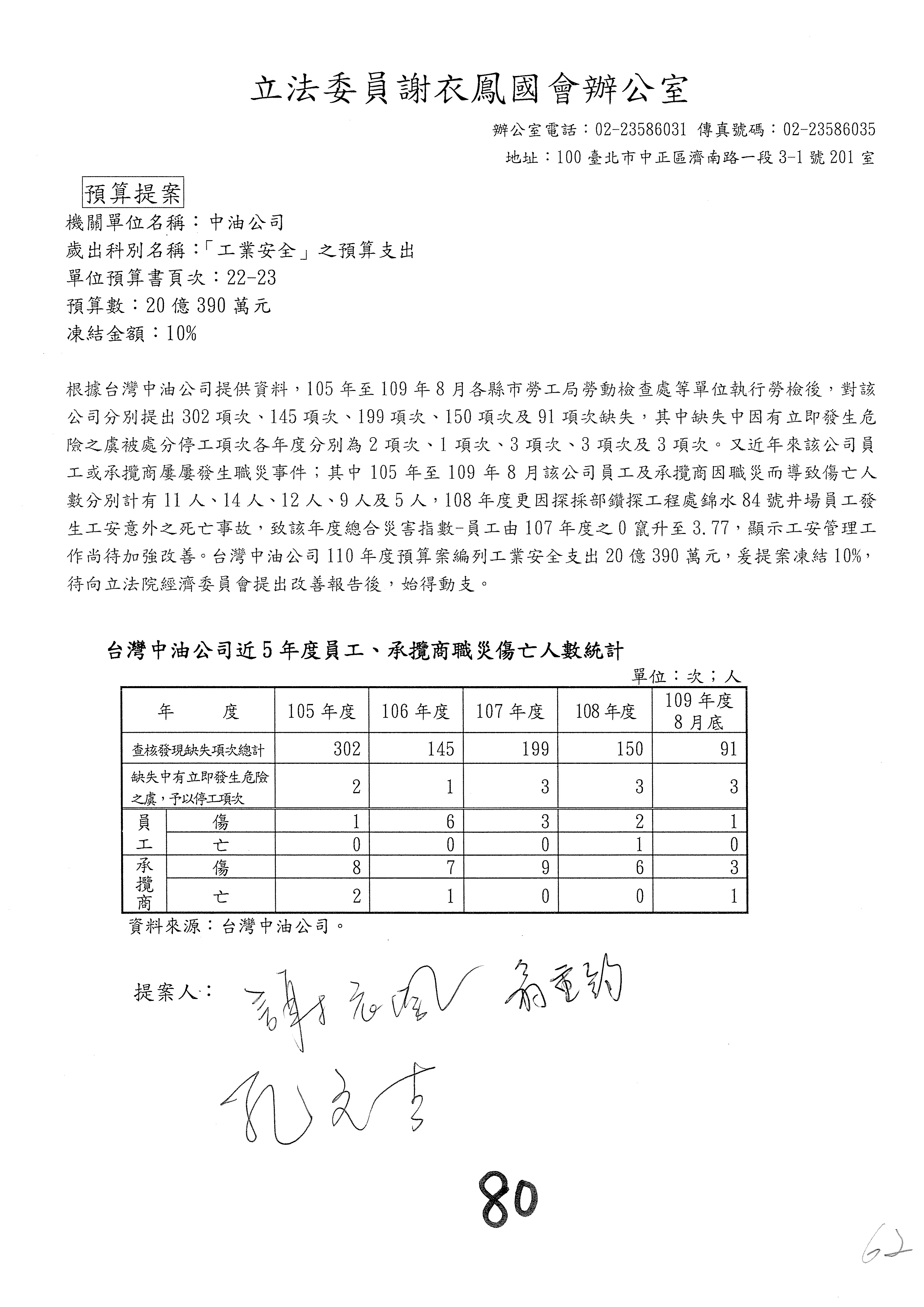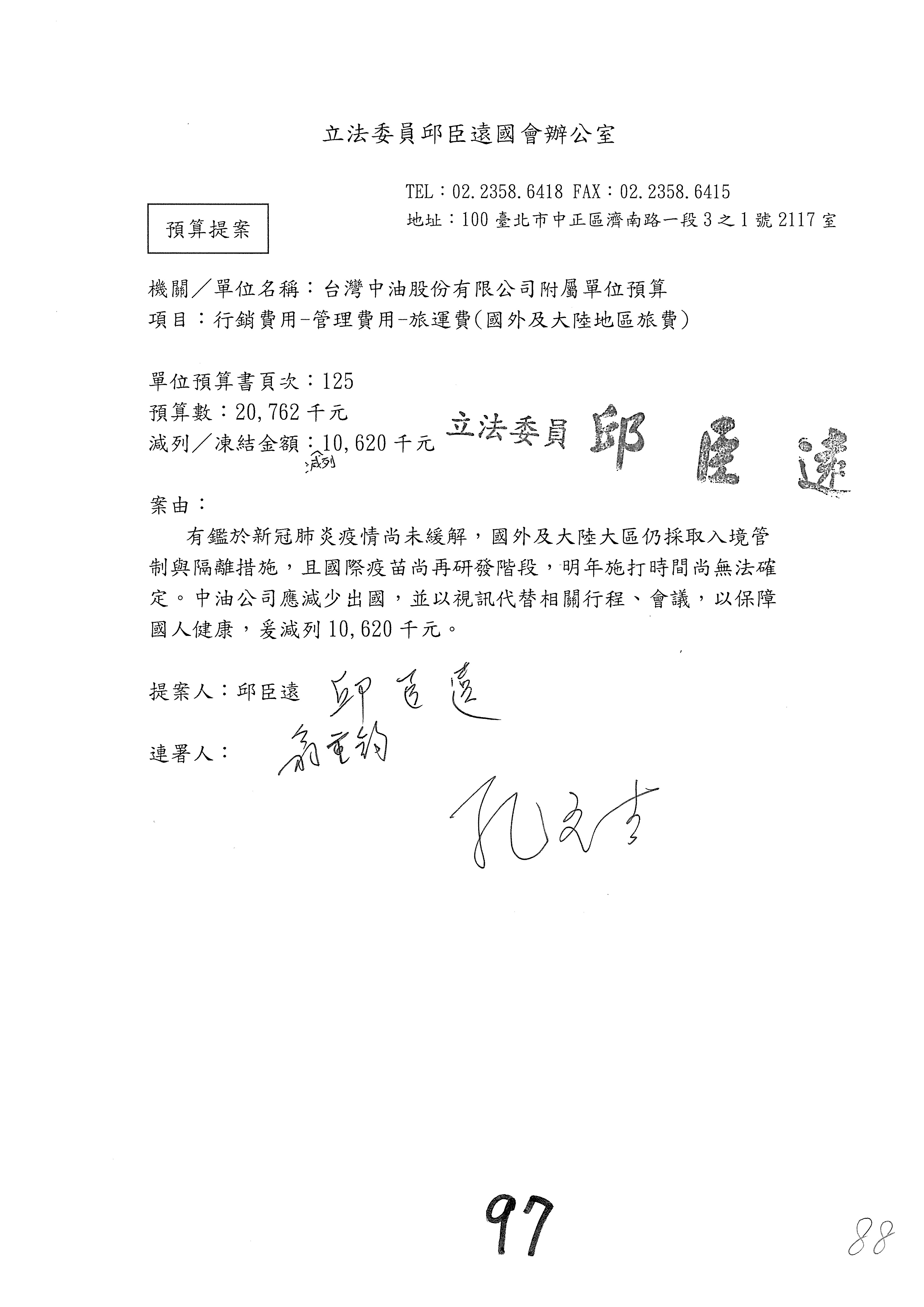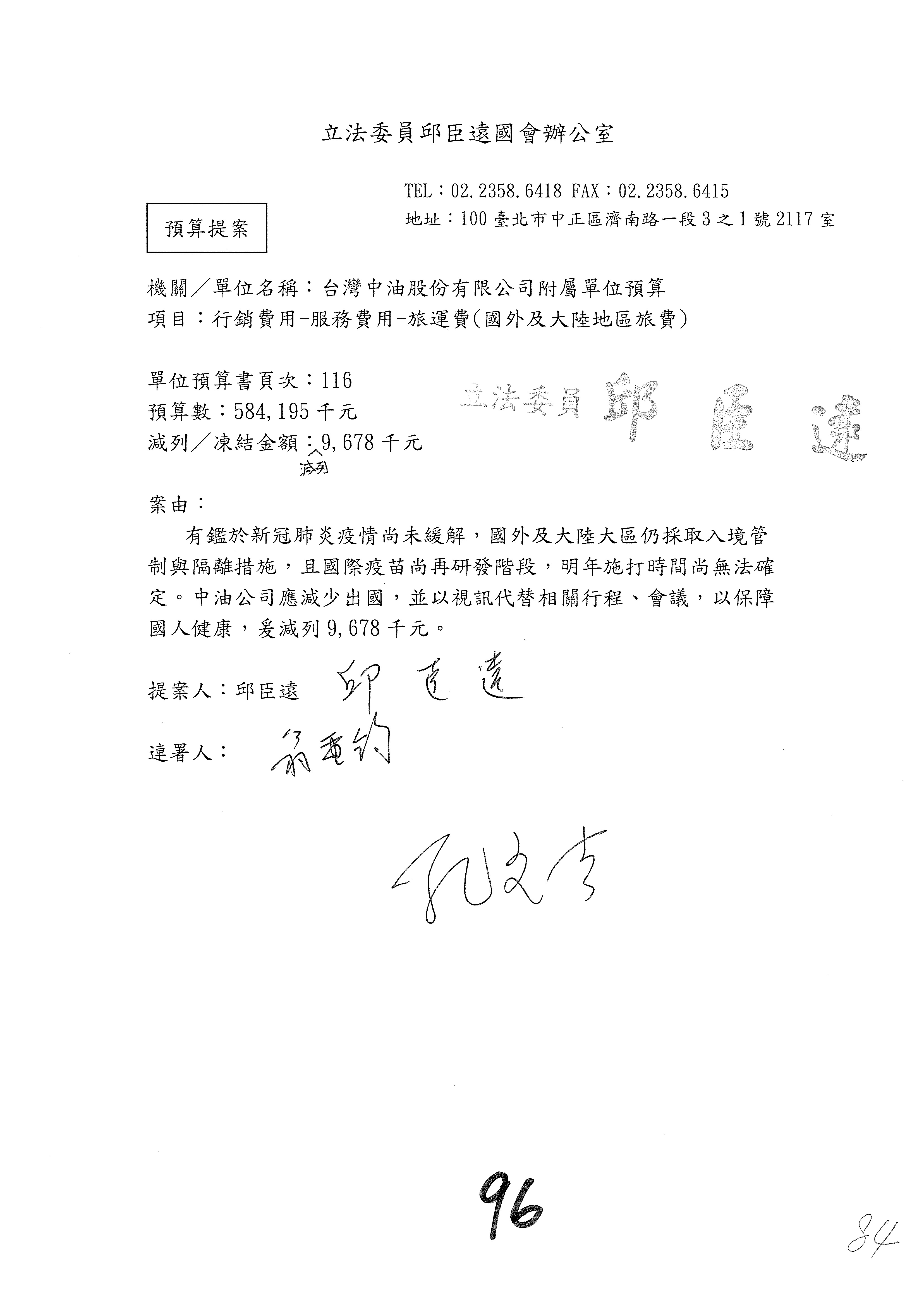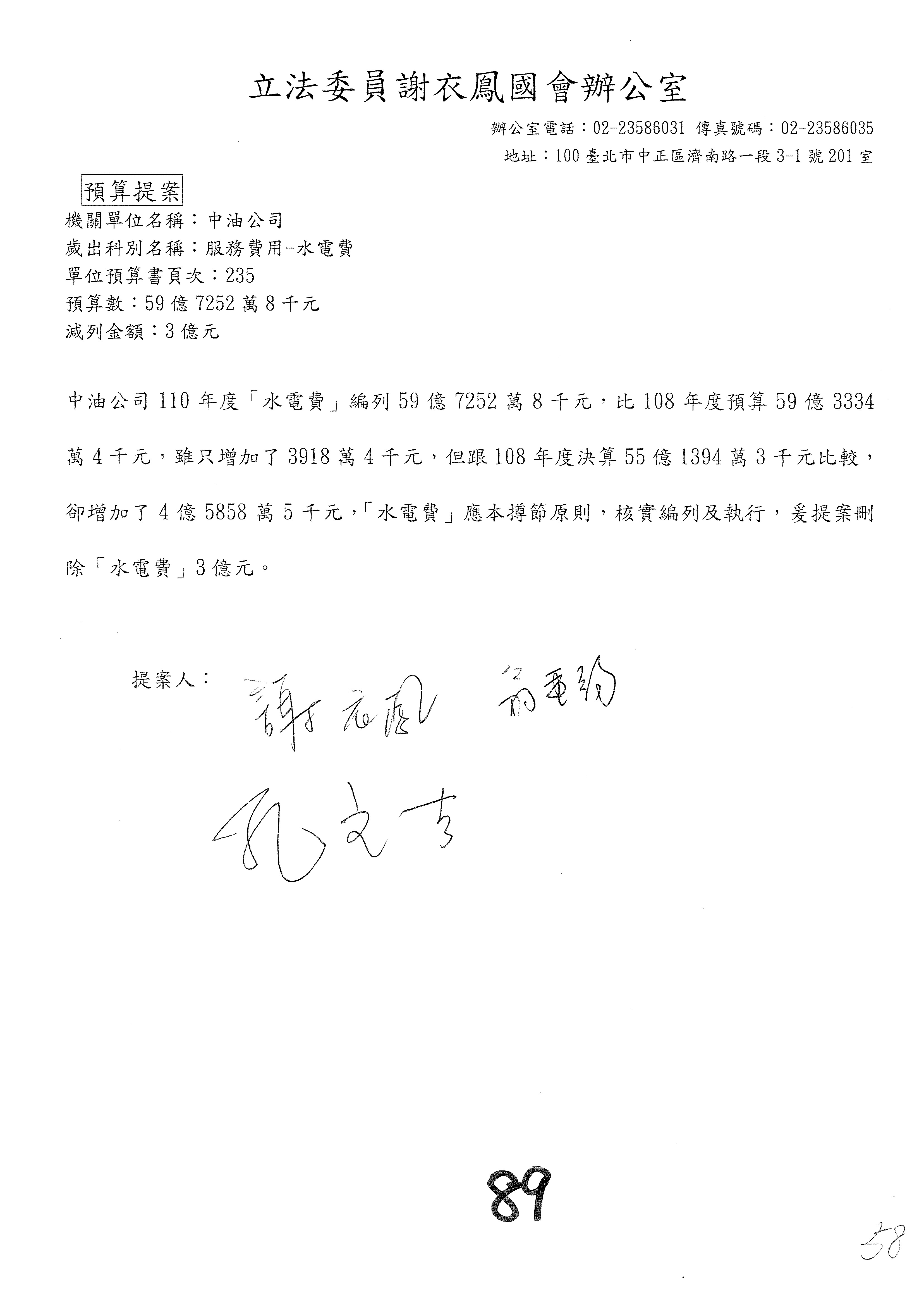 中油公司預算提案協商結論:第76案到第82案「工安環保及衛生」凍結5,000萬元,提出書面報告後始得動支;第83案到第85案為「研究發展支出」,其中第83案改主決議,「研究發展支出」凍結3億元,提出書面報告後始得動支;第86案到第88案增列「營業收入」2,000萬元;第89案減列「水電費」4,000萬元,科目自行調整;第90案到第99案減列「旅運費」900萬元,科目自行調整;第100案到第103案「印刷裝訂與廣告費」凍結2,000萬元,提出書面報告後始得動支;第104案撤案;第105案預算照列;第106案至第112案,其中第107案、第109案改主決議,「專業服務費」減列1,000萬元,科目自行調整,另凍結5,000萬元,提出書面報告後始得動支;第113案照案通過;第114案「會費」減列300萬元,科目自行調整;第115案預算照列;第116案保留送院會處理;第117案至第124案「油氣輸儲費用」減列1,000萬元,科目自行調整;第125案到第127案「探勘費用」凍結10%,提出專案報告後始得動支;第128案「管理費用」減列100萬元,科目自行調整;第129案及第130案「利息」減列600萬元;第131案到第133案「其他營業外費用」凍結1,000萬元,提出書面報告後始得動支;第134案到第136案「專案計畫」減列20億元,另凍結10億元,提出專案報告後始得動支;第137案保留送院會處理;主決議第138案至第168案均照案通過;第169案最後一句修正為「爰提案要求經濟部應將120年底的自備儲槽容積天數規定調高至30天以上」;第170案將「每季」改為「每年」;第171案也將「每季」改為「每年」;第172案「專案報告」改為「書面報告」;第173案、第174案、第175案及第175-1案均照案通過。