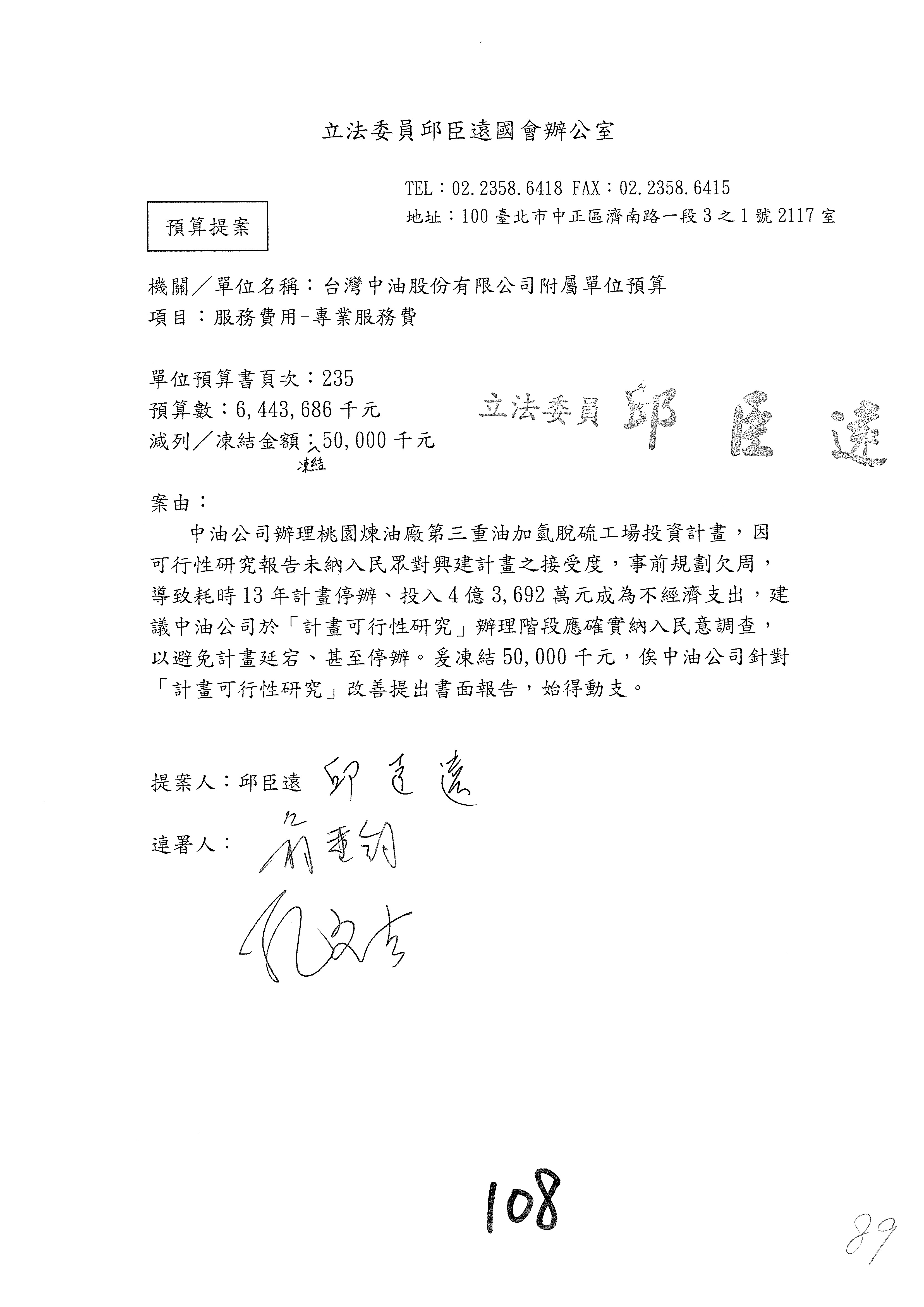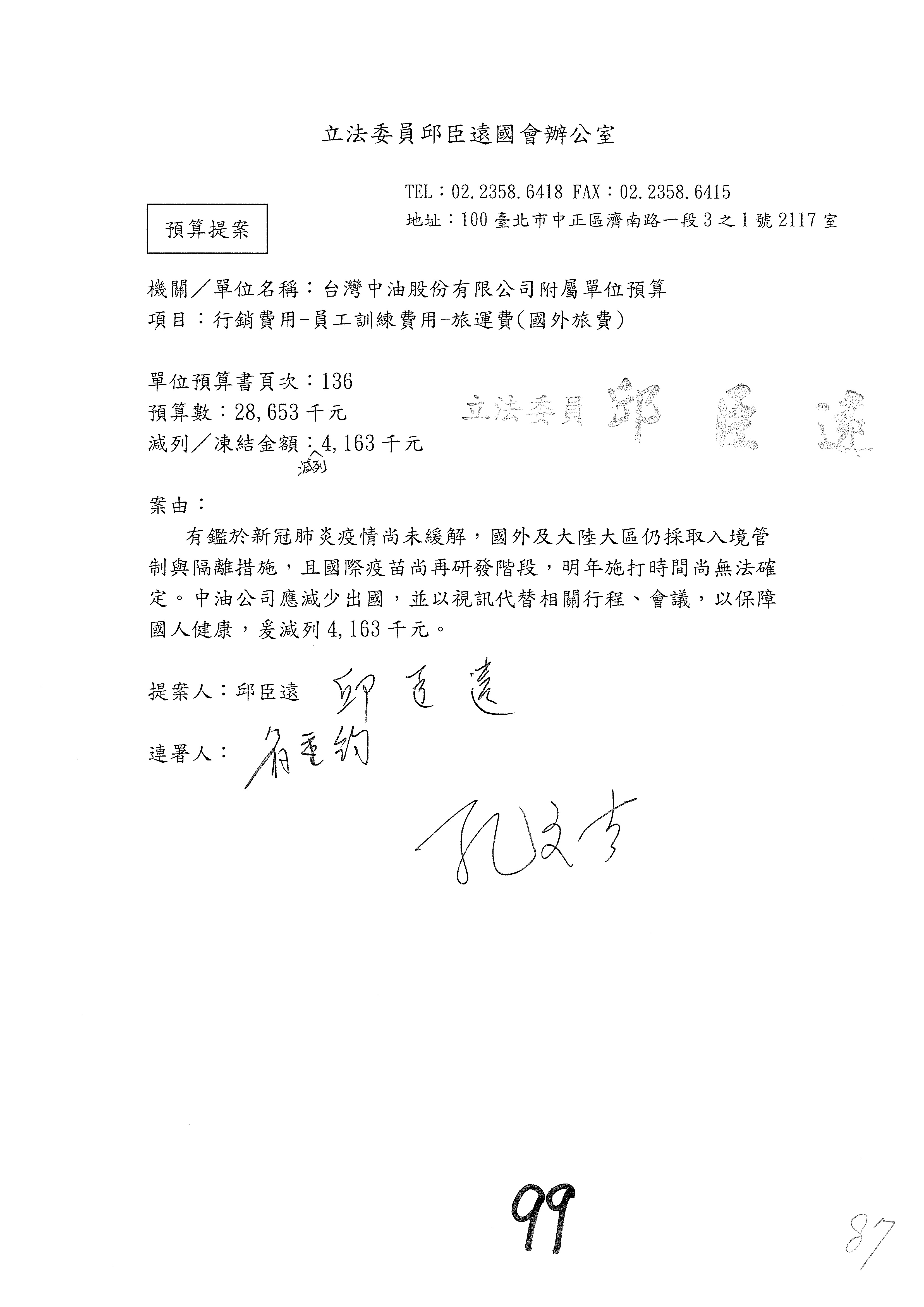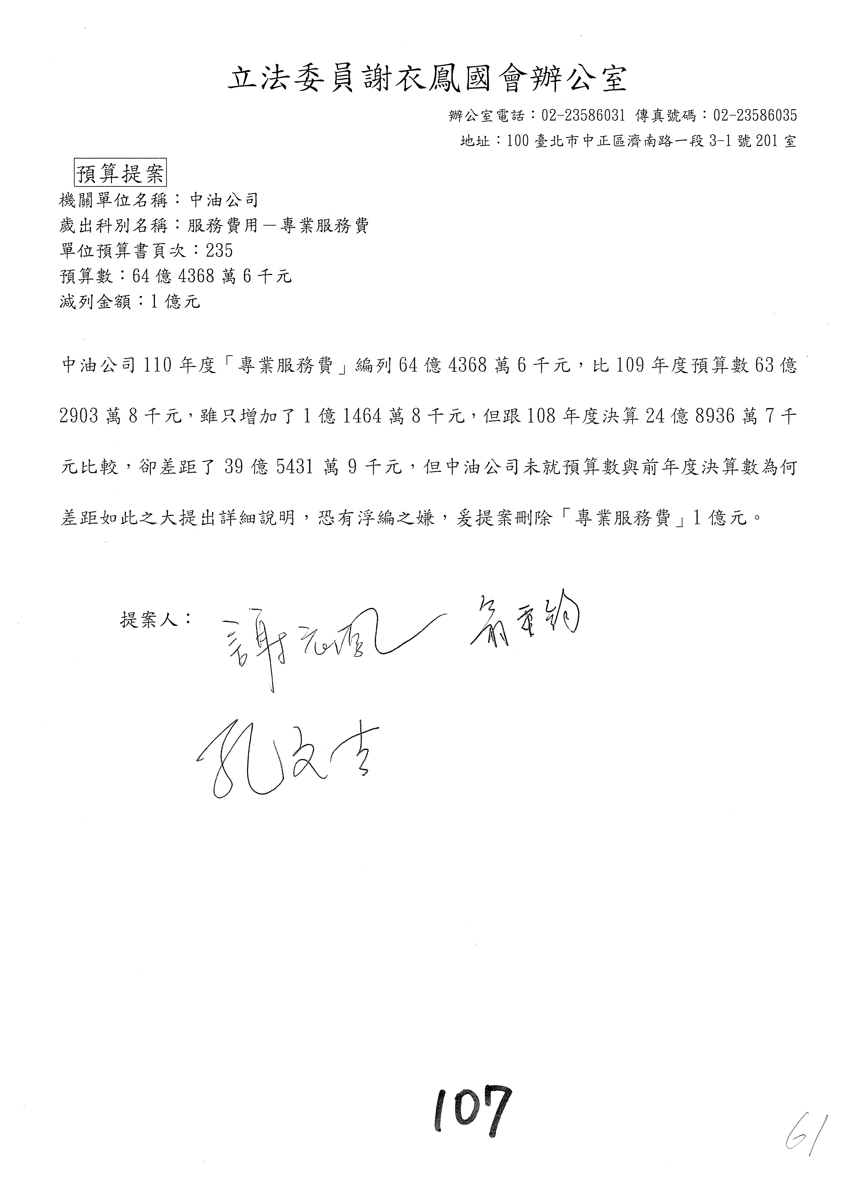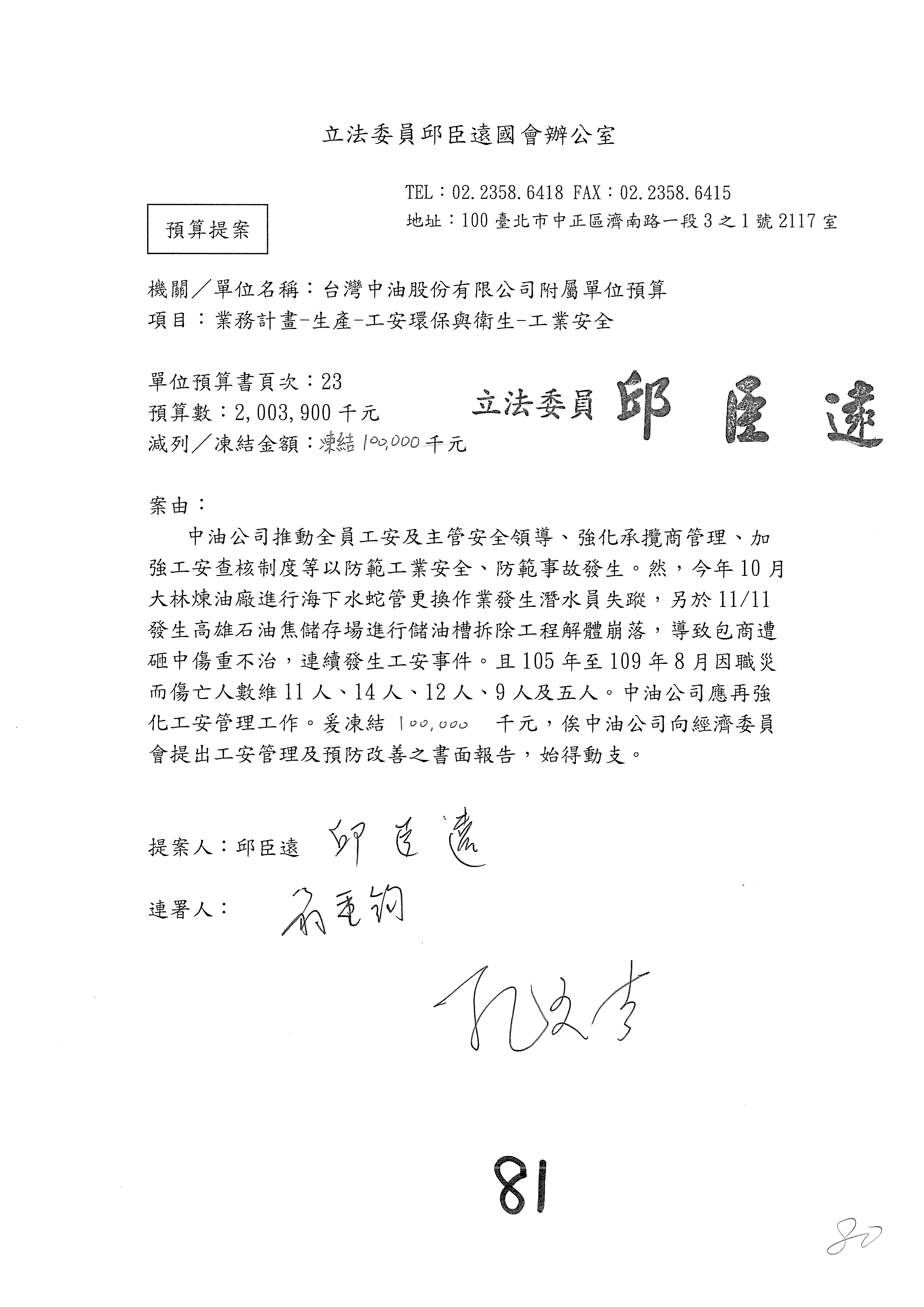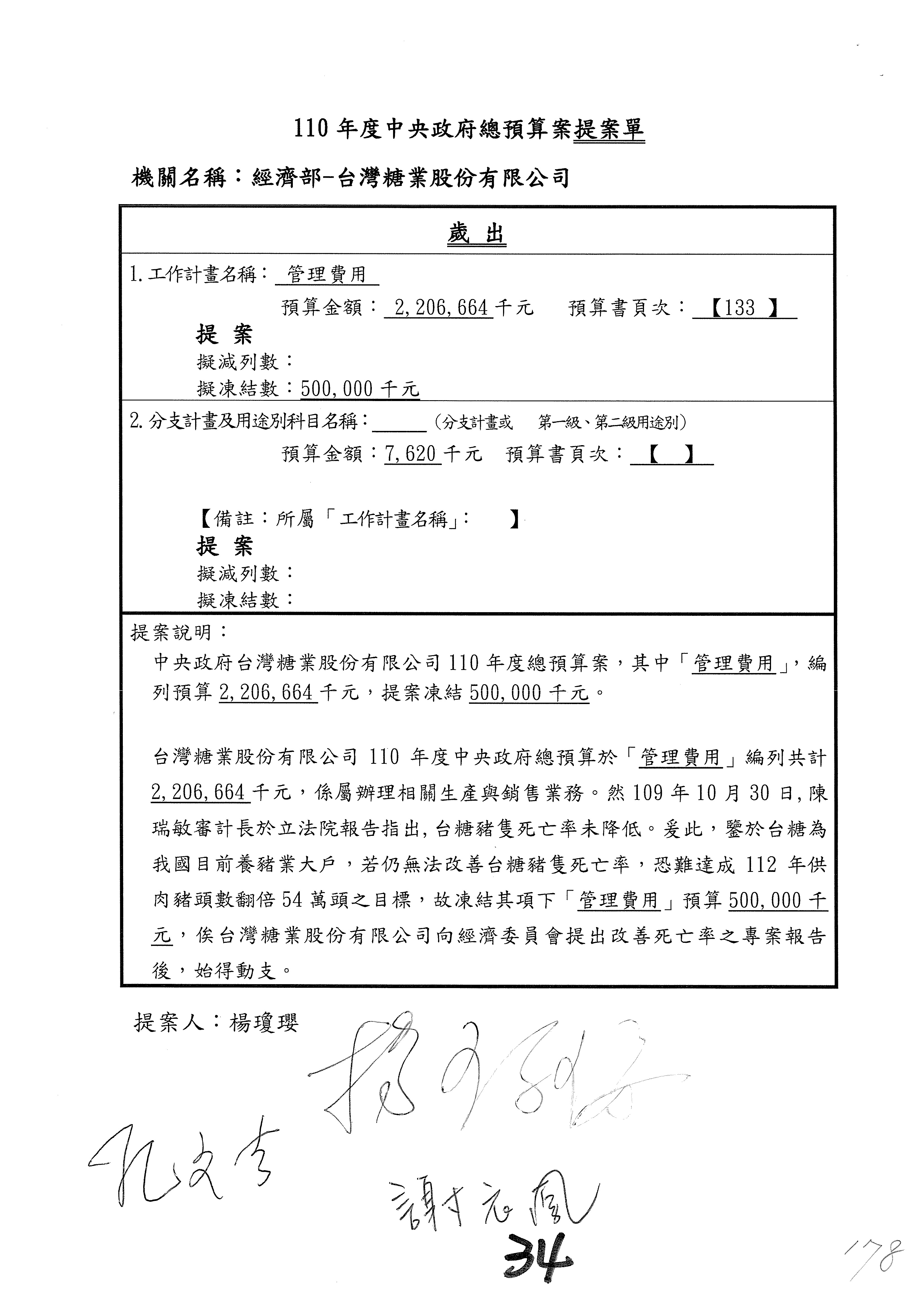 中油公司預算提案協商結論:第76案到第82案「工安環保及衛生」凍結5,000萬元,提出書面報告後始得動支;第83案到第85案為「研究發展支出」,其中第83案改主決議,「研究發展支出」凍結3億元,提出書面報告後始得動支;第86案到第88案增列「營業收入」2,000萬元;第89案減列「水電費」4,000萬元,科目自行調整;第90案到第99案減列「旅運費」900萬元,科目自行調整;第100案到第103案「印刷裝訂與廣告費」凍結2,000萬元,提出書面報告後始得動支;第104案撤案;第105案預算照列;第106案至第112案,其中第107案、第109案改主決議,「專業服務費」減列1,000萬元,科目自行調整,另凍結5,000萬元,提出書面報告後始得動支;第113案照案通過;第114案「會費」減列300萬元,科目自行調整;第115案預算照列;第116案保留送院會處理;第117案至第124案「油氣輸儲費用」減列1,000萬元,科目自行調整;第125案到第127案「探勘費用」凍結10%,提出專案報告後始得動支;第128案「管理費用」減列100萬元,科目自行調整;第129案及第130案「利息」減列600萬元;第131案到第133案「其他營業外費用」凍結1,000萬元,提出書面報告後始得動支;第134案到第136案「專案計畫」減列20億元,另凍結10億元,提出專案報告後始得動支;第137案保留送院會處理;主決議第138案至第168案均照案通過;第169案最後一句修正為「爰提案要求經濟部應將120年底的自備儲槽容積天數規定調高至30天以上」;第170案將「每季」改為「每年」;第171案也將「每季」改為「每年」;第172案「專案報告」改為「書面報告」;第173案、第174案、第175案及第175-1案均照案通過。