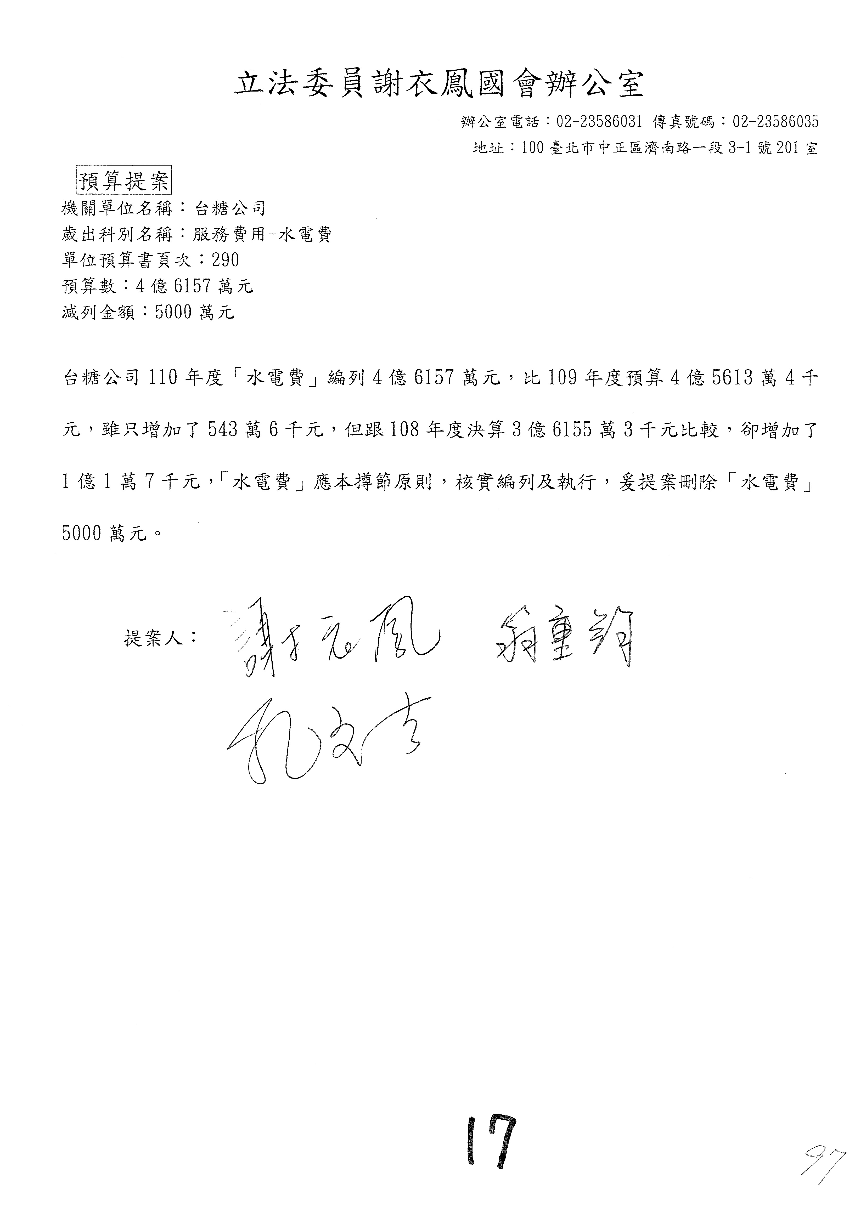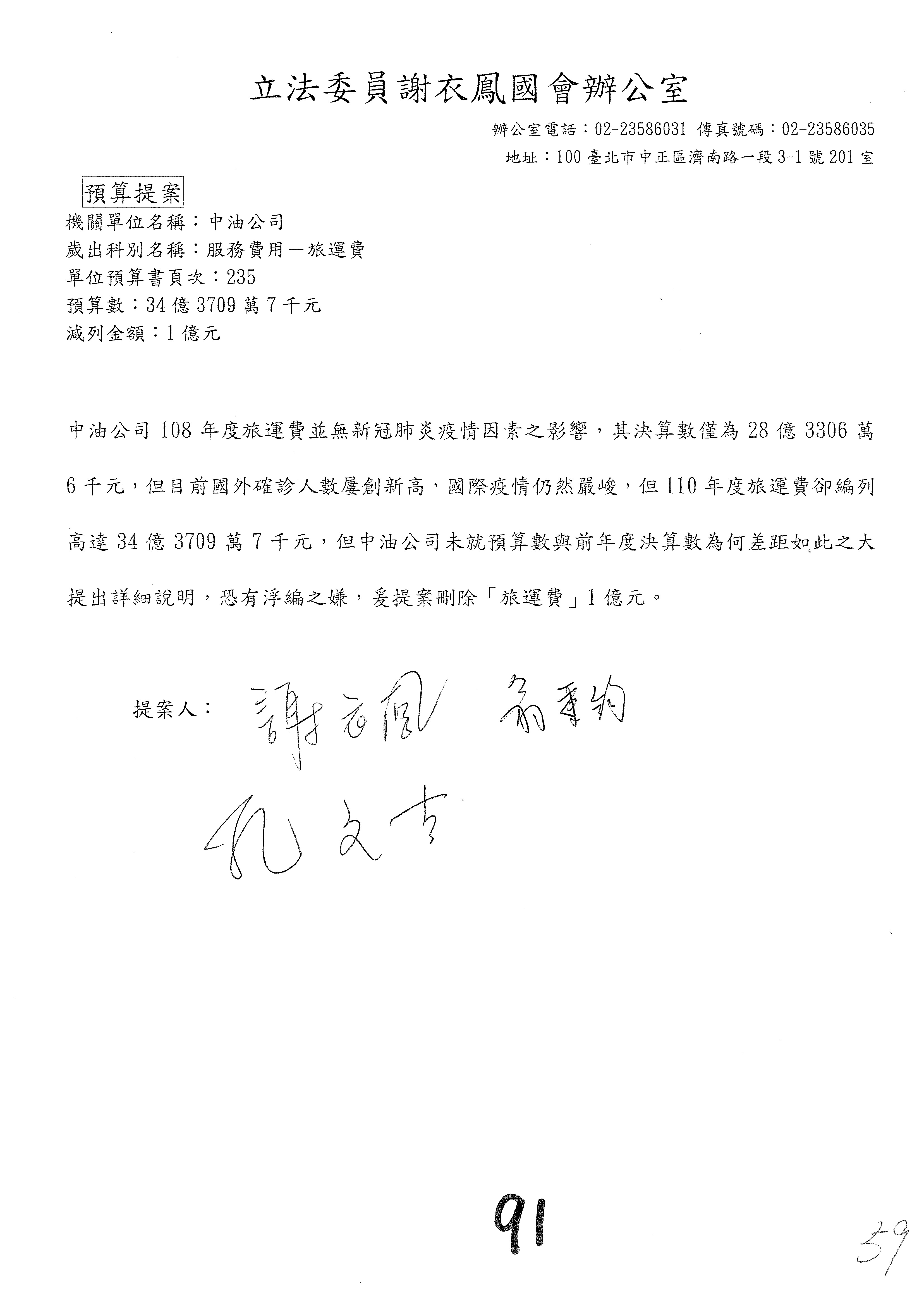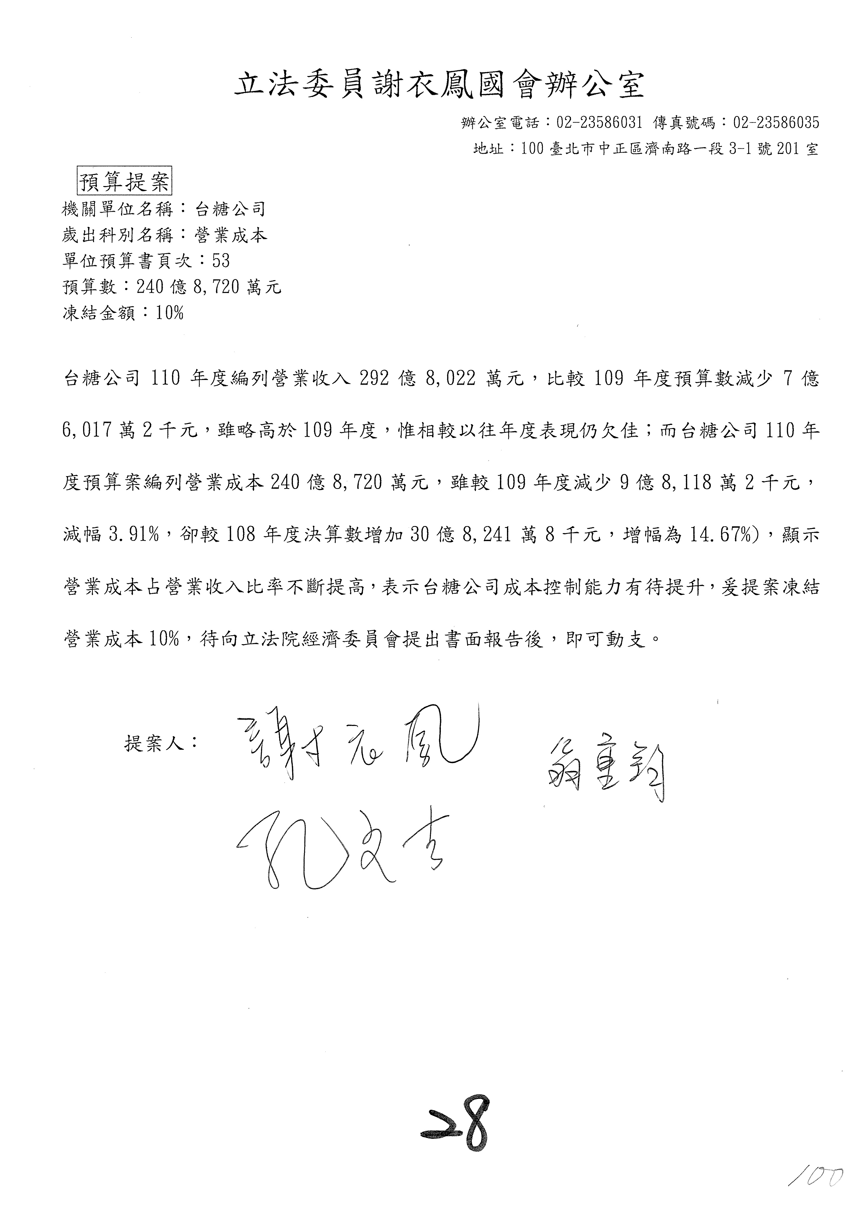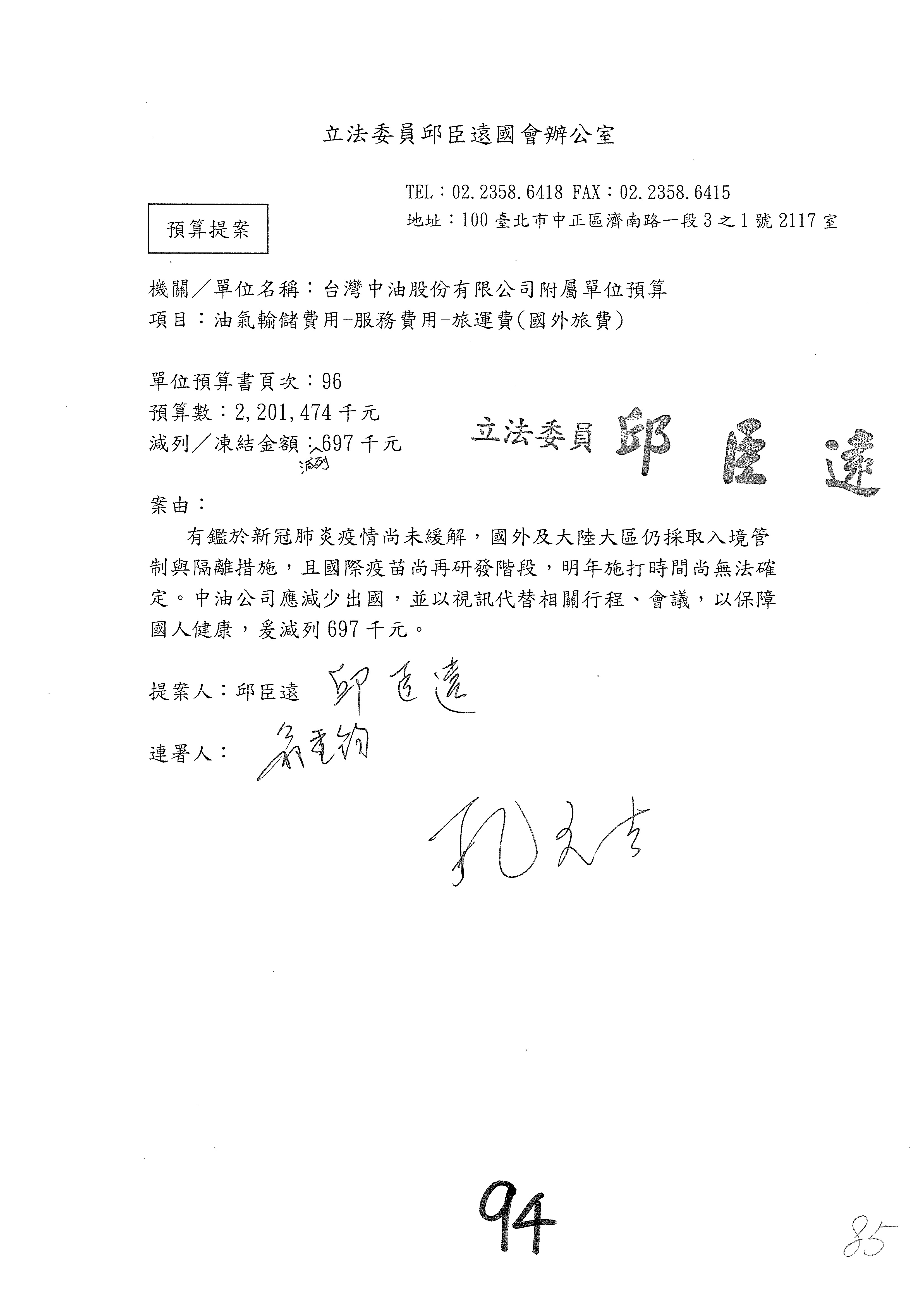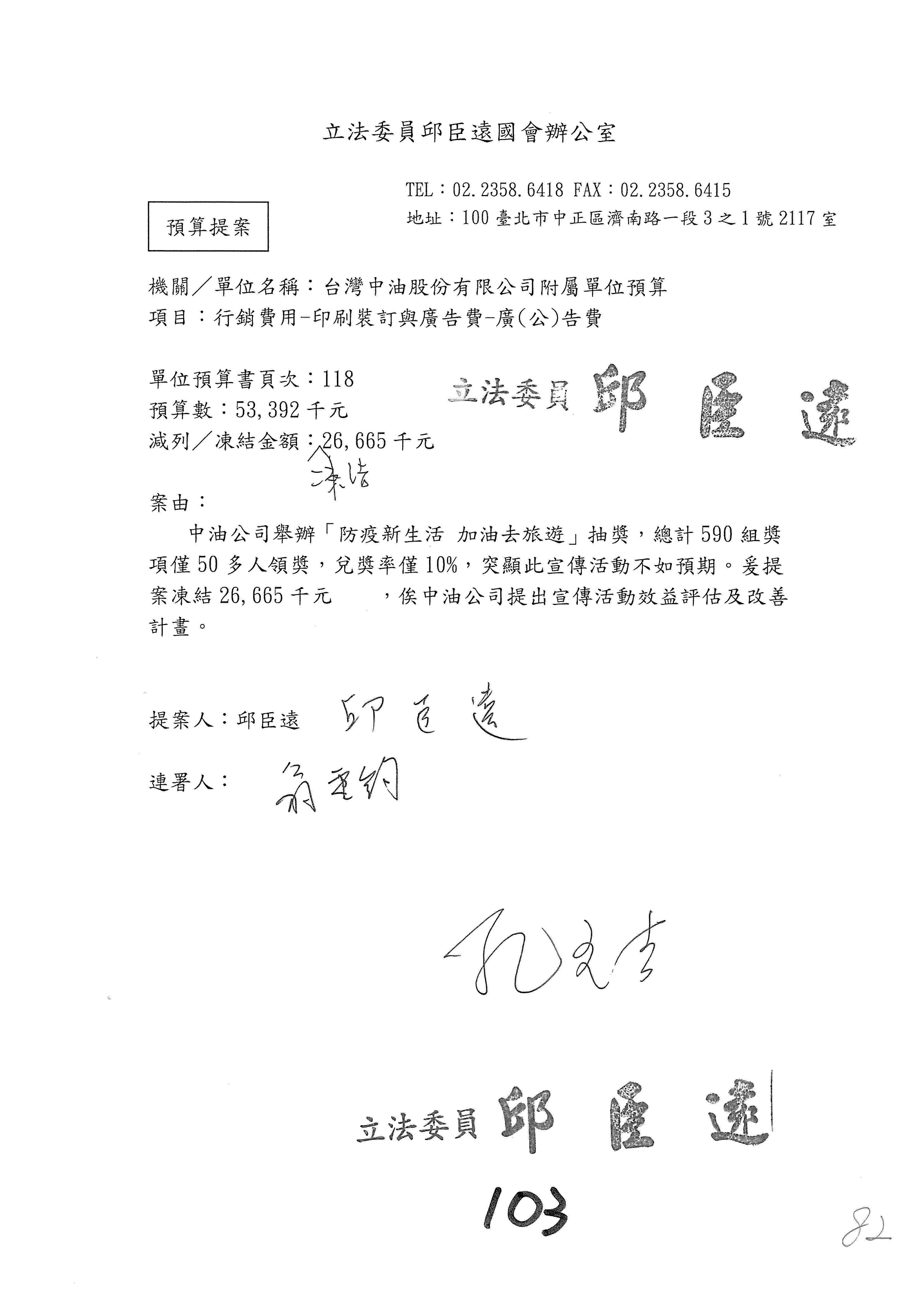 中油公司預算提案協商結論:第76案到第82案「工安環保及衛生」凍結5,000萬元,提出書面報告後始得動支;第83案到第85案為「研究發展支出」,其中第83案改主決議,「研究發展支出」凍結3億元,提出書面報告後始得動支;第86案到第88案增列「營業收入」2,000萬元;第89案減列「水電費」4,000萬元,科目自行調整;第90案到第99案減列「旅運費」900萬元,科目自行調整;第100案到第103案「印刷裝訂與廣告費」凍結2,000萬元,提出書面報告後始得動支;第104案撤案;第105案預算照列;第106案至第112案,其中第107案、第109案改主決議,「專業服務費」減列1,000萬元,科目自行調整,另凍結5,000萬元,提出書面報告後始得動支;第113案照案通過;第114案「會費」減列300萬元,科目自行調整;第115案預算照列;第116案保留送院會處理;第117案至第124案「油氣輸儲費用」減列1,000萬元,科目自行調整;第125案到第127案「探勘費用」凍結10%,提出專案報告後始得動支;第128案「管理費用」減列100萬元,科目自行調整;第129案及第130案「利息」減列600萬元;第131案到第133案「其他營業外費用」凍結1,000萬元,提出書面報告後始得動支;第134案到第136案「專案計畫」減列20億元,另凍結10億元,提出專案報告後始得動支;第137案保留送院會處理;主決議第138案至第168案均照案通過;第169案最後一句修正為「爰提案要求經濟部應將120年底的自備儲槽容積天數規定調高至30天以上」;第170案將「每季」改為「每年」;第171案也將「每季」改為「每年」;第172案「專案報告」改為「書面報告」;第173案、第174案、第175案及第175-1案均照案通過。