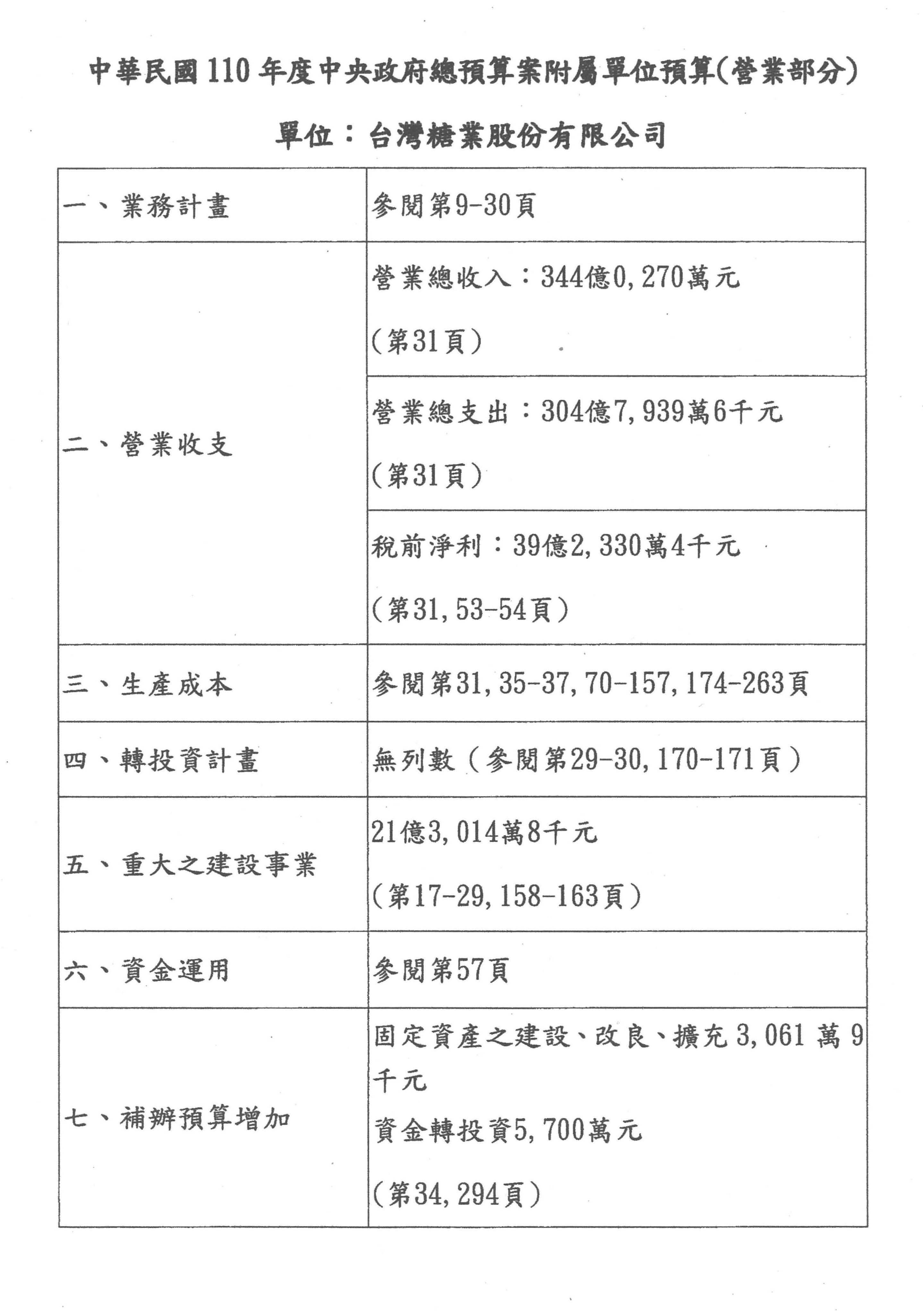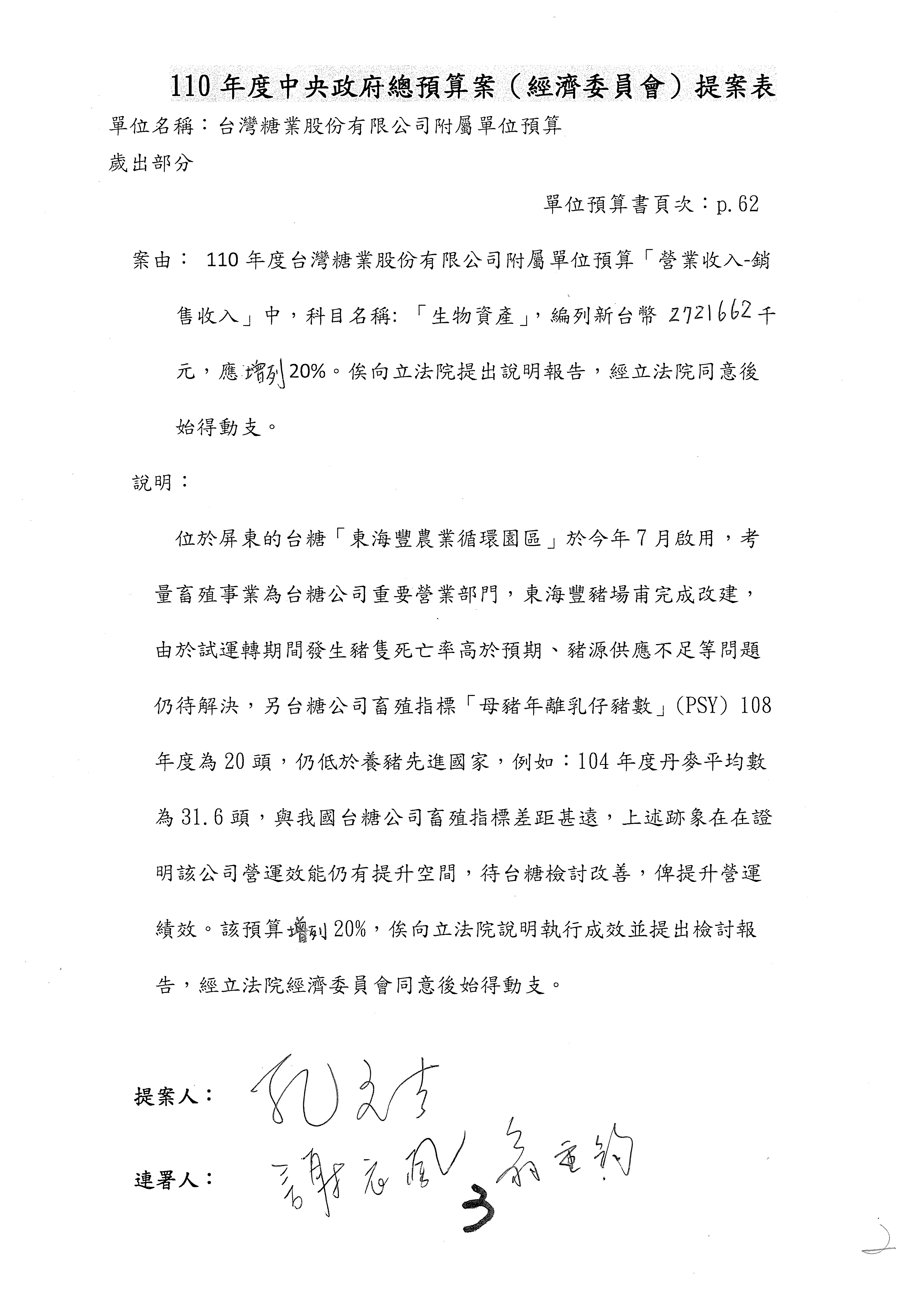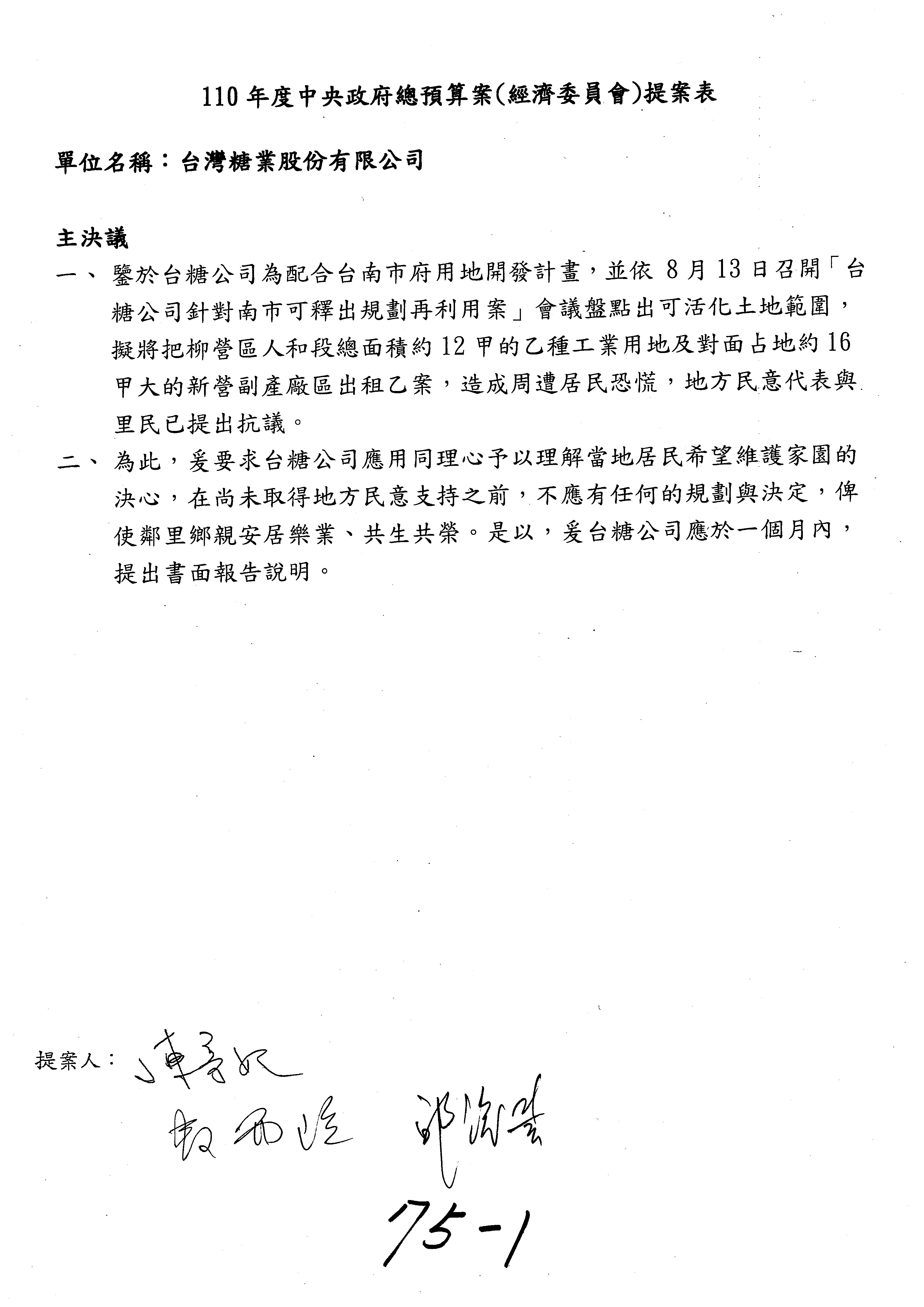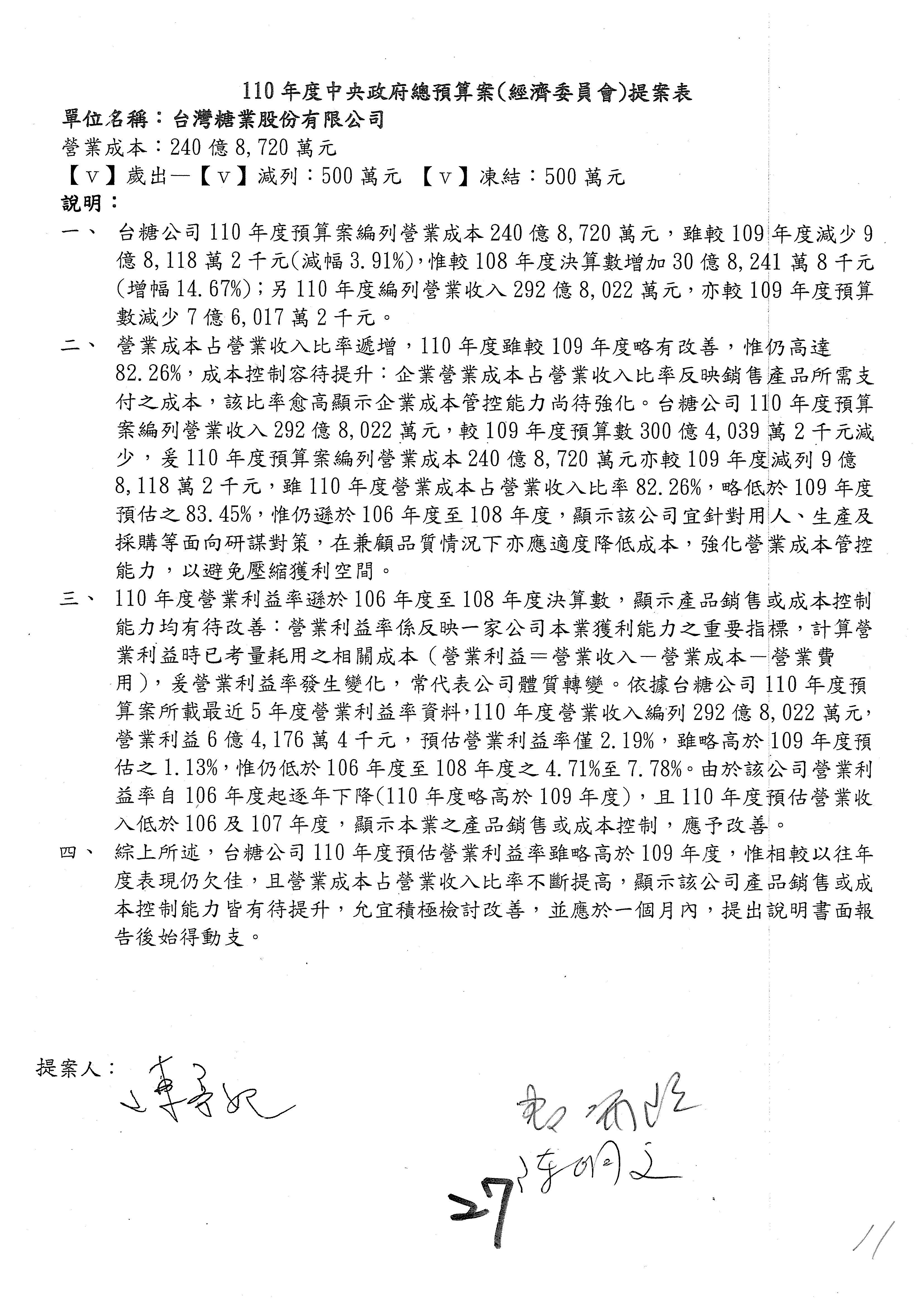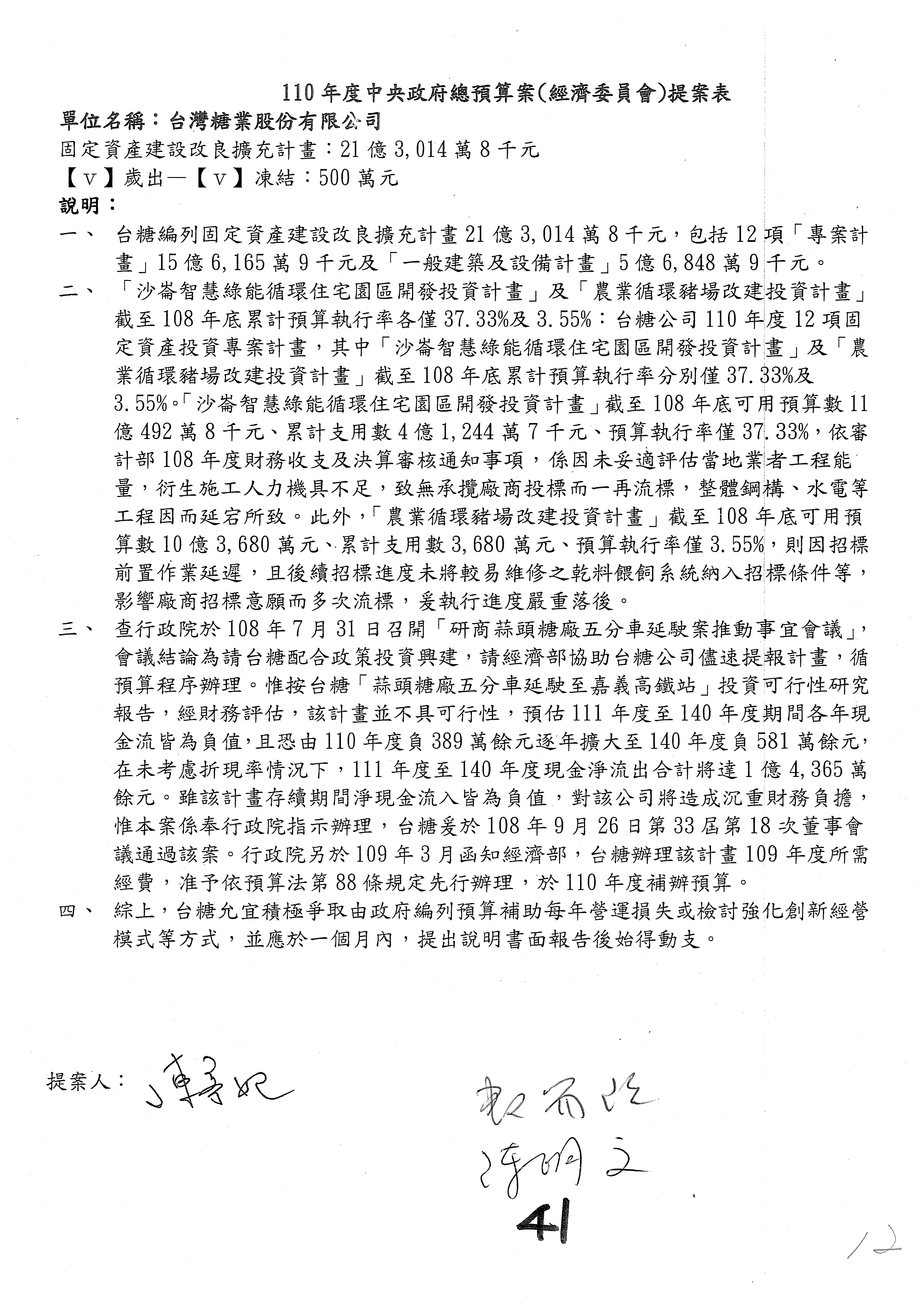 主席:台糖公司預算提案協商結論:第1案到第8案「營業收入」增列5,000萬元;第9案到第13案預算照列,其中第10案改主決議;第14案和第15案預算照列;第16案預算照列;第17案及第18案減列「水電費」1,000萬元,科目自行調整;第19案到第25案減列「旅運費」250萬元,科目自行調整;第26案預算照列;第27案至第33案預算照列;第34案到第40案預算照列;第41案到第50案「固定資產建設改良擴充」凍結5,000萬元,提出書面報告後始得動支;主決議第51案至第70案均照案通過;第71案倒數第三行「爰建請台糖公司」之後的「於符合農委會」5個字修正為「配合農委會政策於」,其餘均照案通過;第72案句中「總投資金額7,652萬元」之後修正為「計畫110年10月正式營運,為避免工程延宕影響當地觀光產業,台糖公司宜委託交通部鐵路局代為設計及施工,爰提案要求台糖公司應落實工程進度管理。」;第73案末句刪除「並提供……。」等文字;第74案、第75案與第75-1案均照案通過。