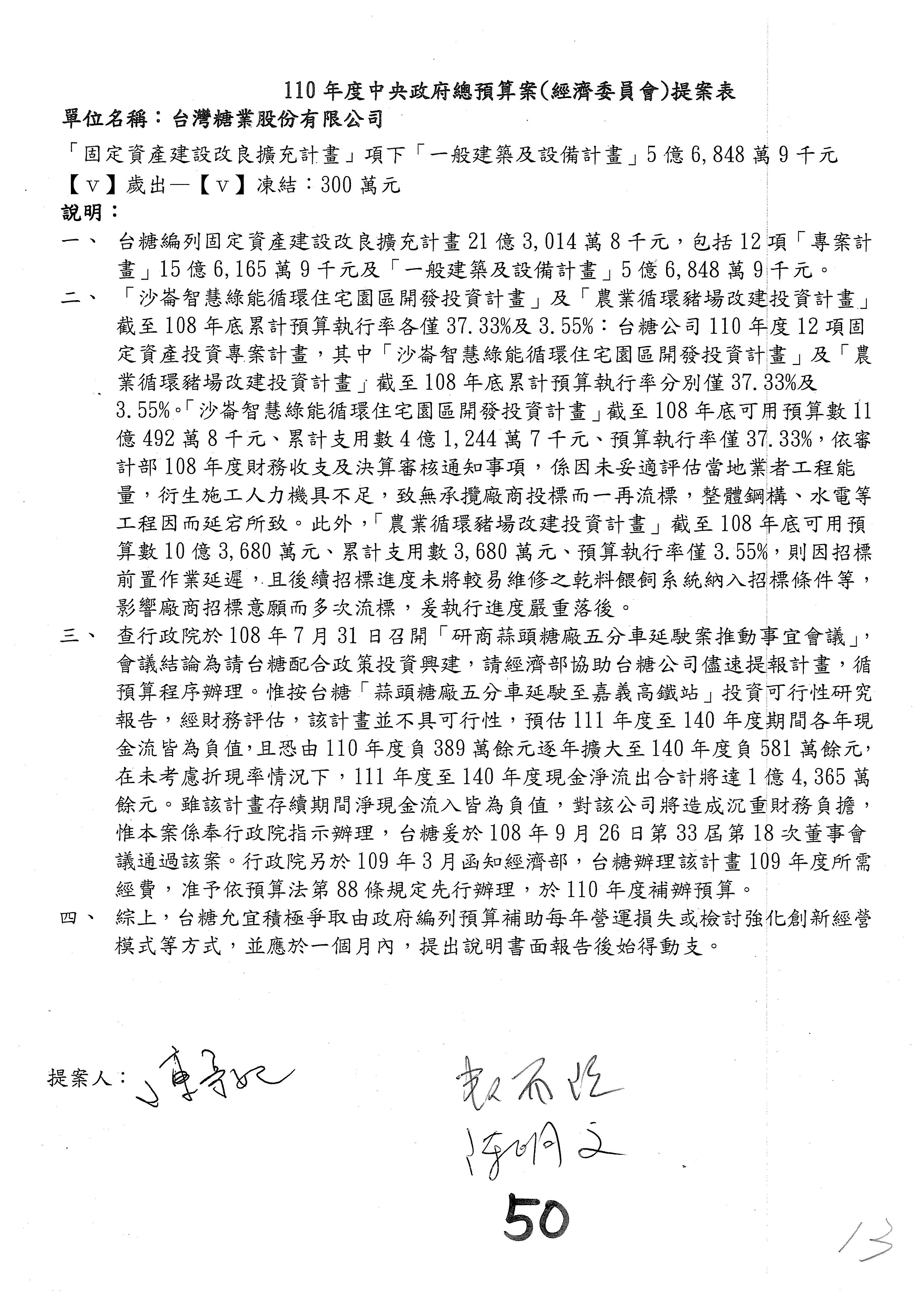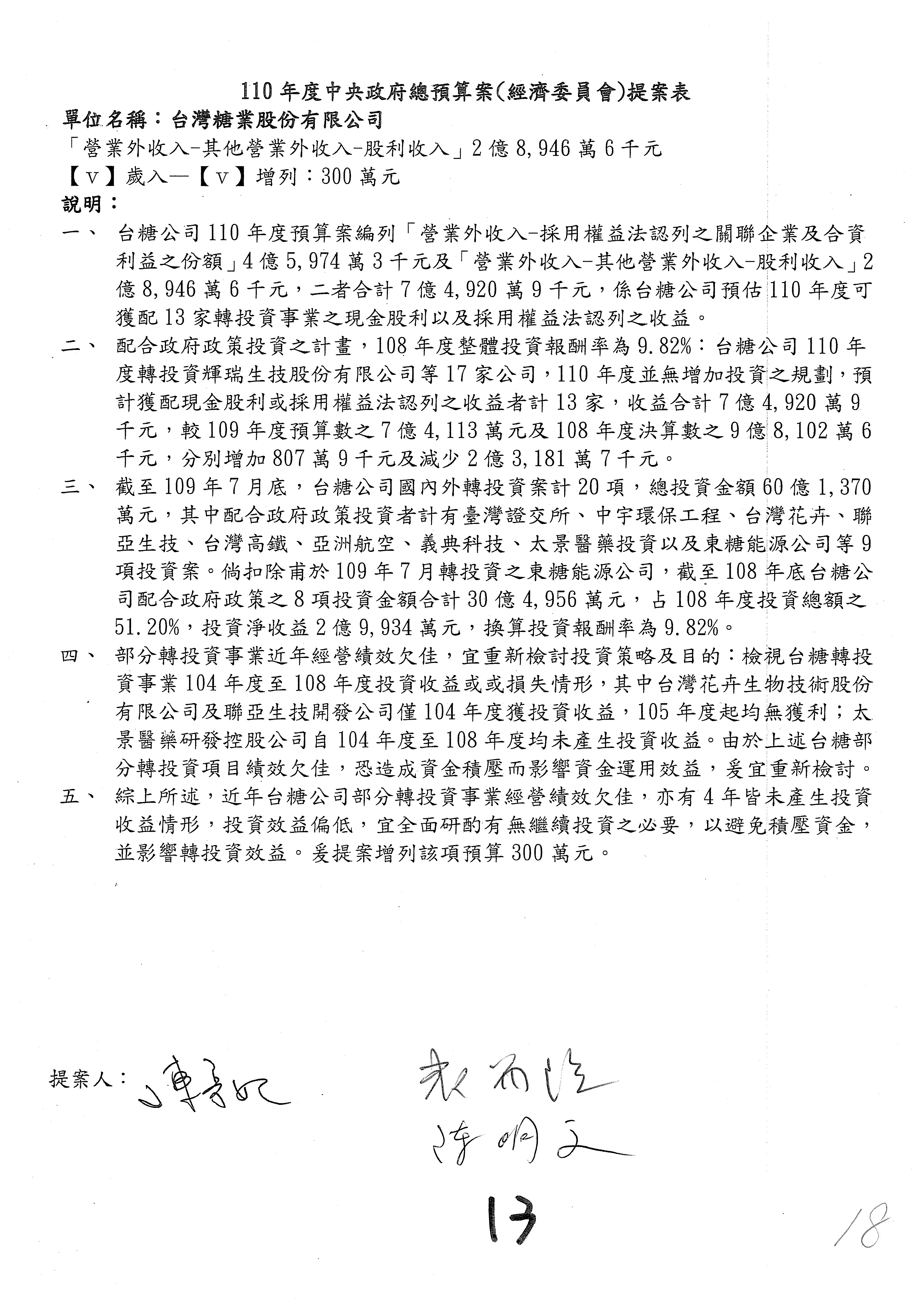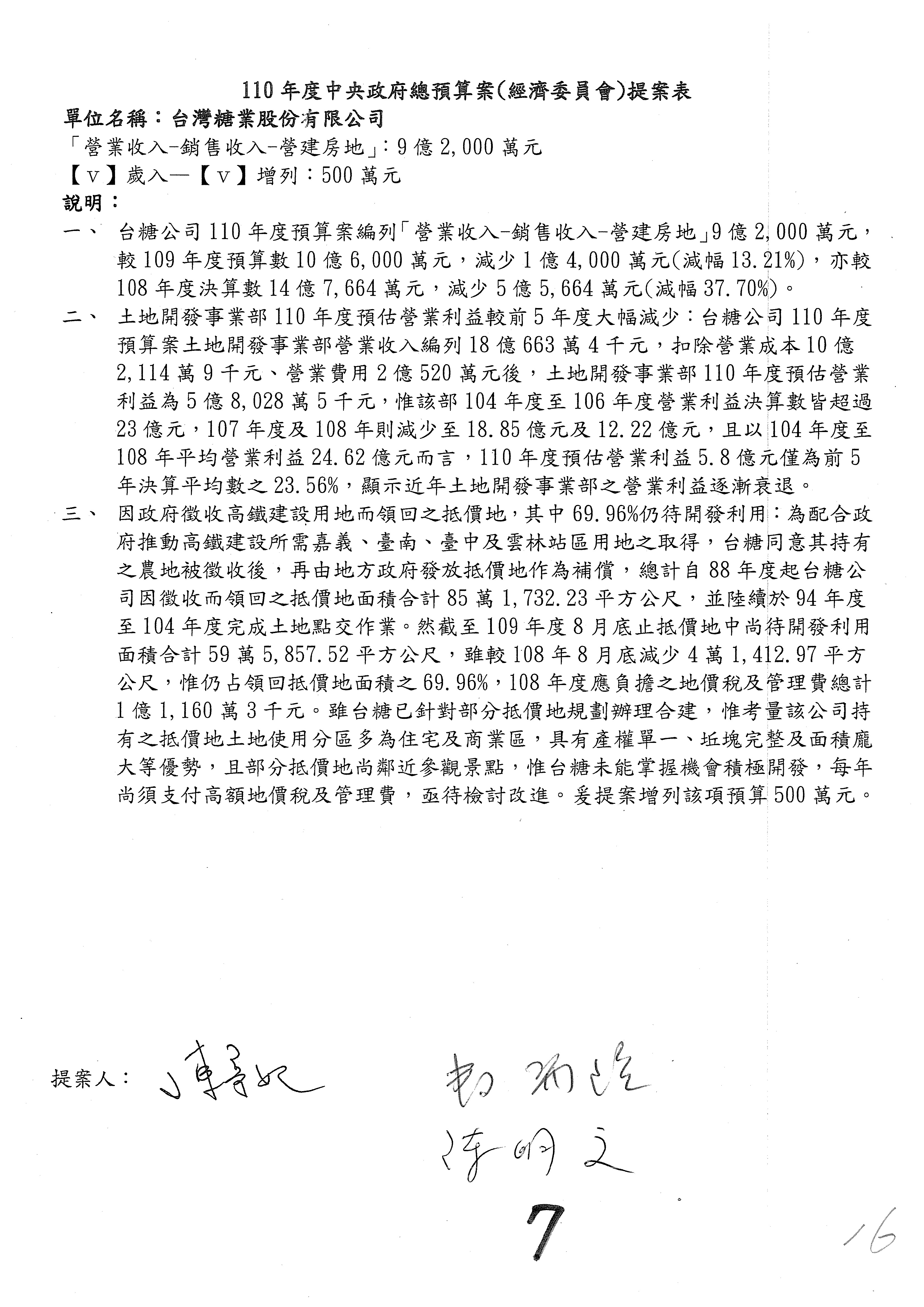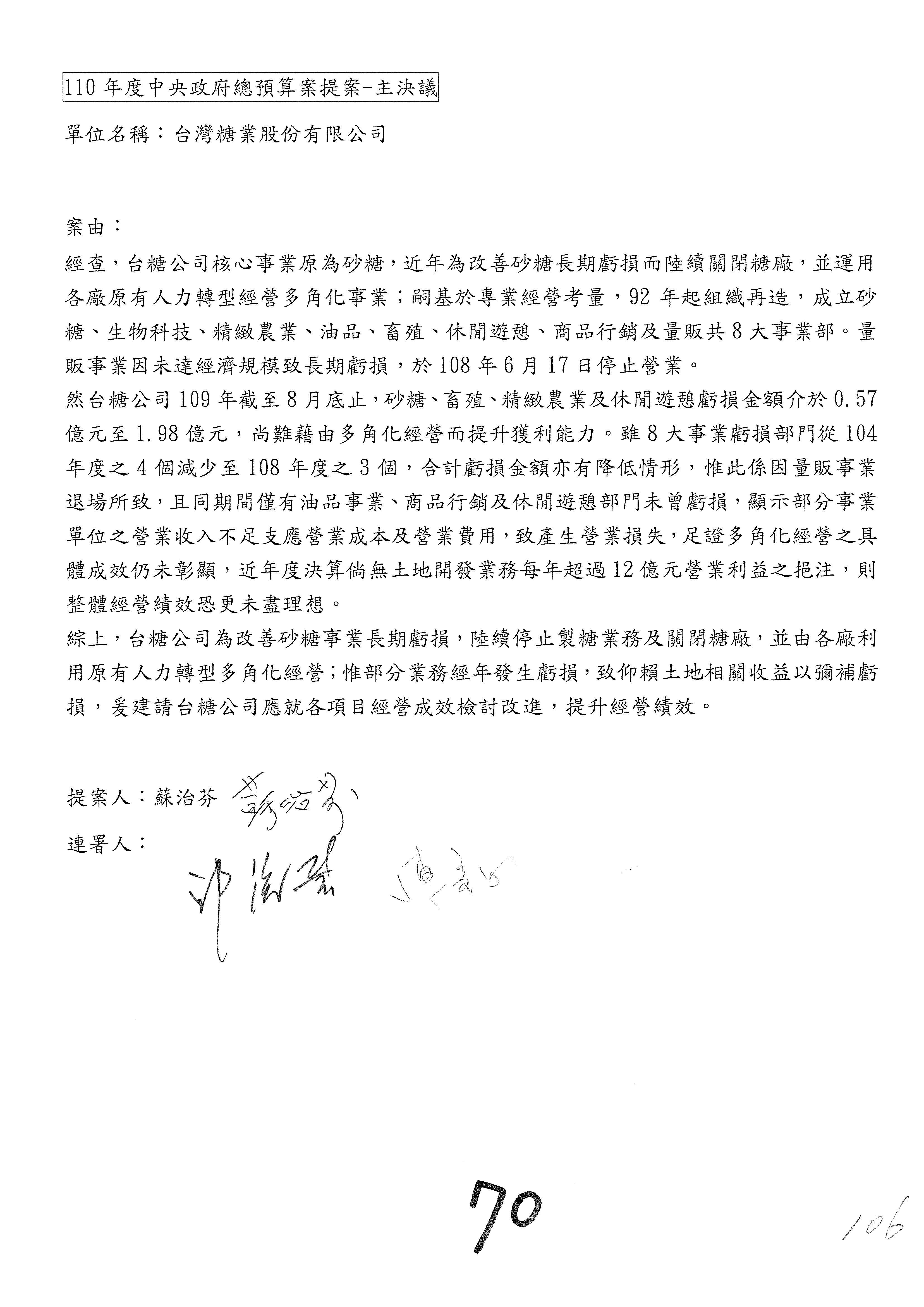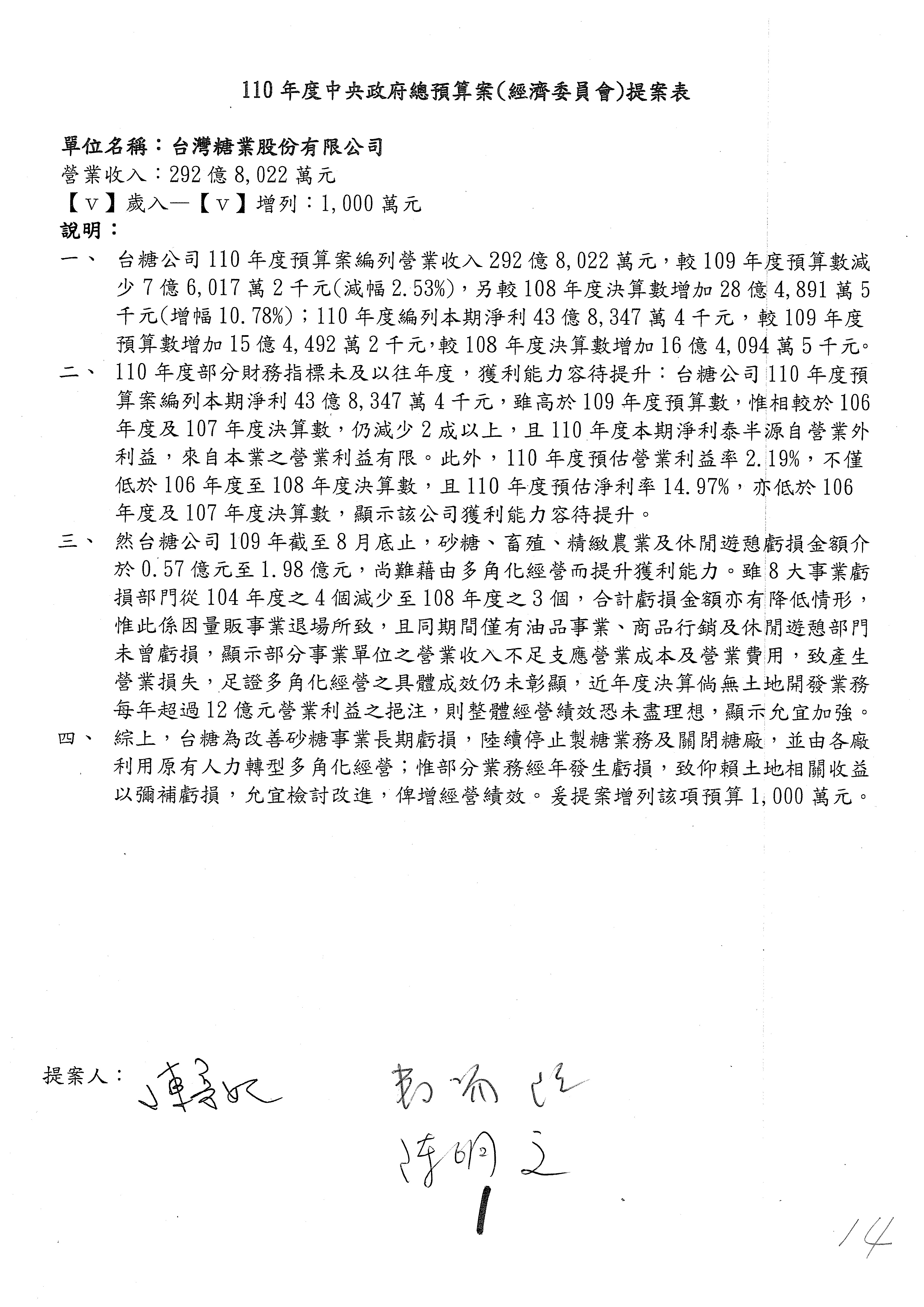主席:台糖公司預算提案協商結論:第1案到第8案「營業收入」增列5,000萬元;第9案到第13案預算照列,其中第10案改主決議;第14案和第15案預算照列;第16案預算照列;第17案及第18案減列「水電費」1,000萬元,科目自行調整;第19案到第25案減列「旅運費」250萬元,科目自行調整;第26案預算照列;第27案至第33案預算照列;第34案到第40案預算照列;第41案到第50案「固定資產建設改良擴充」凍結5,000萬元,提出書面報告後始得動支;主決議第51案至第70案均照案通過;第71案倒數第三行「爰建請台糖公司」之後的「於符合農委會」5個字修正為「配合農委會政策於」,其餘均照案通過;第72案句中「總投資金額7,652萬元」之後修正為「計畫110年10月正式營運,為避免工程延宕影響當地觀光產業,台糖公司宜委託交通部鐵路局代為設計及施工,爰提案要求台糖公司應落實工程進度管理。」;第73案末句刪除「並提供……。」等文字;第74案、第75案與第75-1案均照案通過。